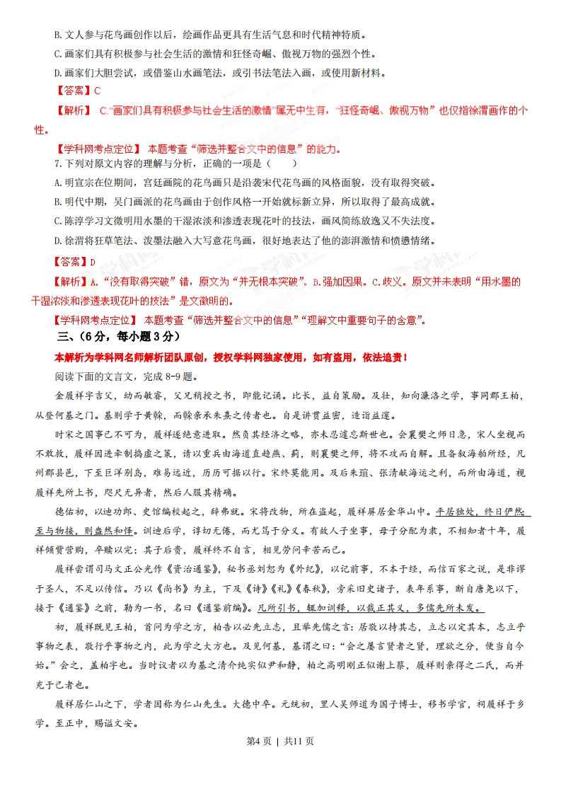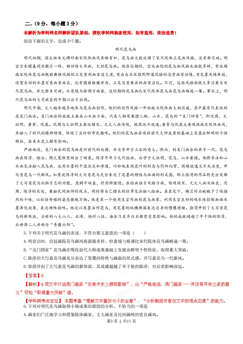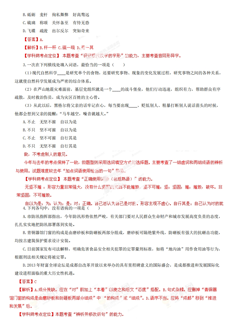 2013年高考四川语文解析(精编版)【学科网试卷总评】2013年高考语文四川卷,尽管是新课改的第一次考试,但命题在选材、立意、试卷结构、考点分布,试题内容、命题思路、难易区分度等方面,均能贴近教材,贴近生活,贴近学生实际,贴近课改理念,坚持立人为本,关怀生命成长,体现了“稳中有进、实中有活”的特点,既保持了四川卷的特色,又体现了新课改的理念。2013年四川卷,注重了选材的科学性和原创性,在试题的命制上,以能力立意,有效保证了高考试题的质量和检测效能。教材、现实生活、历史文献、学术论文、精粹时文、时事热点、心灵体悟,精神觉解、四川元素等等方面的选材和试题设计以及能力蕴涵,着力于“夯实两大根基,强化三种能力,回归语文之本”。两大根基是读书和生活,三大能力是新课程语文学科的核心能力。语文之“本”,是语文的本真滋味,语文的本体特征,语文的本质属性,尽在“阅读、思考、表达”的具体落实之中。2013年试卷彰显了语文的学科特色,突出了语文学科特有的审羊韵味。首先,在选材方面,文质兼美,文化蕴藉丰厚。如论述类文章选取了明代花鸟画发展历史的论述,语言严谨而优美;文学类文本《负重的河流》语言充满激情,描写细腻生动,意味深长,震撼力强,文言文阅读的《金厦祥传》,语言朴实,文字简洁,叙述清晰,传主人格魅力熠熠生辉,古诗鉴赏所选诗歌语意深沉,情感丰厚,耐人品味。其次,在试题的表述方面,试题指导语和具体要求简洁明了,清晰准确,给人以清之感。三是在查考生的能力方面,特别注重对考生审美能力的考查。如论述类文章,涉及到文学艺术风格、艺术创新等,《负重的河流”较为集中地考查了考生的审美欣赏能力,既涉及到个别语句的鉴赏,也涉及到一个文段的鉴赏以及全篇的整体性阅读感受,作文则体现了对于“美丽人生”和“生活(生命)之梦”的个性化的审美体验和审美感悟。注重生命成长,突出人文关怀,彰显语文之“人”。如在语言运用两道试题的命制上,没有要求固定的程式,二是要求考生按照题干自由发挥,使考生比较容易把握。2013年四川卷是有利于考查考生语文能力的命题,是一次成功的命题,有创意的命题。第丨卷(选择题共30分)一、(12分,每小题3分)1.下列词语中加点的字,每对读音都不相同的一项是()A.猝然/精粹汗渍/啧啧粮囤/囤积冠冕/分娩B.讥诮/硝烟土坯/胚胎果脯/胸脯跬步/硅谷C.商埠/阜盛敕造/赦免复辟/辟邪箭镞/簇拥D.朔日/溯源嗔怪/瞋目落枕/落款渎职/赎罪【答案】B【解析】A.c0/cui zi/zedùn/t0 n mian B.qido/xigo pi/peif的/pǔkui/guiC.bu/fu chi/she bi zu/cu D.suo/su chen jno/lud dushu【学科网考点定位】本题考查“识记现代汉语话的字音”的能力,主要考查形声字和多音多义字的读音,还考查到四川话读音与普通话读音的差异。2.下列词语中,没有错别字的一项是()A.平添算账声名鹊起厉行节约第1页|共11页B.砥砺麦杆徇私舞弊好高骛远C.硫璃称颂关怀备至有恃无恐D.飞碟疏浚出尔反尔突如奇来【答案】A.【解析】B.杆一秆C.硫一琉D.奇一其【学科网考点定位】本题考查“识记现代议子的字形”的能力,主要考查音同形异字。3.一次在下列横线处填入词语,最恰当的一项是()(1)现代自然科学是研究单个的食物,还要研究事物、现象的变化发展过程,研究事物之间的各种关系,这就使自然科学发展成为严密的综合体系。(2)在芦山地震灾难面前,基层党组织就是一个的战斗堡垒,他们行动迅速,组织有力,帮助群众有序疏散,及时救治伤员,成为灾区百姓的主心骨。(3)从此以后,黑格尔将父亲的话牢记在心,每当要出现、贬低别人、粗暴打断别人说话苗头的时候,他都会想到父亲的提醒:“马车越空,噪音就越大。”A.不止无坚不摧自以为是B.不只坚不可摧自以为是C.不止坚不可摧自行其是D.不只无坚不摧自行其是做,不考虑别人的意见。今年与去年的考点保持了一致,但题型侧采用选词填空方式的选择题。主要考查了一组虚词和两组成语的辨析与使用。试题难度较去年“加点词语使用忙当的一句”稍易【学科网考点定位】本题考查“正确使用词语(包括熟语)”的能力。无坚不摧:形容力量非常强大,没有什么坚固的东西不能摧毁。坚不可摧:坚:坚固;摧:摧毁,破坏。非常坚固,不可摧毁。自以为是:为:认为;是:对;正确。自己总认大自己是对的。形容主观不虚心。自行其是:自己认为对的就4.下列各句中,没有语病的一项是(A.市防汛指挥部指出,今年防汛形势依然严峻,有关部门要对人民群众生命财产和城市发展高度负责的态度,扎扎实实地把防汛部署落到实处。B.青铜器馆门窗的构成是由磨砂板和防砸板两部分组成,磨砂板可隔绝紫外线,防砸板有强大的抗砸击功能,均按古建筑保护要求设计安装。C.日前国家发布司法解释,明确危害食品安全相关犯罪的定罪量刑标准,如将“地沟油”用作食用油等行为根据刑法相关规定将被定罪。D.2013年财富全球论坛是成都自改革开放以来举办的具有里程碑意义的国际盛会,是成都推进和发展国际化建设进程面临的重大历史性机遇。【答案】C【解析】A成分残缺。应在“对”前加上“本着”以使之和后文“态度”搭配。B.句式杂糅。应删掉“青铜器馆门窗的构成是由磨砂板和防砸板两部分组成”中“的构成”或“组成”。D.语序不当。应将“成都”移到“推进和发展”后。【学科网