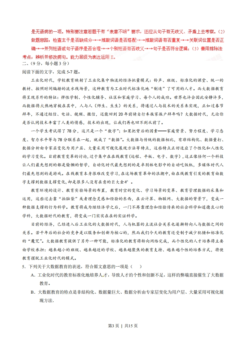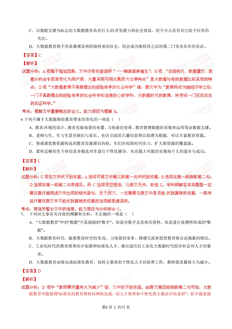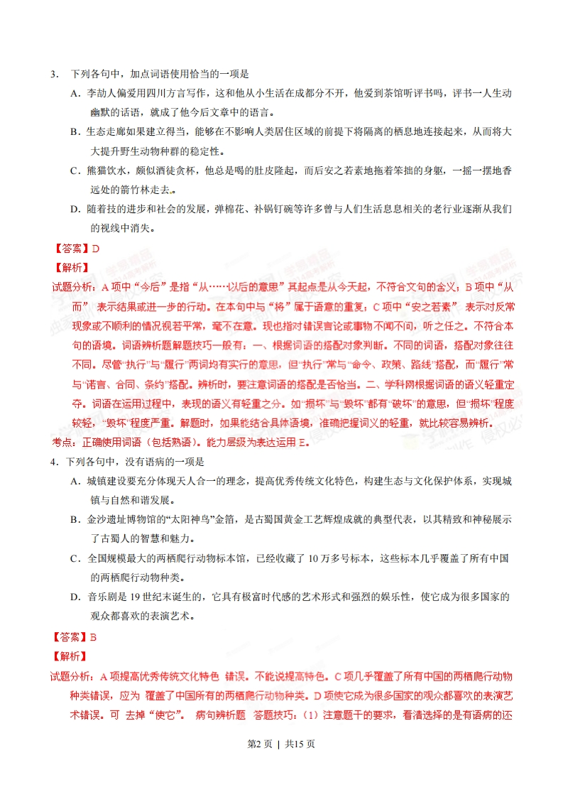 2014年普通高等学校招生全国统一考试(四川川卷)语文第I卷(单项选择题共27分)一、(12分,每小题3分)1、下列词语中加点的字,读音全部都正确的一项是()A.眼睑(jin)哺育(bǚ)扎辫子(za)亘古未有(gen)B.嫩绿nen)铲除(chan)紧箍咒k)一蹴而就(cǜ)c.抽噎(ye)迸裂(beng)户口簿(bd)不屈不挠lao)D.愤懑(men)要挟(xia)绊脚石(ban)恃才傲物(shi)【答案】A【解析】试题分析:本题为考查字音题,字音题的考查只要求识记字音而不要求拼写即侧重于考查识记、辨别、确定汉字字音的能力准确地判断其正确与否。识记现代汉语普通话常用字的字音侧重的是“常用字的字音”。考查主要涉及同音字、形声字、形近字、多音字、习惯性误读字、方言字、统读字、难读字等。从2009年全国及自主命题省市试卷来看.多音字、习惯性误读字是高考的重点形声字、形近字次之.多音字、难读字是“认读”的难点。复习时应分类整理记忆,以记忆为主,把记忆和训练结合起来。本题中B项中“紧箍咒”的“箍”应读“g如”,C项中“不屈不挠”的“挠”应读“o”;D项中“要挟”的“挟”应读“x”。考点:识记现代汉语普通话常用字的字音。能力层级为识记A。心02、下列词语中没有错别字的一项是()A.打蜡顷刻生死攸关口干舌噪B.飙升印证贻养天年扶摇直上C.巨壁清彻历久弥新所向披靡D.皱褶荧屏风生水起精简机构【答案】D【解析】试题分析:本题属于错别字辨析,解答时应逐个审读容易出错的字,从中可以辨析出一些形近而音不同的别字。如果怀疑某个是别字,可以写出几个同音字来比较可以写出几个形似字来此较。通过分析形声字的形旁来推导这个字的含意,再放到这个词语中去判定是否相符。对于独体字或形声字中的形旁已失去表意功能的形声字可以通过分析词语的语法结构来确定它是不是别字,还可以通过对整个词语的理解,来寻找不合语境的别字。还有一部分就只能依靠我们平时的积累了。如果题干是有错别字的一项,就排除肯定无错别字的:如果是全对的一项,就排除肯定有错别字的:如果题干是有两个错别字的一项,就先排除有三个错别字的一项。本题A项中“口干舌噪”应为“口干舌燥”,B项中“贻养天年”应为“颐养天年”;C项中“清彻”应为“清澈”。考点:识记并正确书写现代常用规范汉字。能力层级为识记A。第1页|共15页3.下列各句中,加点词语使用恰当的一项是A.李劼人偏爱用四川方言写作,这和他从小生活在成都分不开,他爱到茶馆听评书吗,评书一人生动幽默的话语,就成了他今后文章中的语言。B.生态走廊如果建立得当,能够在不影响人类居住区域的前提下将隔离的栖息地连接起来,从而将大大提升野生动物种群的稳定性。C.熊猫饮水,顿似酒徒贪杯,他总是喝的肚皮隆起,而后安之若素地拖着笨拙的身躯,一摇一摆地香远处的箭竹林走去。D.随着技的进步和社会的发展,弹棉花、补锅钉碗等许多曾与人们生活息息相关的老行业逐渐从我们的视线中消失。【答案】D【解析】试题分析:A项中“今后”是指“从…以后的意思”其起点是从今天起,不符合文句的含义:B项中“从而”表示结果或进一步的行动。在本句中与“将”属于语意的重复;C项中“安之若素”表示对反常现象或不顺利的情况视若平常,毫不在意,现也指对错误言论或事物不闻不问,听之任之。不符合本句的语境。词语辨析题解题技巧一股有:一、根据词语的搭配对象判断。不同的词语,搭配对象往往不同。尽管执行”与履行两词均有实行的意思,但执行常与“命令、政策、路线搭配,而履行常与“诺言、合同、条约搭配。辨析时,要注意词语的搭配是否恰当。二、学科网根据词语的语义轻重定夺。词语在运用过程中,表现的语义有轻重之分。如损坏与毁坏都有破坏的意思,但损坏程度较轻,“毁坏程度严重。解题时,如果能结合具体语境,准确把握词义的轻重,就此较容易辨析。。考点:正确使用词语(包括熟语)。能力层级为表达运用E。4.下列各句中,没有语病的一项是A.城镇建设要充分体现天人合一的理念,提高优秀传统文化特色,构建生态与文化保护体系,实现城镇与自然和谐发展。B.金沙遗址博物馆的“太阳神鸟”金箔,是古蜀国黄金工艺辉煌成就的典型代表,以其精致和神秘展示了古蜀人的智慧和魅力。C.全国规模最大的两栖爬行动物标本馆,已经收藏了10万多号标本,这些标本几乎覆盖了所有中国的两栖爬行动物种类。D.音乐剧是19世纪末诞生的,它具有极富时代感的艺术形式和强烈的娱乐性,使它成为很多国家的观众都喜欢的表演艺术。【答案】B【解析】试题分析:A项提高优秀传统文化特色错误。不能说提高特色。C项几乎覆盖了所有中国的两栖爬行动物种类错误,应为覆盖了中国所有的两栖爬行动物种类。D项使它成为很多国家的观众都喜欢的表演艺术错误。可去掉“使它”。病句辨析题答题技巧:(1)注意题干的要求,看清选择的是有语病的还第2页共15页是无语病的一项。特别要注意若题干有“表意不明”要求,还应从句子有无歧义、矛盾上去考察。(2)做题思路:检查主干是否缺成分→→推敲词语是否搭配→→推敲词语有否重复+→关联词位置是否正确··并列短语或句子语序是否合理→→个别短语有否歧义→→句子是否符合逻辑;(3)善用排除法考点:辨析并修改病句。能力层级为表达运用E.二、(9分,每小题3分)阅读