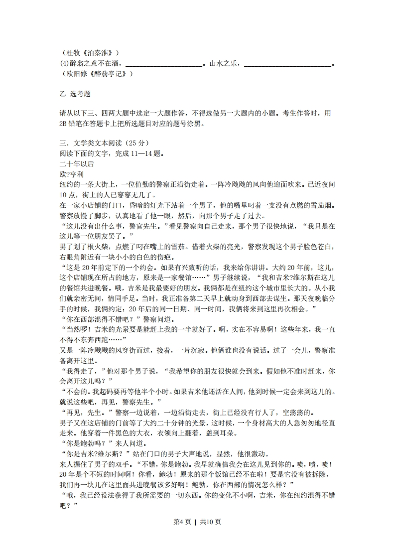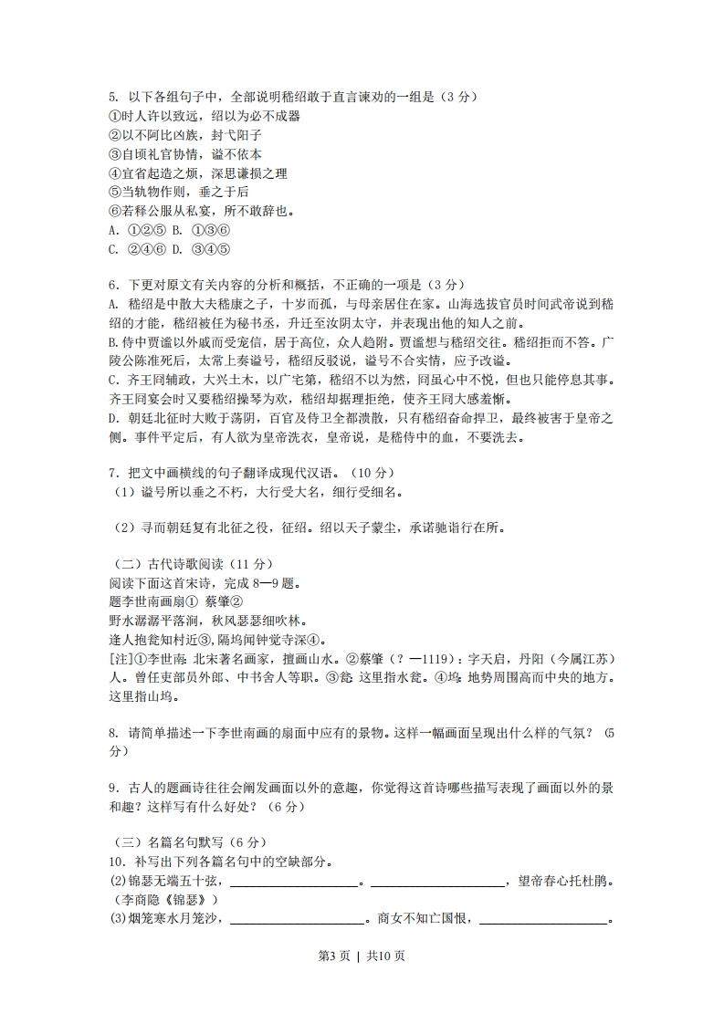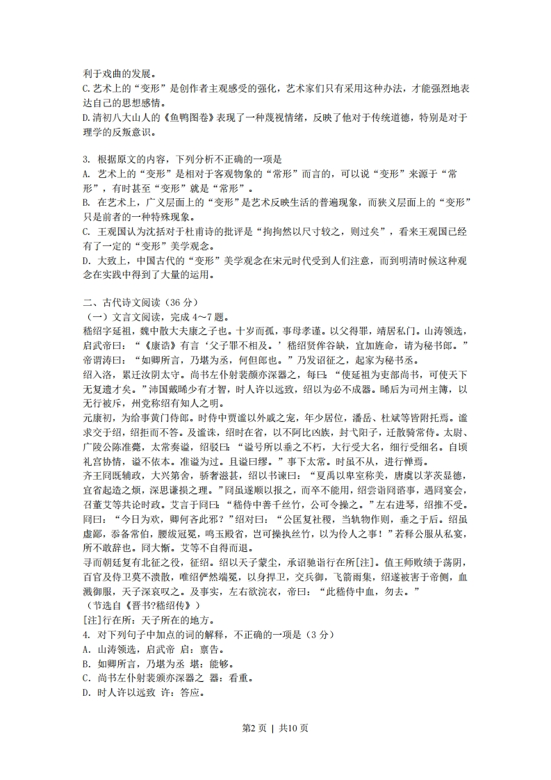 2008年全国高考语文试题详解(海南卷)第I卷阅读题甲必考题一.现代文阅读(9分,每小题3分)阅读下面的文字,完成1~3题。所谓“变形”,是相对于“常形”而言。“常形”是指现实生活中客观物象的正常自然形态“变形”是指客观物象反应在艺术中的形态的改变。在现实生活中,由于种种原因,物象的形态有时会出现变异,例如两头蛇、三脚鸡等,这种“变形”虽然怪异,但不是艺术美学研究的对象。艺术美学所研究的,是正常的自然形态在艺术变形中的变化及其美学意义。艺术上的“变形”分为广义和狭义两种。从广义上说,任何种类和流派的艺术,不论其创作思想和手法多么不同,它所塑造的形象较之原形都会有某些强调、选择、集中乃至改变。从这个意义上说,变形乃是艺术反映生活的一种普遍现象。不过一般地说,艺术上关于“变形”的观念是指狭义的“变形”,它表现为客观物象的几何图形所发生的改变。例如杜甫的《古柏行》:“霜皮溜雨四十围,黛色参天二千尺。”宋代科学家沈括(字存中)分析道:“四十围乃是径七尺,无乃大细长乎?此亦文章病也。”沈括生得太早一些,他不懂得艺术变形的美学意义。比沈括稍晚的王观国有所不同,他:“‘四十围'、‘二千尺’者,姑言其大且高也。诗人之言当如此,而存中乃拘拘然以尺寸较之,则过矣。”其实,古代诗歌中这类“变形”甚多,诸如“黄河之水天上来”、“飞流直下三千尺”、“白发三千丈”等等都是。当然古代诗人很懂得运用夸张的手法,可是未必有自觉的“变形”观念。宋元以来,“变形”的美学观念己经引起了人们的注意。到明清戏曲中,舞曲程式和脸谱等都是对生活常形的改变。如脸谱中用红表忠诚,白表奸诈,舞蹈动作鸣冤叫屈时甩发,生离死别时跪步等,这些“变形”大大丰富和增强了戏曲艺术的表现手法和表现力。艺术作品中的“变形”是创作者主观感受的一种强化,因此艺术家们常用“变形”来表达自己的思想感情。例如清初八大山人的《鸣鱼图卷》,鱼、鸭的眼眶变成了圆形,眸子有的画成绿豆小点,有的画成圆弧线,传达出“白眼看天”的蔑视情绪。这种“变形”美学的本质,是对于传统道德,特别是对于理学的反叛,是人性的高标,个性的张扬。(摘编自曾祖荫、曾新《怪异:明清启蒙美学之特征》)1.下列关于“变形”的表述,不正确的一项是A.客观物象在现实中具有正常的自然形态,艺术上所谓的“变形”,是指客观物象在艺术中表现出来的形态的改变。B.在现实生活中客观物象的形态偶然会出现变异,由于这一现象不是艺术美学研究的对象,所以人们并不把它称为“变形”。C.关于“变形”,艺术美学所研究的是正常的自然形态在艺术表现中所发生的变化,以及这种变化的美学意义。D.艺术上所说的“变形”往往是指狭义的“变形”,即指在艺术表现中客观物象的几何图形所发生的改变。2.下列理解,不符合原文意思的一项是A.杜甫诗“黛色参天二千尺”、李白诗“白发三千丈”等,都只是夸张手法,不见得是自觉的“变形”观念。B.相对于现实生活,明清戏曲中的舞蹈程式和脸谱是一种典型的“变形”,这种“变形”有第1页1共10页利于戏曲的发展。C.艺术上的“变形”是创作者主观感受的强化,艺术家们只有采用这种办法,才能强烈地表达自己的思想感情。D.清初八大山人的《鱼鸭图卷》表现了一种蔑视情绪,反映了他对于传统道德,特别是对于理学的反叛意识。3.根据原文的内容,下列分析不正确的一项是A.艺术上的“变形”是相对于客观物象的“常形”而言的,可以说“变形”来源于“常形”,有时甚至“变形”就是“常形”。B.在艺术上,广义层面上的“变形”是艺术反映生活的普遍现象,而狭义层面上的“变形”只是前者的一种特殊现象。C.王观国认为沈括对于杜甫诗的批评是“拘拘然以尺寸较之,则过矣”,看来王观国己经有了一定的“变形”美学观念。D.大致上,中国古代的“变形”美学观念在宋元时代受到人们注意,而到明清时候这种观念在实践中得到了大量的运用。二、古代诗文阅读(36分)(一)文言文阅读,完成4~7题。嵇绍字延祖,魏中散大夫康之子也。十岁而孤,事母孝谨。以父得罪,靖居私门。山涛领选,启武帝曰:“《康诰》有言‘父子罪不相及。’嵇绍贤侔谷缺,宜加旌命,请为秘书郎。帝谓涛曰:“如卿所言,乃堪为丞,何但郎也。”乃发诏征之,起家为秘书丞。绍入洛,累迁汝阴太守。尚书左仆射裴颜亦深器之,每曰“使延祖为吏部尚书,可使天下无复遗才矣。”沛国戴晞少有才智,时人许以远致,绍以为必不成器。晞后为司州主簿,以无行被斥,州党称绍有知人之明。元康初,为给事黄门侍郎。时侍中贾谧以外戚之宠,年少居位,潘岳、杜斌等皆附托焉。谧求交于绍,绍拒而不答。及谧诛,绍时在省,以不阿比凶族,封弋阳子,迁散骑常侍。太尉、广陵公陈准薨,太常奏谥,绍驳曰“溢号所以垂之不朽,大行受大名,细行受细名。自顷礼宫协情,谥不依本。准溢为过。且谥曰缪。”事下太常。时虽不从,进行惮焉。齐王冏既辅政,大兴第舍,骄奢滋甚,绍以书谏曰:“夏禹以卑室称美,唐虞以茅茨显德,宜省起造之烦,深思谦损之理。”冏虽遂顺以报之,而卒不能用,绍尝诣冏谘事,遇冏宴会,召董艾等共论时政。艾言于同日:“嵇侍中善千丝竹,公可令操之。”左右进琴,绍推不受。冏曰:“今日为欢,卿