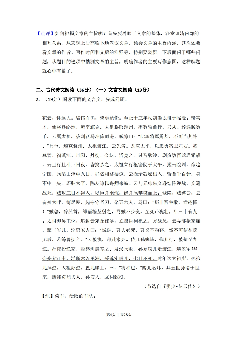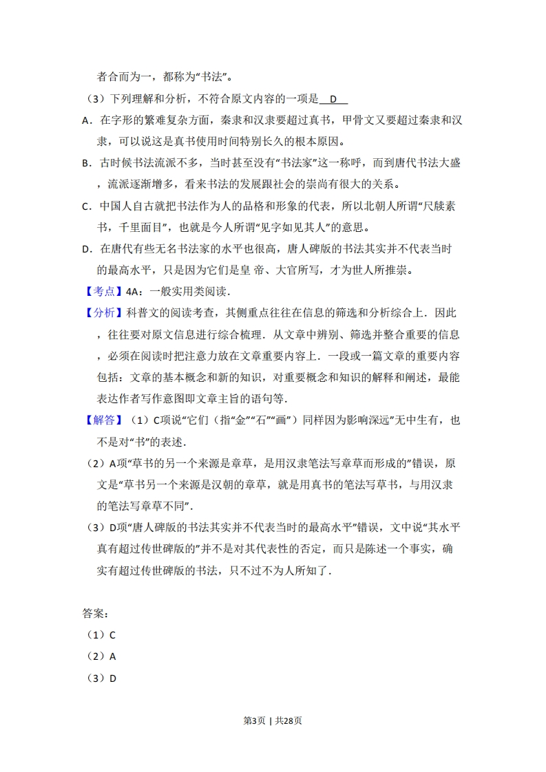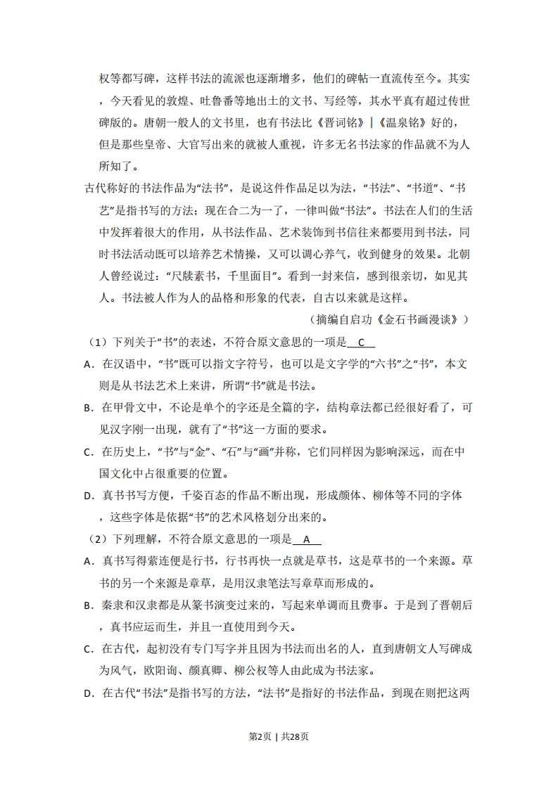 2010年全国统一高考语文试卷(新课标)事考答案与试题佩折一、现代文阅读(9分)1.(9分)阅读下面文字,完成问题。“书”本是指文字符号,现在提到的“书”不是从文字符号讲,也不是从文字学六书”来讲,而是从书法艺术讲。书法对中华民族有很深远的影响,“书”与“金”、“石”与“画”并称,在中国文化中占很重要的位置。书法是一种艺术,而且是广大人民喜闻乐见的艺术。中国的汉字刚一出现,写字的人就有“写得好看”的要求和欲望。如甲骨文就是如此,虽然字形繁难复杂,但是不论单个的字还是全篇的字,结构章法都要好看。可见,自从有写字的行动以来,就伴随着艺术的要求,美观的要求。不论是秦隶还是汉隶,都是刚从篆书演变过来的,写起来单调而且费事。所以到了晋朝后,真书(又叫楷书、正书)开始出现并逐渐定型。真书虽然各家写法不同、风格不同,但字形的结构是一致的。在历史上篆书、隶书等使用的时间都不如真书时间长久,真书至今仍在运用,就是因为它字形比较固定,笔画转折自然,并且可以连写,多写一笔少写一笔也容易被人发现。真书写得萦连便是行书,再写得快一点就是草书。草书另一个来源是从汉朝的章草,就是用真书的笔法写草书,与用汉隶的笔法写章草不同,到东晋以后与真书变来的草书合流。真书的书写很方便,所以千姿百态的作品不断涌现,艺术风格多样,出现了各种字体,比如颜体、柳体、欧体、褚体等。在这以前没有人专门写字并靠书法出名的,就连王羲之也不是专门写字的人,古代也没有“书法家”这个称呼。当时许多碑都是刻碑的工匠写的,到了唐朝开始文人写碑成风。唐太宗爱写字,写了《晋词铭》《温泉铭》两个碑,还把这两个碑的拓本送外国使臣。当时的文人和名臣如虞世南、欧阳询、褚遂良以及后来的颜真卿、柳公第1页1共28页权等都写碑,这样书法的流派也逐渐增多,他们的碑帖一直流传至今。其实,今天看见的敦煌、吐鲁番等地出土的文书、写经等,其水平真有超过传世碑版的。唐朝一般人的文书里,也有书法比《晋词铭》《温泉铭》好的,但是那些皇帝、大官写出来的就被人重视,许多无名书法家的作品就不为人所知了。古代称好的书法作品为“法书”,是说这件作品足以为法,“书法”、“书道”、“书艺”是指书写的方法:现在合二为一了,一律叫做“书法”。书法在人们的生活中发挥着很大的作用,从书法作品、艺术装饰到书信往来都要用到书法,同时书法活动既可以培养艺术情操,又可以调心养气,收到健身的效果。北朝人曾经说过:“尺牍素书,千里面目”。看到一封来信,感到很亲切,如见其人。书法被人作为人的品格和形象的代表,自古以来就是这样。(摘编自启功《金石书画漫谈》)(1)下列关于“书”的表述,不符合原文意思的一项是CA.在汉语中,“书”既可以指文字符号,也可以是文字学的“六书”之“书”,本文则是从书法艺术上来讲,所谓“书”就是书法。B.在甲骨文中,不论是单个的字还是全篇的字,结构章法都已经很好看了,可见汉字刚一出现,就有了“书”这一方面的要求。C.在历史上,“书”与“金”、“石”与“画”并称,它们同样因为影响深远,而在中国文化中占很重要的位置。D.真书书写方便,千姿百态的作品不断出现,形成颜体、柳体等不同的字体,这些字体是依据“书”的艺术风格划分出来的。(2)下列理解,不符合原文意思的一项是AA.真书写得萦连便是行书,行书再快一点就是草书,这是草书的一个来源。草书的另一个来源是章草,是用汉隶笔法写章草而形成的。B.秦隶和汉隶都是从篆书演变过来的,写起来单调而且费事。于是到了晋朝后,真书应运而生,并且一直使用到今天。C.在古代,起初没有专门写字并且因为书法而出名的人,直到唐朝文人写碑成为风气,欧阳询、颜真卿、柳公权等人由此成为书法家。D.在古代“书法”是指书写的方法,“法书”是指好的书法作品,到现在则把这两第2页|共28页者合而为一,都称为“书法”。(3)下列理解和分析,不符合原文内容的一项是DA.在字形的繁难复杂方面,秦隶和汉隶要超过真书,甲骨文又要超过秦隶和汉隶,可以说这是真书使用时间特别长久的根本原因。B.古时候书法流派不多,当时甚至没有“书法家”这一称呼,而到唐代书法大盛,流派逐渐增多,看来书法的发展跟社会的崇尚有很大的关系。C.中国人自古就把书法作为人的品格和形象的代表,所以北朝人所谓“尺牍素书,千里面目”,也就是今人所谓“见字如见其人”的意思。D.在唐代有些无名书法家的水平也很高,唐人碑版的书法其实并不代表当时的最高水平,只是因为它们是皇帝、大官所写,才为世人所推崇。【考点】4A:一般实用类阅读,【分析】科普文的阅读考查,其侧重点往往在信息的筛选和分析综合上.因此,往往要对原文信息进行综合梳理.从文章中辨别、筛选并整合重要的信息,必须在阅读时把注意力放在文章重要内容上.一段或一篇文章的重要内容包括:文章的基本概念和新的知识,对重要概念和知识的解释和阐述,最能表达作者写作意图即文章主旨的语句等,【解答】(1)C项说“它们(指“金”“石”“画”)同样因为影响深远”无中生有,也不是对“书”的表述,(2)A项“草书的另一个来源是章草,是用汉隶笔法写章草而形成的”错误,原文是“草书另一个来源是汉朝的章草,就是用真书的笔