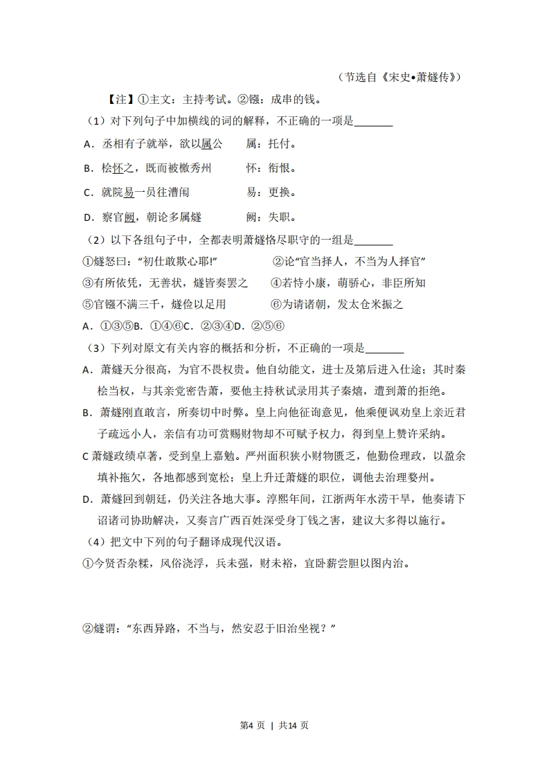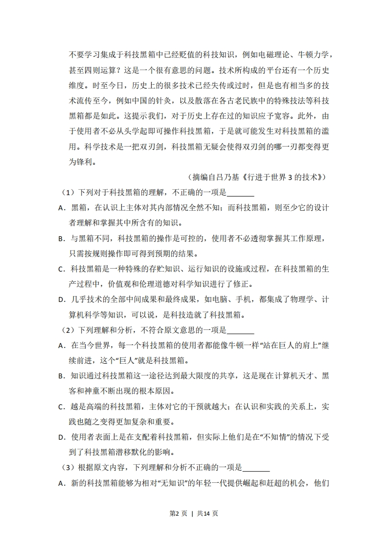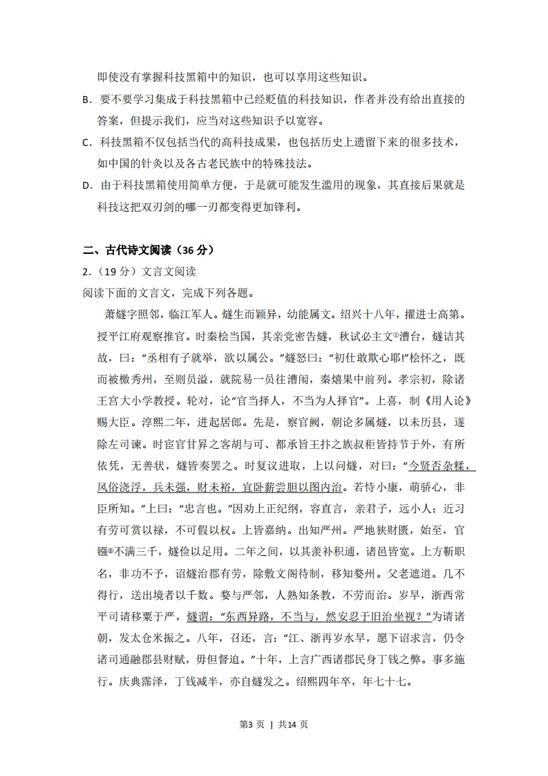 2012年全国统一高考语文试卷(新课标)一、现代文阅读(9分,第小题3分)1.(9分)阅读下面的文字,完成下列各题。“黑箱”是控制论中的概念,意为在认识上主体对其内部情况全然不知的对象。“科技黑箱“的含义与此有所不同,它是一种特殊的存贮知识、运行知识的设施或过程,使用者如同面对黑箱,不必打开,也不必理解和掌握其中的知识,只需按规则操作即可得到预期的结果。例如电脑、手机、摄像机、芯片,以及药品等,可以说,几乎技术的全部中间和最终成果都是科技黑箱。在科技黑箱的生产过程中,科学知识是基础,价值观和伦理道德则对科学知识进行选择。除此以外,科技黑箱中还整合了大量人文的、社会的知识,并且或多或少渗透了企业文化和理念。这样,在电脑或手机中就集成了物理学、计算机科学、管理学、经济学、美学,以及对市场的调研和政府的相关政策等知识。科技黑箱是特殊的传播与共享知识的媒体,具有三大特点。首先,它使得每一个使用者-~不仅牛顿,都能直接“站在巨人的肩上”继续前进。试想,如果要全世界的电脑使用者都透彻掌握电脑的工作原理,掌握芯片上的电子理论,那需要多少时间?知识正是通过科技黑箱这一途径而达到最大限度的共享。如今,计算机天才、黑客的年龄越来越小,神童不断出现,他们未必理解计算机的制作过程就能编写软件、破译密码。每一代新科技黑箱的出现,就为相对“无知识"的年轻一代的崛起与赶超提供了机会。其次,处在相对低端的科技黑箱往往与语境和主体无关,而处于高端的科技黑箱则需满足特定主体在特定场合乃至心理的需要。人们很少能对一把锤子做什么改进,而使用一个月后的电脑则已经深深地打上了个人的印记,这就说明,在认识变得简单易行之时,实践变得复杂和重要。最后,当科技为我们打开一扇又一扇门的时候,我们能拒绝它的诱惑不进去吗?而一旦进去,我们的行为能不受制于房间和走道的形状吗?表面上是使用者在支配科技黑箱,然而科技黑箱却正在使用者“不知情”的情况下,对使用者施加潜移默化的影响,也就是说使用者被生产方对象化了。值得注意的是,科技黑箱在使科技知识被使用者广泛共享之时,也往往使这部分知识因共享而贬值甚至被人遗忘。那么还要第1页|共14页不要学习集成于科技黑箱中已经贬值的科技知识,例如电磁理论、牛顿力学,甚至四则运算?这是一个很有意思的问题。技术所构成的平台还有一个历史维度。时至今日,历史上的很多技术已经失传或过时,但是也有相当多的技术流传至今,例如中国的针灸,以及散落在各古老民族中的特殊技法等科技黑箱都是如此。这提示我们,对于历史上存在过的知识应予宽容。此外,由于使用者不必从头学起即可操作科技黑箱,于是就可能发生对科技黑箱的滥用。科学技术是一把双刃剑,科技黑箱无疑会使得双刃剑的哪一刃都变得更为锋利。(摘编自吕乃基《行进于世界3的技术》)(1)下列对于科技黑箱的理解,不正确的一项是A,黑箱,在认识上主体对其内部情况全然不知:而科技黑箱,则至少它的设计者理解和掌握其中所含有的知识。B.与黑箱不同,科技黑箱的操作是可控的,使用者不必透彻掌握其工作原理,只需按规则操作即可得到预期的结果。C.科技黑箱是一种特殊的存贮知识、运行知识的设施或过程,在科技黑箱的生产过程中,价值观和伦理道德对科学知识进行了修正。D.几乎技术的全部中间成果和最终成果,如电脑、手机,都集成了物理学、计算机科学等知识,可以说,是科技造就了科技黑箱。(2)下列理解和分析,不符合原文意思的一项是A.在当今世界,每一个科技黑箱的使用者都能像牛顿一样“站在巨人的肩上”继续前进,这个“巨人”就是科技黑箱。B,知识通过科技黑箱这一途径达到最大限度的共享,这是现在计算机天才、黑客和神童不断出现的根本原因。C.越是高端的科技黑箱,主体对它的干预就越大:在认识和实践的关系上,实践也随之变得更加复杂和重要。D.使用者表面上是在支配着科技黑箱,但实际上他们是在“不知情”的情况下受到了科技黑箱潜移默化的影响。(3)根据原文内容,下列理解和分析不正确的一项是A.新的科技黑箱能够为相对“无知识”的年轻一代提供崛起和赶超的机会,他们第2页|共14页即使没有掌握科技黑箱中的知识,也可以享用这些知识。B.要不要学习集成于科技黑箱中已经贬值的科技知识,作者并没有给出直接的答案,但提示我们,应当对这些知识予以宽容。C,科技黑箱不仅包括当代的高科技成果,也包括历史上遗留下来的很多技术,如中国的针灸以及各古老民族中的特殊技法。D.由于科技黑箱使用简单方便,于是就可能发生滥用的现象,其直接后果就是科技这把双刃剑的哪一刃都变得更加锋利。二、古代诗文阅读(36分)2.(19分)文言文阅读阅读下面的文言文,完成下列各题。萧燧字照邻,临江军人。燧生而颖异,幼能属文。绍兴十八年,擢进士高第。授平江府观察推官。时秦桧当国,其亲党密告燧,秋试必主文①漕台,燧诘其故,曰:“丞相有子就举,欲以属公。”燧怒曰:“初仕敢欺心耶”桧怀之,既而被檄秀州,至则员溢,就院易一员往漕闱,秦熺果中前列。孝宗初,除诸王宫大小学教授。轮对,论“官当择人,不当为人择官”。上喜,制《用人论》赐大臣。淳熙二年,进起居郎。先是,察官阙,朝论多属燧,以未历县,