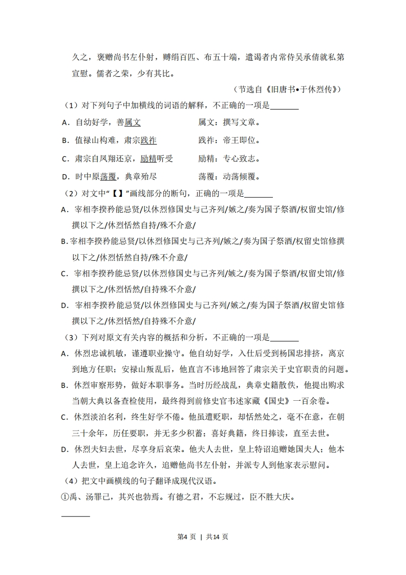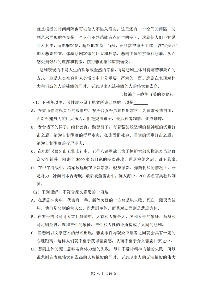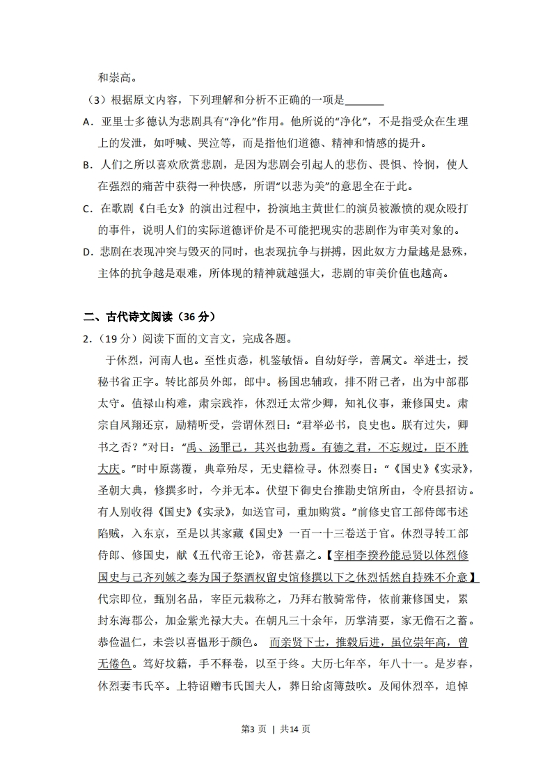 2014年全国统一高考语文试卷(新课标I)一、现代文阅读(9分)1.(9分)阅读下面的文字,完成各题。悲剧产生于社会的矛盾、两种社会力量的冲突。冲突双方分别代表着真与假、善与恶、新与旧等对立的两极,却总是以代表真、善、新等美好的一方的失败、死亡、毁灭为结局,他们是悲剧的主人公。因为他们的力量还比较弱小,还无法与强大的旧势力或邪恶力量抗衡,正义的要求不能实现,于是形成了悲剧。古希腊学者亚里士多德指出,悲剧描写了比现实中更美好同时又是“与我们相似的”人物,通过他们的毁灭“引起怜悯和恐惧来使感情得到陶治”,即产生净化的作用。然而,悲剧不仅表现冲突与毁灭,而且表现抗争与拼搏,这是悲剧具有审美价值的最根本的原因。鲁迅说过:“悲剧将人生的有价值的东西毁灭给人看”。这种毁灭是抗争、拼搏以后的毁灭,抗争与拼搏体现了人的一种精神。古希腊神话中普罗米修斯为了人类从天上盗取火种,触怒了主神宙斯,被锁在高加索山崖上,每日遭神鹰啄食肝脏,但普罗米修斯毫不屈服,最后坠入深渊。罗丹的大理石雕塑《马身人首》中,人臂绝望地扑向一个它所抓不到的目标,而马足则陷于尘土不能自拔,表现出人性与兽性的冲突,象征着灵与肉的斗争,具有强烈的悲剧性。可以说,没有抗争就没有悲剧,冲突、抗争与毁灭是构成悲剧的三个主要因素。悲剧的审美价值的载体只能是文学艺术。因为人生有价值的东西、美好事物的毁灭是令人伤悲的,因此现实中的悲剧不能作为直接的审美对象来欣赏,否则人就是泯灭了人性的人了。现实中的悲剧只能激起人的同情、义愤,迫使人采取严肃的伦理态度和实践行动。民主革命时期,在演出歌剧《白毛女》的过程中,曾多次出现扮演地主黄世仁的演员被打甚至险遭枪击的事件,这是人们以实际的道德评价代替了审美活动。现实的悲剧只在客观上具有悲剧的审美性质,它们必须以文学艺术的形式表现出来,才能成为欣赏的对象,美学上所谓的“以悲为美”才能实现。悲剧成为审美对象只能以文学艺术的形式出现,原因在于它需要建立悲剧事件与人的心理距离。不仅遥远的时间会使过去的现实悲剧的悲惨因素淡化,第1页|共14页就是很近的时间间隔也可以使人不陷入现实。这里还有一个空间的间隔,悲剧艺术展现的毕竞是一个人们不熟悉或有点陌生的空间,这就使人们不容易介入其中,而能够客观、超然地看待。当然,在欣赏中审美主体可以“审美地”加入悲剧冲突,体验悲剧客体的巨大和狂暴、悲剧主体的抗争和悲痛,从而感受到强烈的震撼和刺激,获得悲剧感和审美愉悦。悲剧表现的不是人生的欢乐或全然的幸福,而是悲剧主体对待痛苦和死亡的方式,这是人类社会和人类活动中十分重要、严肃的一面。悲剧在表现对伟大和崇高的人的摧毁的同时,更表现出无法摧毁的人的伟大和崇高。(摘编自王晓旭《美的奥秘》)(1)下列各项中,其性质不属于原文所论悲剧的一项是A.在梁山伯与祝英台的故事中,祝英台女扮男装外出求学,为追求爱情自由,面对封建势力的巨大压力,拒绝委曲求全,最后触碑殉情,化成蝴蝶。B.老舍笔下的祥子,纯朴善良,勤劳能干,有着骆驼般坚韧的精神度的沉重打击之后,沦为自甘堕落的行尸走肉。在饱受旧社会、旧制的沉重打击之后,沦为自甘堕落的行尸走肉。C,在电影《狼牙山五壮士》中,五位八路军战士为了掩护大部队撤退及当地群众安全转移,阻击了3000多名日寇的多次进攻,弹尽粮绝之后,跳下悬崖。D.在甲午海战中,清军致远舰在中弹累累、舰身倾斜、弹药耗尽的情况下,开足马力,冲向日本吉野舰,最后被鱼雷击中,沉人海中,200多名官兵壮烈殉国。(2)下列理解,不符合原文意思的一项是A,在悲剧冲突中,代表真、善、新等美好的一方总是以失败、死亡、毁灭为结局,他们是悲剧的主人公,即悲剧主体,而其对立面则是悲剧客体。B.在罗丹的《马身人首》雕塑中,人首和人臂是人、灵和人性的象征,马身和马足则是兽、肉和兽性的象征,兽性和人性的矛盾构成了人间的悲剧。C,当悲剧以文学艺术的形式出现,悲剧事件与观众或读者之间就会具有一定的心理距离,这样人们就不至于获得悲剧感,从而不至于介入悲剧冲突之中。D,悲剧主体的死亡意味着肉体力量的失败,却并不意味精神力量的失败,所以说悲剧在表现伟大和崇高的人被摧毁的同时,更表现出人的无法摧毁的伟大第2页|共14页和崇高。(3)根据原文内容,下列理解和分析不正确的一项是A.亚里士多德认为悲剧具有“净化”作用。他所说的“净化”,不是指受众在生理上的发泄,如呼喊、哭泣等,而是指他们道德、精神和情感的提升。B.人们之所以喜欢欣赏悲剧,是因为悲剧会引起人的悲伤、畏惧、怜悯,使人在强烈的痛苦中获得一种快感,所谓“以悲为美”的意思全在于此。C.在歌剧《白毛女》的演出过程中,扮演地主黄世仁的演员被激愤的观众殴打的事件,说明人们的实际道德评价是不可能把现实的悲剧作为审美对象的。D.悲剧在表现冲突与毁灭的同时,也表现抗争与拼搏,因此奴方力量越是悬殊,主体的抗争越是艰难,所体现的精神就越强大,悲剧的审美价值也越高。二、古代诗文阅读(36分)2.(19分)阅读下面的文言文,完成各题。于休烈,河南人也。至性贞悫,机鉴敏悟。自幼好学,善属文。举进士,授秘书省正字。转比部员外郎,郎中