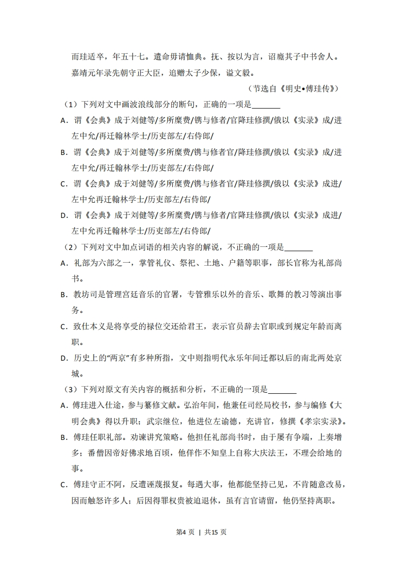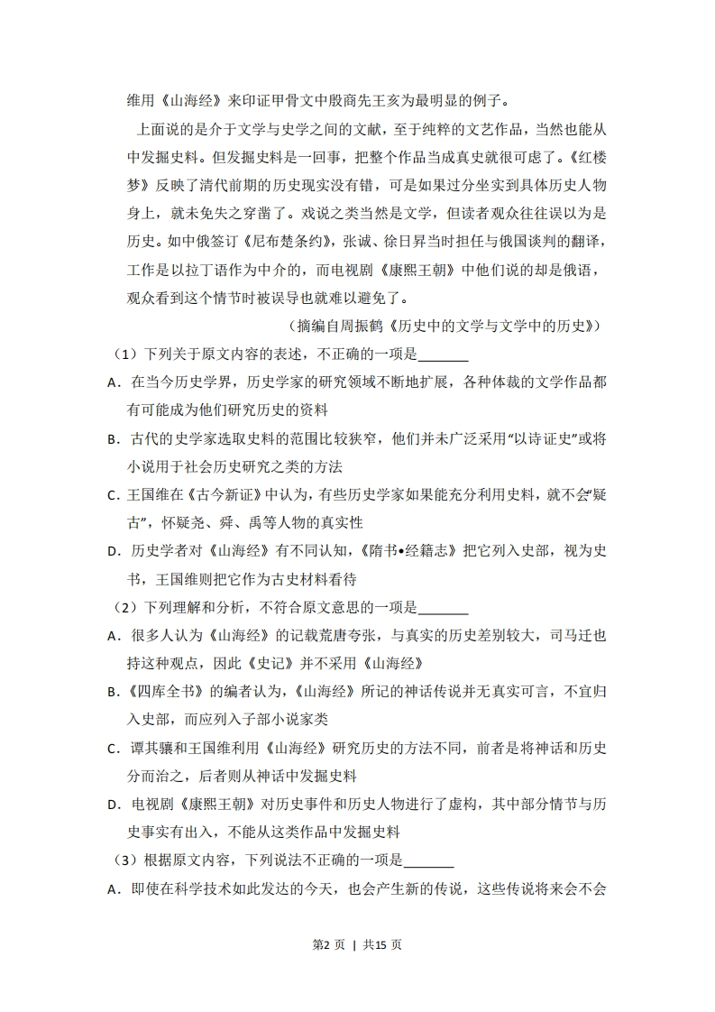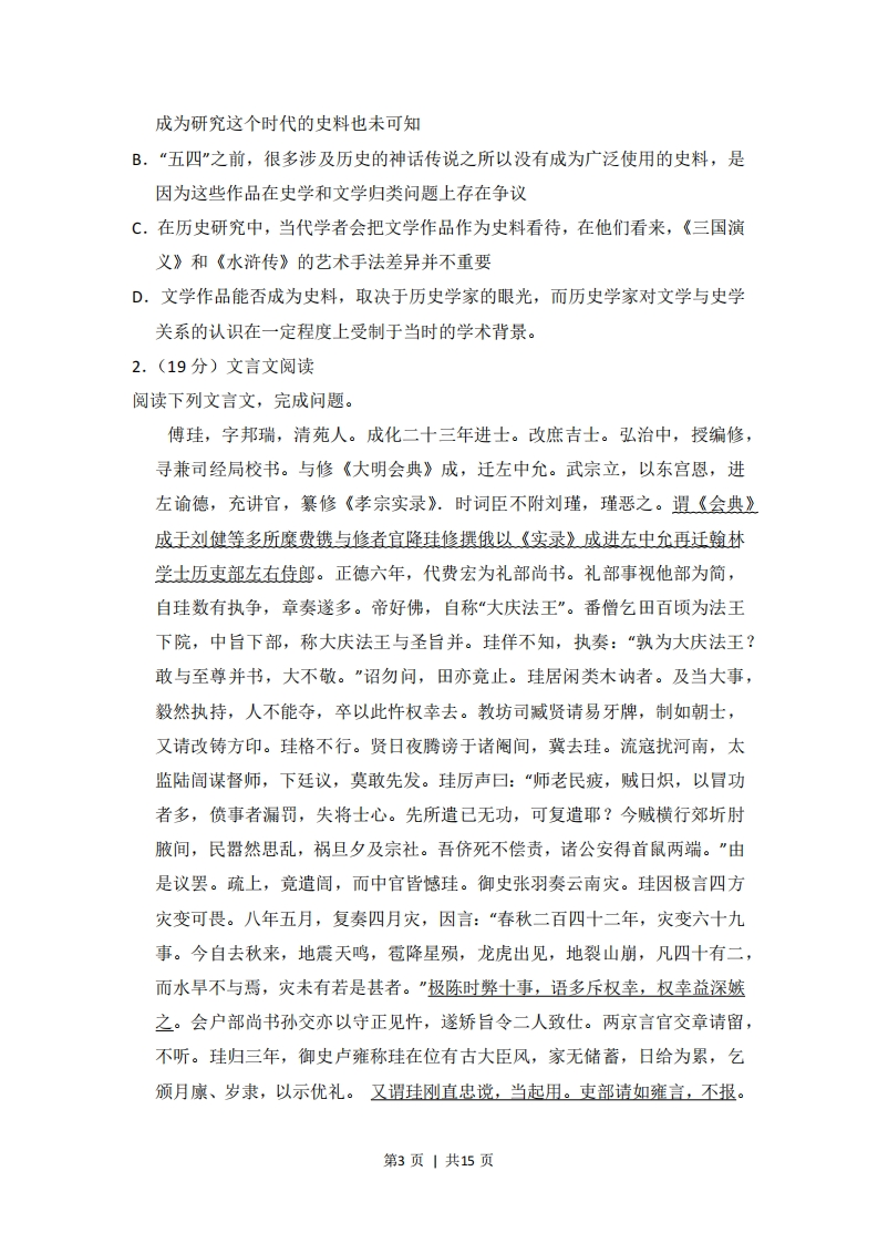 2016年全国统一高考语文试卷(新课标Ⅲ)一、现代文阅读(9分,每小题9分)1.(9分)阅读下面的文字,完成1~3题。文学中有历史。当今历史学家大都认为,没有什么文献资料不是史料,不但文学作品,即如佛经、道藏、信札、家谱、账本、碑铭等也无一不是,而且随着史学研究领域的拓展,史料范围还在不断扩大。从“三言二拍”里可以看到晚明市井生活的真实面貌,这对于研究社会史的人几乎是一个常识。陈寅恪以诗证史,也为大家所熟悉。但在“五四”以前,史料范围并非如此宽泛,文学作品在大多数史学家眼里也并非史料,有些文献到底属于文学还是史学,一两千年来都没有一致的看法。神话传说就是如此,其中相当突出的例子是《山海经》。神话传说是文学,史前时代,无文字可征,只有传说,暂当历史。三皇五帝至今未曾坐实,但“炎皇子孙”已经成为口头语,甚至成为历史共识。新的传说还会不断产生,能否成史颇为可疑,但以神话传说研究历史,却是一种重要的方法。在历史上,《山海经》究竞应归于文学还是史学,曾是死结。王国维《古史新证》说“而疑古之过,乃并尧、舜、禹之人物而变疑之,其于怀疑之态度及批评之精神不无可取,然惜于在于史材料未尝为充分之处理也。”这些古史材料就包括《山海经》《穆天子传》等文献。在《汉书·艺文志》里,《山海经》列于数术类。此后该书在目录学里的角色转换过几次,《隋书•经籍志》将《山海经》列于史部地理类,也就是将它看成史书了。历史是讲真实的,《山海经》一般被视为荒诞不经,连司马迁写《史记》都不敢采用。虽然《山海经》里平实的山川地理内容应归于史部,但其中大量的神话故事却显然有悖信史,所以清人编《四库全书》,言其“侈谈神怪,百无一真,是直小说之祖耳”,将其改列于子部小说家类。这个死结直到“五四”以后才大致解开。解开的途径有二:一是将《山海经》分而治之,不把它看作一部成于一人一时之书,神话归神话,历史归历史:二是神话中也有历史的成分在,仍可以之证史或补史。分而治之者,以为《山海经》中的《五藏山经》是比较雅正的部分,谭其骧就写了《<五藏山经>的地域范围》一文,分析《山经》写作时的地理知识水平。将历史成分发掘出来的,自然以王国第1页|共15页维用《山海经》来印证甲骨文中殷商先王亥为最明显的例子。上面说的是介于文学与史学之间的文献,至于纯粹的文艺作品,当然也能从中发掘史料。但发掘史料是一回事,把整个作品当成真史就很可虑了。《红楼梦》反映了清代前期的历史现实没有错,可是如果过分坐实到具体历史人物身上,就未免失之穿凿了。戏说之类当然是文学,但读者观众往往误以为是历史。如中俄签订《尼布楚条约》,张诚、徐日昇当时担任与俄国谈判的翻译,工作是以拉丁语作为中介的,而电视剧《康熙王朝》中他们说的却是俄语,观众看到这个情节时被误导也就难以避免了。(摘编自周振鹤《历史中的文学与文学中的历史》)(1)下列关于原文内容的表述,不正确的一项是A,在当今历史学界,历史学家的研究领域不断地扩展,各种体裁的文学作品都有可能成为他们研究历史的资料B.古代的史学家选取史料的范围比较狭窄,他们并未广泛采用“以诗证史”或将小说用于社会历史研究之类的方法C.王国维在《古今新证》中认为,有些历史学家如果能充分利用史料,就不会疑古”,怀疑尧、舜、禹等人物的真实性D.历史学者对《山海经》有不同认知,《隋书•经籍志》把它列入史部,视为史书,王国维则把它作为古史材料看待(2)下列理解和分析,不符合原文意思的一项是A.很多人认为《山海经》的记载荒唐夸张,与真实的历史差别较大,司马迁也持这种观点,因此《史记》并不采用《山海经》B.《四库全书》的编者认为,《山海经》所记的神话传说并无真实可言,不宜归入史部,而应列入子部小说家类C.谭其骧和王国维利用《山海经》研究历史的方法不同,前者是将神话和历史分而治之,后者则从神话中发掘史料D.电视剧《康熙王朝》对历史事件和历史人物进行了虚构,其中部分情节与历史事实有出入,不能从这类作品中发掘史料(3)根据原文内容,下列说法不正确的一项是A.即使在科学技术如此发达的今天,也会产生新的传说,这些传说将来会不会第2页|共15页成为研究这个时代的史料也未可知B.“五四”之前,很多涉及历史的神话传说之所以没有成为广泛使用的史料,是因为这些作品在史学和文学归类问题上存在争议C,在历史研究中,当代学者会把文学作品作为史料看待,在他们看来,《三国演义》和《水浒传》的艺术手法差异并不重要D.文学作品能否成为史料,取决于历史学家的眼光,而历史学家对文学与史学关系的认识在一定程度上受制于当时的学术背景。2.(19分)文言文阅读阅读下列文言文,完成问题。傅珪,字邦瑞,清苑人。成化二十三年进士。改庶吉士。弘治中,授编修,寻兼司经局校书。与修《大明会典》成,迁左中允。武宗立,以东宫恩,进左谕德,充讲官,纂修《孝宗实录》.时词臣不附刘瑾,瑾恶之。谓《会典》成王刘健等多所糜费镌与修煮官隆珪修摆俄以《实录》成进左中允再迁翰林学士历吏部左右侍郎。正德六年,代费宏为礼部尚书。礼部事视他部为简,自珪数有执争,章奏遂多。帝好佛,自称“大庆法王”。番僧乞田百顷为法王下院,中旨下部,