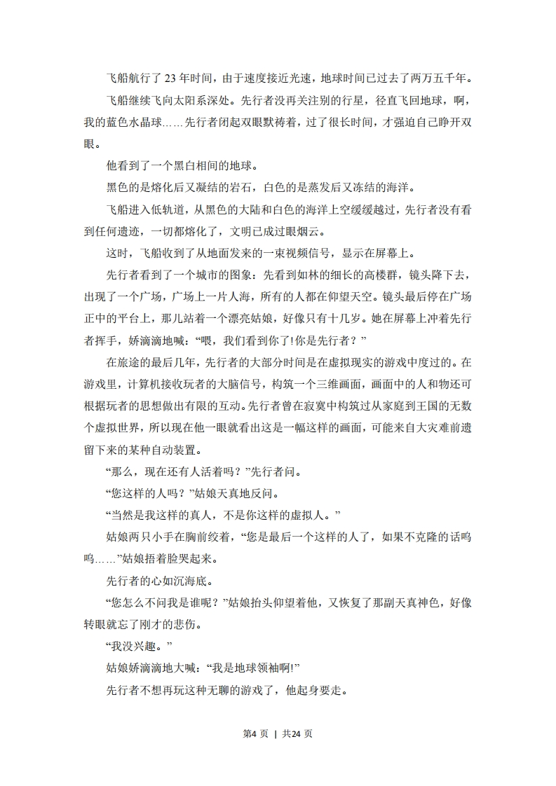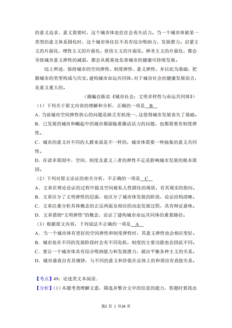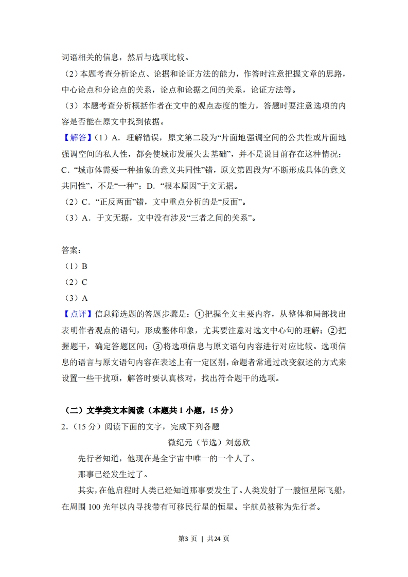 2018年全国统一高考语文试卷(新课标Ⅲ)套考答来与试题解析一、现代文阅读(36分)(一)论述类文本阅读(本题共1小题,9分)1.(9分)阅读下面的文字,完成各题。对城市而言,文明弹性是一个城市体在生存、创新、适应、应变等方面的综合状态、综合能力,是公共性与私人性之间、多样性与共同性之间、稳定性与变迁性之间、柔性与刚性之间的动态和谐,过于绵柔、松散,或者过于刚硬、密集,都是弹性不足或丧失的表现,是城市体出现危机的表征。当代城市社会,尤其需要关注以下文明弹性问题。其一,空间弹性,城市具有良好空间弹性的一个重要表现,是空间的私人性与公共性关系能够得到较为合理的处理。任何城市空间都是私人性与公共性的统一,空间弹性的核心问题,就是如何实现空间的公共性与私人性的有机统一、具体转换。片面地强调空间的公共性或片面地强调空间的私人性,都会使城市发展失去基础。目前,人们更多地要求空间的私人性,注重把空间固化为永恒的私人所有物、占有物。这种以私人化为核心的空间固化倾向,造成城市空间弹性不足,正在成为制约城市发展的一个重要原因。其二,制度弹性。一种较为理想的、有弹性的城市制度,是能够在秩序与活力、生存与发展间取得相对平衡的制度。城市有其发展周期、发展阶段,对一个正在兴起的城市而言,其主要任务是聚集更多的发展资源、激活发展活力。而对一个已经发展起来的城市而言,人们会更为注重城市制度的稳定功能。但问题在于,即使是正在崛起的城市,也需要面对秩序与稳定的问题即使是一个已经发展起来的城市,也需要面对新活力的激活问题。过于注重某种形式的城市制度,过于注重城市制度的某种目标,都是城市制度弹性不足、走向僵化的表现,都会妨害城市发展。其三,意义弹性。所谓城市的意义弹性,是指城市能够同时满足多样人群的不同层面的意义需要,并能够使不同的意义与价值在总体上达到平衡与和谐,不断形成具体的意义共同性。当一个城市体只允许一种、一个层面的意义存在时,这个城市体可能繁荣一时,但必然会走向衰落。当一个城市体只能满足某一类人第1页|共24页的意义追求、意义需要时,这个城市体也往往会丧失活力。当一个城市体被某一类型的意义体系固化时,这个城市体往往不具有综合吸纳力、发展潜力。启蒙主义的片面化,理性主义的片面化,世俗主义的片面化,神圣主义的片面化,都会导致城市意义弹性的减弱,都会从根基处危害城市的健康可持续发展。综上所述,保持城市的空间弹性、制度弹性、意义弹性,并以此为基础,把握城市的类型构成与历史,建构城市命运共同体,对于城市社会的健康发展而言,是意义重大的。(摘编自陈忠《城市社会:文明多样性与命运共同体》)(1)下列关于原文内容的理解和分析,正确的一项是BA.当前城市空间弹性核心的问题是缺乏有机统一,这使得城市发展丧失了基础。B.已发展的城市和崛起中的城市都面临着激活活力的问题,也都需要有制度弹性。C.城市的意义对不同的人群来说是不一样的,城市体需要一种抽象的意义共同性。D.在诸多原因中,空间、制度及意义三者的弹性不足是影响城市发展的根本原因。(2)下列对原文论证的相关分析,不正确的一项是CA.文章在理论论证的过程中提及空间被私人性固化的现状,有其现实的指向。B.文章区分了文明弹性的层面,也区分了城市体发展的阶段,论证结构清晰。C.文章注重分析具体概念的正反两面及相应的动态发展过程,具有辩证意味。D.文章借助“文明弹性”的概念,论证了建构城市命运共同体的重要路径。(3)根据原文内容,下列说法不正确的一项是AA.当一个城市体有更好的空间弹性和制度弹性时,其意义弹性也会相应变好。B.城市处在不同的发展阶段时会有不同危机,制度的主要功能也会因此不同。C.要让一个城市体具有综合吸纳能力和发展潜力,就应平衡各种主义的关系。D.城市盛衰自有其规律,与不同的意义和价值在总体上的和谐没有直接关系。【考点】49:论述类文本阅读.【分析】(1)本题考查理解文意,筛选并整合文中的信息的能力,答题时要找出第2页|共24页词语相关的信息,然后与选项比较。(2)本题考查分析论点、论据和论证方法的能力,作答时注意把握文章的思路,中心论点和分论点的关系,论点和论据之间的关系,论证方法等。(3)本题考查分析概括作者在文中的观点态度的能力,答题时要注意选项的内容是否能在原文中找到依据。【解答】(1)A.理解错误,原文第二段为“片面地强调空间的公共性或片面地强调空间的私人性,都会使城市发展失去基础”,并不是说目前存在这种情况:C.“城市体需要一种抽象的意义共同性”错,原文第四段为不断形成具体的意义共同性”,不是“一种”;D.“根本原因”于文无据。(2)C.“正反两面错,文中重点分析的是“反面”。(3)A.于文无据,文中没有涉及“三者之间的关系”。答案:(1)B(2)C(3)A【点评】信息筛选题的答题步骤是:①把握全文主要内容,从整体和局部找出表明作者观点的语句,形成整体印象,尤其要注意对选文中心句的理解:②把握题干,确定答题区间:③将选项信息与原文语句内容进行对应比较。选项信息的语言与原文语句内容在表述上有一定区别,命题者常通过改变叙述的方式来设置一些干扰项,解答时要认真核对,找出符合题干的