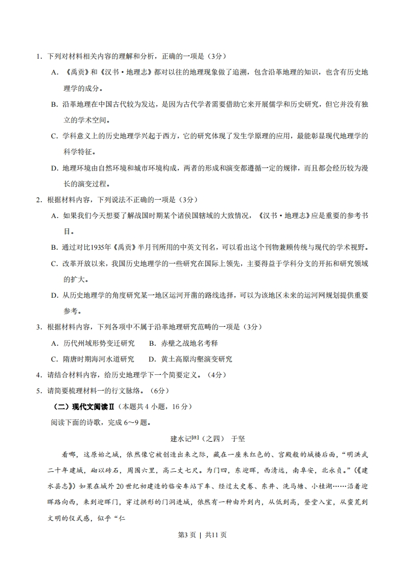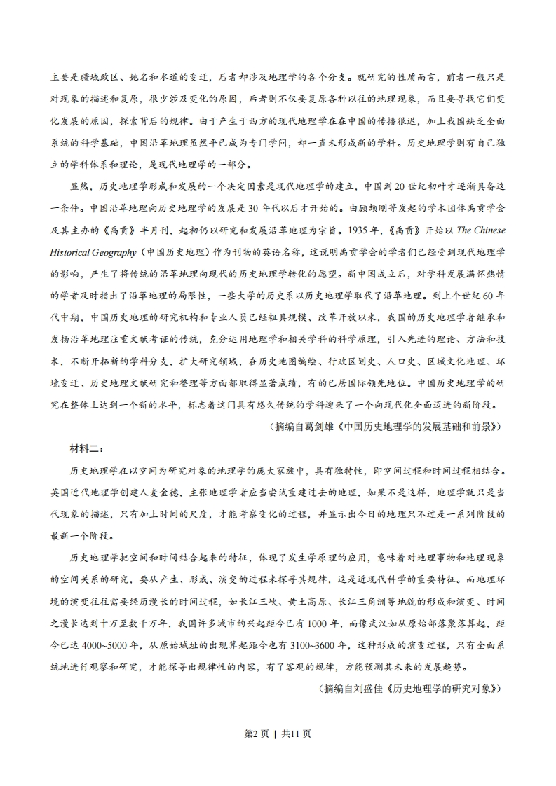 绝密★启用前2020年普通高等学校招生全国统一考试语文本卷满分150分,考试时间150分钟。注意事项:1.答卷前,考生务必将自己的姓名、准考证号填写在答题卡上。2.回答选择题时,选出每小题答案后,用铅笔把答题卡上对应题目的答案标号涂黑。如需改动,用橡皮擦干净后,再选涂其他答案标号。回答非选择题时,将答案写在答题卡上。写在本试卷上无效。3.考试结束后,将本试卷和答题卡一并交回。一、现代文阅读(35分)(一)现代文阅读I(本题共5小题,19分)阅读下面的文字,完成15题。材料一:历史地理学的起源至少可以追溯到我国最早的地理学著作《禹贡》。这篇托名大禹的著作实际产生在战国后期。《禹贡》虽以记载传说中的大禹治水后的地理状况为主,但也包含了对以往地理现象的追潮,含有历史地理学的成分。成书于公元1世纪的《汉书地理志》对见于典籍记载的重要地理要素,包括古国、历史政区、她名、河流、山岭、古迹等都做了记载和简要考证,并不局限于西汉一朝。作者班固比较充分地利用己有的地理记载和地理研究成果,使得中国历史地理学研究初具雏形。同样,成书于公元6世纪的《水经注》也从传世的数百种地理著作中搜集整理了大量史料,并做了深入的考证和研究。今天,我们之所以还能知道先秦的菜一个地名在现在的什么地方,能知道秦汉以降的疆域范围,能够大致了解黄河早期的几次改道,都离不开这两种著作。在中国漫长的历史中,皇朝的更迭、政权的兴衰、疆域的盈缩、政区的分合和地名的更改不断发生:黄河下游及其支流的频繁决溢改道又经常引起有关地区地貌及水系的变迁,给社会生活带来相当大的影响。中国古代繁荣的文化使这些变化大多得到了及时而详尽的记载,但由于在如此巨大的空间和时间中所发生的变化是如此复杂,已不是一般学者所能随意涉足,因而产生了一门专门学问一沿革地理。沿革地理研究的内容关系有国计民生,也是治学的基础,例如历史地名的注释和考证、历代疆域和政区的变迁、黄河等水道的变迁,特别是与儒家经典和传统正史的理解有关的地理名称和地理知识,都被看成是治学的基本功。沿革地理的成就在清代中期达到高峰,很多乾嘉学者致力于此。但是沿革地理并不等于历史地理学,二者不仅有量的不同,而且有质的区别。就研究内容而言,前者第1页|共11页主要是疆域政区、她名和水道的变迁,后者却涉及地理学的各个分支。就研究的性质而言,前者一般只是对现象的描述和复原,很少涉及变化的原因,后者则不仅要复原各种以往的地理现象,而且要寻找它们变化发展的原因,探索背后的规律。由于产生于西方的现代地理学在在中国的传播很迟,加上我国缺乏全面系统的科学基础,中国沿革地理虽然平已成为专门学问,却一直未形成新的学料。历史地理学则有自己独立的学科体系和理论,是现代地理学的一部分。显然,历史地理学形成和发展的一个决定因素是现代地理学的建立,中国到20世纪初叶才逐渐具备这一条件。中国沿革地理向历史地理学的发展是30年代以后才开始的。由顾顿刚等发起的学术团体禹贡学会及其主办的《禹贡》半月刊,起初仍以研究和发展沿革地理为宗旨。1935年,《禹贡》开始以The ChineseHistorical Geography(中国历史地理)作为刊物的英语名称,这说明禹贡学会的学者们已经受到现代地理学的影响,产生了将传统的沿革地理向现代的历史地理学转化的愿望。新中国成立后,对学科发展满怀热情的学者及时指出了沿革地理的局限性,一些大学的历史系以历史地理学取代了沿革地理。到上个世纪60年代中期,中国历史地理的研究机构和专业人员已经粗具规模、改革开放以来,我国的历史地理学者继承和发扬沿革地理注重文献考证的传统,克分运用地理学和相关学科的科学原理,引入先进的理论、方法和技术,不断开拓新的学科分支,扩大研究领域,在历史地图编绘、行政区划史、人口史、区城文化地理、环境变迁、历史地理文献研究和整理等方面都取得显著成绩,有的已居国际领先地位。中国历史地理学的研究在整体上达到一个新的水平,标志着这门具有悠久传统的学科迎来了一个向现代化全面迈进的新阶段。(摘编自葛剑雄《中国历史地理学的发展基础和前景》)材料二:历史地理学在以空间为研究对象的地理学的庞大家族中,具有独特性,即空间过程和时间过程相结合。英国近代地理学创建人麦金德,主张地理学者应当尝试重建过去的地理,如果不是这样,地理学就只是当代现象的描述,只有加上时间的尺度,才能考察变化的过程,并显示出今日的地理只不过是一系列阶段的最新一个阶段。历史地理学把空间和时间结合起来的特征,体现了发生学原理的应用,意味着对地理事物和地理现象的空间关系的研究,要从产生、形成、演变的过程来探寻其规律,这是近现代科学的重要特征。而地理环境的演变往往需要经历漫长的时间过程,如长江三峡、黄土高原、长江三角洲等地貌的形成和演变、时间之漫长达到十万至数千万年,我国许多城市的兴起距今已有1000年,而像武汉如从原始部落聚落算起,距今已达4000~5000年,从原始城址的出现算起距今也有3100~3600年,这种形成的演变过程,只有全面系统地进行观察和研究,才能探寻出规律性的内容,有了客观的规律,方能预测其未来的发展趋势。(摘编自刘盛佳《