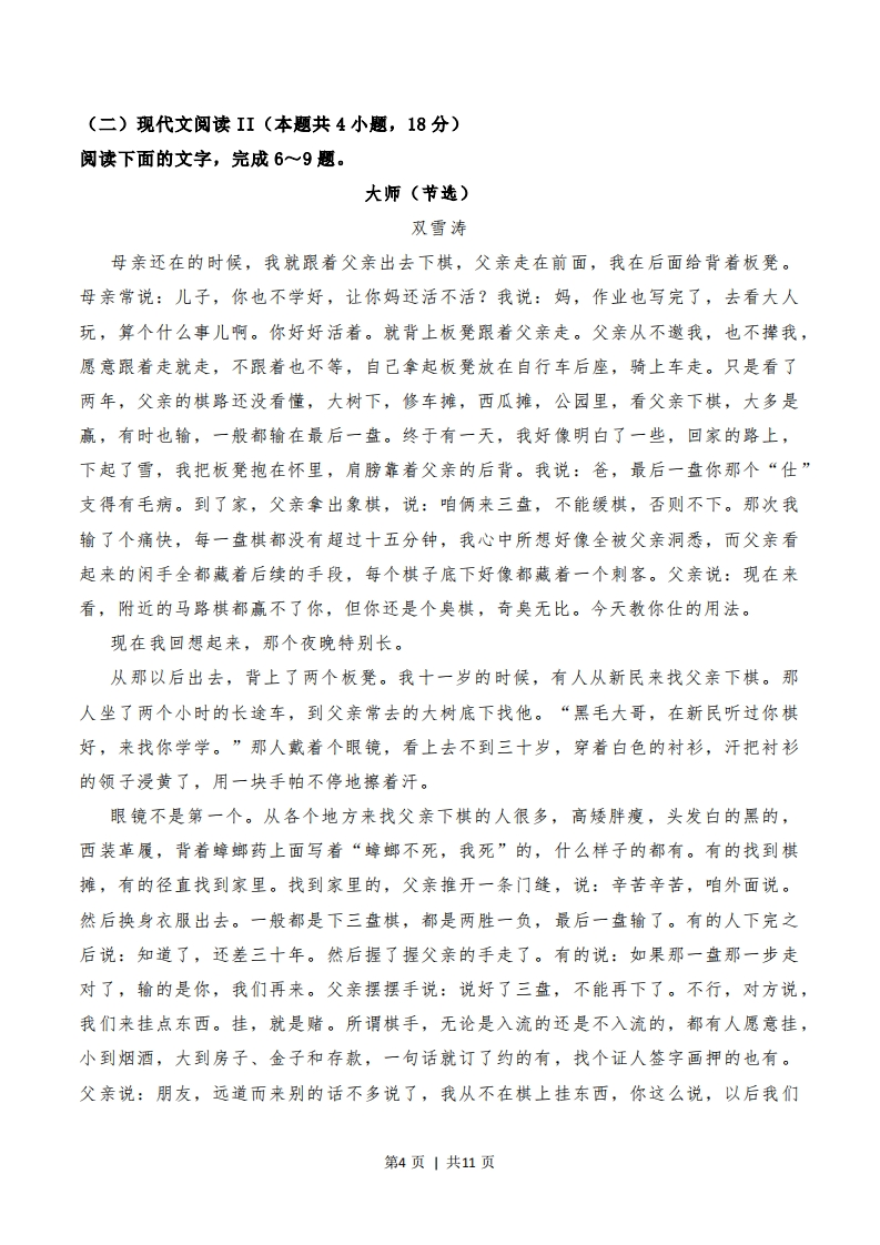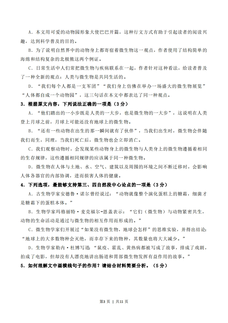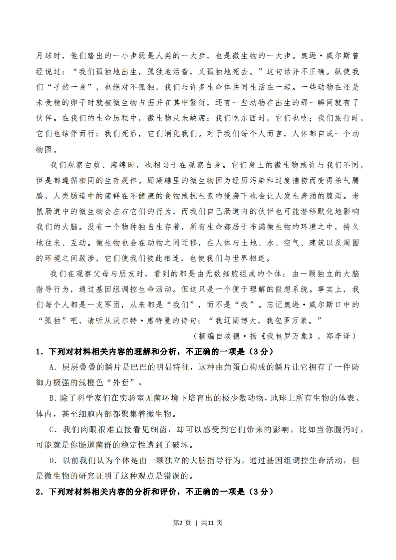 2020年新高考Ⅱ卷(海南)试题一、现代文阅读(35分)(一)现代文阅读I(本题共5小题,17分)阅读下面的文字,完成1~5题。巴巴看起来一点儿也不害怕。它不怕把它团团围住的兴奋的小孩,而是十分镇定地接受着加州夏日烈阳的炙烤。这种漫不经心的态度是能说得通的,因为它就生活在既安全又轻松的环境中。巴巴是一只肚皮雪白的穿山甲,这种惹人喜爱的动物约莫一只小猫那么大。它脸频边缘的一圈毛好似山羊胡,粉色的脸颊下方是一截尖尖的、没有牙齿的口鼻一一十分适合吸食蚂蚁和白蚁。它最具特色的是覆满头、身、四肢和尾巴的鳞片,这些浅橙色的鳞片层层叠叠,形成了一件防御力极强的外套。构成这些鳞片的成分和你的指甲一样,都是角蛋白。巴巴是圣迭戈动物园的形象大使,它性格温顺,训练得当,能参与各类公众活动。动物园的工作人员常常把巴巴带到福利院、儿童医院等地方,为患病的孩子带去快乐,并向他们普及关于各类珍稀动物的科学知识。此时,罗布·奈特正用棉签轻轻擦拭它的脸部边缘,奈特是一名研究微观生命的学者,他研究细菌和其他微生物,特别着迷存在于动物体内或体表的微生物。开展研究前,他首先得收集它们,收集蝴蝶的人会用网兜和罐子,奈特的工具则是棉签。他把棉签伸进巴巴的鼻孔,仅仅转上几秒钟,就足以让白色棉签头上沾满来自穿山甲体内的微生物。巴巴不仅是一只穿山甲,也是一个携带丰富微生物的聚合体:一些微生物生活在它的体内,绝大多数分布在肠道内,还有一些附着在它的脸部、肚子、爪子和鳞片表面。其实人类身上也寄宿着微生物,地球上的所有生物都一样一一唯一的例外,是科学家在实验室无菌环境下极其小心地培育出来的极少数动物。我们身上仿佛在举办一场盛大的微生物展览,展品统称为微生物组。它们生活在我们的皮肤表面、身体内部,甚至是细胞内部。其中大部分是细菌,也有一些是其他的微小生命体,例如真菌(比如酵母菌)和古菌一一后者的身份至今保持神秘,还有数量多到难以估量的病毒。海绵是结构很简单的动物,其静态的身体从来不超过几个细胞那么厚,即使如此,它们的周围也寄宿着活跃的微生物。有时候,通过显微镜都几乎看不到海绵的本体,因为它的上面覆满了微生物。北极熊漫步在北极的冰原之上,举目四周除了冰块别无其他,可实际上,它们身上仍紧紧簇拥着微生物。当尼尔·阿姆斯特朗和巴兹·奥尔德林登上第1页1共11页月球时,他们踏出的一小步既是人类的一大步,也是微生物的一大步。奥逊·威尔斯曾经说过:“我们孤独地出生,孤独地活着,又孤独地死去。”这句话并不正确。纵使我们“子然一身”,也绝对不孤独,我们与许多生命体共同生活在一起。一些动物在还是未受精的卵子时就被微生物占据并在其中繁衍,还有一些动物在出生的那一瞬间就有了伙伴。在我们的生命历程中,微生物从未缺席:我们吃东西时,它们也吃;我们旅行时,它们也结伴而行;我们死后,它们消化我们。对于我们每个人而言,人体都自成一个动物园。我们观察白蚁、海绵时,也相当于在观察自身。它们身上的微生物或许与我们不同,但是都遵循相同的生存规律。珊瑚礁里的微生物因为经历污染和过度捕捞而变得杀气腾腾,人类肠道中的菌群在不健康的食物或抗生素的侵袭下也会让人发生奔涌的腹泻。老鼠肠道中的微生物会左右它们的行为,而我们自己肠道内的伙伴也可能潜移默化地影响我们的大脑。没有一个物种独自生存着,所有生命都居于布满微生物的环境之中,持久地往来、互动。微生物也会在动物之间迁移,在人体与土地、水、空气、建筑以及周围的环境之间跋涉,它们使我们彼此相连,也使我们与世界相连。我们在观察父母与朋友时,看到的都是由无数细胞组成的个体:由一颗独立的大脑指导行为,通过基因组调控生命活动。但这只是一个便于理解的假想系统。事实上,我们每个人都是一支军团,从来都是“我们”,而不是“我”。忘记奥逊·威尔斯口中的“孤独”吧,请听从沃尔特·惠特曼的诗句:“我辽阔博大,我包罗万象。”(摘编自埃德·扬《我包罗万象》,郑李译)1.下列对材料相关内容的理解和分析,不正确的一项是(3分)A.层层叠叠的鳞片是巴巴的明显特征,这种由角蛋白构成的鳞片让它拥有了一件防御力极强的浅橙色“外套”。B.除了科学家们在实验室无菌环境下培育出的极少数动物,地球上所有生物的体表、体内,甚至细胞内部都聚集着微生物。C.我们肉眼很难直接看见细菌,却可以感受到它们带来的影响,比如当你腹泻时,可能就是你肠道菌群的稳定性遭到了破坏。D,以前我们认为个体是由一颗独立的大脑指导行为,通过基因组调控生命活动,但是微生物的研究证明了这种观点是错误的。2.下列对材料相关内容的分析和评价,不正确的一项是(3分)第2页|共11页A,本文用可爱的动物园形象大使巴巴开篇,这种行文方式有助于引起读者的阅读兴趣,达到科学普及的目的。B.为了说明自然界中的动物身上都寄宿着微生物这一观点,作者使用了结构简单的海绵和结构复杂的北极熊这两个例证。C.日常生活中人们常把微生物与疾病联系在一起,作者针对这种看法,给读者普及了一种全新的观点:人类与微生物是共同生活的。D.“我们每个人都是一支军团”“我们身上仿佛在举办一场盛大的微生物展览”“人体都自