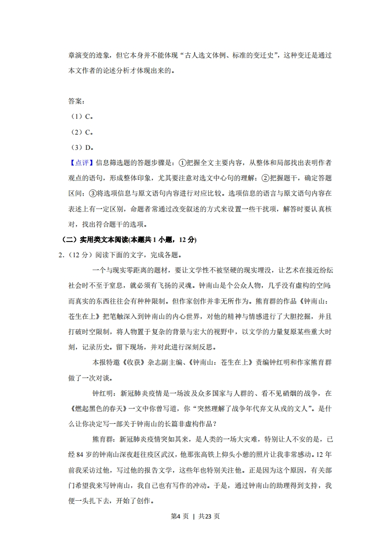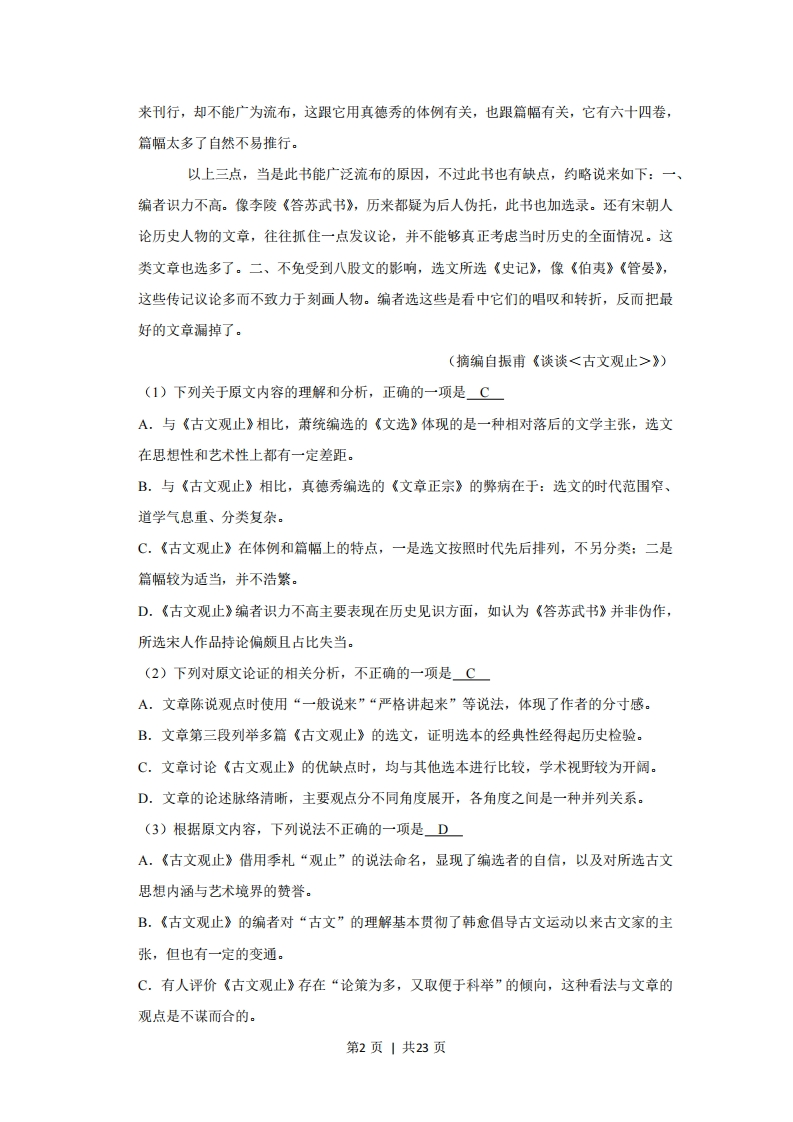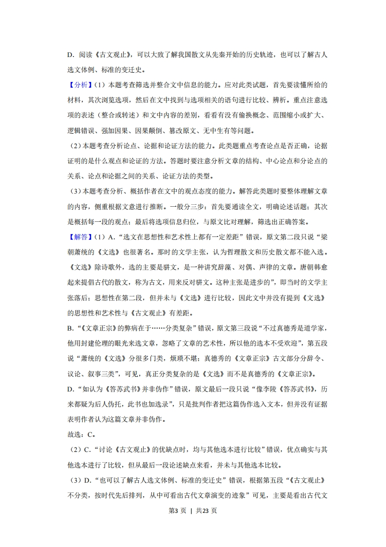 2020年全国统一高考语文试卷(新课标Ⅲ)◆考答案与试题解析一、现代文阅读(36分)(一)论述类文本阅读(本题共1小题,9分)1.(9分)阅读下面的文字,完成各题。《古文观止》是一个文章选本,“观止”本于《左传》记载季札在鲁国看乐舞时赞美的话:“观止矣!”这个选本是清朝吴楚材、吴调侯在康熙三十三年(1694)选定的,它备受读者喜欢是有原因的。第一,一般说来,它体现了比较进步的文学主张。古代的选本,梁朝萧统的《文选》也很著名。那时的文学主张,认为哲理散文和历史散文都不能入选。《文选》除诗歌外,选的主要是骈文,是一种讲究辞藻、对偶、声律的文章。唐朝韩愈起来提倡古代的散文,称为古文,用来反对骈文。这种主张是进步的。《古文观止》正是贯彻了韩愈以来的古文家的主张。第二,一般说来,入选这个选本的文章丰富多彩,思想性和艺术性是比较高的。自从韩愈提倡古文以后,古文的选本在《古文观止》前早己有了,像宋朝真德秀的《文章正宗》选录《左传》《国语》到唐朝末年的作品,《古文观止》的选文从《左传》开始,就是本于《文章正宗》。不过真德秀是道学家,他用封建伦理的眼光来选文章,忽略了文章的艺术性,所以他的选本不受欢迎。《古文观止》所选,像先秦的历史散文《曹刿论战》《鲁仲连义不帝秦》,表现当时人的智慧和品德:两汉文《治安策》和《出师表》,反映出当时政治上的重大矛盾,表现出作家的远见和忠诚:唐文《捕蛇者说》,深刻暴露封建统治者“苛政猛于虎”的罪恶:宋文《岳阳楼记》,通过不同景物的描写来表现“先天下之忧而忧,后天下之乐而乐”的崇高精神…这些名篇,都是古今传诵。这个选本所选文章的丰富多彩,也表现在文章的体制上。选本也选了几篇韵文、骈文。严格讲起来,古文跟骈文是对立的。但就中国文学史的发展讲,古文由散体趋向骈体,再由骈体回复到散体,完全不选骈体,就看不出这种变化来。第三,这个选本的编选体例也有它的好处。萧统的《文选》分很多门类,烦琐不堪:真德秀的《文章正宗》古文部分分辞令、议论、叙事三类。《古文观止》不分类,按时代先后排列,从中可看出古代文章演变的迹象。这个选本得以广泛流传,跟它的篇幅也有关。康熙二十四年(1685),康熙命令编选《古文渊鉴》,称为御选。用皇帝的名义第1页|共23页来刊行,却不能广为流布,这跟它用真德秀的体例有关,也跟篇幅有关,它有六十四卷,篇幅太多了自然不易推行。以上三点,当是此书能广泛流布的原因,不过此书也有缺点,约略说来如下:一、编者识力不高。像李陵《答苏武书》,历来都疑为后人伪托,此书也加选录。还有宋朝人论历史人物的文章,往往抓住一点发议论,并不能够真正考虑当时历史的全面情况。这类文章也选多了。二、不免受到八股文的影响,选文所选《史记》,像《伯夷》《管晏》,这些传记议论多而不致力于刻画人物。编者选这些是看中它们的唱叹和转折,反而把最好的文章漏掉了。(摘编自振甫《谈谈<古文观止>》)(1)下列关于原文内容的理解和分析,正确的一项是CA,与《古文观止》相比,萧统编选的《文选》体现的是一种相对落后的文学主张,选文在思想性和艺术性上都有一定差距。B.与《古文观止》相比,真德秀编选的《文章正宗》的弊病在于:选文的时代范围窄、道学气息重、分类复杂。C.《古文观止》在体例和篇幅上的特点,一是选文按照时代先后排列,不另分类:二是篇幅较为适当,并不浩繁。D.《古文观止》编者识力不高主要表现在历史见识方面,如认为《答苏武书》并非伪作,所选宋人作品持论偏颇且占比失当。(2)下列对原文论证的相关分析,不正确的一项是CA.文章陈说观点时使用“一般说来”“严格讲起来”等说法,体现了作者的分寸感。B.文章第三段列举多篇《古文观止》的选文,证明选本的经典性经得起历史检验。C.文章讨论《古文观止》的优缺点时,均与其他选本进行比较,学术视野较为开阔。D.文章的论述脉络清晰,主要观点分不同角度展开,各角度之间是一种并列关系。(3)根据原文内容,下列说法不正确的一项是DA.《古文观止》借用季札“观止”的说法命名,显现了编选者的自信,以及对所选古文思想内涵与艺术境界的赞誉。B.《古文观止》的编者对“古文”的理解基本贯彻了韩愈倡导古文运动以来古文家的主张,但也有一定的变通。C.有人评价《古文观止》存在“论策为多,又取便于科举”的倾向,这种看法与文章的观点是不谋而合的。第2页|共23页D.阅读《古文观止》,可以大致了解我国散文从先秦开始的历史轨迹,也可以了解古人选文体例、标准的变迁史。【分析】(1)本题考查筛选并整合文中信息的能力。应对此类试题,首先要读懂所给的材料,其次浏览选项,然后在文中找到与选项相关的语句进行比较、辨析。重点注意选项的表述(整合或转述)和文中内容的差别,看看有没有偷换概念、范围缩小或扩大、逻辑错误、强加因果、因果颠倒、篡改原文、无中生有等问题。(2)本题考查分析论点、论据和论证方法的能力。此类题重点考查论点是否正确,论据证明的是什么观点和论证的方法。答题时要注意分析文章的结构、中心论点和分论点的关系、论点和论据之间的关系、论证方法的类型。(3)本题考查分析、概括作者在文中的观点态度的能力。解答此类题时要整体理解文章的