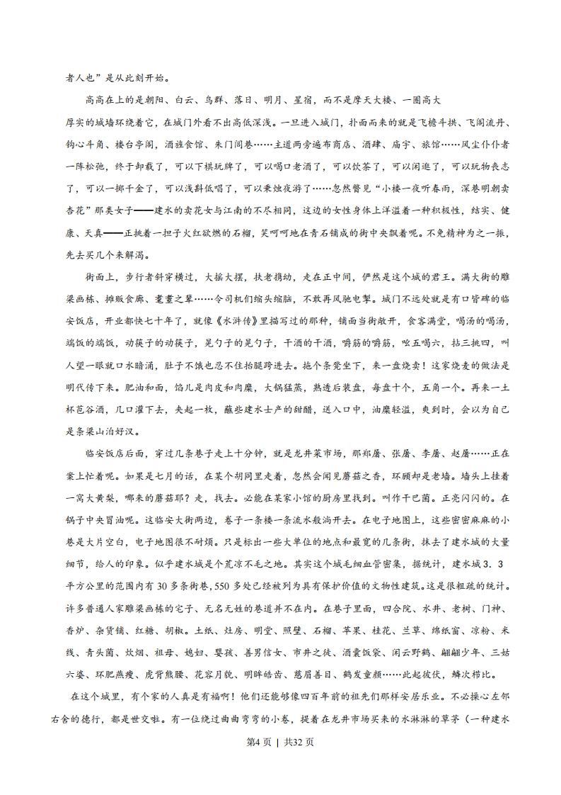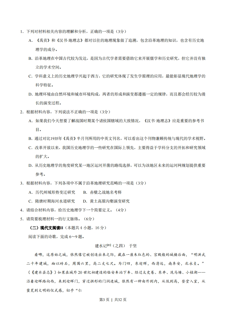 绝密★启用前2020年普通高等学校招生全国统一考试语文本卷满分150分,考试时间150分钟。注意事项:1.答卷前,考生务必将自己的姓名、准考证号填写在答题卡上。2.回答选择题时,选出每小题答案后,用铅笔把答题卡上对应题目的答案标号涂黑。如需改动,用橡皮擦干净后,再选涂其他答案标号。回答非选择题时,将答案写在答题卡上。写在本试卷上无效。3.考试结束后,将本试卷和答题卡一并交回。一、现代文阅读(35分)(一)现代文阅读1(本题共5小题,19分)阅读下面的文字,完成15题。材料一历史地理学的起源至少可以追溯到我国最早的地理学著作《禹贡》。这篇托名大禹的著作实际产生在战国后期。《禹贡》虽以记载传说中的大禹治水后的地理状况为主,但也包含了对以往地理现象的追潮,含有历史地理学的成分。成书于公元1世纪的《汉书地理志》对见于典籍记载的重要地理要素,包括古国、历史政区、她名、河流、山岭、古迹等都做了记载和简要考证,并不局限于西汉一朝。作者班固比较充分地利用己有的地理记载和地理研究成果,使得中国历史地理学研究初具雏形。同样,成书于公元6世纪的《水经注》也从传世的数百种地理著作中搜集整理了大量史料,并做了深入的考证和研究。今天,我们之所以还能知道先秦的菜一个地名在现在的什么地方,能知道秦汉以降的疆域范围,能够大致了解黄河早期的几次改道,都离不开这两种著作。在中国漫长的历史中,皇朝的更迭、政权的兴衰、疆域的盈缩、政区的分合和地名的更改不断发生:黄河下游及其支流的频繁决溢改道又经常引起有关地区地貌及水系的变迁,给社会生活带来相当大的影响。中国古代繁荣的文化使这些变化大多得到了及时而详尽的记载,但由于在如此巨大的空间和时间中所发生的变化是如此复杂,已不是一般学者所能随意涉足,因而产生了一门专门学问一沿革地理。沿革地理研究的内容关系有国计民生,也是治学的基础,例如历史地名的注释和考证、历代疆域和政区的变迁、黄河等水道的变迁,特别是与儒家经典和传统正史的理解有关的地理名称和地理知识,都被看成是治学的基本功。沿革地理的成就在清代中期达到高峰,很多乾嘉学者致力于此。但是沿革地理并不等于历史地理学,二者不仅有量的不同,而且有质的区别。就研究内容而言,前者第1页|共32页主要是疆域政区、她名和水道的变迁,后者却涉及地理学的各个分支。就研究的性质而言,前者一般只是对现象的描述和复原,很少涉及变化的原因,后者则不仅要复原各种以往的地理现象,而且要寻找它们变化发展的原因,探索背后的规律。由于产生于西方的现代地理学在在中国的传播很迟,加上我国缺乏全面系统的科学基础,中国沿革地理虽然平已成为专门学问,却一直未形成新的学料。历史地理学则有自己独立的学科体系和理论,是现代地理学的一部分。显然,历史地理学形成和发展的一个决定因素是现代地理学的建立,中国到20世纪初叶才逐渐具备这一条件。中国沿革地理向历史地理学的发展是30年代以后才开始的。由顾顿刚等发起的学术团体禹贡学会及其主办的《禹贡》半月刊,起初仍以研究和发展沿革地理为宗旨。1935年,《禹贡》开始以The ChineseHistorical Geography(中国历史地理)作为刊物的英语名称,这说明禹贡学会的学者们已经受到现代地理学的影响,产生了将传统的沿革地理向现代的历史地理学转化的愿望。新中国成立后,对学科发展满怀热情的学者及时指出了沿革地理的局限性,一些大学的历史系以历史地理学取代了沿革地理。到上个世纪60年代中期,中国历史地理的研究机构和专业人员已经粗具规模、改革开放以来,我国的历史地理学者继承和发扬沿革地理注重文献考证的传统,克分运用地理学和相关学科的科学原理,引入先进的理论、方法和技术,不断开拓新的学科分支,扩大研究领域,在历史地图编绘、行政区划史、人口史、区城文化地理、环境变迁、历史地理文献研究和整理等方面都取得显著成绩,有的已居国际领先地位。中国历史地理学的研究在整体上达到一个新的水平,标志着这门具有悠久传统的学科迎来了一个向现代化全面迈进的新阶段。(摘编自葛剑雄《中国历史地理学的发展基础和前景》)材料二:历史地理学在以空间为研究对象的地理学的庞大家族中,具有独特性,即空间过程和时间过程相结合。英国近代地理学创建人麦金德,主张地理学者应当尝试重建过去的地理,如果不是这样,地理学就只是当代现象的描述,只有加上时间的尺度,才能考察变化的过程,并显示出今日的地理只不过是一系列阶段的最新一个阶段。历史地理学把空间和时间结合起来的特征,体现了发生学原理的应用,意味着对地理事物和地理现象的空间关系的研究,要从产生、形成、演变的过程来探寻其规律,这是近现代科学的重要特征。而地理环境的演变往往需要经历漫长的时间过程,如长江三峡、黄土高原、长江三角洲等地貌的形成和演变、时间之漫长达到十万至数千万年,我国许多城市的兴起距今已有1000年,而像武汉如从原始部落聚落算起,距今已达4000~5000年,从原始城址的出现算起距今也有31003600年,这种形成的演变过程,只有全面系统地进行观察和研究,才能探寻出规律性的内容,有了客观的规律,方能预测其未来的发展趋势。(摘编自刘盛佳《历