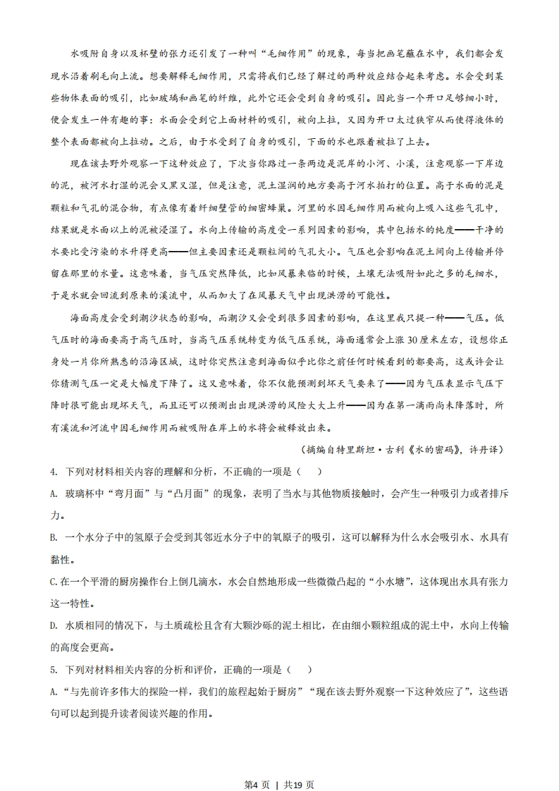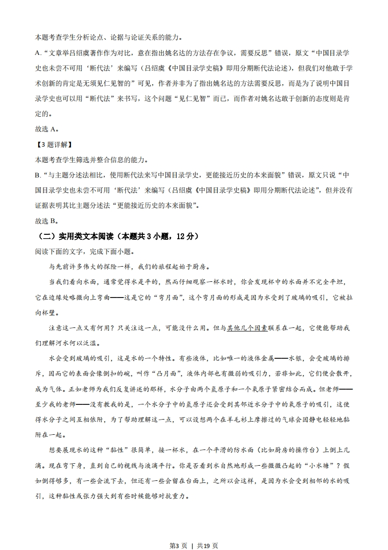 2021年普通高等学校招生全国统一考试(全国甲卷)语文一、现代文阅读(36分)(一)论述类文本阅读(本题共3小题,9分)阅读下面的文字,完成下面小题。据我知见,姚名达《中国目录学史》是近代西学东渐以来第一部以“中国目录学史”命名,全面、系统研究中国目录学发展历史的学术专著。与传统的、具有目录学史性质的著作相比,显然受到西方现代学科理论建构的影响。《中国目录学史》以主题分篇,每篇之下各有若干小节,全书凡十篇。它不像通常写专史那样,从古到今划分几个发展时期,通过揭示各个时期的特点来展现历史全貌。姚名达把他组织中国目录学史的方法称作“主题分述法”,其义就是“特取若干主题,通古今而直述,使其源流毕具,一览无余”。为什么不用通常的叙述方法来写中国目录学史?因为在他看来,中国目录学虽然源远流长,但发展进程中“时代精神殆无特别之差异”,就是说二千年来日录学形态在本质上没有跳出刘歆开创的模式:硬要划分时期,区别特点,“强立名义,反觉辞费”。关于这个问题当然可以见仁见智,中国目录学史也未尝不可用“断代法”来编写(吕绍虞《中国目录学史稿》即用分期断代法论述),但我们对他敢于学术创新的肯定是无须见仁见智的。问题在于,姚名达的方法是能够、又怎么能够让中国目录学“源流毕具,一览无余”呢?其实作者知道这样做也有不足,他说:“盖既分题各篇,则不能依时代为先后,故忽今忽古,使读者迷乱莫明,尤其大患。”利弊相权,怎么处理?姚名达的理念是:“体例为史事所用,而史事不为体例所困”:具体对策是:“依史之所宜,采多样之体例”。就是说,各篇采用适宜各自主题的体制,而不强求一律。《叙论篇》《结论篇》两篇分居首尾。《叙论篇》首先对“目录”“目录学”等基本概念加以定义,并对古往今来的日录做了分类,在一一分析日录学与其他学科的关系后,又划定了日录学的研究范围,末了详细阐明本书框架结构的组织方法,及其所本的学术理念。提钢学领,宣示宗旨,很符合现代学科的规范。《结论篇》以极短篇幅,阐述他对古代、现代和未来目录学的感想和希望,实际上也是其基本观点的提炼和总括。首尾两篇之间为全书的主体。其中,《溯源篇》追溯中国目录学的源头一刘向《别录》和刘歆《七略》。设立这个主题,出于他对中国目录学发展特点的基本认识:两书开创了目录体制和目录分类的基本模式,传统目录学既受两书庇荫,又长期笼罩在其阴影中,没有重大突破。该篇除详述两书分类、编目特点外,举凡书籍之产生、传述、整理、校勘等,莫不一一推寻原始,并上溯先秦日录之渊源,详详细细,原原本本。《溯源篇》以下各篇皆以主题为钢,通古贯今,看似“独立特行”,互不相干,其实却与传统纪传体史书体制暗合。比如,“志”在纪传体史书中统摄典章制度,《分类篇》《体质篇》都是讲目录基本制度,第1页1共19页编撰体例相当于纪传体的“志”。《中国目录学史》的理论框架并非无懈可击,但确有创意。姚名达对此亦颇为自许:“对于编制之体裁,杂用多样之笔法,不拘守一例,亦不特重一家,务综合大势,为有条理之叙述,亦一般不习见者。”在我看来,这的确不是过分的自诩。(摘编自严佐之《<中国目录学史>导读》)1.下列关于原文内容的理解和分析,不正确的一项是()A.《中国目录学史》既受到西方现代学科理论建构的影响,又与传统史书体制暗合。B.《中国目录学史》的各篇“采多样之体例”,好处是尊重史事,缺点是强立名义。C.《叙论》《结论》两篇虽非《中国目录学史》的主体,但对理解全书内容却很关键。D.姚名达认为,《别录》《七略》有开创之功,而传统目录学长期因循没有重大突破。2.下列对原文论证的相关分析,不正确的一项是()A.文章举吕绍虞著作作为对比,意在指出姚名达的方法存在争议,需要反思。B.文章多次征引姚名达的自述,通过对其理念的解释和评论,步步推进论述。C.文章对姚名达著作的评述,既有整体概括,又有具体举例,二者相互结合。D.文章以“据我知见”“在我看来”等语,对观点表述作出限制,立论审慎。3.根据原文内容,下列说法不正确的一项是()A.姚名达评估二千年来目录学传统,既立足于历史,又体现出学术批判的精神。B.与主题分述法相比,使用断代法来写中国目录学史,更能接近历史的本来面貌。C.《中国目录学史》不墨守成规而有所创新,本文作者对该书的理论框架表示认可。D.在近代西学东渐的背景下,《中国目录学史》体现出传统学术向现代学术的转型。【答案】1.B2.A3.B【解析】【分析】【1题详解】本题考查学生理解分析原文内容的能力。B.“《中国目录学史》…缺点是强立名义”错误,根据原文“因为在他看米,中国目录学虽然源远流长,但…硬要划分时期,区别特点,‘强立名义,反觉辞费’”可见,并不是《中国目录学史》强立名义,而是中国一直以来的目录学有“强立名义”的嫌疑,《中国目录学》是跳出了通常的中国目录学方法创新而作的“主题分述法”,根据主题选用合适体制而不强求一律。故选B。【2题详解】第2页|共19页本题考查学生分析论点、论据与论证关系的能力。A.“文章举吕绍虞著作作为对比,意在指出姚名达的方法存在争议,需要反思”错误,原文“中国目录学史也未尝不可用‘断代法’来编写(吕绍虞《中国目录学史