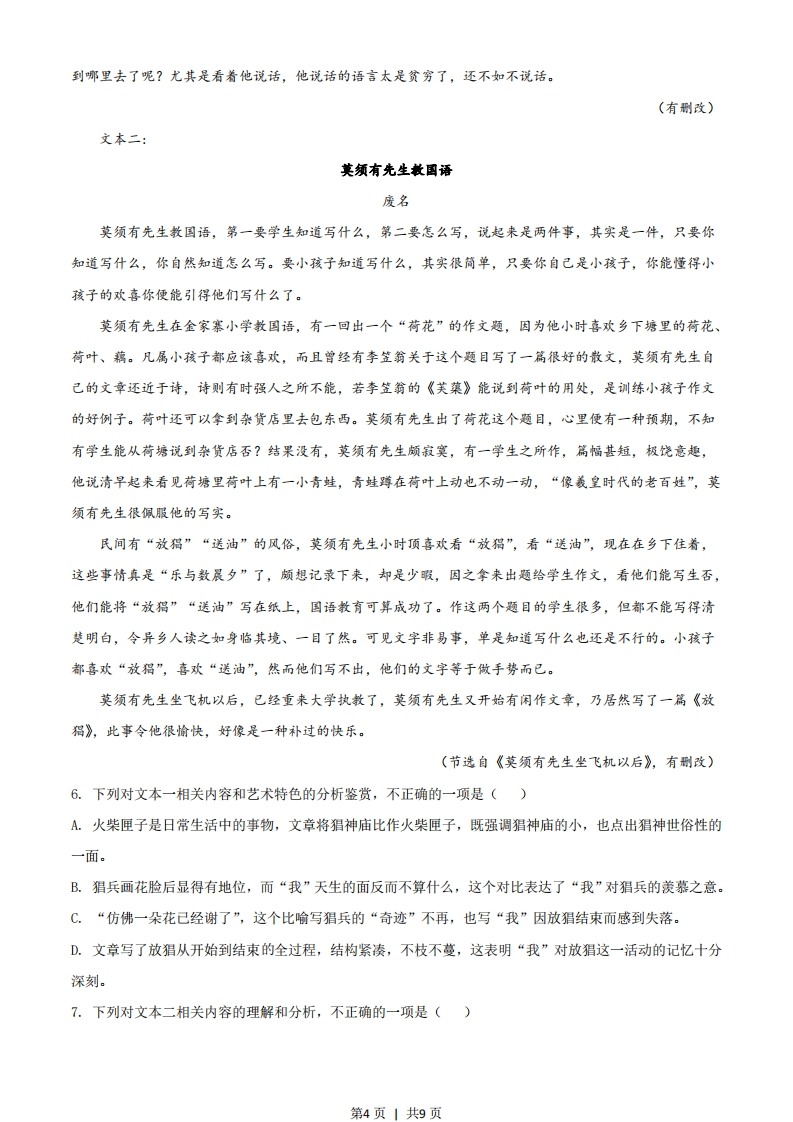 绝密★启用前2021年普通高等学校招生全国统一考试(新高考全国Ⅱ卷)语文一、现代文阅读(35分)(一)现代文阅读(本题共5小题,17分)阅读下面的文字,完成下面小题。网络空间是将人群聚集起来的一种新型社会空间,更是年轻一代学习、娱乐和交往的平台,为保证网络空间的有序,制定和遵守相应的规则是必要的。不仅如此,网络空间还需要每个人对网上的其他人给予应有的尊重。简言之,互联网不是法外之地。网络行为是由网民的观念意识引导的,而文明的网络行为是在一系列文明的观念意识支配下形成的。由于青年是网民的主体,其网络行为对网络空间的文明状况有极大影响,因此引导他们树立文明的网络行为观,无疑有助于网络行为失范的校正和网络空间的治理,有助于青年一代的健康成长。网络规范必不可少,这已是共识。但需要有什么样的规范,则是一个复杂的问题。底线伦理或“负面清单”是共识性最强也是最起码的网络行为规范,通过明确“不能做什么”来列出的网络行为负面清单,通常也是有法律强制性的禁区,构成最低层次的网络道德规范。归纳学术界对网络失范行为的分析,我们可以从“五不”来认识网络行为的底线要求,或以此作为网民尤其是青年们文明上网的负面清单。不伤害一网络行为者既不要有意作恶,也不能无意为恶,如在网上进行攻击、谩写,诋毁他人的名誉,或侵犯他人的安全、自由、隐私和利益等。不偷盗一在网络信息空间中,要像对待现实世界中的商品一样,以合法合规的方式获取所需的信任,抵制侵犯知识产权的不道德行为。不造假一每一个网民要从不进行信息造假做起,确保自己在网上发送的信息是真实的,尤其是自蝶体,不能为了吸引眼球而编造耸人听闻或哗众取宠的谣言。不浪费一即不发生信息浪费的行为,向网络发送垃圾信息不但会造成网络资源的浪费,也会耗费网民的时间和精力。信息时代工作效率的提高本来使我们获得了认知盈余,但网上的垃圾信息造谣与辟谣之间的拉锯战又无端消耗了我们的认知盈余。不盲从一上网时保持冷静清醒的头脑,不轻信网络谣言而上当受骗,没有造谣的网民,就没有网谣的市场,网民就不会被网络污染的策划者所利用,不会不明真相卷入人肉搜索或网络围攻。底线意识主要是从否定性的角度确立了网络中能做什么:而一旦在网络空间中产生了行为,无疑就是开始了“做什么”,只要有行为,就必须有一定的规范和要求去主导人的行为,于是就有了肯定意义上的网络行为意识。其中,做到平等待人或尊重他人可以说是形成积极网络行为的基准意识,而这种基准意识可以通过“等效意识”“反身意识”“价值意识”和“契约意识”来具体体现。所谓“等效意识”,就是当线上虚拟世界出现道德失范行为时,要将其视为与现实世界中的道德失范行第1页1共9页为具有等效的实际影响,因此需要一视同仁地对我们线上和线下的行为提出道德规范要求。所谓“反身意识”,可以说是等效意识在自我和他人关系上的延伸,即一个人的不当行为有可能损害到他人时,转换视角去设想当自己是这种行为的受害人时会有什么样的切身之痛,有了这样的反身意识,就会自觉抵制许多不良的网络行为,就不会到网上去传播谣言。“价值意识”在网络行为中有多方面的体现:第一,它表现为对他人信息劳动的价值认同,比如尊重知识产权:第二,重视信息内容的文化意义,从而积极传播内容健康的信息:第三,意识到网络作为信息技术的价值负载,从而关注信息技术使用的道德效应。由于技术普遍是负载价值的,不当使用网络可能会产生出负价值,如对网络游戏的沉迷会耽误学业和事业,此外,网络是“内容为王”的空间,是各种思想交锋的新的疆场,青年人尤其是被争夺的对象。因此,正确的价值观对他们而言具有主导性的作用。“契约意识”就是要具有信息契约精神。网络空间中,在信息的生产、传播和使用中新出现了大量的利益分配乃至利益冲突问题,冲击了传统的信任机制,通过订立契约的方式来规范各自权利和义务成为重构信任机制的重要方式之一。当作为未来希望的青年一代在网上讲诚信、守契约、服从大局时,网络中新的信任机制可随之形成。(摘编自肖峰《从底线伦理到担当精神:当代青年的网络文明意识》)1.下列对原文内容的理解和分析,正确的一项是()A.青年是网络空间的参与主体,因此有必要制定相应的规则,来规范和管理网络。B.网络上充塞的垃圾信息消耗了人们的认知盈余,导致线上工作效率不如线下。C.青年在进入网络空间时首先应遵从“五不”底线,明确在网络中不能做什么。D.“等效意识”要求网络行为的主体在现实和网络空间中的行为要始终保持一致。2.根据原文内容,下列说法不正确的一项是()A.“五不”是从否定性角度对网络行为作出的范,如违反可能会受到法律的惩罚。B.基准意识是对网络行为的积极要求,说明“能做什么”,比“不做什么”更重要。C.中国传统美德中的“己所不欲,勿施于人”有助于我们理解何谓“反身意识”。D.网络信息的生产、传播和使用产生了一些传信任机制框架内无法解决的新问题。3.下列选项,最能全面而准确概括原文主要观点的一项是()A.没有健全而成熟的网络立法,违法的网络行不被惩治,文明的网络行为就得不到保护,诚信社会也难以建成。B.网络行为
