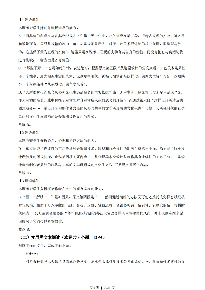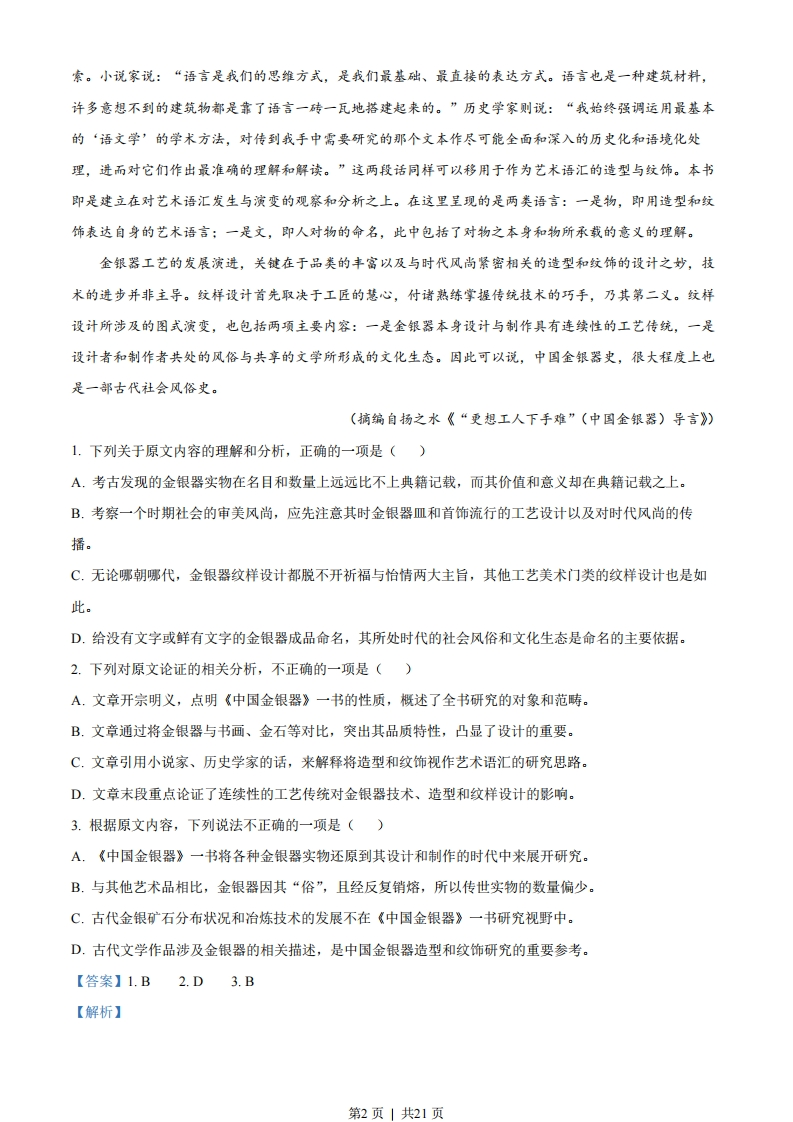 绝密★启用前2022年普通高等学校招生全国统一考试(甲卷)语文注意事项:1答卷前,考生务必将自已的姓名、准考证号填写在答题卡上。2.回答选择题时,选出每小题答案后,用铅笔把答题卡上对应题目的答案标号涂黑。如需或动,用橡皮擦干净后,再选涂其他答案标号。回答非选择题时,将答案写在答题卡上。写在本试卷上无效。3.考试结束后,将本试卷和答题卡一并交回。一、现代文阅读(36分)(一)论述类文本阅读(本题共3小题,9分)阅读下面的文字,完成下面小题。《中国金银器》是第一部中国古代金银器通史,囊括了器皿与首饰,着眼于造型与纹饰,究心于美术与工艺、审美与生活的关系。本书的研究旨趣,不在金银器的科学技术发展史,而在与社会生活史密切相关的造型、纹饰、风格的演变史,也可以说,它不是穷尽式的历史资料汇编,也不是用考古学的方法对器物分型、分式以划分时代,而是以目验实物为前提,从名物学入手,通过定名,以器物描述的方法,来展示工艺美术史与社会生活史中的金银器。中国古代金银器研究,是伴随现代考古学而生的一门新兴学问。传世文献展示的金银器史和出土文物呈现出来的金银器史,是不一样的。前者显示了数量颇多的名目和使用甚巨的数目,但提供具体形象的材料很少。考古发现的实物,就名目和数量而言,虽只是载籍的冰山一角,却是以形象示人:对于工艺美术要讨论的核心问题,即造型与纹饰,它提供了最为直观的实例。金银器兼具富与丽的双重品质。首先它是财富,其次它是一种艺术形态,然而通过销溶的办法又可使之反复改变样态以跟从时代风尚。相对于可入鉴藏的书画、金石、玉器、瓷器之雅,金银器可谓一俗到骨。它以它的俗,传播时代风尚。与其他门类相比,金银器皿和首饰的制作工艺都算不得复杂,这里便格外显示出设计的重要。从造型设计的角度来看,工艺美术是共性多、个性少、最为贴近生活的艺术。无论哪朝哪代,祈福与怡情都是纹样设计的两大主旨,当然,不同时代表现的形式多有不同,亦即选择与创造的艺术形象不同,这也正是工艺美术史所要展示的一个主要内容。这里“史”的概念是指以贴近设计者和制作者装饰用心的感知,展示没有文字或鲜有文字却只是以成品来显示的设计史脉络,而不是贴希历史编年来勾画发展的线第1页」共21页索。小说家说:“语言是我们的思维方式,是我们最基础、最直接的表达方式。语言也是一种建筑材料,许多意想不到的建筑物都是靠了语言一砖一瓦地搭建起来的。”历史学家则说:“我始终强调运用最基本的‘语文学’的学术方法,对传到我手中需要研究的那个文本作尽可能全面和深入的历史化和语境化处理,进而对它们作出最准确的理解和解读。”这两段话同样可以移用于作为艺术语汇的造型与纹饰。本书即是建立在对艺术语汇发生与演变的观察和分析之上。在这里呈现的是两类语言:一是物,即用造型和纹饰表达自身的艺术语言:一是文,即人对物的命名,此中包括了对物之本身和物所承载的意义的理解。金银器工艺的发展演进,关键在于品类的丰富以及与时代风尚紧密相关的造型和纹饰的设计之妙,技术的进步并非主导。纹样设计首先取决于工匠的慧心,付诸熟练掌提传统技术的巧手,乃其第二义。纹样设计所涉及的图式演变,也包括两项主要内容:一是金银器本身设计与制作具有连续性的工艺传统,一是设计者和制作者共处的风俗与共享的文学所形成的文化生态。因此可以说,中国金银器史,很大程度上也是一部古代社会风俗史。(摘编自扬之水《“更想工人下手难”(中国金银器)导言》)1.下列关于原文内容的理解和分析,正确的一项是()A.考古发现的金银器实物在名目和数量上远远比不上典籍记载,而其价值和意义却在典籍记载之上。B.考察一个时期社会的审美风尚,应先注意其时金银器皿和首饰流行的工艺设计以及对时代风尚的传播。C.无论哪朝哪代,金银器纹样设计都脱不开祈福与怡情两大主旨,其他工艺美术门类的纹样设计也是如此。D.给没有文字或鲜有文字的金银器成品命名,其所处时代的社会风俗和文化生态是命名的主要依据。2.下列对原文论证的相关分析,不正确的一项是()A.文章开宗明义,点明《中国金银器》一书的性质,概述了全书研究的对象和范畴。B.文章通过将金银器与书画、金石等对比,突出其品质特性,凸显了设计的重要。C.文章引用小说家、历史学家的话,来解释将造型和纹饰视作艺术语汇的研究思路。D.文章末段重点论证了连续性的工艺传统对金银器技术、造型和纹样设计的影响。3.根据原文内容,下列说法不正确的一项是()A.《中国金银器》一书将各种金银器实物还原到其设计和制作的时代中来展开研究。B.与其他艺术品相比,金银器因其“俗”,且经反复销熔,所以传世实物的数量偏少。C.古代金银矿石分布状况和治炼技术的发展不在《中国金银器》一书研究视野中。D.古代文学作品涉及金银器的相关描述,是中国金银器造型和纹饰研究的重要参考。【答案】1.B2.D3.B【解析】第2页1共21页【1题详解】本题考查学生筛选并辨析信息的能力。A.“而其价值和意义却在典籍记载之上”错,无中生有。相关信息在第三段,“考古发现的实物,就名目和数量而言,虽只是载籍的冰山一角,却是以形象示人:对于工艺美术要讨论的核心问题,即造型与纹