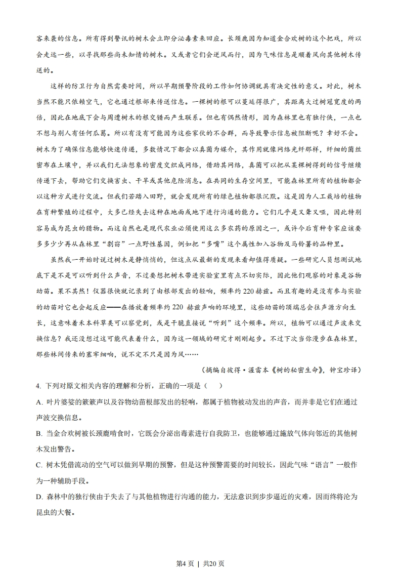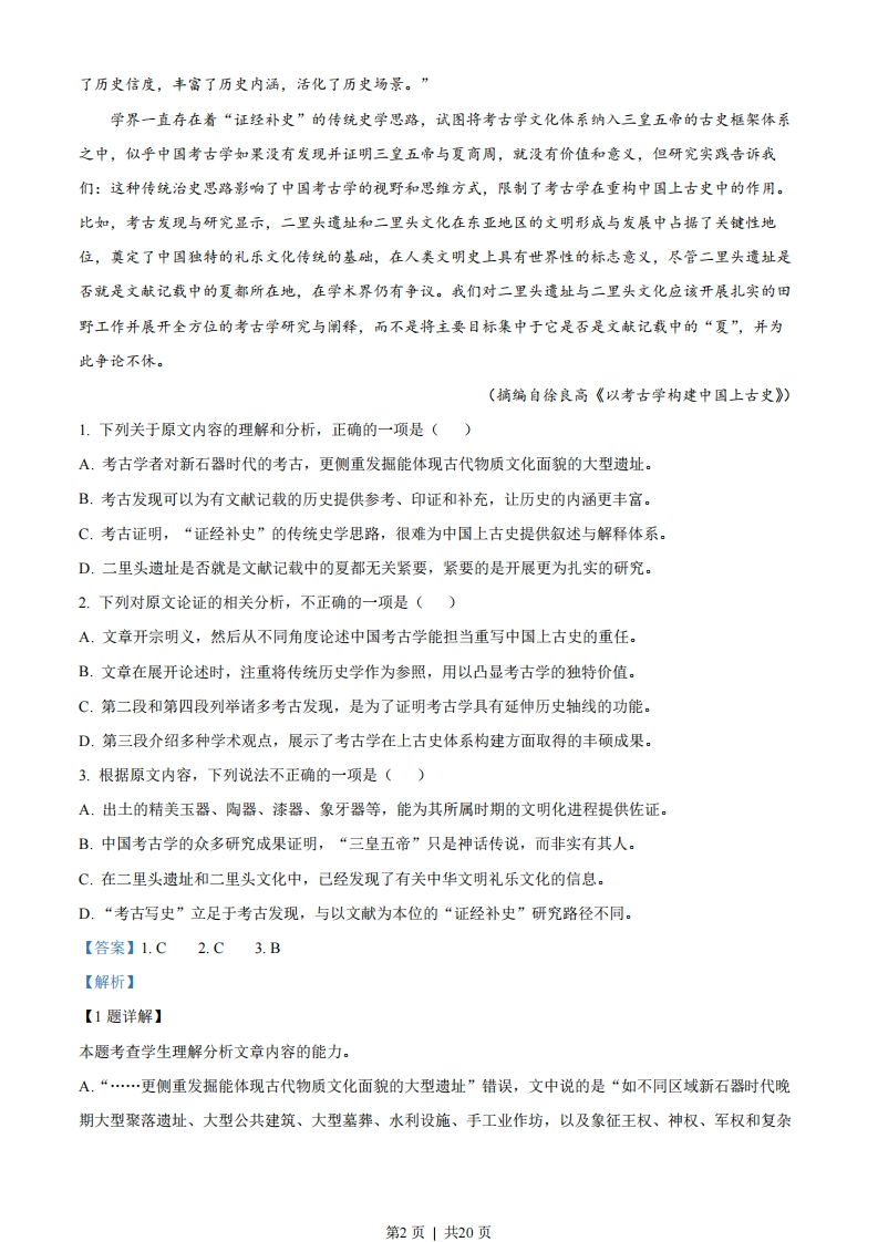 绝密★启用前2023年普通高等学校招生全国统一考试(全国甲卷)语文注意事项:1.答卷前,考生务必将自已的姓名、准考证号填写在答题卡上。2.回答选择题时,选出每小题答案后,用铅笔把答题卡上对应题目的答案标号涂黑。如需改动,用橡皮擦干净后,再选涂其他答案标号。回答非选择题时,将答案写在答题卡上。写在本试卷上无效。3.考试结束后,将本试卷和答题卡一并交回。一、现代文阅读(36分)(一)论述类文本阅读(本题共3小题,9分)阅读下面的文字,完成各题。随着中国考古学的飞速发展,考古资料得以大量积累,考古学文化时空框架体系基本建立,多学科合作日益深入,各种专题研究广泛展开。“考古写史”在中国已经取得巨大成就,获得诸多具有突破性和填补空白意义的成绩,中国考古学证明了自身的价值,尤其是在上古史构建方面展现了广阔前景。从考古发现来看,考古学提供了传统历史学不可想象的新发现、新材科,呈现出不同时期的古代物质文化面貌、古人日常生产生活状态以及各地的文明化进程等,如不同区域新石器时代晚期大型聚落遗址、大型公共建筑、大型墓葬、水利设施、手工业作坊,以及象征王权、神权、军权和复杂礼制出现的精美玉器、陶器、漆器、象牙器等。从重构上古史体系角度看,20世纪70一80年代,夏鼐、苏秉琦等系统地构建了新石器与夏商周三代时期的考古学文化区系类型时空框架体系。苏秉琦在新石器时代考古学文化区系类型基础上提出“满天星斗”“多元一体”和“古国一方国帝国”等关于中国上古史的历史叙述体系。严文明提出“重瓣花朵”模式,在承认多区域文化共存的文化多元性的同时,强调中原文化区“联系各文化区的核心作用”。张光直认为各地区文化多元发展并通过彼此之间的密切交流而形成一个“中国相互作用圈”。从二里头文化、二里岗文化到般墟考古学文化、周代考古学文化,考古学不仅展现了不同于传统文献记载的这一时期文化、科技、礼制等众多方面从发展到成熟的历史脉络,而且填补了诸多传统历史学的空白,如四川的三星推一金沙文化、江西的吴城文化、两周时期的曾国与中山国历史,等等。这些成果证明考古学完全有能力担当重写中国上古史的重任,并且已经初步形成具有自身特色的上古史叙述与解释体系,超越了传统的具有传说性质的三皇五帝体系和存在争议的夏商周三代古史体系,正如习近平总书记所说:“经过几代考古人接续奋斗,我国考古工作取得了重大成就,延伸了历史轴线,增强第1页」共20页了历史信度,丰富了历史内涵,活化了历史场景。”学界一直存在着“证经补史”的传统史学思路,试图将考古学文化体系纳入三皇五帝的古史框架体系之中,似乎中国考古学如果没有发现并证明三皇五帝与夏商周,就没有价值和意义,但研究实践告诉我们:这种传统治史思路影响了中国考古学的视野和思维方式,限制了考古学在重构中国上古史中的作用。比如,考古发现与研究显示,二里头遗址和二里头文化在东亚地区的文明形成与发展中占据了关键性地位,奠定了中国独特的礼乐文化传统的基础,在人类文明史上具有世界性的标志意义,尽管二里头遗址是否就是文献记载中的夏都所在地,在学术界仍有争议。我们对二里头遗址与二里头文化应该开展扎实的田野工作并展开全方位的考古学研究与阐释,而不是将主要目标集中于它是否是文献记载中的“夏”,并为此争论不休。(摘编自徐良高《以考古学构建中国上古史》)1.下列关于原文内容的理解和分析,正确的一项是()A.考古学者对新石器时代的考古,更侧重发掘能体现古代物质文化面貌的大型遗址。B.考古发现可以为有文献记载的历史提供参考、印证和补充,让历史的内涵更丰富。C.考古证明,“证经补史”的传统史学思路,很难为中国上古史提供叙述与解释体系。D.二里头遗址是否就是文献记载中的夏都无关紧要,紧要的是开展更为扎实的研究。2.下列对原文论证的相关分析,不正确的一项是()A.文章开宗明义,然后从不同角度论述中国考古学能担当重写中国上古史的重任。B.文章在展开论述时,注重将传统历史学作为参照,用以凸显考古学的独特价值。C.第二段和第四段列举诸多考古发现,是为了证明考古学具有延伸历史轴线的功能。D.第三段介绍多种学术观点,展示了考古学在上古史体系构建方面取得的丰硕成果。3.根据原文内容,下列说法不正确的一项是()A.出土的精美玉器、陶器、漆器、象牙器等,能为其所属时期的文明化进程提供佐证。B.中国考古学的众多研究成果证明,“三皇五帝”只是神话传说,而非实有其人。C.在二里头遗址和二里头文化中,己经发现了有关中华文明礼乐文化的信息。D.“考古写史”立足于考古发现,与以文献为本位的“证经补史”研究路径不同。【答案】1.C2.C3.B【解析】【1题详解】本题考查学生理解分析文章内容的能力。A.“…更侧重发掘能体现古代物质文化面貌的大型遗址”错误,文中说的是“如不同区域新石器时代晚期大型聚落遗址、大型公共建筑、大型墓葬、水利设施、手工业作坊,以及象征王权、神权、军权和复杂第2页1共20页礼制出现的精美玉器、陶器、漆器、象牙器等”,“以及”表示并列,无法看出侧重哪方面。B.“考古发现可以为…”错误,张冠李戴,由文中“考古学提供了…”“考古学不