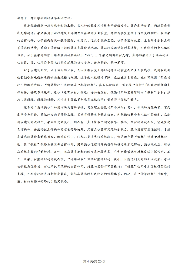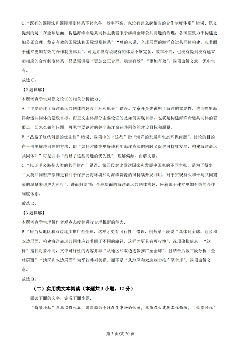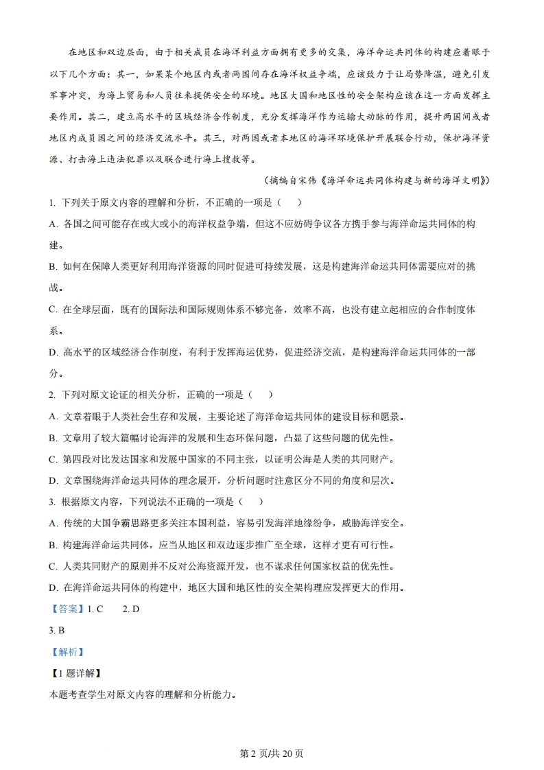 2024年普通高等学校招生全国统一考试(全国甲卷)语文使用地区:四川、宁夏、内蒙古、青海、陕西本试卷满分150分,考试时间150分钟。一、现代文阅读(36分)(一)论述类文本阅读(本题共3小题,9分)阅读下面的文字,完成下面小题。2019年4月23日,习近平主席在会见应邀出席中国人民解放军海军成立70周年多国海军活动的外方代表团团长时指出:“海洋对于人类社会生存和发展具有重要意义。海洋孕育了生命、联通了世界、促进了发展。我们人类居住的这个蓝色星球,不是被海洋分割成了各个弧岛,而是被海洋连结成了命运共同体,各国人民安危与共。”作为“人类命运共同体”的重要组成部分,海洋命运共同体的建设日标是打造一个持久和平、普遍安全、共同繁荣、开放包容、清洁美丽的海洋环境。要实现海洋的持久和平与普遍安全,各国必须摒弃传统的大国争霸思路,充分照顾彼此的安全关切和合理利益,联合起来打击海盗、人口走私、贩毒等海上犯罪行为,在涉及海洋权益争端时通过友好协商的方式来解决问题,短期内无法协商的问题可以考虑搁置争议。共同繁荣、开放包容和清洁美丽的愿景意味着,我们要坚持开放的自由贸易体系,同时共同应对气候变化、海洋环境保护等问题,发挥海洋作为国际贸易大通道的积极作用,关注发展中国家的发展诉求。随着人类技术水平的提升和各国经济发展对资源需求的日益增加,各国都希望开发利用更多的海洋资源。如何才能在更好地利用海洋资源的同时又促进可持续发展、构建海洋命运共同体?习近平总书记提出海洋发展的“四个转变”:“要提高海洋资源开发能力,着力推动海洋经济向质量效益型转变”:“要保护海洋生态环境,着力推动海洋开发方式向循环利用型转变”:“要发展海洋科学技术,希力推动海洋科技向创新引领型转变”:“要维护国家海洋权益,着力推动海洋维权向统筹兼顾型转变”。这为海洋开发利用指明了方向。具体到全球、地区和双边层面,构建海洋命运共同体应该着眼于不同的路径,这样才更具有可行性。在全球层面,构建海洋命运共同体主要着眼于涉海全球公共问题的治理,各国应致力于构建更加公正合理、稳定有效的国际法和国际规则体系。目前,发达国家和发展中国家在海洋资源的开发利用方面仍然存在矛盾。发达国家过于强调公海自由原则,希望利用技术上的优势开发更多的公海资源。发展中国家更多强调公海作为人类共同财产的原则。如果公海被确定为人类共同财产,那么它就不得被占有,所有国家共同参加公海管理,积极分享公海开发中获取的利益,并保障公海只用于和平目的。人类共同财产原则更有利于保护公海环境和对海洋资源的可持续开发利用,对于实现持久和平与共同繁荣的愿景来说更为可行。总的来说,全球层面的海洋命运共同体构建,应着眼于建立更加有效的合作制度体系。第1页供20页在地区和双边层面,由于相关成员在海洋利益方面拥有更多的交集,海洋命运共同体的构建应着眼于以下几个方面:其一,如果某个地区内或者两国间存在海洋权益争端,应该致力于让局势降温,避免引发军事冲突,为海上贸易和人员往来提供安全的环境。地区大国和地区性的安全架构应该在这一方面发挥主要作用。其二,建立高水平的区域经济合作制度,充分发挥海洋作为运输大动脉的作用,提升两国间或者地区内成员国之间的经济交流水平。其三,对两国或者本地区的海洋环境保护开展联合行动,保护海洋资源、打击海上违法犯罪以及联合进行海上搜救等。(摘编自宋伟《海洋命运共同体构建与新的海洋文明》)1.下列关于原文内容的理解和分析,不正确的一项是()A.各国之间可能存在或大或小的海洋权益争端,但这不应妨碍争议各方携手参与海洋命运共同体的构建。B.如何在保障人类更好利用海洋资源的同时促进可持续发展,这是构建海洋命运共同体需要应对的挑战。C.在全球层面,既有的国际法和国际规则体系不够完备,效率不高,也没有建立起相应的合作制度体系。D.高水平的区域经济合作制度,有利于发挥海运优势,促进经济交流,是构建海洋命运共同体的一部分。2.下列对原文论证的相关分析,正确的一项是()A.文章着眼于人类社会生存和发展,主要论述了海洋命运共同体的建设目标和愿景。B.文章用了较大篇幅讨论海洋的发展和生态环保问题,凸显了这些问题的优先性。C.第四段对比发达国家和发展中国家的不同主张,以证明公海是人类的共同财产。D.文章围绕海洋命运共同体的理念展开,分析问题时注意区分不同的角度和层次。3.根据原文内容,下列说法不正确的一项是()A.传统的大国争霸思路更多关注本国利益,容易引发海洋地缘纷争,威胁海洋安全。B.构建海洋命运共同体,应当从地区和双边逐步推广至全球,这样才更有可行性。C.人类共同财产的原则并不反对公海资源开发,也不谋求任何国家权益的优先性。D.在海洋命运共同体的构建中,地区大国和地区性的安全架构理应发挥更大的作用。【答案】1.C2.D3.B【解析】【1题详解】本题考查学生对原文内容的理解和分析能力。第2页供20页C.“既有的国际法和国际规则体系不够完备,效率不高,也没有建立起相应的合作制度体系”错误。原文提到的是“在全球层面,构建海洋命运共同体主要着眼于涉海全球公共问题的治理,各国应致力于