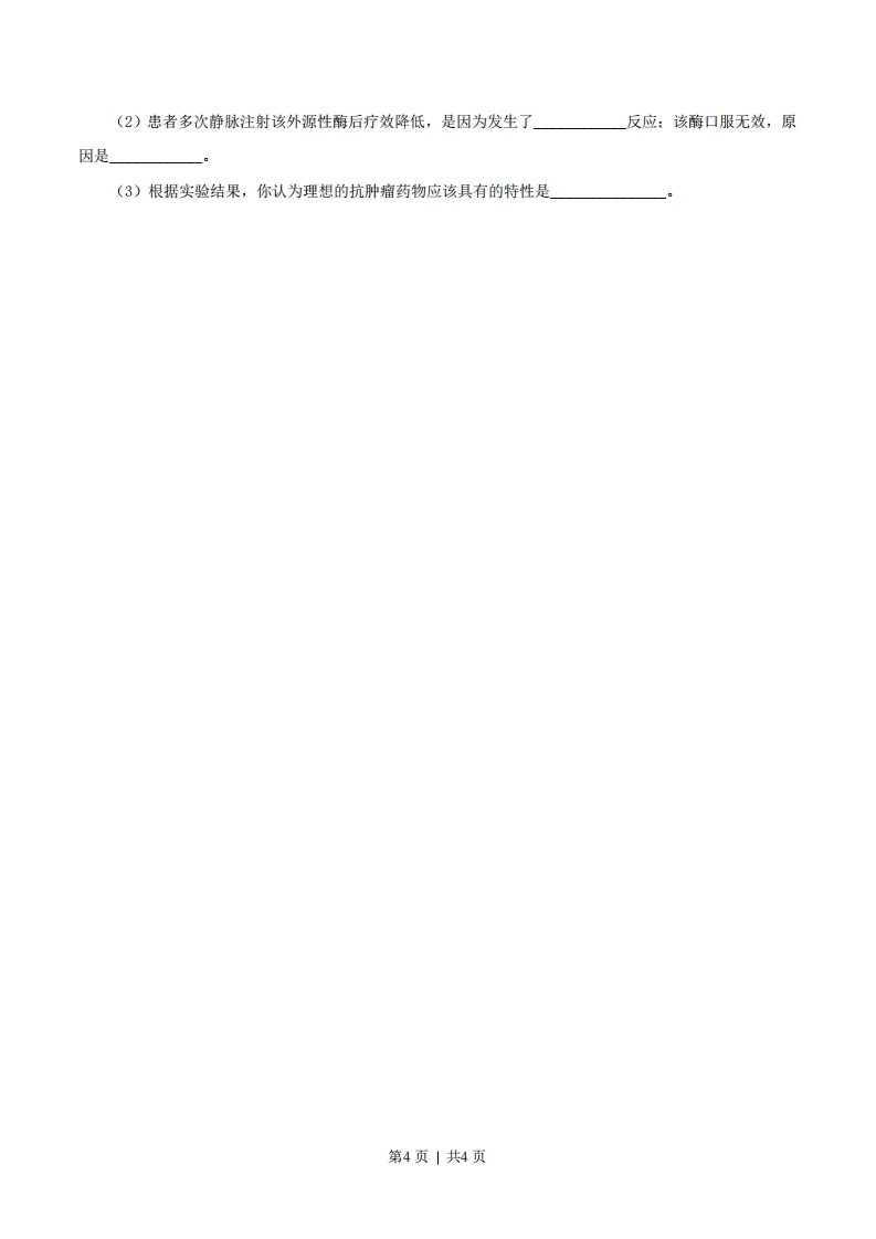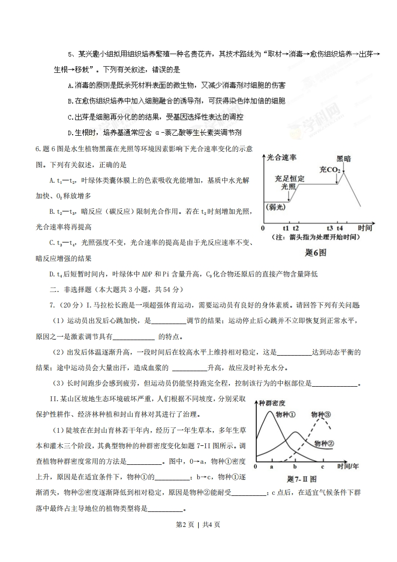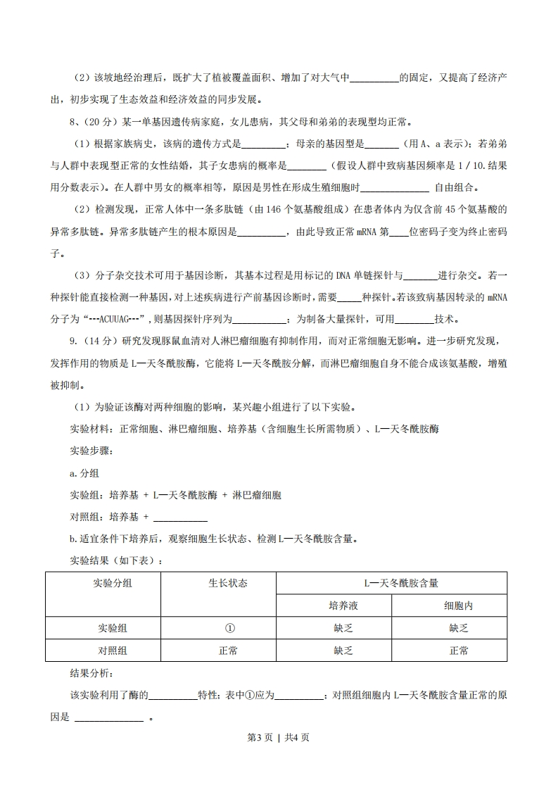 2013年高考重庆卷理综生物一,选择题(本大题共6小题,每小题6分,共36分。在每小题给出的四个选项中,只有一项符合题目要求)1.下列有关细胞质组成的叙述,正确的是A.在人体活细胞中氢原子的数目最多B.DNA和RNA分子的碱基组成相同C.多糖在细胞中不与其他分子相结合D.蛋白质区别于脂质的特有元素是氮2.题2图是单克隆抗体制备流程的简明示意图。下列有关叙述,正确的是A.①是从己免疫的小鼠脾脏中获得的效应T淋巴细胞抗原一之一●①②鼠骨髓瘤细胞B.②中使用胰蛋白酶有利于杂交瘤细胞的形成C.③同时具有脾脏细胞和鼠骨髓瘤细胞的特性●③D.④是经筛选培养获得的能分泌特异性抗体的细L业业业④胞群3、下列与实验相关的叙述,错误的是小鼠腹腔体外培养A.马铃薯块茎捣碎后的提取液可检测侧出蛋白质单克隆抗体B.光学显微镜可用于观察植物细胞的质壁分离现题2图象C.检测酵母菌培养过程中是否产生C0可判断其呼吸方式D.在95%乙醇中加入无水NazC02后可提高色素的溶解度4、少数人注射青霉素后出现胸闷、气急和呼吸困难等过敏(超敏)反应症状,严重者发生休克。以下有关叙述,正确的是A.青霉素过敏反应的主要原因是机体免疫防御功能低下B.青霉素引起的病理性免疫反应,具有特异性和记忆性C.机体初次接触青霉素后,活化的浆细胞分泌淋巴因子D.己免疫的机体再次接触青霉素后会发生自身免疫反应第1页|共4页5、某兴趣小组拟用组织培养繁殖一种名贵花卉,其技术路线为“取材→消毒→愈伤组织培养→出荐+生根→移栽”。下列有关叙述,错误的是A.消毒的原则是既杀死材料表面的微生物,又减少消毒剂对细胞的伤害B.在愈伤组织培养中加入细胞融合的诱导剂,可获得染色体加倍的细胞C.出芽是细胞再分化的的结果,受基因选择性表达的调控学网D.生根时,培养基通常应含α-萘乙酸等生长素类调节剂6.题6图是水生植物黑藻在光照等环境因素影响下光合速率变化的示意个光合速率黑暗图。下列有关叙述,正确的是充C0:A.t,一t2,叶绿体类囊体膜上的色素吸收光能增加,基质中水光解充足恒定光照/加快、02释放增多B.t2一ta暗反应(碳反应)限制光合作用。若在tz时刻增加光照,(弱光)光合速率将再提高t1 t2t3t4时间(注:箭头指为处理开始时间)C.t2一t,光照强度不变,光合速率的提高是由于光反应速率不变、题6图暗反应增强的结果D.t4后短暂时间内,叶绿体中ADP和Pi含量升高,C化合物还原后的直接产物含量降低二.非选择题(本大题共3小题,共54分)7.(20分)I.马拉松长跑是一项超强体育运动,需要运动员有良好的身体素质。请回答下列有关问题(1)运动员出发后心跳加快,是调节的结果:运动停止后心跳并不立即恢复到正常水平,原因之一是激素调节具有的特点。(2)出发后体温逐渐升高,一段时间后在较高水平上维持相对稳定,这是达到动态平衡的结果:途中运动员会大量出汗,造成血浆的升高,故应及时补充水分。(3)长时间跑步会感到疲劳,但运动员仍能坚持跑完全程,控制该行为的中枢部位是I工.某山区坡地生态环境破坏严重,人们根据不同坡度,分别采取个种群密度保护性耕作、经济林种植和封山育林对其进行了治理。物种①物种③(1)陡坡在在封山育林若干年内,经历了一年生草本,多年生草本和灌木三个阶段,其典型物种的种群密度变化如题7-II图所示。调物种②查植物种群密度常用的方法是」。图中,0→a,物种①密度6时间/年上升,原因是在适宜条件下,物种①的-:b→c,物种①逐题7-Ⅱ图渐消失,物种②密度逐渐降低到相对稳定,原因是物种②能耐受:C点后,在适宜气候条件下群落中最终占主导地位的植物类型将是第2页|共4页(2)该坡地经治理后,既扩大了植被覆盖面积、增加了对大气中的固定,又提高了经济产出,初步实现了生态效益和经济效益的同步发展。8、(20分)某一单基因遗传病家庭,女儿患病,其父母和弟弟的表现型均正常。(1)根据家族病史,该病的遗传方式是」;母亲的基因型是(用A、a表示):若弟弟与人群中表现型正常的女性结婚,其子女患病的概率是(假设人群中致病基因频率是1/10.结果用分数表示)。在人群中男女的概率相等,原因是男性在形成生殖细胞时自由组合(2)检测发现,正常人体中一条多肽链(由146个氨基酸组成)在患者体内为仅含前45个氨基酸的异常多肽链。异常多肽链产生的根本原因是」,由此导致正常mRNA第位密码子变为终止密码子。(3)分子杂交技术可用于基因诊断,其基本过程是用标记的NA单链探针与】进行杂交。若一种探针能直接检测一种基因,对上述疾病进行产前基因诊断时,需要_种探针.若该致病基因转录的mRNA分子为“-ACUUAG-”,则基因探针序列为一:为制备大量探针,可用技术。9.(14分)研究发现豚鼠血清对人淋巴瘤细胞有抑制作用,而对正常细胞无影响。进一步研究发现,发挥作用的物质是L一天冬酰胺酶,它能将L一天冬酰胺分解,而淋巴瘤细胞自身不能合成该氨基酸,增殖被抑制。(1)为验证该酶对两种细胞的影响,某兴趣小组进行了以下实验。实验材料:正常细胞、淋巴瘤细胞、培养基(含细胞生长所需物质)、L一天冬酰胺酶实验步骤:a.分组实验组:培养基+L一天冬酰胺酶+淋巴瘤细胞对照组:培养基+b.适宜条件下培养后,观察细胞生长状态、检测L一天冬酰胺含量。实验结果(如下表):实验分组生长状态L一天冬酰胺含量培养液细胞内实验组①缺乏缺乏对照组正常