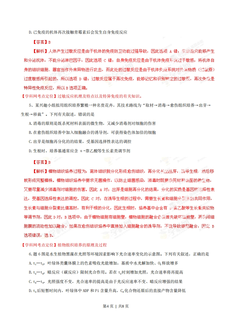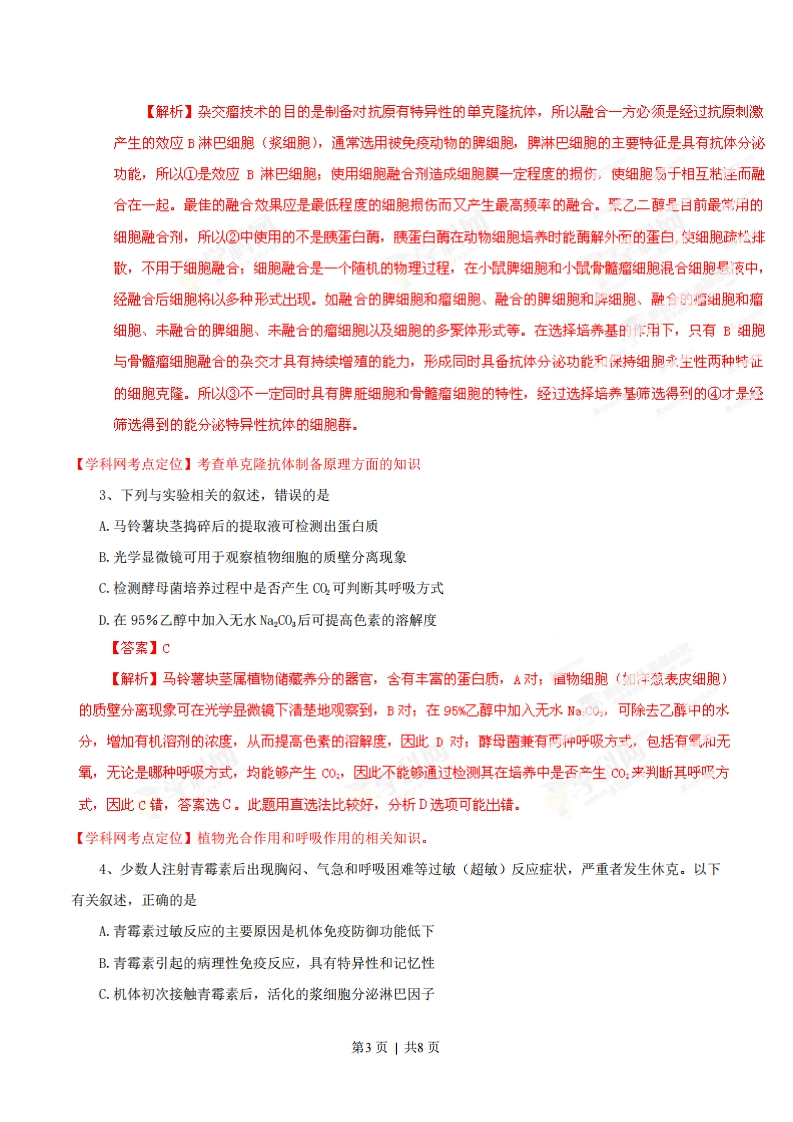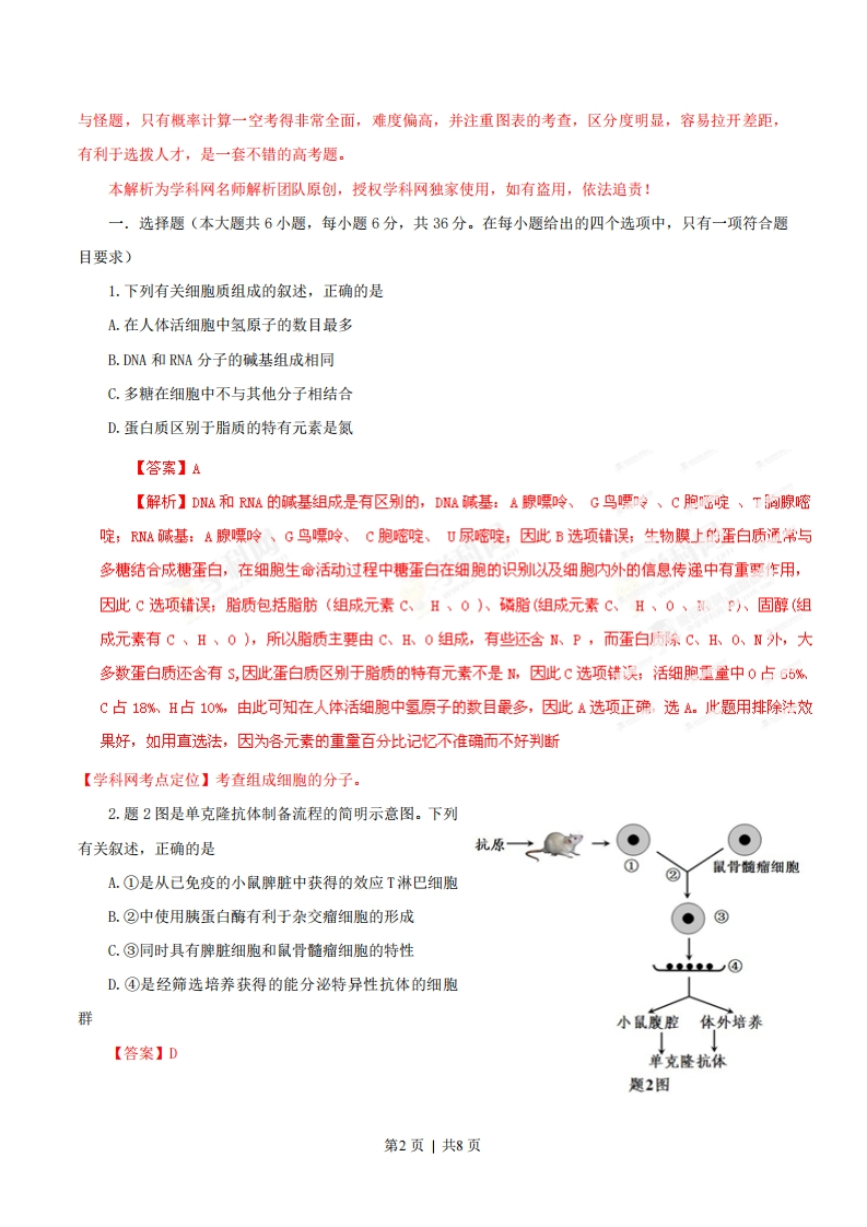 2013年高考重庆卷理综生物【学科网试卷总评】本试题共有9个题目,其中前6题为选择题,后3题是以材料分析为主的主观题。从选择题来看:第1题考查的是组成细胞的分子,第2题考查的是单克隆抗体制备原理方面的知识,第3题是考查植物光合作用与呼吸作用的相关知识,第4题考查的是过敏反应机理及特点以及特异免疫的有关知识,第5题考查的植物组织培养的原理及过程,第6题考查的光合作用具体过程。第1、3、6题考查的是必修部分一(18分),第4题考查的是必修部分三(6分),第2、5题考查的是选修部分(12分),三个主观性试题:第7题考查的是神经体液调节方式和种群群落的相关知识:第8题考查的是常染色体遗传病的判断及概率计算,基因突变,基因工程相关知识:第9题考查验证实验的基本设计原理以及分析实验结果的能力,本题关键在于考查酶的作用及肿瘤治疗的基本原理。7题考查的是必修部分三(20分)以基础知识为主,8题考查的是必修部分二(20分)注重理解分析特别是概率的计算,9题考查的是必修部分一结合实验以能力考查为主(14分)。分析本套卷优点较多:优点一:试题覆盖面较广,三本必修的主干知识都有所涉猎,分数的分布也较为合理。统计如下:有关必修一的试题有4道,3道选择题和1个大题,共计32分:涉及到必修二的有1个大题(20分),共计20分:必修三有1道选择(6分)、1个大题(20分),共计26分:涉及到选修部分的主要是2个道选择(12分),共计12分,全卷总分90分。优点二:较好地体现了考试大纲所要求的考生应具备的四种能力。既要求学生对题干有良好的解读能力,同时又要求学生对知识的本质有明确的认识,两者结合,才能正确选择。第2、6、7题设计是考查考生的解读信息能力和识图能力及调动运用知识的能力,比较基础:第8题则是对能力的要求提高了一个层次,要求运用所学知识去分析、解决问题,注重理解运用。优点三:创设新情景、运用新材料、结合新观点进行命题。命题的知识源于教材而又要超过教材,比如9题,考查学生实验分析能力、从表格获取信息的能力。当然,本套题也有一些细节不够完善。从试题内容来说,知识点分布不均匀。必修一部分考查内容太多,分值约32分,而必修二则明显不足,分值只有20分左右。考查知识点有重复的地方,比如选择题的3题、6题,两题都涉及到光合作用有关的知识,虽然具体知识不同,但主题是相同的,理科综合试卷容量有限,这样重复考查同一问题确实浪费资源。本套试题是重庆高中新课改首次高考命题,很稳重,题型及命题思路变化不大,难易适中,没有偏题第1页|共8页与怪题,只有概率计算一空考得非常全面,难度偏高,并注重图表的考查,区分度明显,容易拉开差距,有利于选拨人才,是一套不错的高考题。本解析为学科网名师解析团队原创,授权学科网独家使用,如有盗用,依法追责!一.选择题(本大题共6小题,每小题6分,共36分。在每小题给出的四个选项中,只有一项符合题目要求)1.下列有关细胞质组成的叙述,正确的是A.在人体活细胞中氢原子的数目最多B.DNA和RNA分子的碱基组成相同C.多糖在细胞中不与其他分子相结合D.蛋白质区别于脂质的特有元素是氮【答案】A【解析】DNA和RNA的碱基组成是有区别的,A碱基:A腺嘌岭、G鸟唾令、C朐啶、T胸腺嘧啶;NA碱基:A腺嘌岭、G鸟嘌岭、C胞嘧啶、U尿密啶;因此B选项错误,生物膜上的蛋白质通常与多糖结合成糖蛋白,在细胞生命活动过程中糖蛋白在细胞的识别以及细胞内外的信息传递中有重要作用,因此C选项错误,脂质包括脂肪(组成元素C、H、0)、磷脂(组成元素C、H、0、、P)、固醇(组成元素有C、H、0),所以脂质主要由C、H、0组成,有些还含N、P,而蛋白质示C、H、O、N外,大多数蛋白质还含有S,因此蛋白质区别于脂质的特有元素不是N,因此C选项错误:活细胞重童中0占6%C占18%、H占10%,由此可知在人体活细胞中氢原子的数目最多,因此A选项正确,选A。此题用排除法效果好,如用直选法,因为洛元素的重量百分此记忆不准确而不好判断【学科网考点定位】考查组成细胞的分子。2.题2图是单克隆抗体制备流程的简明示意图。下列有关叙述,正确的是抗原之义一鼠骨髓瘤细胞A.①是从己免疫的小鼠脾脏中获得的效应T淋巴细胞B.②中使用胰蛋白酶有利于杂交瘤细胞的形成●C.③同时具有脾脏细胞和鼠骨髓瘤细胞的特性重重重重业④D.④是经筛选培养获得的能分泌特异性抗体的细胞群小鼠腹腔体外培养【答案】D单克隆抗体题2图第2页|共8页【解析】杂交瘤技术的目的是制备对抗原有特异性的单克隆抗体,所以融合一方必须是经过抗原刺激产生的效应B淋巴细胞(浆细胞),通常选用被免疫动物的脾细胞,脾淋巴细胞的主要特征是具有抗体分泌功能,所以①是效应B淋巴细胞:使用细胞融合剂造成细胞膜一定程度的损伤,使细胞易于相互粘注而融合在一起。最佳的融合效果应是最低程度的细胞损伤而又产生最高频率的融合。骤乙二醇是目前最常用的细胞融合剂,所以②中使用的不是胰蛋白酶,胰蛋白酶在动物细胞培养时能酶解外而的蛋白,使细胞疏松排散,不用于细胞融合,细胞融合是一个随机的物理过程,在小鼠脾细胞和小鼠骨髓瘤细胞混合细胞尽夜中,经融合后细胞将以多种形式出现。如融合的脾细胞和瘤细胞、融合的脾细胞和焊细胞、融合的雪细胞和瘤细胞、未融合的脾细胞、未融合的瘤细胞以及细胞的多聚体形式等