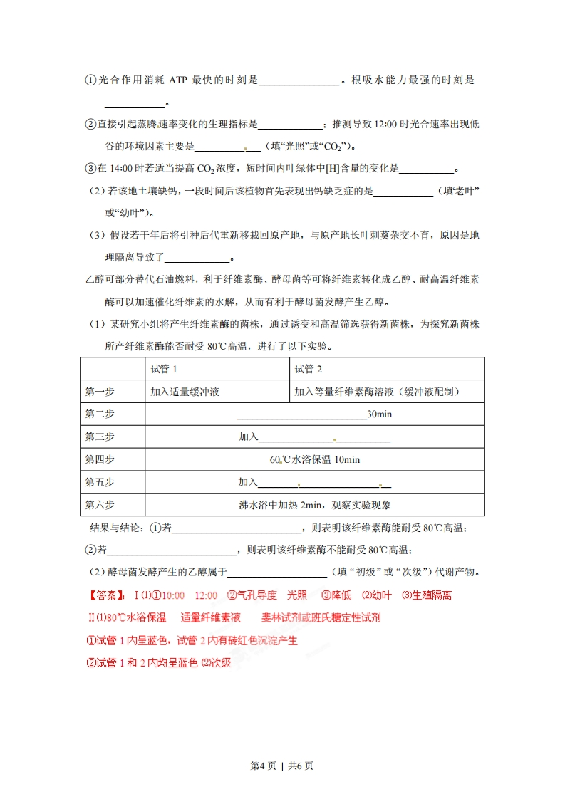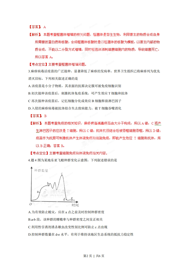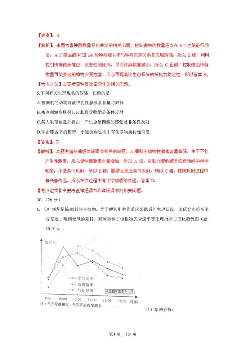【试卷总评】本卷总体上说,题目考查全面,侧重于基础知识的考查,从难度上讲,难易适中,试题来源于课本,又高于课本,31题稍有难度。解析如有不妥之处,欢迎大家提出意见。QQ:5939238542012年普通高等学校招生全国统一考试(重庆卷)理综生物部分解析教师版一.选择题1.下列细胞亚显微结构示意图,正确的是叶绿体核糖体拟核线粒体细南细胞A蓝藻细胞B核糖体线粒体中心体水稻叶肉细胞0小鼠肝脏细吃D【答案1D【解析】本题考查原核细胞真核细胞的区别,A是细菌是原核生物,细胞器只有核糖体,没有线粒体,所以A错,B是蓝藻,属于原核生物,没有叶绿体,所以B错,C植物细胞应该没有中心体,所以C错:答案D.【考点定位】主要考查原核生物真核生物区别。2针对耐药菌日益增多的情况,利用噬菌体作为一种新的抗菌治疗手段的研究备受关注,下列有关噬菌体的叙述,正确的是A利用宿主菌的氨基酸合成子代噬菌体的蛋白质B.以宿主菌DNA为模板合成子代噬菌体的核酸C外壳抑制了宿主菌的蛋白质合成,使该细菌死亡D.能在宿主菌内以二分裂方式增殖,使该细菌裂解第1页|共6页【答案】A【解析】本题考查噬菌体增殖的相关可题,噬菌体是寄生生物,利用寄主的物质合成自身所需要的蛋白质和核酸,合成噬菌体核酸时是以噬菌体的核酸为模板,以寄主内部的物质合成,不能以二分裂方式增殖,同时噬菌体消耗细菌细胞内的物质,导致细菌死亡,所以答案A。【考点定位】主要考查噬菌体增问题。3.麻疹病毒活疫苗的广泛接种,显著降低了麻疹的发病率,世界卫生组织己将麻疹列为优先消灭目标,下列相关叙述正确的是A该疫苗是小分子物质,其表面的抗原决定簇可被免疫细胞识别B.初次接种该疫苗后,刺激机体免疫系统,可产生效应T细胞和抗体C再次接种该疫苗后,记忆细胞分化成效应B细胞释放淋巴因子D.入侵的麻疹病毒被抗体结合失去致病能力,被T细胞吞噬消化【答案1B【解析】本题考查免疫的相关知识,麻疹病毒减毒疫苗由大分子构成,所以A错,C项产生淋巴因子的应该是T细胞,所以C错,抗体抗原结合后被吞噬细胞吞噬,所以D错,疫苗作为抗原可刺激机体产生体液免疫和细胞免疫,即能产生效应T细胞和抗体,所以B正确:答案B。【考点定位】主要考查细胞免疫和体液免疫相关内容。4.题4图为某地东亚飞蝗种群变化示意图,下列叙述错误的是种群数星时间A.为有效防止蝗灾,应在a点之前及时控制种群密度B.a-b段,该种群的增殖率与种群密度之间呈正相关C,利用性引诱剂诱杀雄虫改变性别比例可防止c点出现D.控制种群数量在d-©水平,有利于维持该地区生态系统的抵抗力稳定性第2页|共6页【答案】B【解析】:本题考查种群数量变化曲线的相关问题,控制害虫的数量应该在K2之前进行防治,A正确:由图可知b段种群增长率与种群密度关系是先增后减,所以B错,利用性诱剂诱杀雄虫,改变性别比例,可使种群数量减少,所以C正确,控制蝗虫种群数量可使某地的植物少受危害,所以可提高该生态系统的抵抗力稳定性;所以答案B。【考点定位】主要考查种群数量变化的相关问题。5.下列有关生理现象的叙述,正确的是A被阉割的动物血液中促性腺激素含量将降低B寒冷刺激皮肤引起皮肤血管收缩是条件反射C某人眼球被意外撞击,产生金星四溅的感觉是非条件反射D.叩击膝盖下的韧带,小腿前踢过程中有化学物质传递信息【答案】D【解析】本题考查与神经体液调节有关的问题,A阉割的动物性激素含量降低,由于不能产生性激素,所以促性腺激素含量增加,所以A错:皮肤血管收缩是低级神经中枢控制的,不是条件反射,所以B错,眼冒金星是条件反射,所以C错;膝跳反射过程中有兴奋传递,所以在该过程中有化学物质的传递,答案D。【考点定位】主要考查神经调节和体液调节的相关问题。30.(26分)I.长叶刺葵是棕榈科热带植物。为了解其引种到重庆某地后的生理状况,某研究小组在水分充足、晴朗无风的夏日,观测得到了该植物光合速率等生理指标日变化趋势图(题30图)。相对量—一光合速常一。一然骑速率·+…气孔导度点击图片查者下一贝8:0010.0012-00140016:00注:气孔导度越大,气孔开启程度越大18:00时刻(1)据图分析:第3页|共6页
