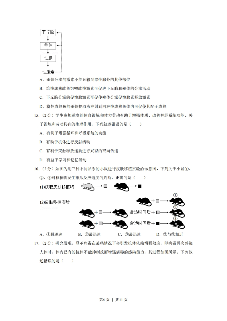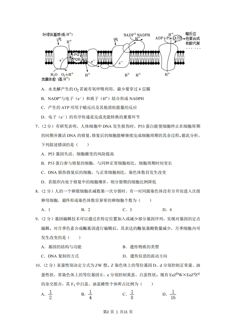 2021年重庆市新高考生物试卷一、选释题:本题共20小题,每小题2分,共40分。在每小题给出的四个选项中,只有一项是符合题目要求的。1.(2分)香蕉可作为人们运动时的补给品,所含以下成分中,不能被吸收利用的是()A.纤维素B.钾离子C.葡萄糖D.水2.(2分)关于新型冠状病毒,下列叙述错误的是()A.控制该病毒在人群中传播的有效方式是普遍接种该病毒疫苗B.使用75%酒精消毒可降低人体感染该病毒的概率C.宿主基因指导该病毒外壳蛋白的合成D.冷链运输的物资上该病毒检测为阳性,不一定具有传染性3.(2分)某胶原蛋白是一种含18种氨基酸的细胞外蛋白。下列叙述正确的是()A,食物中的该蛋白可被人体直接吸收B.人体不能合成组成该蛋白的所有氨基酸C.未经折叠的该蛋白具有生物学功能D.该蛋白在内质网内完成加工4.(2分)人体细胞溶酶体内较高的H浓度(pH为5.0左右)保证了溶酶体的正常功能。下列叙述正确的是()A.溶酶体可合成自身所需的蛋白B.溶酶体酶泄露到细胞质基质后活性不变C.细胞不能利用被溶酶体分解后产生的物质D.溶酶体内pH的维持需要膜蛋白协助5.(2分)人脐血含有与骨髓中相同类型的干细胞。关于脐血中的干细胞,下列叙述错误的是()A,可用来治疗造血功能障碍类疾病B.分化后,表达的蛋白种类发生变化C.分化后,细胞结构发生变化D.具有与早期胚胎细胞相同的分化程度6.(2分)如图为类囊体膜蛋白排列和光反应产物形成的示意图。据图分析,下列叙述错误的是()第1页|共11页叶绿体基质(低H)NADP+NADPHH+暗反应光H光HADP十Pi+T,色素合成核酸代谢YPQPOHH20 02+H+HH+H+类体腔高H)A,水光解产生的O2若被有氧呼吸利用,最少要穿过4层膜B.NADP+与电子(e)和质子(H)结合形成NADPHC.产生的ATP可用于暗反应及其他消耗能量的反应D.电子(e)的有序传递是完成光能转换的重要环节7.(2分)有研究表明,人体细胞中DNA发生损伤时,P53蛋白能使细胞停止在细胞周期的间期并激活DNA的修复,修复后的细胞能够继续完成细胞周期的其余过程.据此分析,下列叙述错误的是()A.P53基因失活,细跑癌变的风险提高B.P53蛋白参与修复的细胞,与同种正常细胞相比,细胞周期时间变长C.DNA损伤修复后的细胞,与正常细胞相比,染色体数目发生改变D.若组织内处于修复中的细胞增多,则分裂期的细胞比例降低8.(2分)人的一个卵原细胞在减数第一次分裂时,有一对同源染色体没有分开而进入次级卵母细胞,最终形成染色体数目异常的卵细胞个数为()A.1B.2C.3D.49.(2分)基因编辑技术可以通过在特定位置加入或减少部分基因序列,实现对基因的定点编辑。对月季色素合成酶基因进行编辑后,其表达的酶氨基酸数量减少,月季细胞内可发生改变的是()A.基因的结构与功能B.遗传物质的类型C.DNA复制的方式D.遗传信息的流动方向10.(2分)家蚕性别决定方式为ZW型。Z染色体上的等位基因D、d分别控制正常蚕、油蚕性状,常染色体上的等位基因E、e分别控制黄茧、白茧性状。现有EeZDWX Eezdzd的杂交组合,其F1中白茧、油茧雌性个体所占比例为()A号B.4cD.16第2页|共11页11.(2分)如图为某显性遗传病和ABO血型的家系图。据图分析,以下推断可能性最小的是()I(○正常男女AB型0型患病男女68A型A型A型B型A型B型A型B型ABO血型(基因型):A型IAA或)、B型(ITB或P)、AB型(IA)、O型()A.该遗传病为常染色体显性遗传病B.该遗传病为X染色体显性遗传病C.该致病基因不在IB基因所在的染色体上D.Ⅱ;不患病是因为发生了同源染色体交叉互换或突变12.(2分)科学家建立了一个蛋白质体外合成体系(含有人工合成的多聚尿嘧啶核苷酸、除去了DNA和mRNA的细胞提取液)。在盛有该合成体系的四支试管中分别加入苯丙氨酸、丝氨酸、酪氨酸和半胱氨酸后,发现只有加入苯丙氨酸的试管中出现了多肽链。下列叙述错误的是()A,合成体系中多聚尿嘧啶核苷酸为翻译的模板B.合成体系中的细胞提取液含有核糖体C.反密码子为UUU的RNA可携带苯丙氨酸D.试管中出现的多肽链为多聚苯丙氨酸13.(2分)下列有关人体内环境及其稳态的叙述正确的是()A.静脉滴注后,药物可经血浆、组织液到达靶细胞B.毛细淋巴管壁细胞所处的内环境是淋巴和血浆C.体温的改变与组织细胞内的代谢活动无关D.血浆渗透压降低可使红细胞失水皱缩14.(2分)如图为鱼类性激素分泌的分级调节示意图。下列叙述正确的是()第3页|共11页