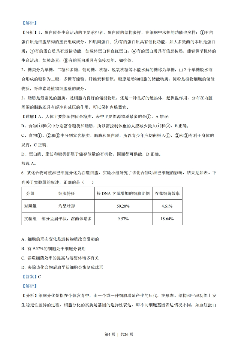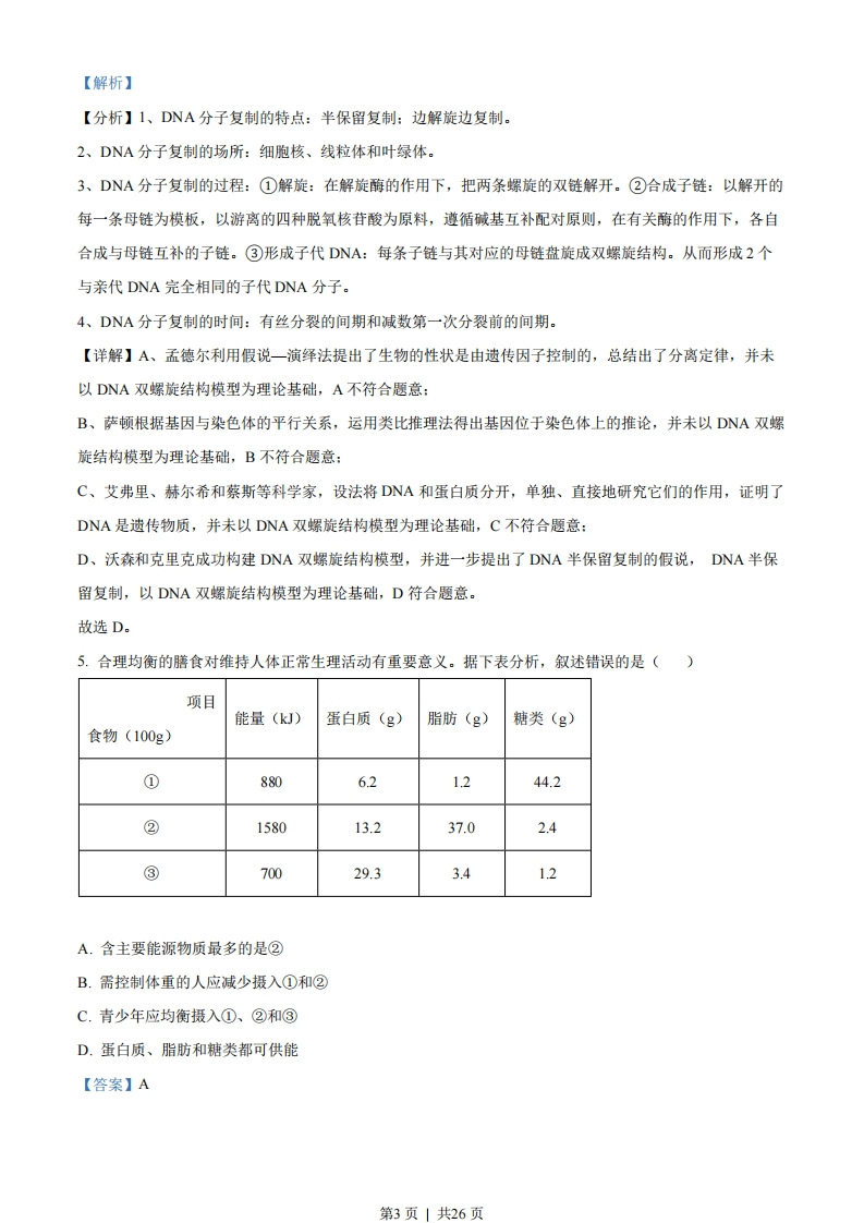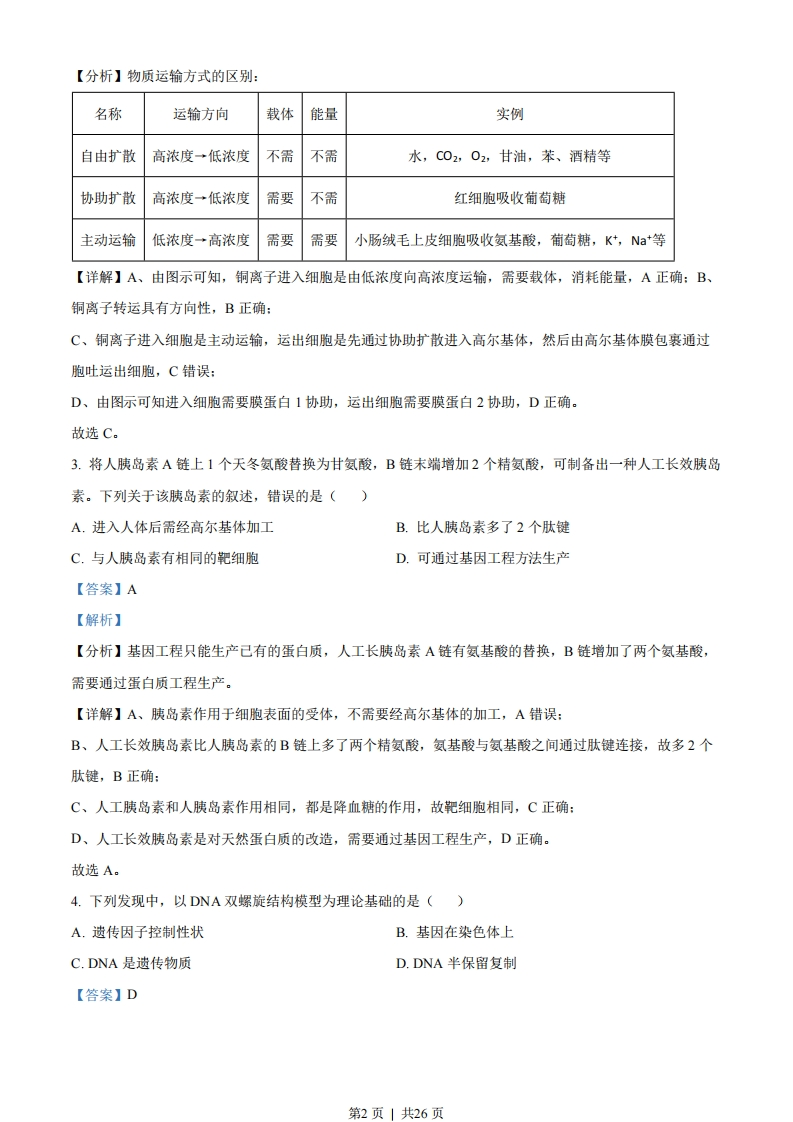 2022年重庆市普通高等学校全国统一招生选择性考试生物试卷一、单项选择题:1.以蚕豆根尖为实验材料,在光学显微镜下不能观察到的是()A.中心体B.染色体C.细胞核D.细胞壁【答案】A【解析】【分析】光学显微镜下可以观察到的结构有叶绿体、线粒体、液泡、染色体和细胞壁,光学显微镜下观察到的结构属于显微结构:光学显微镜下不能够观察到核糖体、细胞膜、中心体、叶绿体和线粒体的内部结构等,需要借助于电子显微镜,电子显微镜下观察到的结构属于亚显微结构。【详解】A、中心体无色且体积小,光学显微镜下无法观察,需要借助于电子显微镜观察,且蚕豆是高等植物,其根尖细胞中无中心体,A符合题意:B、用光学显微镜观察染色体时,利用碱性染料着色,便能够进行观察,B不符合题意:C、细胞核体积较大,在显微镜下很容易找到,C不符合题意:D、细胞壁位于细胞的最外面,具有保护、支持细胞的功能,在显微镜下很容易找到,D不符合题意。故选A。2.如图为小肠上皮细胞吸收和释放铜离子的过程。下列关于该过程中铜离子的叙述,错误的是()铜离子·合膜蛋白1膜蛋白2A进入细胞需要能量B.转运具有方向性C.进出细胞的方式相同D.运输需要不同的载体【答案】C【解析】第1页」共26页【分析】物质运输方式的区别:名称运输方向载体能量实例自由扩散高浓度→低浓度不需不需水,C02,02,甘油,苯、酒精等协助扩散高浓度→低浓度需要不需红细胞吸收葡萄糖主动运输低浓度→高浓度需要需要小肠绒毛上皮细胞吸收氨基酸,葡萄糖,K+,Na等【详解】A、由图示可知,铜离子进入细胞是由低浓度向高浓度运输,需要载体,消耗能量,A正确:B、铜离子转运具有方向性,B正确:C、铜离子进入细胞是主动运输,运出细胞是先通过协助扩散进入高尔基体,然后由高尔基体膜包裹通过胞吐运出细胞,C错误:D、由图示可知进入细胞需要膜蛋白1协助,运出细胞需要膜蛋白2协助,D正确。故选C。3.将人胰岛素A链上1个天冬氨酸替换为甘氨酸,B链末端增加2个精氨酸,可制备出一种人工长效胰岛素。下列关于该胰岛素的叙述,错误的是()A.进入人体后需经高尔基体加工B.比人胰岛素多了2个肽键C.与人胰岛素有相同的靶细胞D.可通过基因工程方法生产【答案】A【解析】【分析】基因工程只能生产己有的蛋白质,人工长胰岛素A链有氨基酸的替换,B链增加了两个氨基酸,需要通过蛋白质工程生产。【详解】A、胰岛素作用于细胞表面的受体,不需要经高尔基体的加工,A错误:B、人工长效胰岛素比人胰岛素的B链上多了两个精氨酸,氨基酸与氨基酸之间通过肽键连接,故多2个肽键,B正确:C、人工胰岛素和人胰岛素作用相同,都是降血糖的作用,故靶细胞相同,C正确:D、人工长效胰岛素是对天然蛋白质的改造,需要通过基因工程生产,D正确。故选A。4.下列发现中,以DNA双螺旋结构模型为理论基础的是()A.遗传因子控制性状B.基因在染色体上C.DNA是遗传物质D.DNA半保留复制【答案】D第2页|共26页【解析】【分析】1、DNA分子复制的特点:半保留复制:边解旋边复制。2、DNA分子复制的场所:细胞核、线粒体和叶绿体。3、DNA分子复制的过程:①解旋:在解旋酶的作用下,把两条螺旋的双链解开。②合成子链:以解开的每一条母链为模板,以游离的四种脱氧核苷酸为原料,遵循碱基互补配对原则,在有关酶的作用下,各自合成与母链互补的子链。③形成子代DNA:每条子链与其对应的母链盘旋成双螺旋结构。从而形成2个与亲代DNA完全相同的子代DNA分子。4、DNA分子复制的时间:有丝分裂的间期和减数第一次分裂前的间期。【详解】A、孟德尔利用假说一演绎法提出了生物的性状是由遗传因子控制的,总结出了分离定律,并未以DNA双螺旋结构模型为理论基础,A不符合题意:B、萨顿根据基因与染色体的平行关系,运用类比推理法得出基因位于染色体上的推论,并未以DNA双螺旋结构模型为理论基础,B不符合题意:C、艾弗里、赫尔希和蔡斯等科学家,设法将DNA和蛋白质分开,单独、直接地研究它们的作用,证明了DNA是遗传物质,并未以DNA双螺旋结构模型为理论基础,C不符合题意:D、沃森和克里克成功构建DNA双螺旋结构模型,并进一步提出了DNA半保留复制的假说,DNA半保留复制,以DNA双螺旋结构模型为理论基础,D符合题意。故选D。5.合理均衡的膳食对维持人体正常生理活动有重要意义。据下表分析,叙述错误的是()项目能量(k)蛋白质(g)脂肪(g)糖类(g)食物(100g)①8806.21.244.2②158013.237.02.4③70029.33.41.2A.含主要能源物质最多的是②B.需控制体重的人应减少摄入①和②C.青少年应均衡摄入①、②和③D.蛋白质、脂肪和糖类都可供能【答案】A第3页」共26页