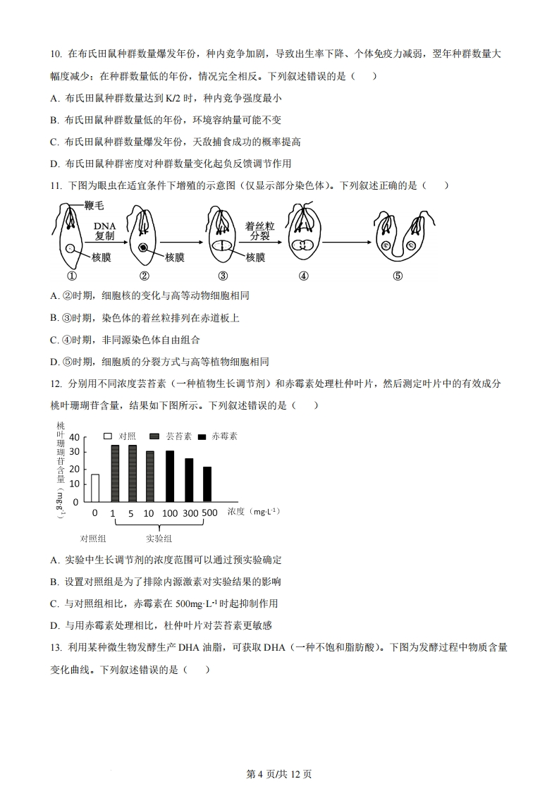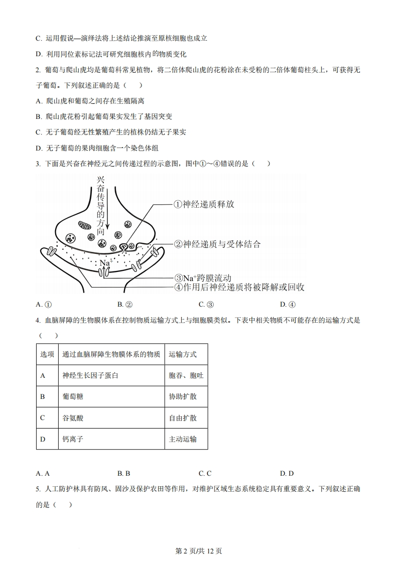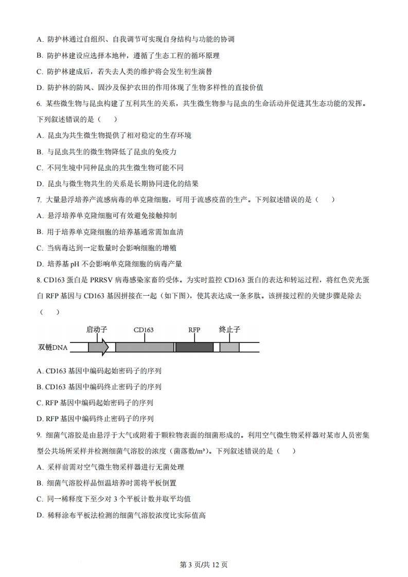 机密★启用前2023年辽宁省普通高等学校招生选择性考试科目:生物学(试题卷)注意事项:1.答卷前,考生须在答题卡和试题卷上规定的位置,准确填写本人姓名、准考证号,并核对条形码上的信息。确认无误后,将条形码粘贴在答题卡上相应位置。2.考生须在答题卡上各题目规定答题区域内答题,超出答题区域书写的答案无效。在草稿纸、试题卷上答题无效。3。考试结束,将本试题卷和答题卡一并交回。4.本试题卷共10页,如缺页,考生须声明,否则后果自负。姓名准考证号机密★启用前2023年辽宁省普通高等学校招生选择性考试生物学注意事项:1.答卷前,考生务必将自已的姓名、准考证号填写在答题卡上。2。答选释题时,选出每小题答案后,用铅笔把答题卡对应题目的答案标号涂黑。如需改动,用橡皮擦干净后,再选涂其他答案标号。答非选择题时,将答案写在答题卡上。写在本试卷上无效。3.考试结束后,将本试卷和答题卡一并交回。一、选择题:本题共15小题,每小题2分,共30分。在每小题给出的四个选项中,只有一项符合题目要求。1.科学家根据对部分植物细胞观察的结果,得出“植物细胞都有细胞核”的结论。下列叙述错误的是()A.早期的细胞研究主要运用了观察法B.上述结论的得出运用了归纳法第1页供12页C.运用假说一演绎法将上述结论推演至原核细胞也成立D.利用同位素标记法可研究细胞核内的物质变化2.葡萄与爬山虎均是葡萄科常见植物,将二倍体爬山虎的花粉涂在未受粉的二倍体葡萄柱头上,可获得无子葡萄。下列叙述正确的是()A.爬山虎和葡萄之间存在生殖隔离B.爬山虎花粉引起葡萄果实发生了基因突变C.无子葡萄经无性繁殖产生的植株仍结无子果实D.无子葡萄的果肉细胞含一个染色体组3.下面是兴奋在神经元之间传递过程的示意图,图中①~④错误的是()兴传导的①神经递质释放@®问⑨國⑧®②@.②神经递质与受体结合③Na+跨膜流动④作用后神经递质将被降解或回收A.①B.②C.③D.④4.血脑屏障的生物膜体系在控制物质运输方式上与细胞膜类似。下表中相关物质不可能存在的运输方式是选项通过血脑屏障生物膜体系的物质运输方式A神经生长因子蛋白胞吞、胞吐葡萄糖协助扩散C谷氨酸自由扩散D钙离子主动运输A.AB.BC.CD.D5.人工防护林具有防风、固沙及保护农田等作用,对维护区域生态系统稳定具有重要意义。下列叙述正确的是()第2页供12页A.防护林通过自组织、自我调节可实现自身结构与功能的协调B.防护林建设应选择本地种,遵循了生态工程的循环原理C.防护林建成后,若失去人类的维护将会发生初生演替D.防护林的防风、固沙及保护农田的作用体现了生物多样性的直接价值6.某些微生物与昆虫构建了互利共生的关系,共生微生物参与昆虫的生命活动并促进其生态功能的发挥。下列叙述错误的是()A.昆虫为共生微生物提供了相对稳定的生存环境B.与昆虫共生的微生物降低了昆虫的免疫力C.不同生境中同种昆虫的共生微生物可能不同D.昆虫与微生物共生的关系是长期协同进化的结果7.大量悬浮培养产流感病毒的单克隆细胞,可用于流感疫苗的生产。下列叙述错误的是()A.悬浮培养单克隆细胞可有效避免接触抑制B.用于培养单克隆细胞的培养基通常需加血清C.当病毒达到一定数量时会影响细胞的增殖D.培养基pH不会影响单克隆细胞的病毒产量8.CD163蛋白是PRRSV病毒感染家畜的受体。为实时监控CD163蛋白的表达和转运过程,将红色荧光蛋白RFP基因与CD163基因拼接在一起(如下图),使其表达成一条多肽。该拼接过程的关键步骤是除去()启动子CD163RFP终止子双链DNAA.CD163基因中编码起始密码子的序列B.CD163基因中编码终止密码子的序列C.RFP基因中编码起始密码子的序列D.RFP基因中编码终止密码子的序列9.细菌气溶胶是由悬浮于大气或附着于颗粒物表面的细菌形成的。利用空气微生物采样器对某市人员密集型公共场所采样并检测细菌气溶胶的浓度(菌落数m)。下列叙述错误的是()A.采样前需对空气微生物采样器进行无菌处理B.细菌气溶胶样品恒温培养时需将平板倒置C.同一稀释度下至少对3个平板计数并取平均值D.稀释涂布平板法检测的细菌气溶胶浓度比实际值高第3页供12页