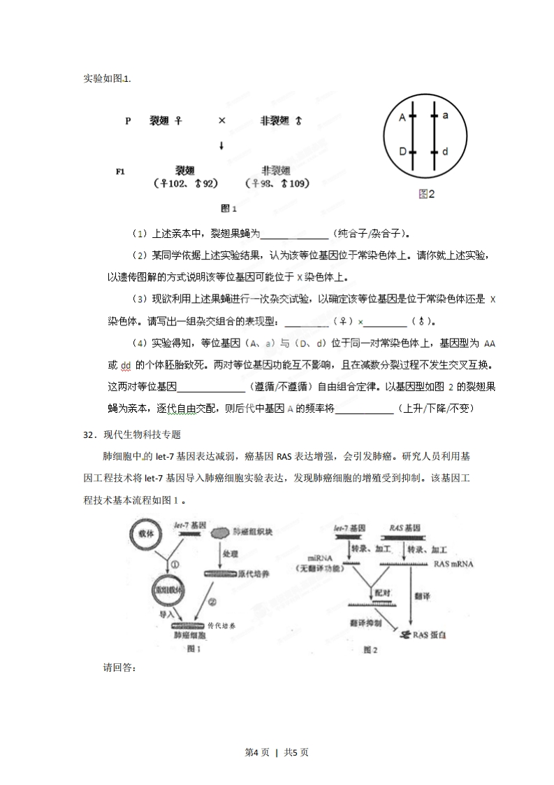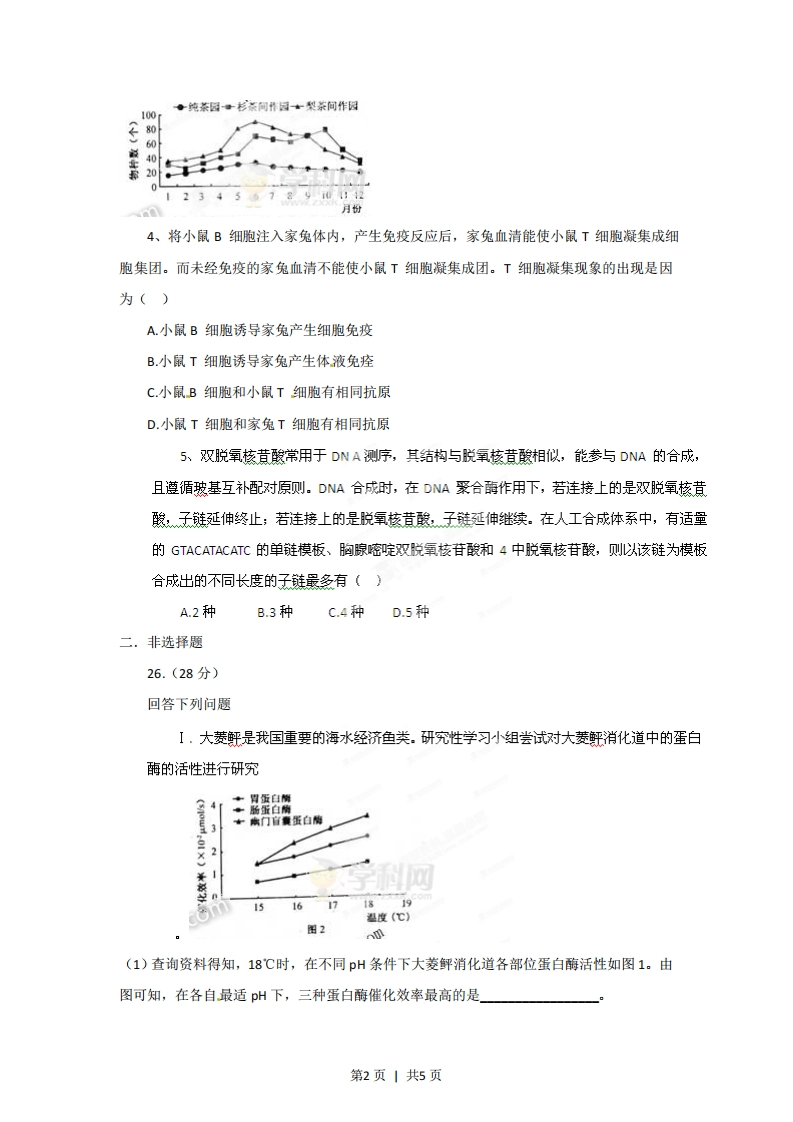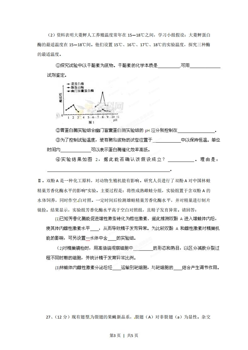 2012年普通高等学校招生全国统一考试(福建卷)理综生物部分一.选择题1、下列有关碗豆的叙述,正确为是()A萌发初期,种子的有机物总量在增加B及时排涝,能防止根细胞受酒精毒害C进人夜间,叶肉细胞内ATP合成停止D.叶片黄化,叶绿体对红光的吸收增多2、下表是生物科学史上一些经典实验的叙述,表中“方法与结果“和“结论或观点“能匹配的是()选项方法与结果结论或观点A观察到植物组织细胞分裂产生新细胞:观察到动物所有的细胞都来源于先前受精卵分裂产生新细胞存在的细胞B单侧光照射下,金丝雀藕草胚芽鞘向光弯曲生长,生长素具有极性运输的特去尖端的胚芽鞘不生长也不弯曲点将载有水绵和好氧细菌的装片置于黑暗且缺氧的环光合作用产生的氧气来自境中,用极细光束照射后,细菌集中于有光照的部位于水D将活的R型肺炎双球菌与加热杀死的S型肺炎双球DNA是主要的遗传物质菌混合后注入小鼠体内,小鼠体内出现活的S型菌3、科技人员选取某地同一自然条件下三种不同类型的茶园,进行物种丰富度的调查,结果如图。据图判断正确的是()A纯茶园物种变化幅度最小,不易产生暴发性虫害B杉茶间作园各物种的种群密度在10月份时最大C梨茶间作园的营养结构在6月份时最为复杂D,人类生产活动不会改变茶园的群落结构第1页1共5页·纯茶园零杉茶间作妇+梨茶间作园100()8402345678901月份4、将小鼠B细胞注入家兔体内,产生免疫反应后,家兔血清能使小鼠T细胞凝集成细胞集团。而未经免疫的家兔血清不能使小鼠T细胞凝集成团。T细胞凝集现象的出现是因为()A.小鼠B细胞诱导家兔产生细胞免疫B.小鼠T细胞诱导家兔产生体液免痊C.小鼠B细胞和小鼠T细胞有相同抗原D.小鼠T细胞和家兔T细胞有相同抗原5、双脱氧核昔酸常用于DNA测序,其结构与脱氧核昔酸相似,能参与DNA的合成,且遵循玻基互补配对原则。DNA合成时,在DNA聚合酶作用下,若连接上的是双脱氧核昔酸,子链延伸终止;若连接上的是脱氧核昔酸,子链延伸继续。在人工合成体系中,有适量的GTACATACATC的单链模板、胸腺嘧啶双脱氧核苷酸和4中脱氧核苷酸,则以该链为模板合成出的不同长度的子链最多有〔】A.2种B.3种C.4种D.5种二.非选择题26.(28分)回答下列问题】.大菱鲆是我国重要的海水经济鱼类。研究性学习小组尝试对大菱鲆消化道中的蛋白酶的活性进行研究幸胃蛋白隔。肠蛋白椭,门言囊蛋白酶215161719温度(℃)图2(1)查询资料得知,18℃时,在不同pH条件下大菱鲆消化道各部位蛋白酶活性如图1。由图可知,在各自最适pH下,三种蛋白酶催化效率最高的是第2页1共5页(2)资料表明大菱鲆人工养殖温度常年在15一18℃之间,学习小组假设:大菱鲆蛋白酶的最适温度在15一18℃间。他们设置15℃、16℃、17℃、18℃的实验温度,探究三种酶的最适温度。①探究试验中以干酪素为底物。干酪素的化学本质是可用试剂鉴定。◆胃蛋白德◆弱蛋白南★扁门盲囊蛋白酯的1234567890011图1PH②胃蛋白酶实验组合幽门盲襄蛋白酶实验组的pH应分别控制在③为了控制试验温度,装有酶和底物的试管应置于中以保持恒温。单位时间内可以表示蛋白酶催化效率高低。④实验结果如图2,据此能否确认该假设成立?理由是:Ⅱ。双酚A是一种化工原料,对动物生殖机能有影响。研究人员进行了双酚A对中国林蛙精巢芳香化酶水平的影响“实验。主要过程是:将性成熟雌蛙分组,实验组置于含双酚A的水体饲养,同时作空白对照。一定时间后检测雄蛙精巢芳香化酶水平,并对精巢进行制片镜捡。结果显示,实验组芳香化酶水平高于空白对照组,且精子发育异常。请回答:(1已知芳香化酶能促进雄性激素转化为雄性激素。据此推测双酚A进入雄蛙体内后,使其体内雌性激素水平,从而导致精子发育异常。为此较双酚A和雌性激素对精巢机能的影响,可另设置一水体中含的实验组。(2对精巢镜检时,用高倍镜观察细胞中的形态和熟目,以区分减数分裂过程不同时期的细胞,并统计精于发育异常比例.(3林蛙体内雌性激素分泌后经运输到靶细胞,与靶细胞的结合产生调节作用。27、(12分)现有翅型为裂翅的果蝇新品系,裂翅(A)对非裂翅(a)为显性。杂交第3页1共5页