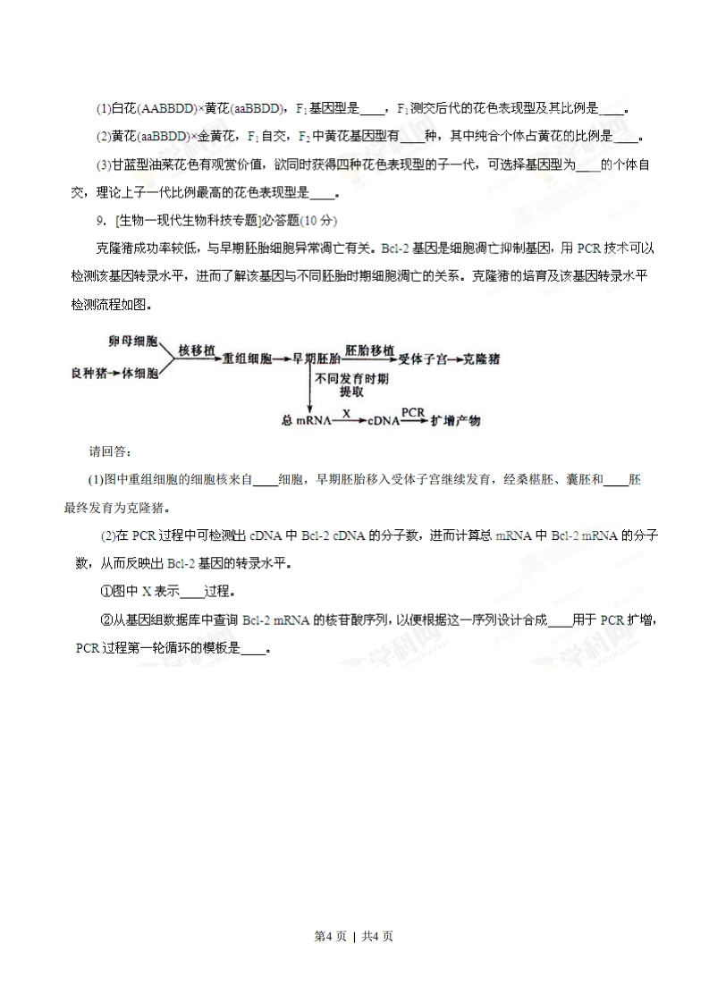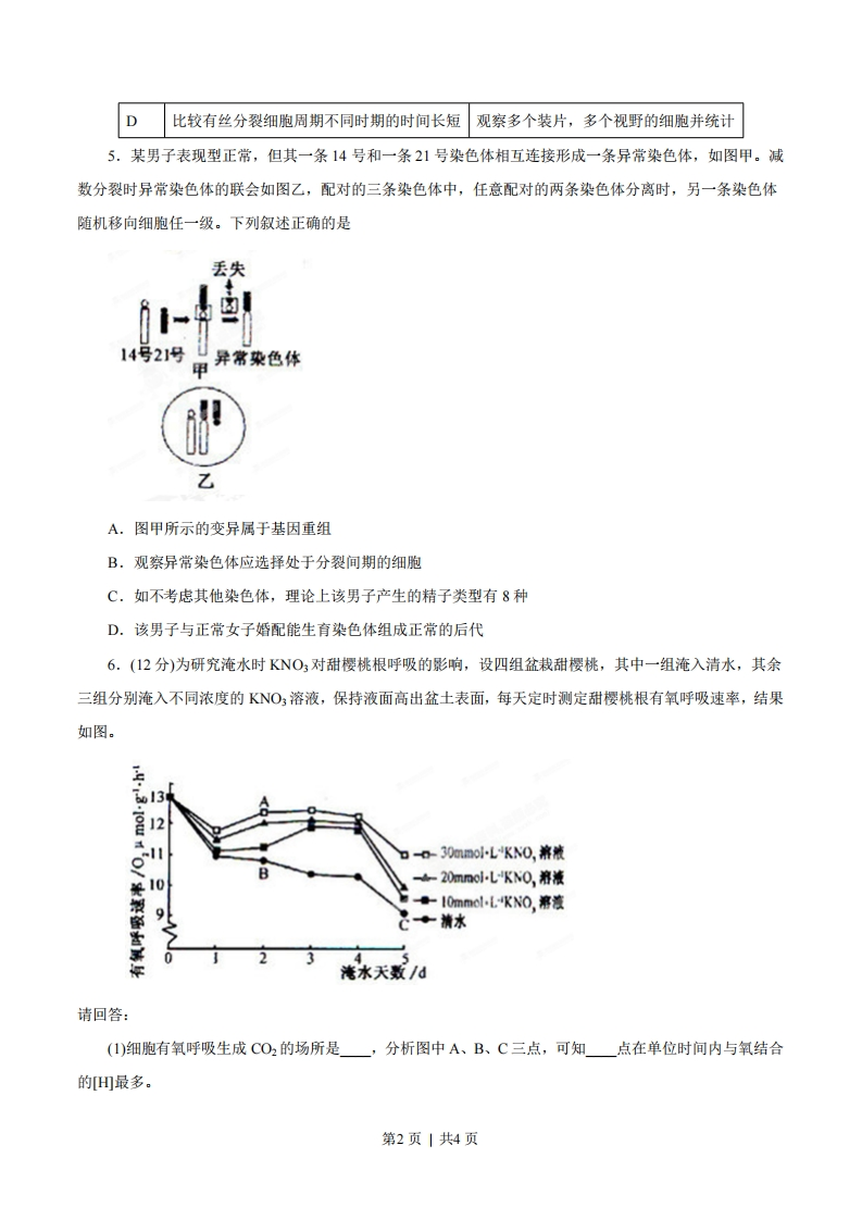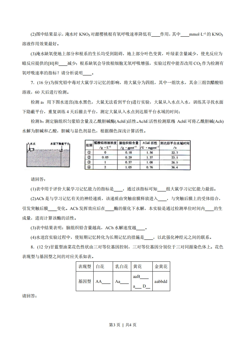 2013年高考福建卷理综生物1.人肝细胞合成的糖原储存在细胞内,合成的脂肪不储存在细胞内,而是以VLDL(脂肪与蛋白质复合物)形式分泌出细胞外。下列叙述正确的是A.VLDL的合成与核糖体无关B.VLDL以自由扩散方式分泌出细胞外C.肝细胞内糖原的合成与分解可影响血糖含量D.胰高血糖素可促进肝细胞内糖原的合成2.为探究茉莉酸(植物生长调节剂对离体培养的成熟胡杨细胞质壁分离的影响,将细胞分别移到不同的培养液中继续培养3天,结果如表。下列叙述错误的是组培养液中另添加的成分结果别NaCl茉莉酸①+部分细胞质壁分离②+细胞正常,无质壁分离③细胞正常,无质壁分离注:“+”表示有添加,添加后NaCl浓度为100 mmol-L1,,茉莉酸浓度为103mgL1:“”表示无添加。A.胡杨细胞通过渗透作用吸水和失水B.质壁分离的胡杨细胞液泡体积变小C.NaC1为自变量,茉莉酸为因变量D.茉莉酸对NaC1引起的胡杨细胞质壁分离有抑制作用3.在两块条件相同的退化林地上进行森林人工恢复和自然恢复的研究,20年后两块林地的生物多样性均有不同程度提高,其中人工种植的马尾松人工恢复林植物种数为137种,无人工种植的自然恢复林植物种数为226种。下列叙述错误的是A.可采用样方法调查林地上植物的种群密度B.森林恢复提高了牛产者固定的太阳能总量C.人工恢复林比自然恢复林的植物丰富度低D.自然恢复林的形成属于初生演替4.下列为减少实验误差而采取的措施,错误的是选项实验内容减少实验误差采取的措施对培养液中酵母菌数量进行计数多次计数取平均值B探索2,4-D促进插条生根的最适浓度预实验确定浓度范围C调查人群中红绿色盲发生率调查足够大的群体,随机取样并统计第1页|共4页D比较有丝分裂细胞周期不同时期的时间长短观察多个装片,多个视野的细胞并统计5.某男子表现型正常,但其一条14号和一条21号染色体相互连接形成一条异常染色体,如图甲。减数分裂时异常染色体的联会如图乙,配对的三条染色体中,任意配对的两条染色体分离时,另一条染色体随机移向细胞任一级。下列叙述正确的是丢失0-14号21号异常染色体A.图甲所示的变异属于基因重组B.观察异常染色体应选择处于分裂间期的细胞C.如不考虑其他染色体,理论上该男子产生的精子类型有8种D.该男子与正常女子婚配能生育染色体组成正常的后代6.(12分)为研究淹水时KNO3对甜樱桃根呼吸的影响,设四组盆栽甜樱桃,其中一组淹入清水,其余三组分别淹入不同浓度的KNO3溶液,保持液面高出盆土表面,每天定时测定甜樱桃根有氧呼吸速率,结果如图。13210口-o-30mm0LKNO,幕腋20 mmol-L-KN0,溶液一I0 nmol-L-KNO,幕凌飞◆清水0淹水天数/d请回答:(1)细胞有氧呼吸生成CO2的场所是,分析图中A、B、C三点,可知点在单位时间内与氧结合的田最多。第2页|共4页(2)图中结果显示,淹水时KNO3对甜樱桃根有氧呼吸速率降低有作用,其中mmol-L1的KNO3溶液作用效果最好。(3)淹水缺氧使地上部分和根系的生长均受到阻碍,地上部分叶色变黄,叶绿素含量减少,使光反应为暗反应提供的田和减少:根系缺氧会导致根细胞无氧呼吸增强,实验过程中能否改用CO2作为检测有氧呼吸速率的指标?请分析说明。7.(16分)为探究铅中毒对大鼠学习记忆的影响,将大鼠分为四组,其中一组饮水,其余三组饮醋酸铅溶液,60天后进行检测。检测:用下图水迷宫(池水黑色,大鼠无法看到平台)进行实验,大鼠从入水点入水,训练其寻找水面下隐蔽平台,重复训练4天后撤去平台,测定大鼠从入水点到达原平台水域的时间:检测b:测定脑组织匀浆铅含量及乙酰胆碱酶(AchE)活性.AchE活性检测原理AchE可将乙酰胆碱(Ach)水解为胆碱和乙酸,胆碱与显色剂显色,根据颜色深浅计算活性。醋酸铅溶液浓度密组织船含量组别AChE活性到达原平台水城时间g·L/g·ot4/U·med/s①00.181.5622.7②0.050.291.3723.1③10.571.0826.9④21.050.7636.4请回答:(1)表中用于评价大鼠学习记忆能力的指标是,通过该指标可知组大鼠学习记忆能力最弱。(2)ACh是与学习记忆有关的神经递质,该递质由突触前膜释放进入,与突触后膜上的受体结合,引发突触后膜变化。AC发挥效应后在酶的催化下水解,本实验是通过检测单位时间内的生成量,进而计算该酶的活性。(3)表中结果表明:脑组织铅含量越高,ACh水解速度越。(4)水迷宫实验过程中,使短期记忆转化为长期记忆的措施是,以此强化神经元之间的联系。8.(12分)甘蓝型油菜花色性状由三对等位基因控制,三对等位基因分别位于三对同源染色体上。花色表现型与基因型之间的对应关系如表。表现型白花乳白花黄花金黄花aaB基因型AAAaaabbddaD请回答:第3页|共4页