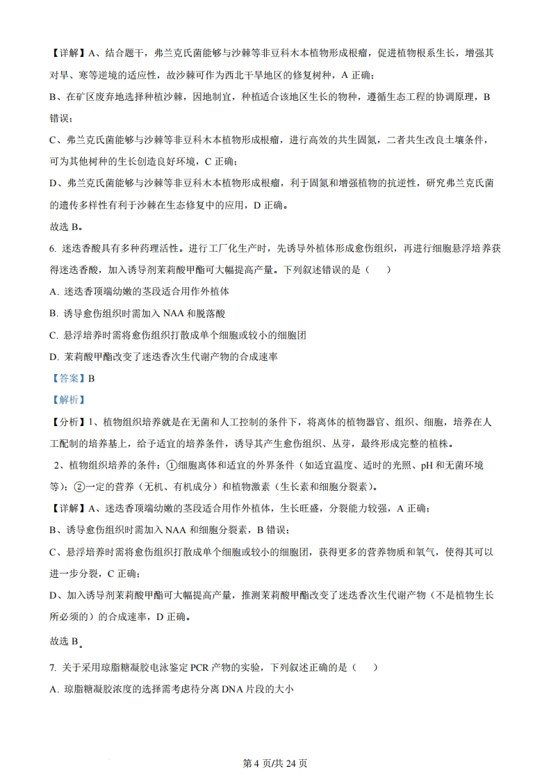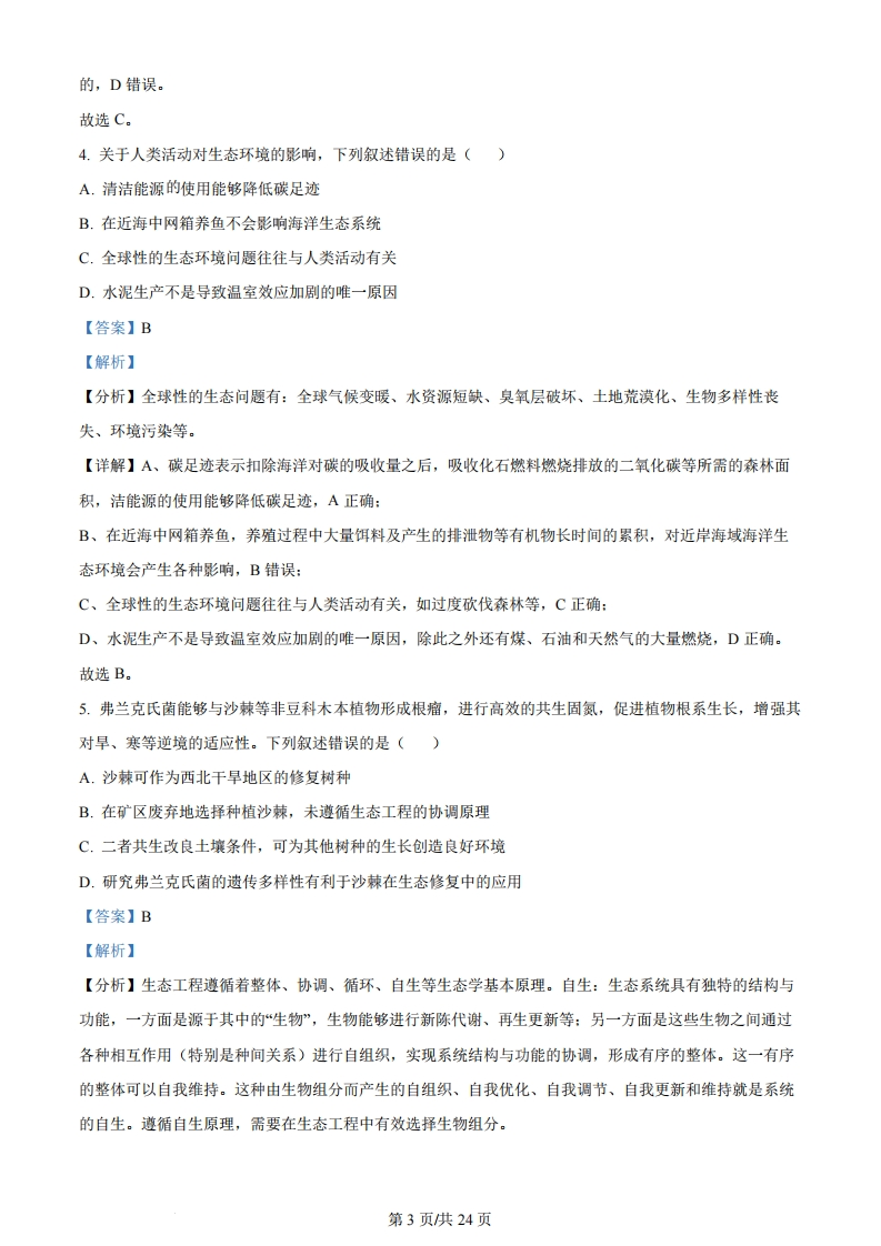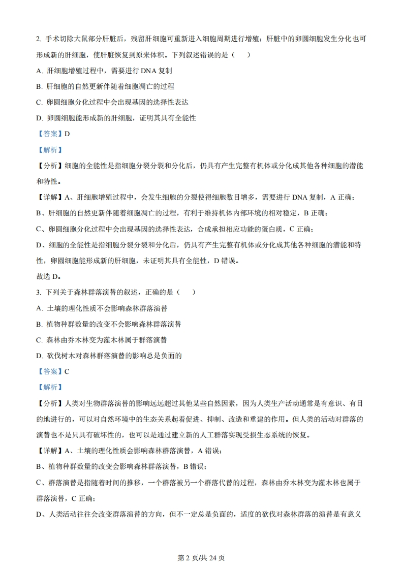 2024年普通高等学校招生选择性考试(辽宁卷)生物学本试卷共11页。考试结束后,将本试卷和答题卡一并交回。注意事项:1,答题前,考生先将自已的姓名、准考证号码填写清楚,将条形码准确粘贴在考生信息条形码粘贴区。2.选择题必须使用2B铅笔填涂;非选择题必须使用0.5毫米黑色字迹的签字笔书写,字体工整、笔迹清楚。3。请按照题号顺序在答题卡各题目的答题区域内作答,超出答题区域书写的答案无效;在草稿纸、试卷上答题无效。4,作图可先使用铅笔画出,确定后必须用黑色字迹的签字笔描黑。5.保持卡面清洁,不要折透,不要弄破、弄皱,不准使用涂改液、修正带、刮纸刀。一、选择题:本题共15小题,每小题2分,共30分。在每小题给出的四个选项中,只有一项符合题目要求。1.钙调蛋白是广泛存在于真核细胞的C+感受器。小鼠钙调蛋白两端有近似对称的球形结构,每个球形结构可结合2个C2+。下列叙述错误的是()A.钙调蛋白的合成场所是核糖体B.Ca2+是钙调蛋白的基本组成单位C.钙调蛋白球形结构的形成与氢键有关D.钙调蛋白结合C2+后,空间结构可能发生变化【答案】B【解析】【分析】蛋白质的合成场所为核糖体,组成蛋白质的基本单位为氨基酸,蛋白质一定含有的元素为C、H、O、N。【详解】A、钙调蛋白的合成场所是核糖体,核糖体是生产蛋白质的机器,A正确:B、C2+不是钙调蛋白的基本组成单位,钙调蛋白的基本组成单位是氨基酸,B错误:C、氨基酸之间能够形成氢键等,从而使得肽链能够盘曲、折叠,形成具有一定空间结构的蛋白质分子,钙调蛋白球形结构的形成与氢键有关,C正确:D、小鼠钙调蛋白两端有近似对称的球形结构,每个球形结构可结合2个C2+,钙调蛋白结合C2+后,空间结构可能发生变化,D正确。故选B。第1页供24页2.手术切除大鼠部分肝脏后,残留肝细胞可重新进入细胞周期进行增殖:肝脏中的卵圆细胞发生分化也可形成新的肝细胞,使肝脏恢复到原来体积。下列叙述错误的是()A.肝细胞增殖过程中,需要进行DNA复制B.肝细胞的自然更新伴随着细胞调亡的过程C.卵圆细胞分化过程中会出现基因的选择性表达D.卵圆细胞能形成新的肝细胞,证明其具有全能性【答案】D【解析】【分析】细胞的全能性是指细胞分裂分裂和分化后,仍具有产生完整有机体或分化成其他各种细胞的潜能和特性。【详解】A、肝细胞增殖过程中,会发生细胞的分裂使得细胞数目增多,需要进行DNA复制,A正确:B、肝细胞的自然更新伴随着细胞调亡的过程,有利于维持机体内部环境的相对稳定,B正确:C、卵圆细胞分化过程中会出现基因的选择性表达,合成承担相应功能的蛋白质,C正确:D、细胞的全能性是指细胞分裂分裂和分化后,仍具有产生完整有机体或分化成其他各种细胞的潜能和特性,卵圆细胞能形成新的肝细胞,未证明其具有全能性,D错误。故选D。3.下列关于森林群落演替的叙述,正确的是()A.土壤的理化性质不会影响森林群落演替B.植物种群数量的改变不会影响森林群落演替C.森林由乔木林变为灌木林属于群落演替D.砍伐树木对森林群落演替的影响总是负面的【答案】C【解析】【分析】人类对生物群落演替的影响远远超过其他某些自然因素,因为人类生产活动通常是有意识、有目的地进行的,可以对自然环境中的生态关系起着促进、抑制、改造和重建的作用。但人类的活动对群落的演替也不是只具有破坏性的,也可以是通过建立新的人工群落实现受损生态系统的恢复。【详解】A、土壤的理化性质会影响森林群落演替,A错误:B、植物种群数量的改变会影响森林群落演替,B错误:C、群落演替是指随着时间的推移,一个群落被另一个群落代替的过程,森林由乔木林变为灌木林也属于群落演替,C正确:D、人类活动往往会改变群落演替的方向,但不一定总是负面的,适度的砍伐对森林群落的演替是有意义第2页共24页的,D错误。故选C。4.关于人类活动对生态环境的影响,下列叙述错误的是()A.清洁能源的使用能够降低碳足迹B.在近海中网箱养鱼不会影响海洋生态系统C.全球性的生态环境问题往往与人类活动有关D.水泥生产不是导致温室效应加剧的唯一原因【答案】B【解析】【分析】全球性的生态问题有:全球气候变暖、水资源短缺、臭氧层破坏、土地荒漠化、生物多样性丧失、环境污染等。【详解】A、碳足迹表示扣除海洋对碳的吸收量之后,吸收化石燃料燃烧排放的二氧化碳等所需的森林面积,洁能源的使用能够降低碳足迹,A正确:B、在近海中网箱养鱼,养殖过程中大量饵料及产生的排泄物等有机物长时间的累积,对近岸海域海洋生态环境会产生各种影响,B错误:C、全球性的生态环境问题往往与人类活动有关,如过度砍伐森林等,C正确:D、水泥生产不是导致温室效应加剧的唯一原因,除此之外还有煤、石油和天然气的大量燃烧,D正确。故选B。5.弗兰克氏菌能够与沙棘等非豆科木本植物形成根瘤,进行高效的共生固氮,促进植物根系生长,增强其对旱、寒等逆境的适应性。下列叙述错误的是()A.沙棘可作为西北干旱地区的修复树种B.在矿区废弃地选择种植沙棘,未遵循生态工程的协调原理C.二者共生改良土壤条件,可为其他树种的生长创造良好环境D.研究弗兰克氏菌的遗传多样性有利于沙棘在生态修复中的应用【答案】B【解析】【分析】生态工程遵循着整体、协调、循环、自生等生态学基本原理。自生: