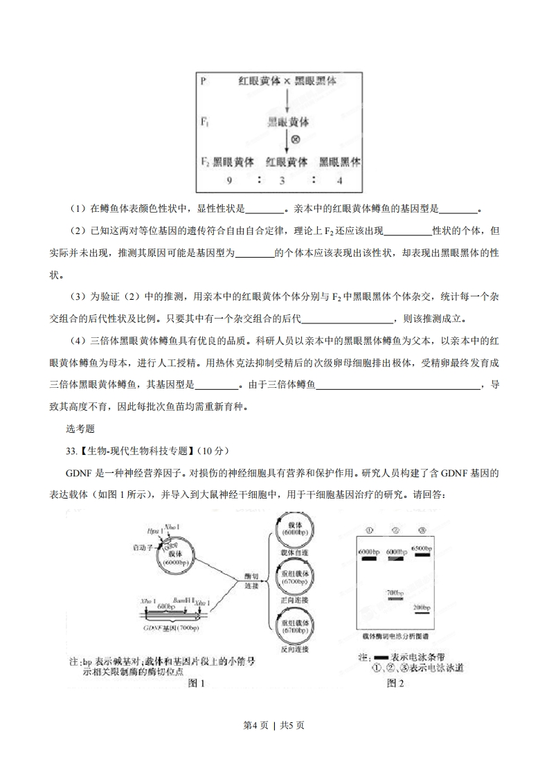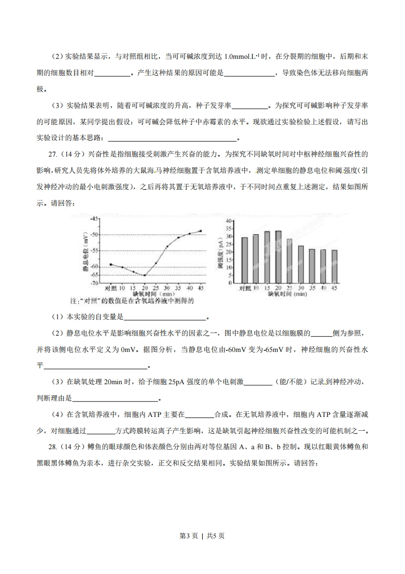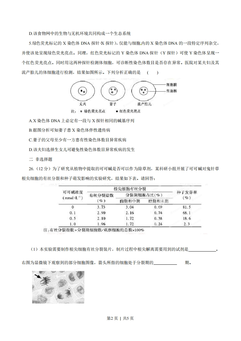 2015年普通高等学校招生全国统一考试理综生物部分(福建卷)1.人体内含有多种多样的蛋白质,每种蛋白质()A.都含有20种氨基酸B.都是在细胞内发挥作用C.都具有一定的空间结构D.都能催化生物化学反应2.有一种胰岛素依赖型糖尿病是由于患者体内某种T细胞过度激活为效应T细胞后,选择性地与胰岛B细胞密切接触,导致胰岛B细胞死亡而发病。下列叙述正确的是()A.这种胰岛素依赖型糖尿病属于自身免疫病B.患者血液中胰岛素水平高于正常生理水平C.效应T细胞将抗原传递给胰岛B细胞致其死亡D.促进T细胞增殖的免疫增强剂可用于治疗该病3.在光合作用中,RuBP羧化酶能催化CO2+C5(即RuBP)→2C3。为测定RuBP羧化酶的活性,某学习小组从菠菜叶中提取该酶,用其催化C5与14℃O2的反应,并检测产物14C3的放射性强度。下列分析错误的是()A.菠菜叶肉细胞内BuBP羧化酶催化上述反应的场所是叶绿体基质B.RuBP羧化酶催化的上述反应需要在无光条件下进行C.测定RuBP羧化酶活性的过程中运用了同位素标记法D.单位时间内14C3生成量越多说明RuBP羧化酶活性越高4.下图为某人工鱼塘食物网及其能量传递示意图(图中数字为能量数值,单位是J.m2a)。下列叙述正确的是()浮游动彻84+0幽蚊纳虫378031920浮游柏物3780840210可用的太阳辐射g3066000319204200摇蚊幼虫太阳鱼鲈鱼420012601483126126A该食物网中最高营养级为第六营养级B.该食物网中第一到第二营养级的能量传递效率为25%C.太阳鱼呼吸作用消耗的能量为1357J.m2.a第1页|共5页D.该食物网中的生物与无机环境共同构成一个生态系统5.绿色荧光标记的X染色体DNA探针K探针),仅能与细胞内的X染色体DNA的一段特定序列杂交,并使该处呈现绿色荧光亮点。同理,红色荧光标记的Y染色体DNA探针(Y探针)可使Y染色体呈现一个红色荧光亮点。同时用这两种探针检测体细胞,可诊断性染色体数目是否存在异常。医院对某夫妇及其流产胎儿的体细胞进行检测,结果如图所示。下列分析正确的是()细胞职9,细胞核丈夫娄子流产胎儿注:。绿色荧光亮点。红色荧光亮点A.X染色体DNA上必定有一段与X探针相同的碱基序列B.据图分析可知妻子患X染色体伴性遗传病C.妻子的父母至少有一方患有性染色体数目异常疾病D.该夫妇选择生女儿可避免性染色体数目异常疾病的发生二非选择题26.(12分)为了研究从植物中提取的可可碱是否可以作为除草剂,某科研小组开展了可可碱对鬼针草根尖细胞的有丝分裂和种子萌发影响的实验研究,结果如下表。请回答:根尖细胞有丝分裂可可碱浓度种子发芽率(mmol L)有丝分裂指数分裂期细胞占比(%)(%)(%)前期和中期后期和末期03.733.040.6981.50.12.902.160.7468.10.52.101.720.3818.61.01.961.720.242.3注:有丝分裂指数=分裂期细胞数/观察细胞的总数×100%(1)本实验需要制作根尖细胞有丝分裂装片,制片过程中根尖解离需要用到的试剂是右图为显微镜下观察到的部分细胞图像,箭头所指的细胞处于分裂期的」期。第2页|共5页(2)实验结果显示,与对照组相比,当可可碱浓度到达1.0mmol.L1时,在分裂期的细胞中,后期和末期的细胞数目相对。产生这种结果的原因可能是导致染色体无法移向细胞两极。(3)实验结果表明,随着可可碱浓度的升高,种子发芽率。为探究可可碱影响种子发芽率的可能原因,某同学提出假设:可可碱会降低种子中赤霉素的水平。现欲通过实验检验上述假设,请写出实验设计的基本思路:27.(14分)兴奋性是指细胞接受刺激产生兴奋的能力。为探究不同缺氧时间对中枢神经细胞兴奋性的影响,研究人员先将体外培养的大鼠海马神经细跑置于含氧培养液中,测定单细胞的静息电位和阈强度(引发神经冲动的最小电刺激强度),之后再将其置于无氧培养液中,于不同时间点重复上述测定,结果如图所示。请回答:-4540135(Au)5030-5-60-655.70对照1015202530354045对厘1015.202530354045缺氧时间(mn》缺氧时间(min)注:“对照”的数值是在含氧培养液中测得的(1)本实验的自变量是(2)静息电位水平是影响细胞兴奋性水平的因素之一,图中静息电位是以细胞膜的侧为参照,并将该侧电位水平定义为0mV。据图分析,当静息电位由-60mV变为65mV时,神经细胞的兴奋性水平(3)在缺氧处理20min时,给予细胞25pA强度的单个电刺激(能/不能)记录到神经冲动,判断理由是(4)在含氧培养液中,细胞内ATP主要在合成。在无氧培养液中,细胞内ATP含量逐渐减少,对细胞通过方式跨膜转运离子产生影响,这是缺氧引起神经细胞兴奋性改变的可能机制之一。28.(14分)鳟鱼的眼球颜色和体表颜色分别由两对等位基因A、a和B、b控制。现以红眼黄体鳟鱼和黑眼黑体鳟鱼为亲本,进行杂交实验,正交和反交结果相同。实验结果如图所示。请回答:第3页|共5页
