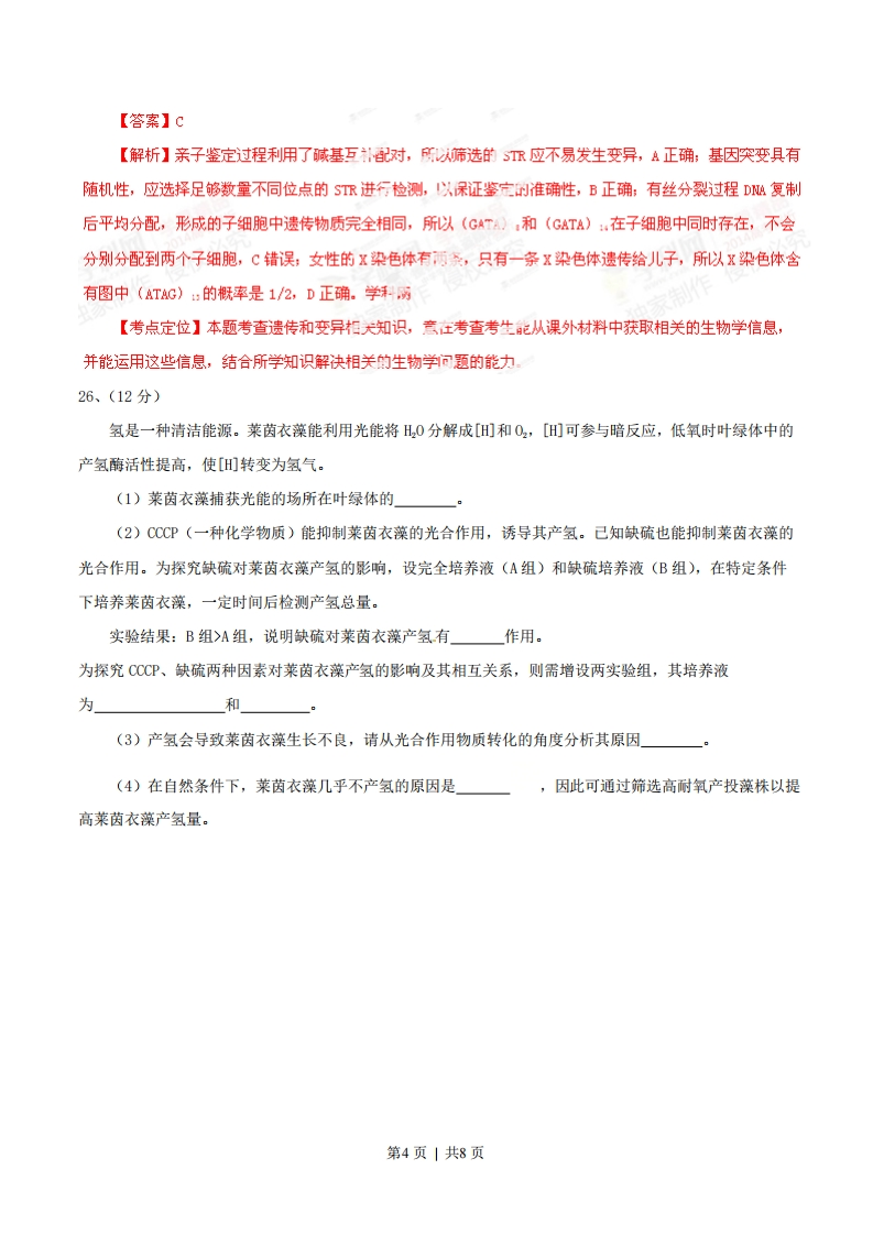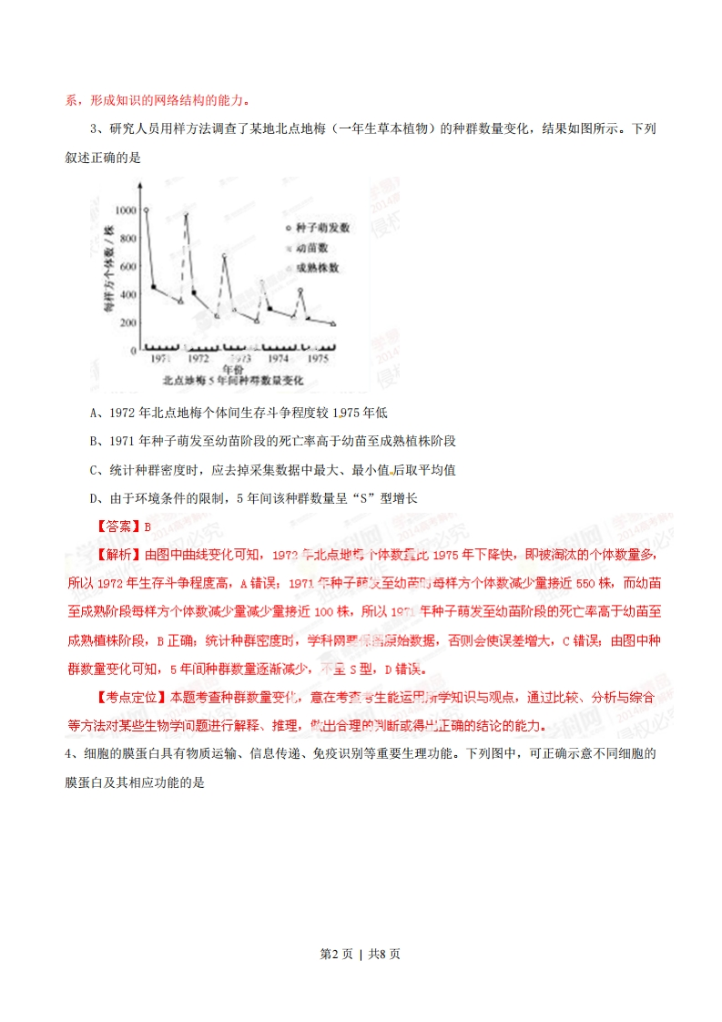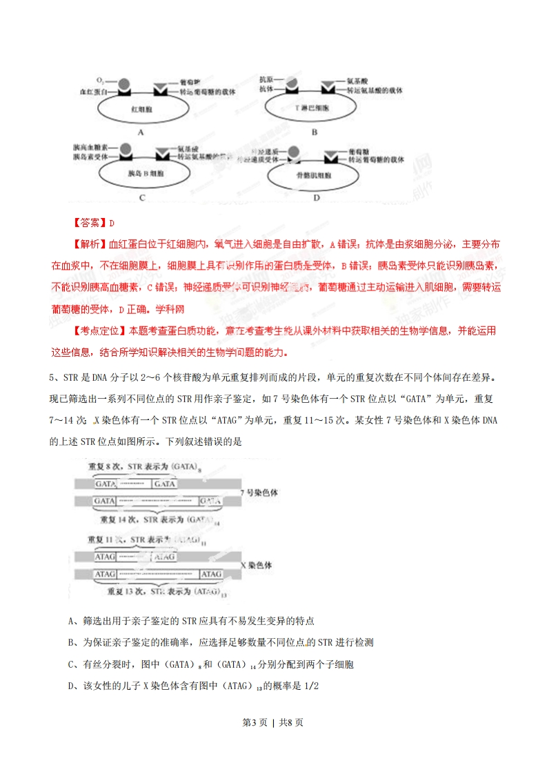 【总评】今年福建生物卷以能力测试为主导,关注科学与社会之间的联系。试题设计体现了稳中有创新的命题理念。体现在:(1)点多面广,突出主干。试题知识点覆盖面厂,如23题综合考查了DA分子结构、遗传物质实验证明、遗传规律和基因表达等。一道题中包今并跨越了多个章芊的知识,注重细节的考察。(2)注重双基,考察能力,如第1、2、4题等,考查基知识的记忆和理解能力。由此可见教学、复习应该注重回归课本、扎实基础。(3)联系实际,关注生活。如第27题以汽车尾气为材料,考查环境污染对人体的影响。在教学时要将课本知识与科学、技术与社会的联系.总的来说,今年理综生物部分的试题注对学生识图能力、实验分析能力。体现了新课程标准的理念和要求,很好的指明了今后教学与备考的方向。2014年高考福建理综生物试题1、用蛋白酶去除大肠杆菌核糖体的蛋白质,处理后的核糖体仍可催化氨基酸的脱水缩合反应,由此可推测核糖体中能催化该反应的物质是A、蛋白酶B、RNA聚合酶C、RNAD、逆转录酶【答案】c【解析】核糖体是由蛋白质和WA短成,蛋白酶能专一去除核糖体中蛋白质,只剩NA,仍可催化氨基酸的脱水缩合反应,说明有NA存在既可完成学科网脱水编台反应,所以有催化作用的物质是RNA,选C。【考点定位】本题考查酶的本质,意在考查卷生能从课外材”中获取相关的生物学信息,并能运用这些信息,结合所学知识解决相关的生物学问题的能力.2、运动时汗腺分泌大量汗液,汗液初始的渗透压与血浆相等,在流经汗腺导管排出体外过程中大部分N、C1被重吸收,而水很少被重吸收,下列叙述正确的是A、出汗可使血浆渗透压降低B、出汗不利于体温维持稳定C、汗腺导管重吸收Na需要消耗ATPD、下丘脑渗透压感受器兴奋减弱【答案】C【解析】由题意可知,出汗后大部分N:,C1被吸收,而水很少被重吸收,血浆的浓度升高,使血浆渗透压升高,A错误,运动员运动过程体中物质分解加快,产热增多,通过调节作用使机体出汗,增加机体散热,维持体温相对恒定,所以出汗有利于体温雄特定,B错误:Na的吸收是主动运输,需要载体和能量,ATP是直接能源物质,C正确:由于血浆透压升高,下丘脑渗透压感受器兴奋增强,D错误。【考点定位】本题考查内环境稳态节,意在考查考生能解所学知识的要点,把握知识间的内在联第1页|共8页系,形成知识的网络结构的能力。3、研究人员用样方法调查了某地北点地梅(一年生草本植物)的种群数量变化,结果如图所示。下列叙述正确的是1000。种子期发数功菌数600成熟株数4002019711902131974197501年份北点油梅5年树种群数最麦化A、1972年北点地梅个体间生存斗争程度较1975年低B、1971年种子萌发至幼苗阶段的死亡率高于幼苗至成熟植株阶段C、统计种群密度时,应去掉采集数据中最大、最小值后取平均值D、由于环境条件的限制,5年间该种群数量呈“S”型增长【答案】B【解析】由图中曲线变化可知,1972年北点地个体数量此1975年下降快,即被淘汰的个体数量多;所以1972年生存斗争程度高,A错误;1971年种子萌发至幼芦时每样方个体数减少量接近550株,而幼苗至成熟阶段每样方个体数减少量减少量接近100株,所以171年种子萌发至幼苗阶段的死亡率高于幼苗至成熟植株阶段,B正确:统计种群密度时,学科网要保原始数据,否则会使误差增大,C错误,由图中种群数量变化可知,5年间种群数量逐渐减少,不主S型,D错误。【考点定位】本题考查种群数量变化,意在考查芍生能运甲学知识与观点,通过比较、分析与综合等方法对某些生物学问题进行解释、推理,出合理的判断或得正确的结论的能力。4、细胞的膜蛋白具有物质运输、信息传递、免疫识别等重要生理功能。下列图中,可正确示意不同细胞的膜蛋白及其相应功能的是第2页|共8页0着自的抗原一一额基酸在红置白一转场葡萄的体杭体一转运氢址酸的最体红知鞋T淋巴氧率B装底金相素一氯基使2理所-能目就装岛素受体一转运销萄的我体族岛B阳脑骨整肌阳脑【答案】D【解析】血红蛋白位于红细胞内,氧气进入细胞是自由扩散,A错误,抗体是由浆细胞分泌,主要分布在血浆中,不在细胞膜上,细胞膜上具有识别作用的蛋白质是受体,B错误;胰岛素受体只能识别胰岛素,不能识别胰高血糖素,C错误;神经递质晋体可识别神经强,葡萄糖通过主动运输进入肌细胞,需要转运葡萄糖的受体,D正确。学科网【考点定位】本题考查蛋白质功能,意在考查考生能从课外材料中获取相关的生物学信息,并能运用这些信息,结合所学知识解决相关的生物学问题的能力。5、STR是DNA分子以26个核苷酸为单元重复排列而成的片段,单元的重复次数在不同个体间存在差异。现己筛选出一系列不同位点的STR用作亲子鉴定,如7号染色体有一个STR位点以“GATA”为单元,重复7~14次X染色体有一个STR位点以“ATAG”为单元,重复11~15次。某女性7号染色体和X染色体DNA的上述STR位点如图所示。下列叙述错误的是重复8次,STR表示为(GATA)GATAIGATA号染色体GATA01因重复14次,SR表示为(GTA承复11次。STR表示光AATAGAIAGX染色体ATAGATAG重夏13次,ST表示为ATG》A、筛选出用于亲子鉴定的STR应具有不易发生变异的特点B、为保证亲子鉴定的准确率,应选择足够数量不同位点的STR进行检测C、有丝分裂时,图中(GATA)和(GATA)14分别分配到两个子细胞D、该女性的儿子X染色体含有图中(ATAG)a的概率是1/2第3页|共8页