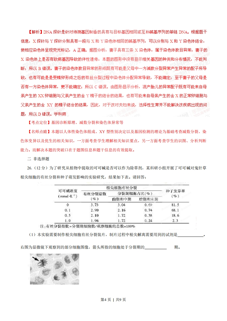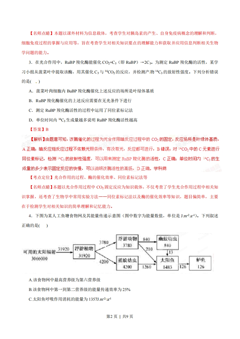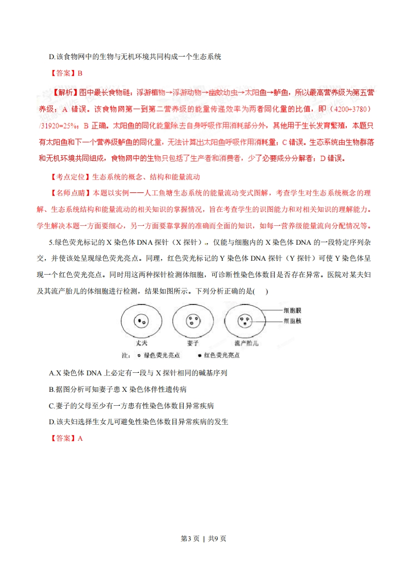2015年普通高等学校招生全国统一考试理综生物部分(福建卷)1.人体内含有多种多样的蛋白质,每种蛋白质()A.都含有20种氨基酸B.都是在细胞内发挥作用C都具有一定的空间结构D.都能催化生物化学反应【答案】C【解析】人体中蛋白质不是每种都含有20种氨基酸,例如胰岛素含有16种51个氨基酸,A错误。分泌蛋白例如消化酶、抗体、蛋白质类的激素均在细胞外发挥作用,B错误。只有酶起催化作用,但不是所有的蛋白质都属于酶,蛋白质在人体中结构多样性决定了其功能的多样性,人体中蛋白质具有运输、催化、免疫、调节等多种功能,D错误。蛋白质分子由多肽链组成,肽链的折叠、盘曲或者糖基化等过程使得蛋白质都具有一定的空间结构,C正确。学科网【考点定位】考查蛋白质的结构和功能。【名师点睛】本题是蛋白质有关的一个综合题,需要学生系统掌握蛋白质的相关知识,如蛋白质的组成单位及其种类、形成过程及其结构特点、功能及其发挥作用的场所等,意在提醒学生在平时复习中要对某方面的知识专题会做系统而全面的归纳、总结,进而形成知识网络体系。2.有一种胰岛素依赖型糖尿病是由于患者体内某种T细胞过度激活为效应T细胞后,选择性地与胰岛B细胞密切接触,导致胰岛B细胞死亡而发病。下列叙述正确的是()A.这种胰岛素依赖型糖尿病属于自身免疫病B.患者血液中胰岛素水平高于正常生理水平C.效应T细胞将抗原传递给胰岛B细胞致其死亡D.促进T细胞增殖的免疫增强剂可用于治疗该病【答案】A【解析】效应T细胞的免疫方式是直接与靶细胞(胰岛B细胞)的密切接触,使胰岛B细胞裂解死亡,导致患者的胰岛B细胞受损死亡导致胰岛素合成分泌减少,胰岛素水平下降;所以B错误。效应T细胞不具有传递抗原给靶细胞的作用,所以C错误。患者由于T细胞过度激活,免疫功能异常增强导致胰岛B细胞受损,不能使用免疫增强刑治疗;所以D错误。由于是自身的T细胞过度激活导致攻击自身的胰岛B细胞死亡导致疾病,所以属于自身免疫病;所以A正确。【考点定位】胰岛素的产生与作用、细胞免疫和自身免疫病等第1页|共9页【名师点睛】本题以课外材料为信息载体,考查学生对胰岛素的产生、自身免疫病概念的理解和判断,细胞免疫过程的掌握与应用等,旨在考查学生对相关知识要点的理解能力和获取并应用信息判断相关生物学问题的能力。3.在光合作用中,RuBP羧化酶能催化CO2+C5(即RuBP)→2C3。为测定RuBP羧化酶的活性,某学习小组从菠菜叶中提取该酶,用其催化C5与14CO2的反应,并检测产物14C3的放射性强度。下列分析错误的是(.)A.菠菜叶肉细胞内BuBP羧化酶催化上述反应的场所是叶绿体基质B.RuBP羧化酶催化的上述反应需要在无光条件下进行C.测定RuBP羧化酶活性的过程中运用了同位素标记法D.单位时间内4C3生成量越多说明RuBP羧化酶活性越高【答案】B【解析】由题意可知,该酶催化的过程为光合作用暗反应过程中的C0的固定,反应场所是叶绿体基质,A正确,暗反应指反应过程不依赖光照条件,有没有光,反应都可进行,B错误,对1+CO:中的C元素进行同位素标记,检测1“C:的放射性强度,可以用来测定RBP羧化酶的活性,C正确:单位时间内14C:的生成量的多少表示固定反应的快慢,可以说明该酶活性的高低,D正确。学科网【考点定位】光合作用的过程、酶的催化效率、同位素标记法等【名师点睛】本题以光合作用过程中CO2固定反应为知识载体,不仅考查了学生光合作用过程中相关知识掌握,还考查了生物学中常用实验方法一一同位素标记法以及酶的催化效率等知识,题目偏简单,主要在于检测学生对相关知识的简单理解和记忆能力。4.下图为某人工鱼塘食物网及其能量传递示意图(图中数字为能量数值,单位是J.m2a1)。下列叙述正确的是()浮游动彻840幽蚊幼虫37803780840可用的太阳辐射-31920浮游植物21031920g30660004200耀蚊幼虫太阳鱼鲈负420012601483126126A该食物网中最高营养级为第六营养级B.该食物网中第一到第二营养级的能量传递效率为25%C.太阳鱼呼吸作用消耗的能量为1357J.m2a1第2页|共9页D.该食物网中的生物与无机环境共同构成一个生态系统【答案】B【解析】图中最长食物链:浮游植物→浮游动物→坐蚊幼虫→太阳鱼→鲈鱼,所以最高营养级为第五营养级,A错误。该食物网第一到第二营养级的能量传递效率为两者同化量的比值,即(4200-3780)31920-25%:B正确。太阳鱼的同化能量除去自身呼吸作用消耗部分外,其他用于生长发膏繁殖,本题只有太阳鱼和下一个营养级鲈鱼的同化量,无法计算出太阳鱼呼吸作用消耗量,C错误。生态系统由生物群落和无机环境共同组成,食物网中的生物只包括了生产者和消费者,少了必要成分分解者;D错误。【考点定位】生态系统的概念、结构和能量流动【名师点睛】本题以实例一一人工鱼塘生态系统的能量流动变式图解,考查学生对生态系统概念的理解、生态系统结构和能量流动的相关知识的掌握情况,旨在考查学生的识图能力和对相关知识的理解能力。学生解决本题一方面要细心,另一方面要靠掌握的准确而全面的知识,如每一营养级能量流向分配情况等。5.绿色荧光标记的X染色体DNA探针(X探针),仅能与细胞内的X染色体DNA的一段特定序列杂交,并使该处呈现绿色荧光亮点。同理,红色荧光标记的Y染色体DNA探针(Y探针)可使Y染色体呈现一个红色荧光亮点。同时用这两种探