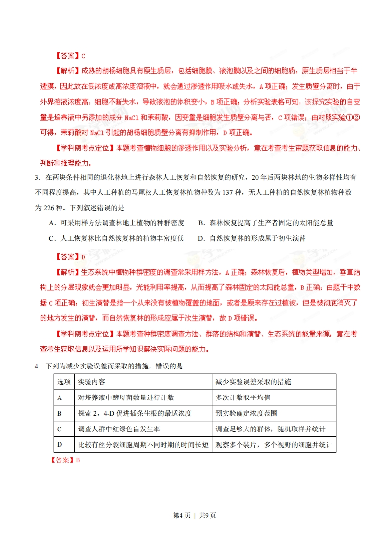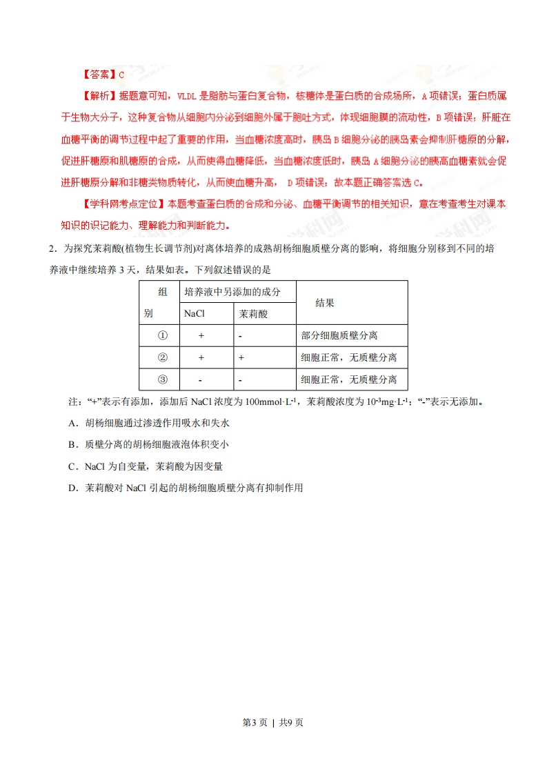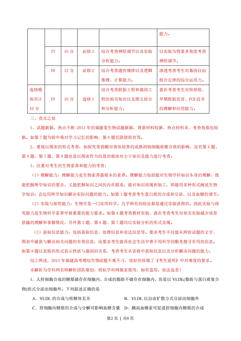 2013年高考福建卷理综生物【学科网试卷总评】福建省2013年高考理科综合生物部分模式相对稳定,试题难度适中,考点分布合理,突出教材重点、主干知识的考查。以能力立意为主导,以理解能力为基础,突出对获取信息和实验分析能力的考查。具体特点分析如下:一、试卷模式福建省高考理科综合试卷总分300分,生物部分占80分,其中选择题5道,非选择题4道。二、知识考查代谢和遗传、调节、免疫、生态、生物技术等是高中生物学科的主干知识,而本套试卷生物试题对主干知识的考查和能力要求以及考查特色如下:试题分值考查范围考查意图考查特色T16分必修1以人体内物质代谢为立足点凸显考生对基础知识以及必修3考查细胞内的重要生理过程。知识间内在联系的理解。T26分必修1考查植物细胞的渗透作用以不是简单的知识考查,而及逻辑推理能力。是通过实验推理来呈现。考查种群密度调查方法、群落以新情景的形式考查生态T36分必修3的结构和演替、生态系统的能学的相关知识。量米源。必修模必修1综合考查教材中经典实验的巧妙地整合再现教材中的块共计T46分必修2相关知识以及实验分析能力。经典实验。70分必修3考查染色体变异、有丝分裂和设置新情景考查考生的综T56分必修2减数分裂的相关知识以及获合运用能力。取处理信息的能力。综合考查细胞呼吸和光合作在曲线图中融入知识的考T612分必修3用的相关知识以及曲线分析查,考查考生对图文的理能力。解能力以及图文信息转换第1页|共9页能力。T716分必修3综合考查神经调节以及实验以实验为背景多角度考查分析能力。神经调节。T812分必修2综合考查遗传规律以及逻辑渗透考查考生对基因自由推理、计算能力。组合定律的综合运用力。选修模综合考查胚胎工程和基因工意在考查考生对核移植、块共计T910分选修3程的相关知识以及图文结合早期胚胎发育、PCR技术10分和分析能力。的理解和应用能力。三、亮点之处1、试题新颗,热点不断:2013年的福建卷生物试题新颗,背景材料较新,热点材料多,考查角都也较新。如第7题为铅中毒对学习记忆的影响、第9题克隆猪培育等。2、重视以图表的形式考查:如探究茉莉酸对离体培养的成熟胡杨细胞质壁分离的影响,还有第4题、第6题、第7题、第8题也是以图表作为信息的载体对主干知识及能力进行考查。3、注重对考生的生物素养和能力的考查:(1)理解能力:理解能力是生物素养最根本的素养。理解能力包括能对生物学科知识本身的理解,既能把握所学知识的要点,又能把握知识之间的内在联系:能对知识再现和加工,即能用多种形式阐述生物学知识:会运用所学知识解决实际问题的能力。如第1题考查考生蛋白质的合成和分泌,以及血糖的调节。(2)实验与探究能力:生物学是一门实用科学,几乎所有的结论都是通过实验获得的。因此实验与探究能力是生物科学素养中极重要的能力要求。如第4题考查教材实验,意在考查考生对相关实验减少误差措施的理解和掌握情况,另外第2题、第6题、第7题均以实验分析的形式呈现。(3)获取信息能力:包括获取信总、处理信息和表达信息等。要求考生不仅能从所给试题的文字、图表中捕获与解决相关问题的有效信总息,还要求考生能再社会生活中善于用科学的眼光搜寻有用的信息。如第8题以表格的形式表示性状与基因的关系,考查考生从表格中获取信息以及分析解决问题的能力。综上所述,2013年福建高考理综生物试题不难不刁,很好的体现了《考生说明》中对难度的要求。本解析为学科网名师解析团队原创,授权学科网独家使用,如有盗用,依法追责!1.人肝细胞合成的糖原储存在细胞内,合成的脂肪不储存在细胞内,而是以VLDL(脂肪与蛋白质复合物)形式分泌出细胞外。下列叙述正确的是A.VLDL的合成与核糖体无关B.VLDL以自由扩散方式分泌出细胞外C.肝细胞内糖原的合成与分解可影响血糖含量D.胰高血糖素可促进肝细胞内糖原的合成第2页|共9页【答案】C【解析】据题意可知,亿L是脂肪与蛋白复合物,核糖体是蛋白质的合成场所,A项错误;蛋白质属于生物大分子,这种复合物从细胞内分泌到细胞外属于胞吐方式,体现细胞膜的流动性,B项错误,肝脏在血糖平衡的调节过程中起了重要的作用,当血糖浓度高时,胰岛B细胞分泌的胰岛素会抑制肝糖原的分解,促进肝糖原和肌糖原的合成,从而使得血糖降低,当血糖浓度低时,胰岛A细胞分泌的胰高血糖素就会促进肝糖原分解和非糖类物质转化,从而使血糖升高,D项错误:故本题正确答案选C。【学科网考点定位】本题考查蛋白质的合成和分泌、血糖平衡调节的相关知识,意在考查考生对课本知识的识记能力、理解能力和判断能力。2.为探究茉莉酸(植物生长调节剂)对离体培养的成熟胡杨细胞质壁分离的影响,将细胞分别移到不同的培养液中继续培养3天,结果如表。下列叙述错误的是组培养液中另添加的成分结果别NaCl茉莉酸①部分细胞质壁分离②细胞正常,无质壁分离③细胞正常,无质壁分离注:“4”表示有添加,添加后NaCl浓度为100mmol-Ll,茉莉酸浓度为103mgL:“”表示无添加。A.胡杨细胞通过渗透作用吸水和失水B.质壁分离的胡杨细胞液泡体积变小C.NaC为自变量,茉莉酸为因变量D.茉莉酸对NaC引起的胡杨细胞质壁分离有抑制作用第3页|共9页