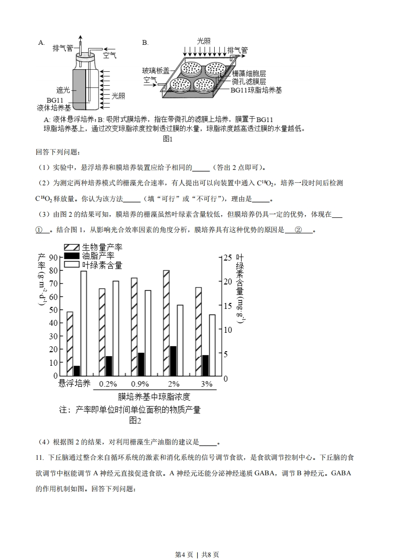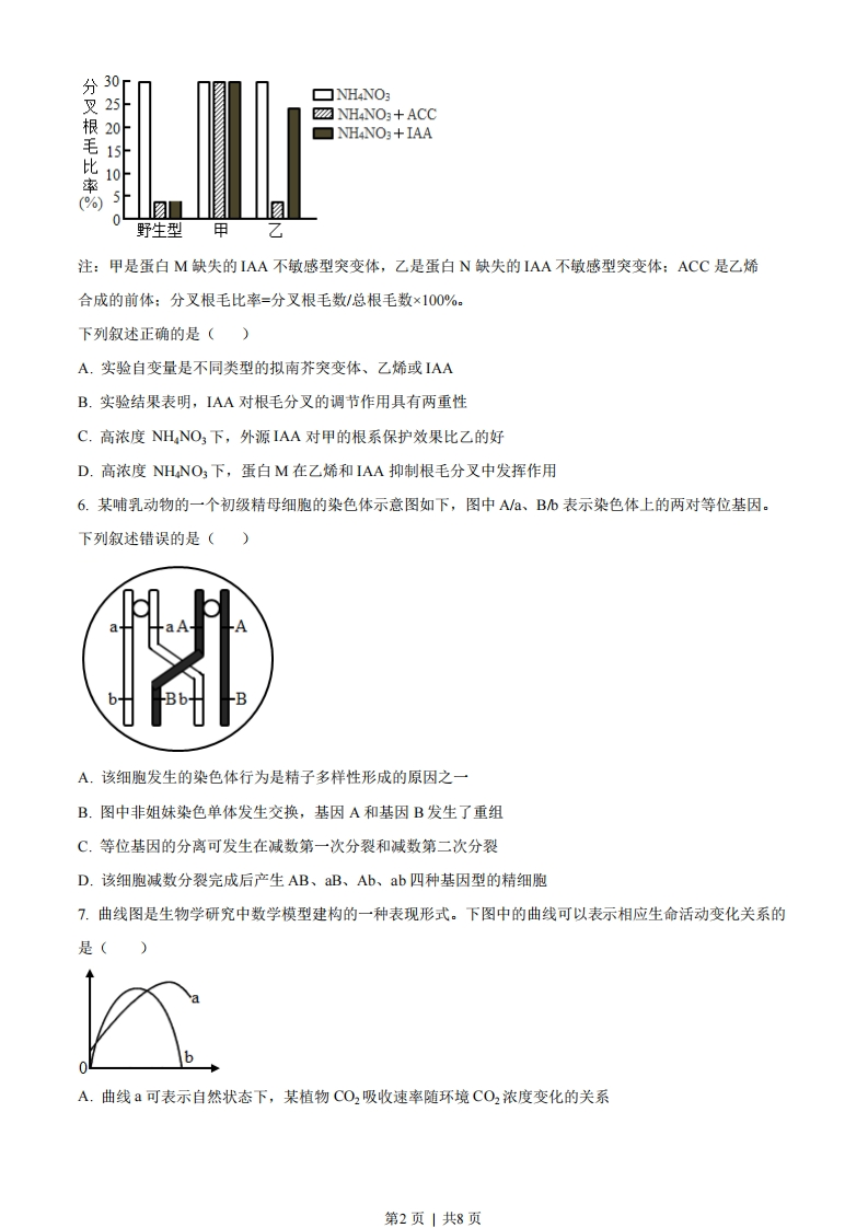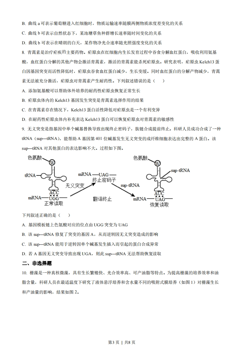 福建省2022年普通高中学业水平选择性考试生物试题一、单项选择题1.下列关于黑藻生命活动的叙述,错误的是()A.叶片细胞吸水时,细胞液的渗透压降低B.光合作用时,在类囊体薄膜上合成ATPC.有氧呼吸时,在细胞质基质中产生CO2D.细胞分裂时,会发生核膜的消失和重建2.科研人员在2003年完成了大部分的人类基因组测序工作,2022年宣布测完剩余的8%序列。这些序列富含高度重复序列,且多位于端粒区和着丝点区。下列叙述错误的是()A.通过人类基因组可以确定基因的位置和表达量B.人类基因组中一定含有可转录但不翻译的基因C.着丝点区的突变可能影响姐妹染色单体的正常分离D.人类基因组测序全部完成有助于细跑衰老分子机制的研究3.我国科研人员在航天器微重力环境下对多能干细胞的分化进行了研究,发现与正常重力相比,多能干细胞在微重力环境下加速分化为功能健全的心肌细胞。下列叙述错误的是()A.微重力环境下多能干细胞和心肌细胞具有相同的细胞周期B.微重力环境下进行人体细胞的体外培养需定期更换培养液C.多能干细胞在分化过程中蛋白质种类和数量发生了改变D.该研究有助于了解微重力对细胞生命活动的影响4.新冠病毒通过S蛋白与细胞膜上的ACE2蛋白结合后侵染人体细胞。病毒的S基因易发生突变,而ORF1ab和N基因相对保守。奥密克戎变异株S基因多个位点发生突变,传染性增强,加强免疫接种可以降低重症发生率。下列叙述错误的是()A.用ORF1/b和N基因同时作为核酸检测靶标,比仅用S基因作靶标检测的准确率更高B.灭活疫苗可诱导产生的抗体种类,比根据S蛋白设计的mRNA疫苗产生的抗体种类多C.变异株突变若发生在抗体特异性结合位点,可导致相应抗体药物对变异株效力的下降D.变异株S基因的突变减弱了S蛋白与ACE2蛋白的结合能力,有利于病毒感染细胞5.高浓度NHNO3会毒害野生型拟南芥幼苗,诱导幼苗根毛畸形分叉。为研究高浓度NHNO3下乙烯和生长素(IAA)在调节拟南芥幼苗根毛发育中的相互作用机制,科研人员进行了相关实验,部分结果如下图。第1页」共8页30☐NH4NO叉根毛比率2320☑NH4NO3+ACC☐NH4NO3+IAA1510%)5野生型甲注:甲是蛋白M缺失的IAA不敏感型突变体,乙是蛋白N缺失的IAA不敏感型突变体:ACC是乙烯合成的前体:分叉根毛比率=分叉根毛数/总根毛数×100%。下列叙述正确的是()A.实验自变量是不同类型的拟南芥突变体、乙烯或IAAB.实验结果表明,IAA对根毛分叉的调节作用具有两重性C.高浓度NHNO3下,外源IAA对甲的根系保护效果比乙的好D.高浓度NHNO3下,蛋白M在乙烯和IAA抑制根毛分叉中发挥作用6.某哺乳动物的一个初级精母细胞的染色体示意图如下,图中A/a、Bb表示染色体上的两对等位基因。下列叙述错误的是()BA.该细胞发生的染色体行为是精子多样性形成的原因之一B.图中非姐妹染色单体发生交换,基因A和基因B发生了重组C.等位基因的分离可发生在减数第一次分裂和减数第二次分裂D.该细胞减数分裂完成后产生AB、aB、Ab、ab四种基因型的精细胞7.曲线图是生物学研究中数学模型建构的一种表现形式。下图中的曲线可以表示相应生命活动变化关系的是()A.曲线a可表示自然状态下,某植物CO2吸收速率随环境CO2浓度变化的关系第2页|共8页B.曲线可表示葡萄糖进入红细胞时,物质运输速率随膜两侧物质浓度差变化的关系C.曲线b可表示自然状态下,某池塘草鱼种群增长速率随时间变化的关系D.曲线b可表示在晴朗的白天,某作物净光合速率随光照强度变化的关系8.青蒿素是治疗疟疾的主要药物。疟原虫在红细胞内生长发育过程中吞食分解血红蛋白,吸收利用氨基酸,血红蛋白分解的其他产物会激活青蒿素,激活的青蒿素能杀死疟原虫。研究表明,疟原虫Kelch13蛋白因基因突变而活性降低时,疟原虫吞食血红蛋白减少,生长变缓。同时血红蛋白的分解产物减少,青蒿素无法被充分激活,疟原虫对青蒿素产生耐药性。下列叙述错误的是()A.添加氨基酸可以帮助体外培养的耐药性疟原虫恢复正常生长B.疟原虫体内的Kelch123基因发生突变是青蒿素选择作用的结果C.在青蒿素存在情况下,Kelch1l3蛋白活性降低对疟原虫是一个有利变异D.在耐药性疟原虫体内补充表达Klch13蛋白可以恢复疟原虫对青蒿素的敏感性9.无义突变是指基因中单个碱基替换导致出现终止密码子,肽链合成提前终止。科研人员成功合成了一种tRNA(su一RNA),能帮助A基因第401位碱基发生无义突变的成纤维细跑表达出完整的A蛋白。该sup一RNA对其他蛋白的表达影响不大。过程如下图。色氨酸、色氨西酸sup-tRNARNA-mRNA-UAG-终止密码子无义突变sup-tRNAmRNA—CAUC翻译终止mRNAAG正常读取恢复读取下列叙述正确的是()A.基因模板链上色氨酸对应的位点由UGG突变为UAGB.该sup一RNA修复了突变的基因A,从而逆转因无义突变造成的影响C.该sup一RNA能用于逆转因单个碱基发生插入而引起的蛋白合成异常D.若A基因无义突变导致出现UGA,则此sup一RNA无法帮助恢复读取二、非选择题10.栅藻是一种真核微藻,具有生长繁殖快、光合效率高、可产油脂等特点。为提高栅藻的培养效率和油脂含量,科研人员在最适温度下研究了液体悬浮培养和含水量不同的吸附式膜培养(如图1)对栅藻生长和产油量的影响,结果如图2。第3页|共8页