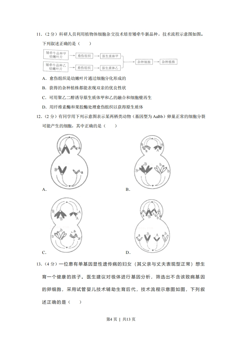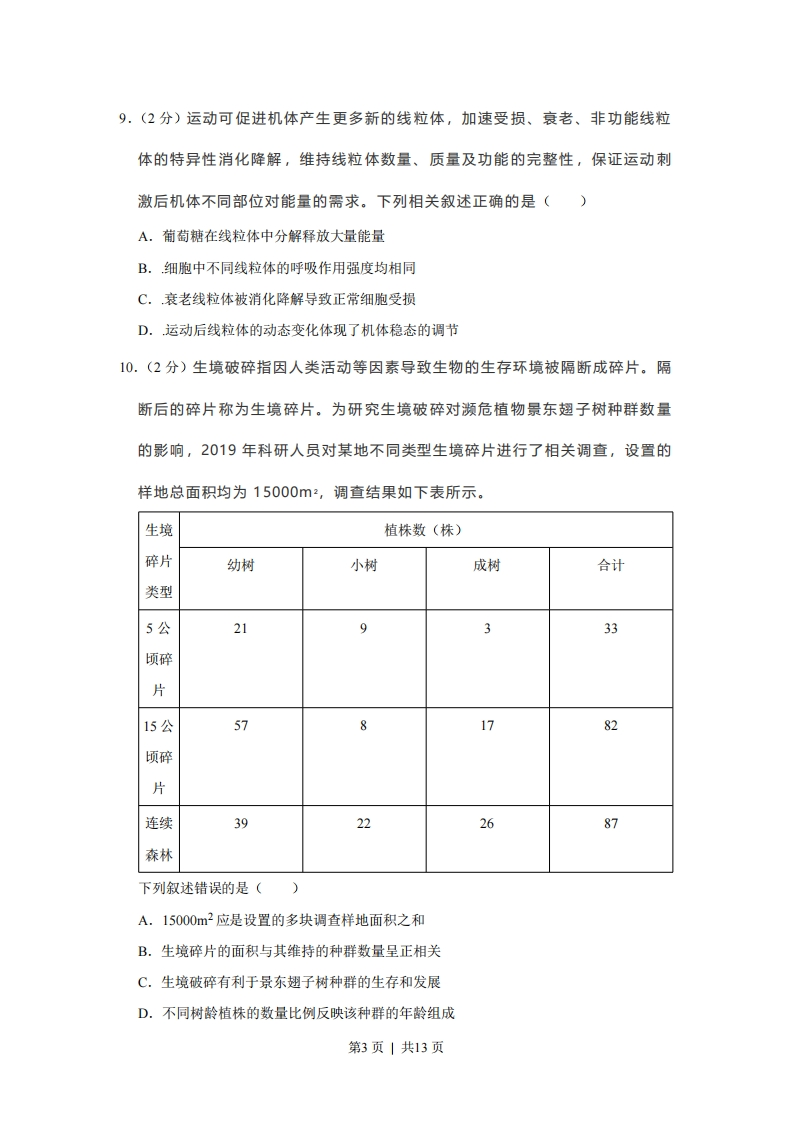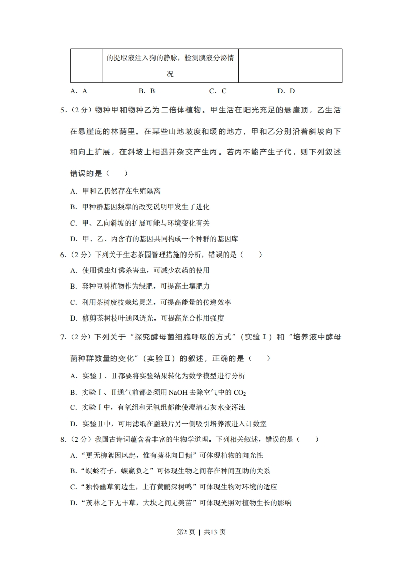 2021年福建省新高考生物试卷一、单项选择题本题共16小题,其中,1~12小题,每思2分13~16小题,每题4分,共40分。在每小题给出的四个选项中,只有一项是最符合题目要求的。1.(2分)下列关于蓝藻和菠菜的叙述,正确的是()A.光合色素的种类和功能都相同B.细胞膜的成分都有脂质和蛋白质C.DNA复制都需要线粒体提供能量D.都能在光学显微镜下观察到叶绿体2.(2分)下列关于健康人体中胰岛素调节血糖平衡的叙述,正确的是()A,胰岛素直接参与肝糖原的合成B.血糖浓度上升时胰岛素的分泌减少C.胰岛B细胞分泌胰岛素不需要消耗能量D.胰岛素的形成过程需内质网和高尔基体加工3.(2分)下列关于遗传信息的叙述,错误的是()A.亲代遗传信息的改变都能遗传给子代B.流向DNA的遗传信息来自DNA或RNAC.遗传信息的传递过程遵循碱基互补配对原则D.DNA指纹技术运用了个体遗传信息的特异性4.(2分)生物科学史蕴含科学研究的思路和方法,下列科学史实验与结论不相符的叙述是()选项科学史实验结论A用伞形帽和菊花形帽伞藻进行嫁接和核移伞藻的帽形建成主要与细胞核有植实验关B绿叶暗处理后,一半遮光,另一半曝淀粉是光合作用的产物光,碘蒸气处理后观察叶片颜色变化C用不同颜色荧光染料标记人和小鼠的细胞细胞膜具有流动性膜蛋白,进行细胞融合实验D将狗的小肠黏膜和稀盐酸混合磨碎后制成胰液分泌是神经调节的结果第1页|共13页的提取液注入狗的静脉,检测胰液分泌情况A.AB.BC.CD.D5.(2分)物种甲和物种乙为二倍体植物。甲生活在阳光充足的悬崖顶,乙生活在悬崖底的林荫里。在某些山地坡度和缓的地方,甲和乙分别沿着斜坡向下和向上扩展,在斜坡上相遇并杂交产生丙。若丙不能产生子代,则下列叙述错误的是()A.甲和乙仍然存在生殖隔离B.甲种群基因频率的改变说明甲发生了进化C.甲、乙向斜坡的扩展可能与环境变化有关D.甲、乙、丙含有的基因共同构成一个种群的基因库6.(2分)下列关于生态茶园管理措施的分析,错误的是()A.使用诱虫灯诱杀害虫,可减少农药的使用B.套种豆科植物作为绿肥,可提高土壤肥力C.利用茶树废枝栽培灵芝,可提高能量的传递效率D.修剪茶树枝叶通风透光,可提高光合作用强度7.(2分)下列关于“探究酵母菌细胞呼吸的方式”(实验I)和“培养液中酵母菌种群数量的变化”(实验Ⅱ)的叙述,正确的是()A.实验I、Ⅱ都要将实验结果转化为数学模型进行分析B.实验I、Ⅱ通气前都必须用NaOH去除空气中的CO2C.实验I中,有氧组和无氧组都能使澄清石灰水变浑浊D.实验Ⅱ中,可用滤纸在盖玻片另一侧吸引培养液进入计数室8.(2分)我国古诗词蕴含着丰富的生物学道理。下列相关叙述,错误的是()A.“更无柳絮因风起,惟有葵花向日倾”可体现植物的向光性B.“螟蛉有子,蜾赢负之”可体现生物之间存在种间互助的关系C.“独怜幽草涧边生,上有黄鹂深树鸣”可体现生物对环境的适应D.“茂林之下无丰草,大块之间无美苗”可体现光照对植物生长的影响第2页|共13页9.(2分)运动可促进机体产生更多新的线粒体,加速受损、衰老、非功能线粒体的特异性消化降解,维持线粒体数量、质量及功能的完整性,保证运动刺激后机体不同部位对能量的需求。下列相关叙述正确的是()A.葡萄糖在线粒体中分解释放大量能量B.细胞中不同线粒体的呼吸作用强度均相同C.衰老线粒体被消化降解导致正常细胞受损D.运动后线粒体的动态变化体现了机体稳态的调节10.(2分)生境破碎指因人类活动等因素导致生物的生存环境被隔断成碎片。隔断后的碎片称为生境碎片。为研究生境破碎对濒危植物景东翅子树种群数量的影响,2019年科研人员对某地不同类型生境碎片进行了相关调查,设置的样地总面积均为15000m2,调查结果如下表所示。生境植株数(株)碎片幼树小树成树合计类型5公219333顷碎片15公5781782顷碎片连续39222687森林下列叙述错误的是()A.15000m2应是设置的多块调查样地面积之和B.生境碎片的面积与其维持的种群数量呈正相关C.生境破碎有利于景东翅子树种群的生存和发展D.不同树龄植株的数量比例反映该种群的年龄组成第3页|共13页