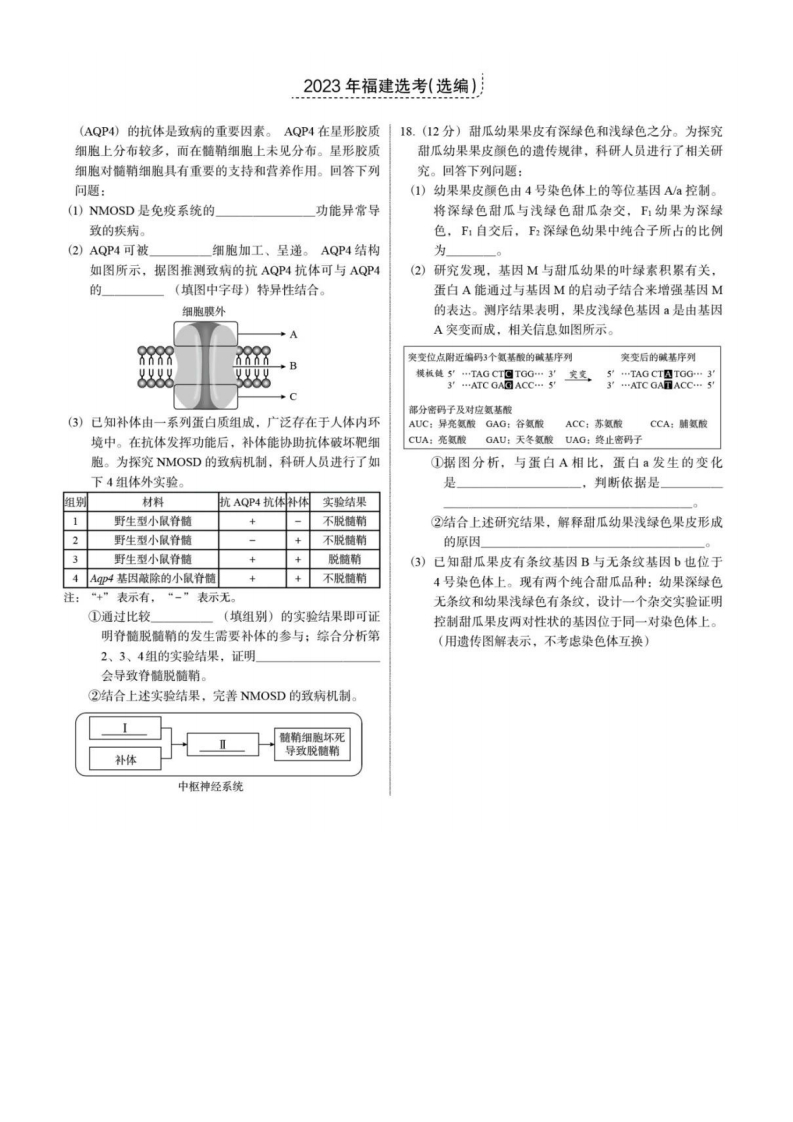 高中生物学真题全编2023年福建省普通高中学业水平选择性考试(选编)一、单项选择题:在每小题给出的四个选项中,只有一项是最B.玉米驯化过程中,人工选择决定了玉米的进化方向符合题目要求的。C.杂交产生的不同变异类型增加了玉米的遗传多样性1.糖类和脂肪在细胞生命活动中都具有重要作用。下列相D.玉米驯化过程没有产生新物种,基因频率没有改变关叙述错误的是(7.柳穿鱼花的形态结构与L℃基因的表达直接相关。植株A.糖类是生命活动的主要能源物质a的Lc℃基因在开花时表达,花形态为两侧对称:植株B.脂肪是动物细胞良好的储能物质b的LcyC基因被高度甲基化,花形态为辐射对称。下列C.等质量的脂肪比糖类含能量更多相关叙述正确的是(D.糖类和脂肪都是由单体连接而成A.Leyc在植株a和b中的复制方式不同2.随着社会经济的发展,人们对健康的生活方式日益关B.植株a和b中Lcc的碱基序列不同注。下列相关叙述正确的是(CLcc在植株a和b的花中转录水平相同A.鸡蛋煮熟后蛋白质会发生变性,不利于人体消化D.Lcyc的甲基化模式可传给子代细胞B.补充某些特定的核酸,可以增强机体修复受损基因的8.为探究植物生长调节剂对橄榄生长的影响,科研人员分能力别用不同浓度的咧噪丁酸(IBA)和萘乙酸(NAA)对C.长期吸烟,原癌基因和抑癌基因表达的稳态易受到橄榄幼苗根系进行不同时长的浸泡处理。移栽一段时间破坏后,测定生长指标,部分结果如图所示D.饭后剧烈运动时副交感神经活动占优势,不利于胃肠3.5▣1h▣3h■5h的蠕动3.03.生物学研究常运用特定的科学方法来阑释生命现象及规2.5律。下列科学方法与对应的应用不相符的是(2.0选项科学方法应用A完全归纳法细胞学说的建立1.5B假说一演绎法孟德尔两大遗传定律的发现C建构模型研究种群数量的变化规律D预实验探索生长素类调节剂促进插条生根的最适浓度054.关于“DNA片段的扩增及电泳鉴定”(实验I)和对照低浓度高浓度低浓度高浓度“DNA的粗提取与鉴定”(实验Ⅱ)的实验操作,下IBANAA列相关叙述正确的是(下列相关叙述错误的是()A.实验I中,PCR实验所需的移液器、枪头、蒸瘤水A.对照组应采用未添加植物生长调节剂的清水对橄榄幼等必须进行高压灭菌处理苗根系进行浸泡B.实验I中,将扩增得到的PCR产物进行凝胶电泳,B.低浓度BA处理时,延长浸泡时间会抑制幼苗地上部加样前应先接通电源分鲜重的积累C.实验Ⅱ中,取洋葱研磨液的上清液,加人等体积冷酒C.相同浓度浸泡1h的情况下,NAA促进地上部分生精后析出粗提取的DNA长的效果优于BAD,实验Ⅱ中,将白色丝状物直接加入到二苯胺试剂中并D.用高浓度BA或NAA处理时,适当缩短浸泡时间有进行沸水浴,用于鉴定DNA利于地上部分生长5.从基因型为AaBb的母羊输卵管中采集卵子进行体外受9.LRRK2是一种内质网膜上的蛋白质。LRRK2基因在人精,被激活的卵子排出的第二极体的基因组成是aB,成纤维细胞中被啵除后,导致细胞内蛋白P在内质网腔则该卵子及其对应的初级卵母细胞的基因组成分别是大量积聚,而培养液中的蛋白P含量显著降低。下列相关叙述错误的是()A.AAbb AAaaBBbbB.aaBB AaBbA蛋白P以边合成边转运的方式由核糖体进人内质网腔C.aaBB AAaaBBbbD.AAbb AaBbB.线粒体通过有氧呼吸参与了蛋白P在细胞内的合成6.玉米由类玉米逐步驯化而来。用人工方法将玉米和类C.LRRK2蛋白的主要功能是维持蛋白P在细胞质内的正玉米进行杂交,能产生可育后代。不同玉米种群间杂常合成交,能产生丰富的变异类型。下列相关叙述错误的是D.积累在内质网腔的蛋白P与培养液中的蛋白P结构不同A.某玉米种群含有的全部基因构成了该种群的基因库10.一位高血压患者清晨突发右侧手臂和腿部无力麻木,说2522023年福建选考(选编)话含糊不清,且听不懂别人说话,并出现尿失禁等症做有氧运动状。经医生诊斯,该患者发生了脑卒中,脑部血管阻13.肌细胞质基质中Ca*浓度升高将引起肌收缩。静息状态塞,但脑干、脊髓和脊神经等未受损。下列相关叙述错下,肌细胞质基质Ca“浓度极低,此时胞内Ca“主要存误的是(储于肌质网中(一种特殊的内质网)。肌质网膜上存在A该患者大脑左半球S区和H区因缺血造成损伤一种Ca载体,能催化水解ATP实现Ca逆浓度跨膜B.该患者大脑左半球第一运动区的上部因缺血造成损伤运输。该载体转运过程中的两个状态(E1和E2)如图C.为减少脑卒中发生,高血压人群应避免过多摄入钠盐所示。D,排尿反射受大脑皮层发出的交感神经和副交感神经共ElE2同调控0000Ca'11.全球气侯变暖是一个重要的生态问题。某地近海主要生0o0活着两种底栖植物海藻甲和乙。2001一2015年间,它们在海底礁石上的覆盖率变化趋势如图所示,2010年后UUUUVVV肌质网膜该海城海水平均温度有一定上升。1000080甲(大型海藻》下列相关叙述错误的是(A.该载体对Ca的转运过程利用了ATP水解所释放的60能量是40B.E2中该载体通过构象变化向细胞质基质运输Ca”导致肌收缩20乙(小型海藻)C,若该载体数量不足或功能减弱可导致肌收缩的停止发0+一中年生异常200020032006200920122015D.随着待转运Ca“浓度的增加,该载体的运输速率先增下列相关叙述错误的是(加后稳定A.升温改变种群密度,海藻乙有一段时间呈指数增长14.干细胞治疗骨缺损的临床治疗提供了新思路。为探究不B.升温改变乙生态位,甲数量骤降后应实施就地保护同细胞共培养对脂肪干细胞分化为