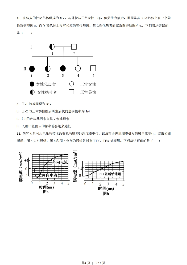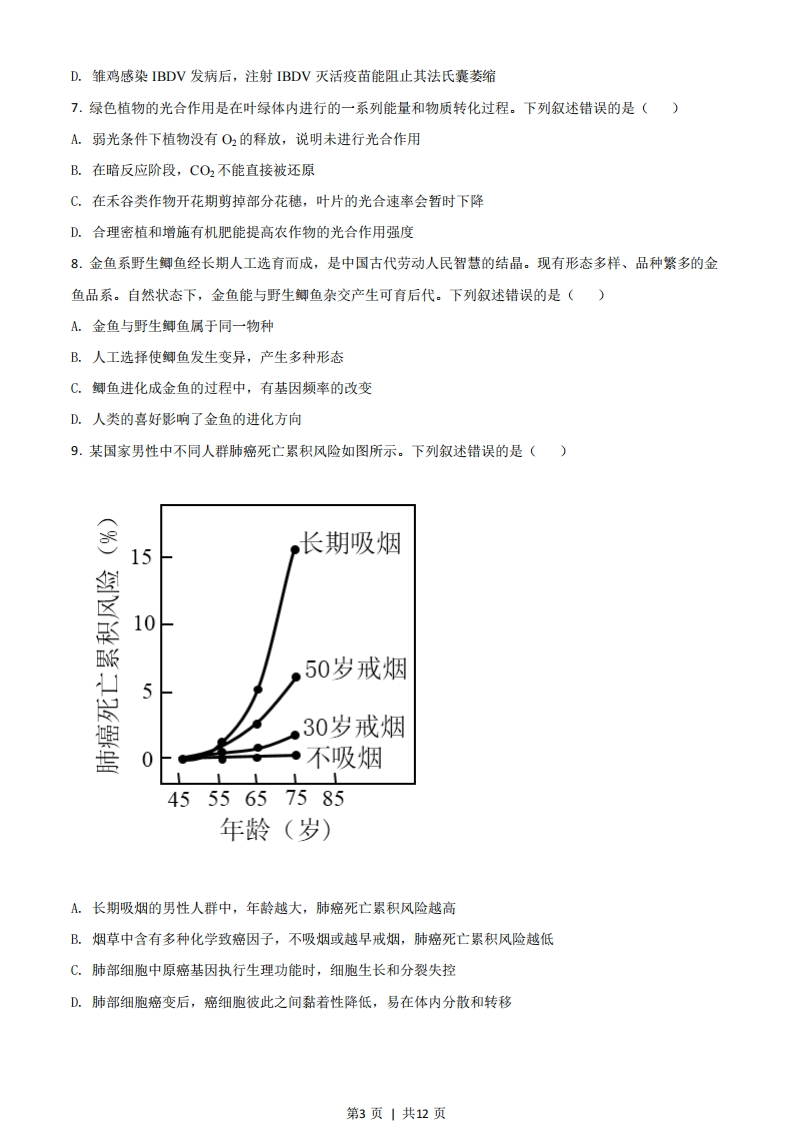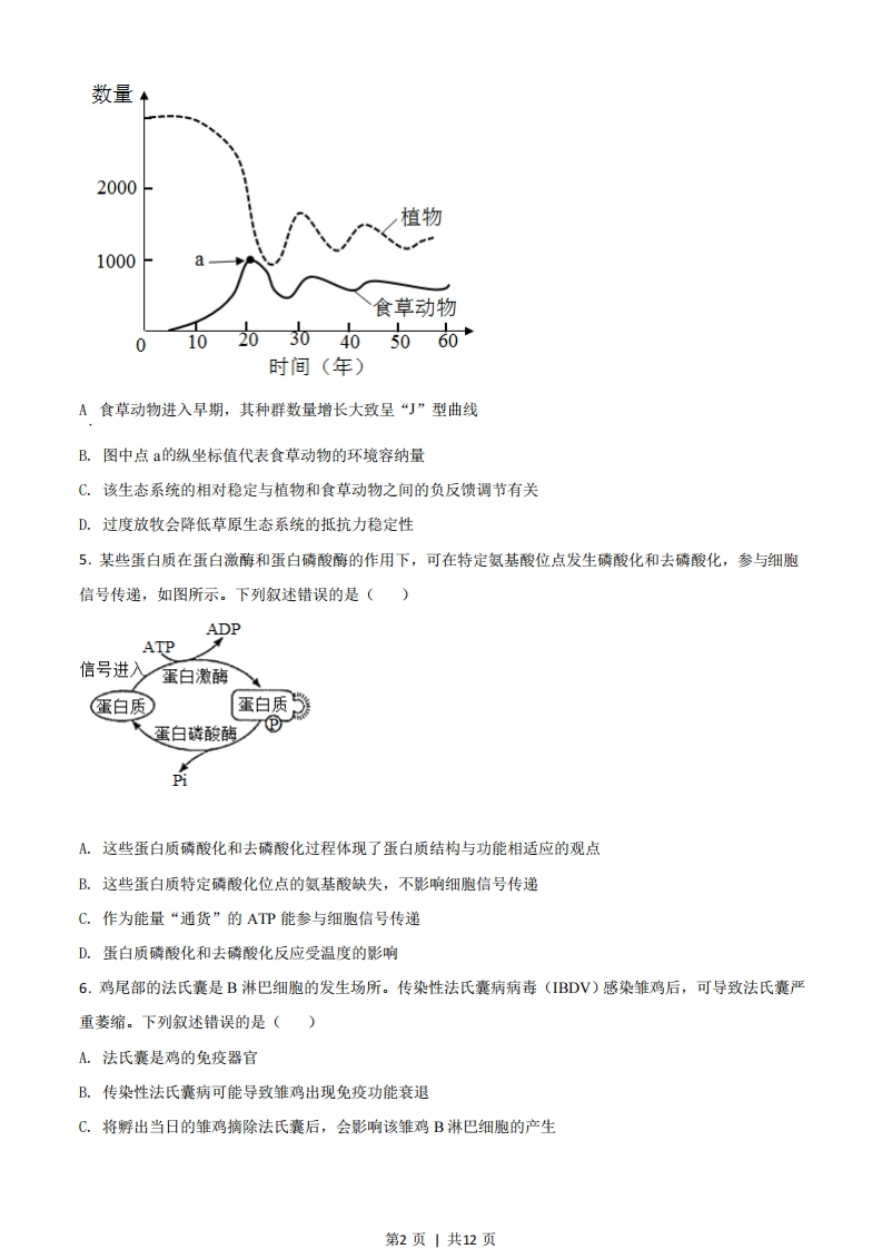 湖南省2021年普通高中学业水平选择性考试生物一、选择题1.关于下列微生物的叙述,正确的是()A.蓝藻细胞内含有叶绿体,能进行光合作用B.酵母菌有细胞壁和核糖体,属于单细胞原核生物C.破伤风杆菌细胞内不含线粒体,只能进行无氧呼吸D.支原体属于原核生物,细胞内含有染色质和核糖体2.以下生物学实验的部分操作过程,正确的是()实验名称实验操作A检测生物组织中的还原糖在待测液中先加NaOH溶液,再加CuSOa溶液夕观察细胞中DNA和RNA的分布先加甲基绿染色,再加吡罗红染色C观察细胞中的线粒体先用盐酸水解,再用健那绿染色D探究酵母菌种群数量变化先将盖玻片放在计数室上,再在盖玻片边缘滴加培养液A.AB.BC.CD.D3.质壁分离和质壁分离复原是某些生物细胞响应外界水分变化而发生的渗透调节过程。下列叙述错误的是()A.施肥过多引起的“烧苗”现象与质壁分离有关B.质壁分离过程中,细胞膜可局部或全部脱离细胞壁C.质壁分离复原过程中,细胞的吸水能力逐渐降低D.1mol/L NaCl溶液和1moL蔗糖溶液的渗透压大小相等4.某草原生态系统中植物和食草动物两个种群数量的动态模型如图所示。下列叙述错误的是()第1页|共12页数量+2000-植物1000a食草动物0102030405060·时间(年)A食草动物进入早期,其种群数量增长大致呈“丁”型曲线B.图中点a的纵坐标值代表食草动物的环境容纳量C.该生态系统的相对稳定与植物和食草动物之间的负反馈调节有关D.过度放牧会降低草原生态系统的抵抗力稳定性5.某些蛋白质在蛋白激酶和蛋白磷酸酶的作用下,可在特定氨基酸位点发生磷酸化和去磷酸化,参与细胞信号传递,如图所示。下列叙述错误的是()ADPATP信号进入蛋白激酶蛋白质蛋白质中蛋白磷酸酶☑⑧A.这些蛋白质磷酸化和去磷酸化过程体现了蛋白质结构与功能相适应的观点B.这些蛋白质特定磷酸化位点的氨基酸缺失,不影响细胞信号传递C.作为能量“通货”的ATP能参与细胞信号传递D.蛋白质磷酸化和去磷酸化反应受温度的影响6.鸡尾部的法氏囊是B淋巴细胞的发生场所。传染性法氏囊病病毒(IBDV)感染雏鸡后,可导致法氏囊严重萎缩。下列叙述错误的是()A.法氏囊是鸡的免疫器官B.传染性法氏囊病可能导致雏鸡出现免疫功能衰退C.将孵出当日的雏鸡摘除法氏囊后,会影响该雏鸡B淋巴细胞的产生第2页|共12页D.雏鸡感染IBDV发病后,注射IBDV灭活疫苗能阻止其法氏囊萎缩7.绿色植物的光合作用是在叶绿体内进行的一系列能量和物质转化过程。下列叙述错误的是()A.弱光条件下植物没有O2的释放,说明未进行光合作用B.在暗反应阶段,CO2不能直接被还原C.在禾谷类作物开花期剪掉部分花穗,叶片的光合速率会暂时下降D.合理密植和增施有机肥能提高农作物的光合作用强度8.金鱼系野生鲫鱼经长期人工选育而成,是中国古代劳动人民智慧的结晶。现有形态多样、品种繁多的金鱼品系。自然状态下,金鱼能与野生鲫鱼杂交产生可育后代。下列叙述错误的是()A.金鱼与野生鲫鱼属于同一物种B.人工选择使鲫鱼发生变异,产生多种形态C.鲫鱼进化成金鱼的过程中,有基因频率的改变D.人类的喜好影响了金鱼的进化方向9.某国家男性中不同人群肺癌死亡累积风险如图所示。下列叙述错误的是()(5长期吸烟151050岁戒烟530岁戒烟一不吸烟4555657585年龄(岁)A.长期吸烟的男性人群中,年龄越大,肺癌死亡累积风险越高B.烟草中含有多种化学致癌因子,不吸烟或越早戒烟,肺癌死亡累积风险越低C.肺部细胞中原癌基因执行生理功能时,细胞生长和分裂失控D.肺部细胞癌变后,癌细胞彼此之间黏着性降低,易在体内分散和转移第3页1共12页