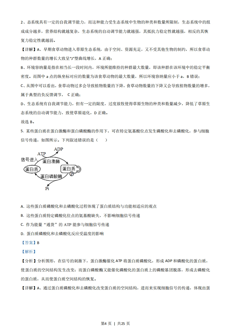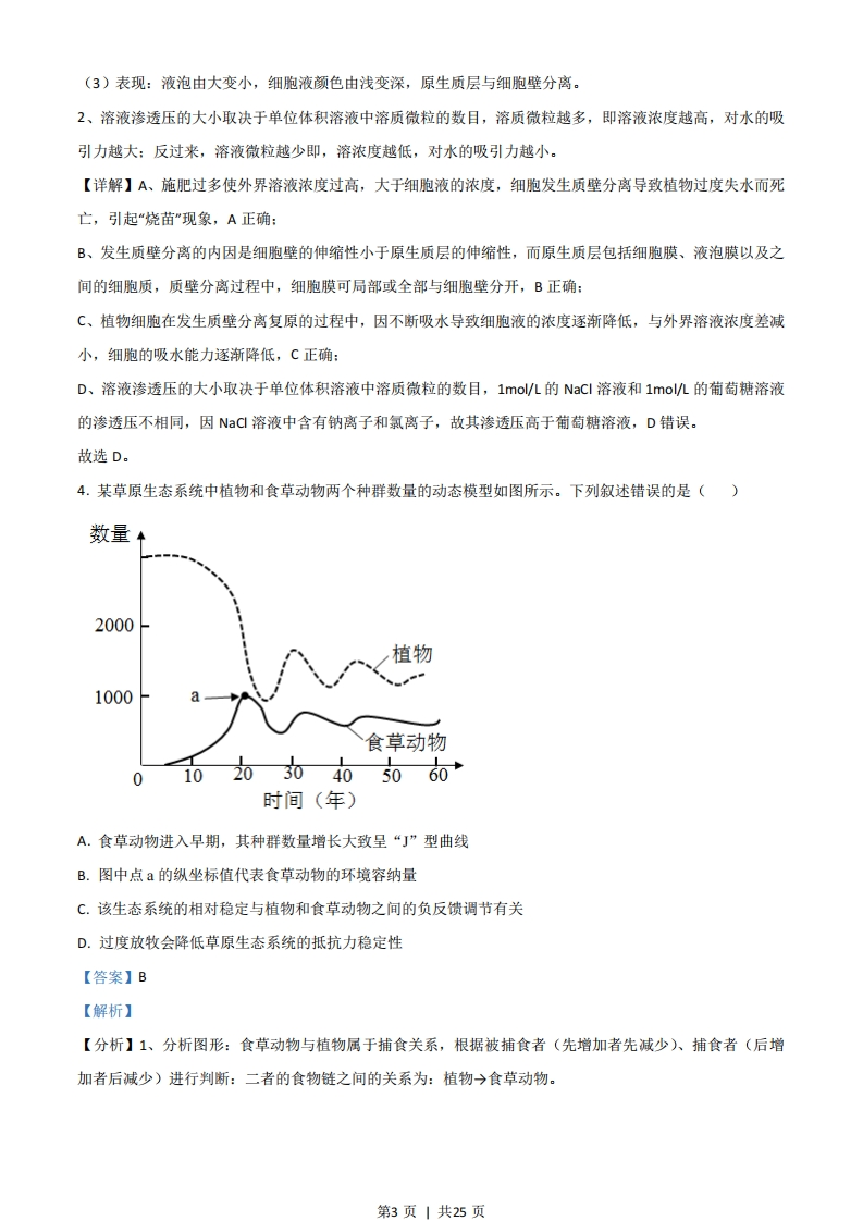 湖南省2021年普通高中学业水平选择性考试生物一、选择题1.关于下列微生物的叙述,正确的是()A.蓝藻细胞内含有叶绿体,能进行光合作用B.酵母菌有细胞壁和核糖体,属于单细胞原核生物C.破伤风杆菌细胞内不含线粒体,只能进行无氧呼吸D.支原体属于原核生物,细胞内含有染色质和核糖体【答案】C【解析】【分析】1、原核细胞和真核细胞最主要的区别就是原核细胞没有核膜包被的典型细胞核,原核细胞具有细胞壁、细胞膜、细胞质、核糖体、拟核以及遗传物质DNA等。2、蓝藻、破伤风杆菌、支原体属于原核生物,原核生物只有核糖体一种细胞器。【详解】A、蓝藻属于原核生物,原核细胞中没有叶绿体,但含有藻蓝素和叶绿素,能够进行光合作用,A错误:B、酵母菌属于真核生物中的真菌,有细跑壁和核糖体,B错误:C、破伤风杆菌属于原核生物,原核细胞中没有线粒体。破伤风杆菌是厌氧微生物,只能进行无氧呼吸,C正确:D、支原体属于原核生物,没有核膜包被的细胞核,仅含有核糖体这一种细胞器,拟核内DNA裸露,无染色质,D错误。故选C。2.以下生物学实验的部分操作过程,正确的是()实验名称实验操作Y检测生物组织中的还原糖在待测液中先加NaOH溶液,再加CuSO4溶液B观察细胞中DNA和RNA的分布先加甲基绿染色,再加吡罗红染色C观察细胞中的线粒体先用盐酸水解,再用健那绿染色D探究酵母菌种群数量变化先将盖玻片放在计数室上,再在盖玻片边缘滴加培养液第1页1共25页A.AB.BC.CD.D【答案】D【解析】【分析】1、斐林试剂是由甲液(0.1g/mL氢氧化钠溶液)和乙液(0.05g/mL硫酸铜溶液)组成,用于鉴定还原糖,使用时要将甲液和乙液混合均匀后再加入含样品的试管中,且需水浴加热:双缩脲试剂由A液(0.1g/mL氢氧化钠溶液)和B液(0.01g/mL硫酸铜溶液)组成,用于鉴定蛋白质,使用时要先加A液后再加入B液。2、健那绿染液是专一性染线粒体的活细胞染料,可以使活细胞中线粒体呈现蓝绿色。3、甲基绿和吡罗红两种染色剂对DNA和RNA的亲和力不同,甲基绿使DNA呈现绿色,吡罗红使RNA呈现红色.利用甲基绿、吡罗红混合染色剂将细胞染色,可显示DNA和RNA在细胞中的分布。4、探究培养液中酵母菌种群数量的变化实验中,使用血细胞计数板记数前,先将盖玻片放在计数室上,用吸管吸取培养液,滴于盖玻片边缘,让其自行渗入。【详解】A、检测生物组织中的还原糖使用斐林试剂。斐林试剂在使用时,需将NaOH溶液和CuSO4溶液混合后再加入到待测样品中,A错误:B、利用甲基绿吡罗红混合染色剂对细胞染色,由于甲基绿和吡罗红两种染色剂对DNA和RNA的亲和力不同,可显示DNA和RNA在细胞中的分布,B错误:C、健那绿是专一性染线粒体的活细胞染料,因此观察线粒体时不需要用盐酸水解,C错误:D、用抽样检测法调查酵母菌种群数量变化的实验中,应先将盖玻片放在计数室上,将培养液滴于盖玻片边缘,让培养液自行渗入后,吸取多余的培养液后即可镜检开始计数,D正确。故选D。3.质壁分离和质壁分离复原是某些生物细胞响应外界水分变化而发生的渗透调节过程。下列叙述错误的是()A.施肥过多引起的“烧苗”现象与质壁分离有关B.质壁分离过程中,细胞膜可局部或全部脱离细胞壁C.质壁分离复原过程中,细胞的吸水能力逐渐降低D.1 nol/L NaCl溶液和1mol/L蔗糖溶液的渗透压大小相等【答案】D【解析】【分析】1、质壁分离的原因分析:(1)外因:外界溶液浓度>细胞液浓度:(2)内因:原生质层相当于一层半透膜,细胞壁的伸缩性小于原生质层:第2页|共25页(3)表现:液泡由大变小,细胞液颜色由浅变深,原生质层与细胞壁分离。2、溶液渗透压的大小取决于单位体积溶液中溶质微粒的数目,溶质微粒越多,即溶液浓度越高,对水的吸引力越大:反过来,溶液微粒越少即,溶浓度越低,对水的吸引力越小。【详解】A、施肥过多使外界溶液浓度过高,大于细胞液的浓度,细胞发生质壁分离导致植物过度失水而死亡,引起“烧苗“现象,A正确:B、发生质壁分离的内因是细胞壁的伸缩性小于原生质层的伸缩性,而原生质层包括细胞膜、液泡膜以及之间的细胞质,质壁分离过程中,细胞膜可局部或全部与细胞壁分开,B正确:C、植物细胞在发生质壁分离复原的过程中,因不断吸水导致细胞液的浓度逐渐降低,与外界溶液浓度差减小,细胞的吸水能力逐渐降低,C正确:D、溶液渗透压的大小取决于单位体积溶液中溶质微粒的数目,1mol/L的NaC1溶液和1mol/L的葡萄糖溶液的渗透压不相同,因Nd溶液中含有钠离子和氯离子,故其渗透压高于葡萄糖溶液,D错误。故选D。4.某草原生态系统中植物和食草动物两个种群数量的动态模型如图所示。下列叙述错误的是()数量+2000-植物1000食草动物0102030405060时间(年)A.食草动物进入早期,其种群数量增长大致呈“J”型曲线B.图中点a的纵坐标值代表食草动物的环境容纳量C.该生态系统的相对稳定与植物和食草动物之间的负反馈调节有关D.过度放牧会降低草原生态系统的抵抗力稳定性【答案】B【解析】【分析】1、分析图形:食草动物与植物属于捕食关系,根据被捕食者(先增加者先减少)、捕食者(后增加者后减少)进行判断:二者的食物链之间的关系为:植物→食草动物。第3页|共25页