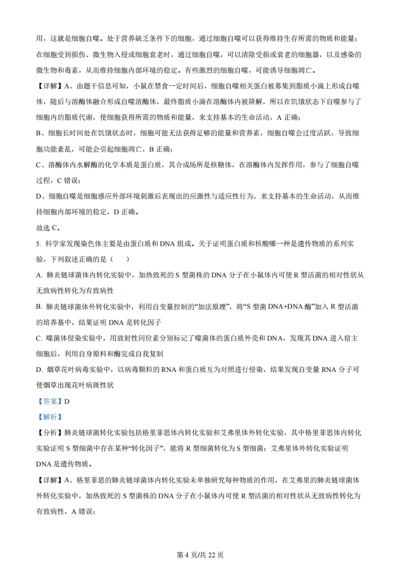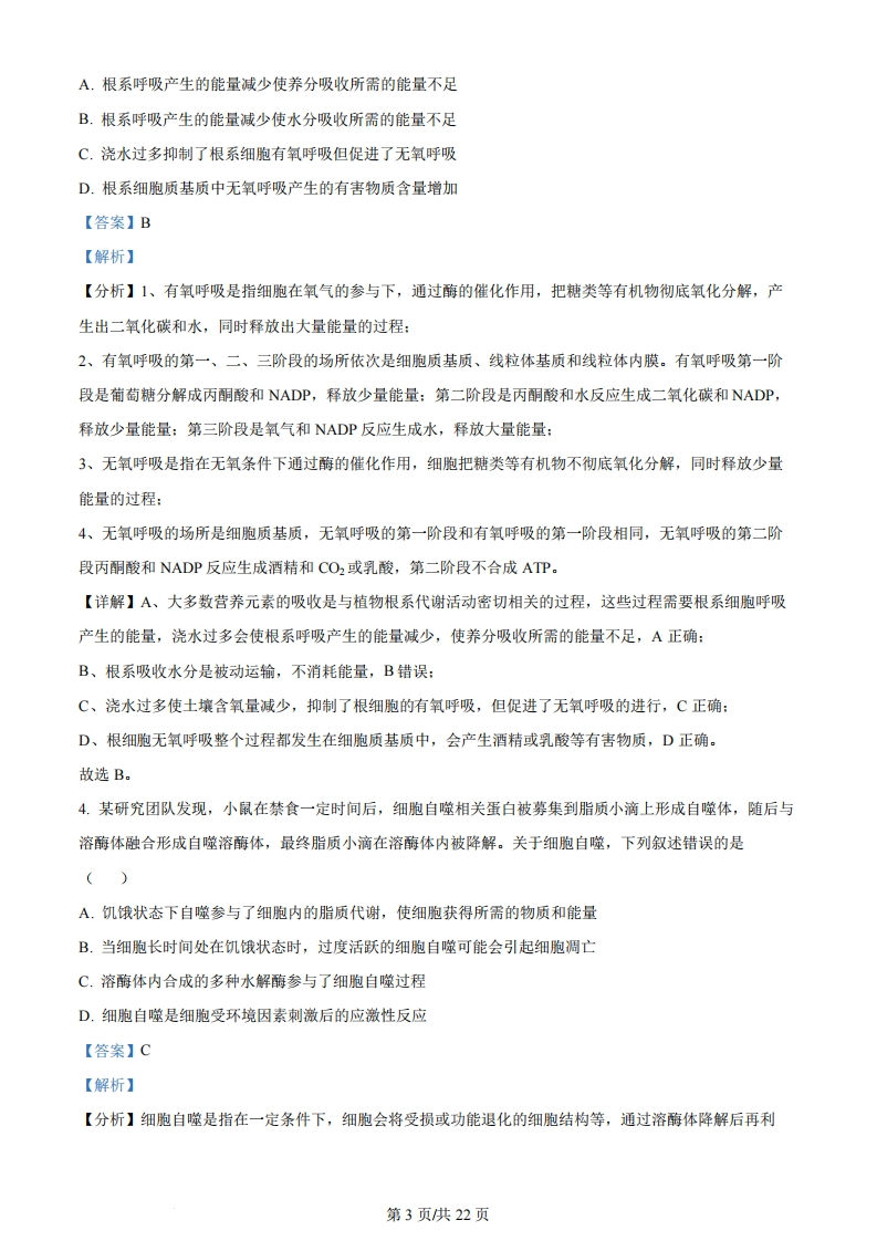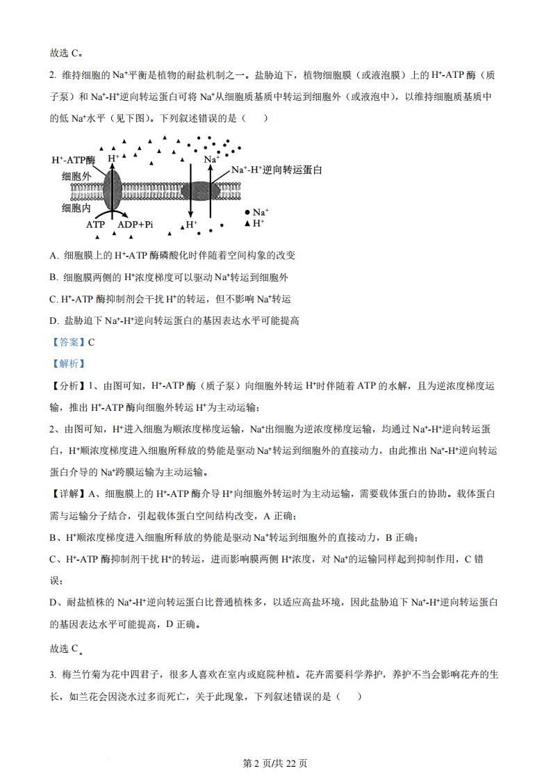 2024年甘肃省普通高校招生统一考试生物学注意事项:1答卷前,考生务必将自已的姓名、准考证号填写在答题卡上。2.回答选择题时,选出每小题答案后,用2B铅笔把答题卡上对应题目的答案标号框涂黑。如需改动,用橡皮擦干净后,再选涂其它答案标号框。回答非选择题时,将答案写在答题卡上。写在本试卷上无效。3.考试结束后,将本试卷和答题卡一并交回。一、选择题:本题共16小题,每小题3分,共48分。在每小题给出的四个选项中,只有一项是符合题目要求的。1.甘肃陇南的“武都油橄榄”是中国国家地理标志产品,其果肉呈黄绿色,子叶呈乳白色,均富含脂肪。由其生产的橄榄油含有丰富的不饱和脂肪酸,可广泛用于食品、医药和化工等领域。下列叙述错误的是()A.不饱和脂肪酸的熔点较低,不容易凝固,橄榄油在室温下通常呈液态B.苏丹Ⅲ染液处理油橄榄子叶,在高倍镜下可观察到橘黄色的脂肪颗粒C.油橄榄种子萌发过程中有机物的含量减少,有机物的种类不发生变化D.脂肪在人体消化道内水解为脂肪酸和甘油后,可被小肠上皮细胞吸收【答案】C【解析】【分析】脂肪是由三分子脂肪酸与一分子甘油发生反应而形成的酯,即三酰甘油(又称甘油三酯)。其中甘油的分子比较简单,而脂肪酸的种类和分子长短却不相同。脂肪酸可以是饱和的,也可以是不饱和的。植物脂肪大多含有不饱和脂肪酸,在室温时呈液态:大多数动物脂肪含有饱和脂肪酸,室温时呈固态。【详解】A、植物脂肪大多含有不饱和脂肪酸,不饱和脂肪酸的熔点较低,不容易凝固,橄榄油含有丰富的不饱和脂肪酸,在室温下通常呈液态,A正确:B、油橄榄子叶富含脂肪,脂肪可被苏丹Ⅲ染液染成橘黄色,因此在高倍镜下可观察到橘黄色的脂肪颗粒,B正确:C、油橄榄种子萌发过程中由于细胞呼吸的消耗,有机物的总量减少,但由于发生了有机物的转化,故有机物的种类增多,C错误:D、脂肪是由三分子脂肪酸与一分子甘油发生反应而形成的酯,脂肪在人体消化道内水解为脂肪酸和甘油后,可被小肠上皮细胞吸收,D正确。第1页供22页故选C。2.维持细胞的Na+平衡是植物的耐盐机制之一。盐胁迫下,植物细胞膜(或液泡膜)上的H中ATP酶(质子泵)和NaH逆向转运蛋白可将Na*从细胞质基质中转运到细胞外(或液泡中),以维持细胞质基质中的低Na+水平(见下图)。下列叙述错误的是()H+-ATP酶H*Na细胞外Na*-H*逆向转运蛋白17M7Y题从细胞内●NaATP ADP+PiH▲H4A.细胞膜上的H+ATP酶磷酸化时伴随着空间构象的改变B.细胞膜两侧的H浓度梯度可以驱动Na转运到细胞外C.H-ATP酶抑制剂会干扰H的转运,但不影响Na转运D.盐胁迫下NaH逆向转运蛋白的基因表达水平可能提高【答案】C【解析】【分析】1、由图可知,HATP酶(质子泵)向细胞外转运H时伴随着ATP的水解,且为逆浓度梯度运输,推出H中ATP酶向细胞外转运H为主动运输:2、由图可知,Ht进入细胞为顺浓度梯度运输,Na*出细胞为逆浓度梯度运输,均通过Na-Ht逆向转运蛋白,H+顺浓度梯度进入细胞所释放的势能是驱动Na*转运到细胞外的直接动力,由此推出NaH+逆向转运蛋白介导的Na跨膜运输为主动运输。【详解】A、细胞膜上的H+-ATP酶介导H向细胞外转运时为主动运输,需要载体蛋白的协助。载体蛋白需与运输分子结合,引起载体蛋白空间结构改变,A正确:B、H顺浓度梯度进入细胞所释放的势能是驱动Na转运到细胞外的直接动力,B正确:C、H+-ATP酶抑制剂干扰H的转运,进而影响膜两侧H浓度,对Na*的运输同样起到抑制作用,C错误:D、耐盐植株的Na*-Ht逆向转运蛋白比普通植株多,以适应高盐环境,因此盐胁迫下Na*H逆向转运蛋白的基因表达水平可能提高,D正确。故选C。3.梅兰竹菊为花中四君子,很多人喜欢在室内或庭院种植。花卉需要科学养护,养护不当会影响花卉的生长,如兰花会因浇水过多而死亡,关于此现象,下列叙述错误的是()第2页供22页A.根系呼吸产生的能量减少使养分吸收所需的能量不足B.根系呼吸产生的能量减少使水分吸收所需的能量不足C.浇水过多抑制了根系细胞有氧呼吸但促进了无氧呼吸D.根系细胞质基质中无氧呼吸产生的有害物质含量增加【答案】B【解析】【分析】1、有氧呼吸是指细胞在氧气的参与下,通过酶的催化作用,把糖类等有机物彻底氧化分解,产生出二氧化碳和水,同时释放出大量能量的过程:2、有氧呼吸的第一、二、三阶段的场所依次是细胞质基质、线粒体基质和线粒体内膜。有氧呼吸第一阶段是葡萄糖分解成丙酮酸和NADP,释放少量能量:第二阶段是丙酮酸和水反应生成二氧化碳和NADP,释放少量能量:第三阶段是氧气和NADP反应生成水,释放大量能量:3、无氧呼吸是指在无氧条件下通过酶的催化作用,细胞把糖类等有机物不彻底氧化分解,同时释放少量能量的过程:4、无氧呼吸的场所是细胞质基质,无氧呼吸的第一阶段和有氧呼吸的第一阶段相同,无氧呼吸的第二阶段丙酮酸和NADP反应生成酒精和CO2或乳酸,第二阶段不合成ATP。【详解】A、大多数营养元素的吸收是与植物根系代谢活动密切相关的过程,这些过程需要根系细胞呼吸产生的能量,浇水过多会使根系呼吸产生的能量减少,使养分吸收所需的能量不足,A正确:B、根系吸收水分是被动运输,不消耗能量,B错误:C、浇水过多使土壤含氧量减少,抑制了根细胞的有氧呼吸,但促进了无氧呼吸的进行,C正确:D、根细胞无氧呼吸整个过程都发生在细胞质基质中,会产生酒