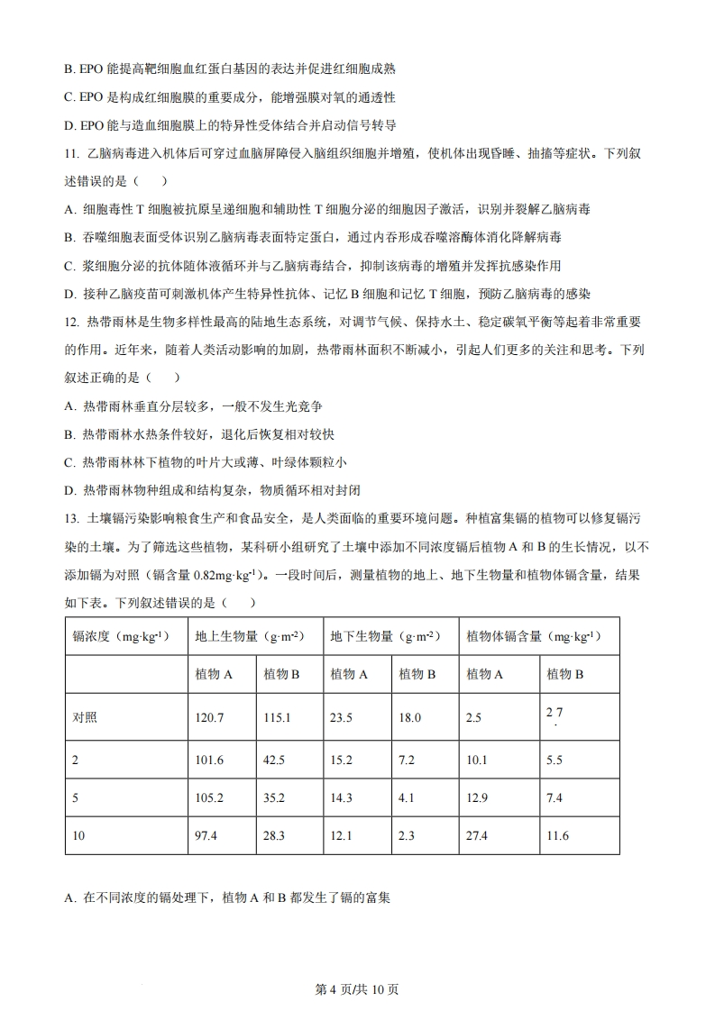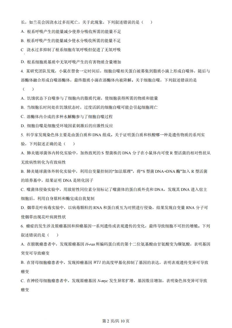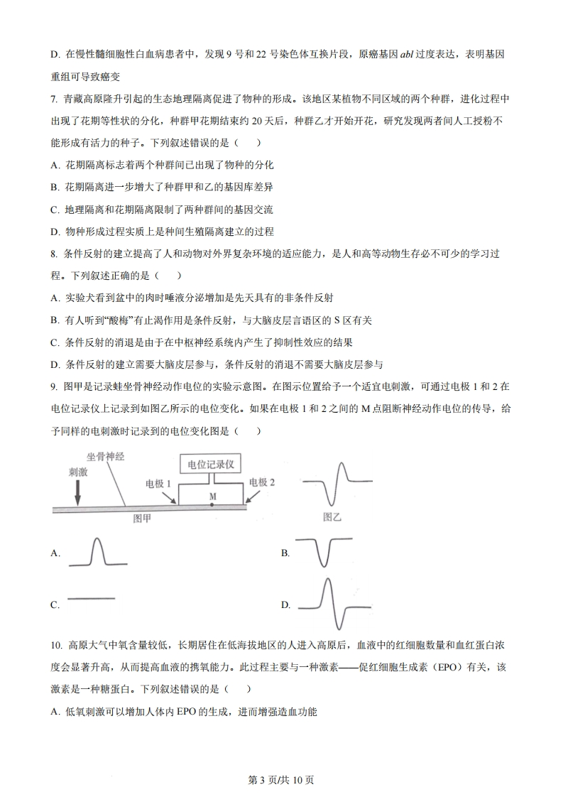2024年甘肃省普通高校招生统一考试生物学注意事项:1答卷前,考生务必将自已的姓名、准考证号填写在答题卡上。2.回答选择题时,选出每小题答案后,用2B铅笔把答题卡上对应题目的答案标号框涂黑。如需改动,用橡皮擦干净后,再选涂其它答案标号框。回答非选择题时,将答案写在答题卡上。写在本试卷上无效。3.考试结束后,将本试卷和答题卡一并交回。一、选择题:本题共16小题,每小题3分,共48分。在每小题给出的四个选项中,只有一项是符合题目要求的。1.甘肃陇南的“武都油橄榄”是中国国家地理标志产品,其果肉呈黄绿色,子叶呈乳白色,均富含脂肪。由其生产的橄榄油含有丰富的不饱和脂肪酸,可广泛用于食品、医药和化工等领域。下列叙述错误的是()A.不饱和脂肪酸的熔点较低,不容易凝固,橄榄油在室温下通常呈液态B.苏丹Ⅲ染液处理油橄榄子叶,在高倍镜下可观察到橘黄色的脂肪颗粒C.油橄榄种子萌发过程中有机物的含量减少,有机物的种类不发生变化D.脂肪在人体消化道内水解为脂肪酸和甘油后,可被小肠上皮细胞吸收2.维持细胞的Na+平衡是植物的耐盐机制之一。盐胁迫下,植物细胞膜(或液泡膜)上的HATP酶(质子泵)和NaH+逆向转运蛋白可将Na*从细胞质基质中转运到细胞外(或液泡中),以维持细胞质基质中的低Na*水平(见下图)。下列叙述错误的是()H+-ATP酶HNa细胞外Na*-H*逆向转运蛋白1HW3Y87277馆题从因细胞内◆NatATP ADP+Pi4H▲H●4A.细胞膜上的H+ATP酶磷酸化时伴随着空间构象的改变B.细胞膜两侧的H浓度梯度可以驱动Na转运到细胞外C.Ht-ATP酶抑剂会干扰H的转运,但不影响Na转运D.盐胁迫下NaH逆向转运蛋白的基因表达水平可能提高3.梅兰竹菊为花中四君子,很多人喜欢在室内或庭院种植。花卉需要科学养护,养护不当会影响花卉的生第1页供10页长,如兰花会因浇水过多而死亡,关于此现象,下列叙述错误的是()A.根系呼吸产生的能量减少使养分吸收所需的能量不足B.根系呼吸产生的能量减少使水分吸收所需的能量不足C浇水过多抑制了根系细胞有氧呼吸但促进了无氧呼吸D.根系细胞质基质中无氧呼吸产生的有害物质含量增加4.某研究团队发现,小鼠在禁食一定时间后,细胞自噬相关蛋白被募集到脂质小滴上形成自噬体,随后与溶酶体融合形成自噬溶酶体,最终脂质小滴在溶酶体内被降解。关于细胞自噬,下列叙述错误的是()A.饥饿状态下自噬参与了细胞内的脂质代谢,使细胞获得所需的物质和能量B.当细胞长时间处在饥饿状态时,过度活跃的细胞自噬可能会引起细胞调亡C.溶酶体内合成的多种水解酶参与了细胞自噬过程D.细胞自噬是细胞受环境因素刺激后的应激性反应5.科学家发现染色体主要是由蛋白质和DNA组成。关于证明蛋白质和核酸哪一种是遗传物质的系列实验,下列叙述正确的是()A.肺炎链球菌体内转化实验中,加热致死的S型菌株的DNA分子在小鼠体内可使R型活菌的相对性状从无致病性转化为有致病性B.肺炎链球菌体外转化实验中,利用自变量控制的“加法原理”,将“S型菌DNA+DNA酶加入R型活菌的培养基中,结果证明DNA是转化因子C.噬菌体侵染实验中,用放射性同位素分别标记了噬菌体的蛋白质外壳和DNA,发现其DNA进入宿主细胞后,利用自身原料和酶完成自我复制D.烟草花叶病毒实验中,以病毒颗粒的RNA和蛋白质互为对照进行侵染,结果发现自变量RNA分子可使烟草出现花叶病斑性状6.癌症的发生涉及原癌基因和抑癌基因一系列遗传或表观遗传的变化,最终导致细胞不可控的增殖。下列叙述错误的是()A.在膀胱癌患者中,发现原癌基因Hrs所编码蛋白质的第十二位氨基酸由甘氨酸变为缬氨酸,表明基因突变可导致癌变B.在肾母细胞瘤患者中,发现抑癌基因WT1的高度甲基化抑制了基因的表达,表明表观遗传变异可导致癌变C.在神经母细胞瘤患者中,发现原癌基因Nm沁发生异常扩增,基因数目增加,表明染色体变异可导致癌变第2页供10页D.在慢性髓细胞性白血病患者中,发现9号和22号染色体互换片段,原癌基因ab1过度表达,表明基因重组可导致癌变7.青藏高原隆升引起的生态地理隔离促进了物种的形成。该地区某植物不同区域的两个种群,进化过程中出现了花期等性状的分化,种群甲花期结束约20天后,种群乙才开始开花,研究发现两者间人工授粉不能形成有活力的种子。下列叙述错误的是()A.花期隔离标志着两个种群间已出现了物种的分化B.花期隔离进一步增大了种群甲和乙的基因库差异C.地理隔离和花期隔离限制了两种群间的基因交流D.物种形成过程实质上是种间生殖隔离建立的过程8.条件反射的建立提高了人和动物对外界复杂环境的适应能力,是人和高等动物生存必不可少的学习过程。下列叙述正确的是()A.实验犬看到盆中的肉时唾液分泌增加是先天具有的非条件反射B.有人听到“酸梅”有止渴作用是条件反射,与大脑皮层言语区的S区有关C.条件反射的消退是由于在中枢神经系统内产生了抑制性效应的结果D.条件反射的建立需要大脑皮层参与,条件反射的消退不需要大脑皮层参与9.图甲是记录蛙坐骨神经动作电位的实验示意图。在图示位置给予一个适宜电刺激,可通过电极1和2在电位记录仪上记录到如图乙所示的电位变化。如果在电极1和2之间的M点阻断神经动作电位的传导,给予同样的电刺激时记录到的电位变化图是()坐骨神经电位记录仪刺激电极1电极2M图甲图乙10.高原大