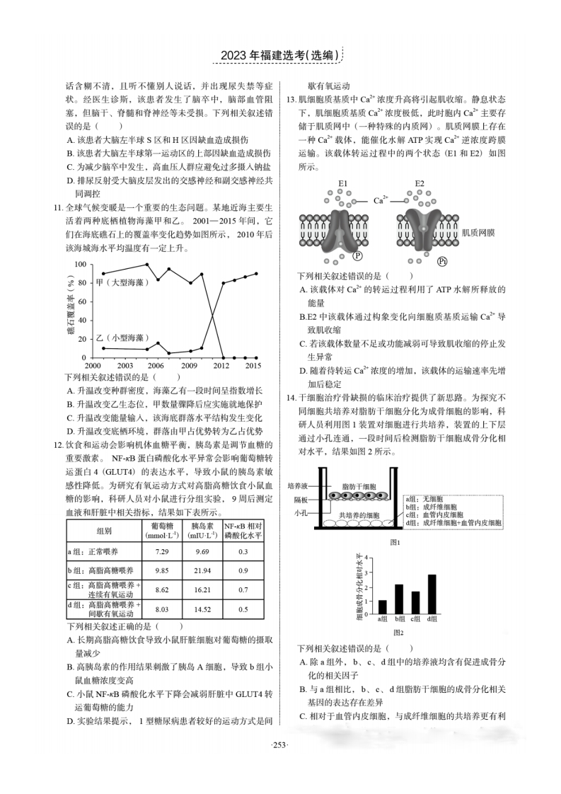 高中生物学真题全编2023年福建省普通高中学业水平选择性考试(选编)】一、单项选择题:在每小题给出的四个选项中,只有一项是最B.玉米驯化过程中,人工选择决定了玉米的进化方向符合题目要求的。C.杂交产生的不同变异类型增加了玉米的遗传多样性1.糖类和脂肪在细胞生命活动中都具有重要作用。下列相D.玉米驯化过程没有产生新物种,基因频率没有改变关叙述错误的是()7.柳穿鱼花的形态结构与L℃基因的表达直接相关。植株A.糖类是生命活动的主要能源物质a的LcC基因在开花时表达,花形态为两侧对称;植株B.脂肪是动物细胞良好的储能物质b的Lyc基因被高度甲基化,花形态为辐射对称。下列C.等质量的脂肪比糖类含能量更多相关叙述正确的是()D.糖类和脂肪都是由单体连接而成A.Lcc在植株a和b中的复制方式不同2.随着社会经济的发展,人们对健康的生活方式日益关B.植株a和b中Lcc的碱基序列不同注。下列相关叙述正确的是()C.Leyc在植株a和b的花中转录水平相同A.鸡蛋煮熟后蛋白质会发生变性,不利于人体消化D.Lcc的甲基化模式可传给子代细胞B.补充某些特定的核酸,可以增强机体修复受损基因的8.为探究植物生长调节剂对橄榄生长的影响,科研人员分能力别用不同浓度的咧噪丁酸(BA)和茶乙酸(NAA)对C.长期吸烟,原癌基因和抑癌基因表达的稳态易受到橄榄幼苗根系进行不同时长的浸泡处理,移栽一段时间破坏后,测定生长指标,部分结果如图所示。D.饭后剧烈运动时副交感神经活动占优势,不利于胃肠3.5▣1h▣3h■5h的蠕动3.03.生物学研究常运用特定的科学方法来阐释生命现象及规02.5律。下列科学方法与对应的应用不相符的是(2.0选网科学方法应用A完全归纳法细胞学说的建立1.5B假说一演绎法孟德尔两大遗传定律的发现C建构模型研究种群数量的变化规律D预实验探索生长素类调节剂促进插条生根的最适浓度0.54.关于“DNA片段的扩增及电泳鉴定”(实验I)和0对照低浓度高浓度低浓度高浓度“DNA的粗提取与鉴定”(实验Ⅱ)的实验操作,下IBANAA列相关叙述正确的是()下列相关叙述错误的是(A.实验I中,PCR实验所需的移液器、枪头、蒸馏水A.对照组应采用未添加植物生长调节剂的清水对橄榄幼等必须进行高压灭菌处理苗根系进行浸泡B.实验I中,将扩增得到的PCR产物进行凝胶电泳,B.低浓度BA处理时,延长浸泡时间会抑制幼苗地上部加样前应先接通电源分鲜重的积累C.实验Ⅱ中,取洋葱研磨液的上清液,加入等体积冷酒C.相同浓度浸泡1h的情况下,NAA促进地上部分生精后析出粗提取的DNA长的效果优于BAD.实验Ⅱ中,将白色丝状物直接加入到二苯胺试剂中并D.用高浓度BA或NAA处理时,适当缩短浸泡时间有进行沸水浴,用于鉴定DNA利于地上部分生长5.从基因型为AaB助的母羊输卵管中采集卵子进行体外受9.LRRK2是一种内质网膜上的蛋白质。LRRK2基因在人精,被激活的卵子排出的第二极体的基因组成是aB,成纤维细胞中被被除后,导致细胞内蛋白P在内质网腔则该卵子及其对应的初级卵母细胞的基因组成分别是大量积聚,而培养液中的蛋白P含量显著降低。下列相(关叙述错误的是()A.AAbb AAaaBBbbB.aaBB AaBbA蛋白P以边合成边转运的方式由核糖体进入内质网腔C.aaBB AAaaBBbbD.AAbb AaBbB.线粒体通过有氧呼吸参与了蛋白P在细胞内的合成6.玉米由类玉米逐步驯化而来。用人工方法将玉米和类C.LRRK2蛋白的主要功能是维持蛋白P在细胞质内的正玉米进行杂交,能产生可育后代。不同玉米种群间杂常合成交,能产生丰富的变异类型。下列相关叙述错误的是D.积累在内质网腔的蛋白P与培养液中的蛋白P结构不同A.某玉米种群含有的全部基因构成了该种群的基因库10.一位高血压患者清晨突发右侧手臂和腿部无力麻木,说2522023年福建选考(选编)话含糊不清,且听不懂别人说话,并出现尿失禁等定歇有氧运动状。经医生诊斯,该患者发生了脑卒中,脑部血管阻13,肌细胞质基质中Ca2浓度升高将引起肌收缩。静息状态塞,但脑干、脊髓和脊神经等未受损。下列相关叙述错下,肌细胞质基质Ca·浓度极低,此时胞内Ca2主要存误的是()储于肌质网中(一种特殊的内质网)。肌质网膜上存在A.该患者大脑左半球S区和H区因缺血造成损伤一种Ca“载体,能催化水解ATP实现Ca逆浓度跨膜B.该患者大脑左半球第一运动区的上部因缺血造成损伤运输。该载体转运过程中的两个状态(E1和E2)如图C.为减少脑卒中发生,高血压人群应避免过多摄入钠盐所示。D.排尿反射受大脑皮层发出的交感神经和副交感神经共E2同调控00011.全球气候变暖是一个重要的生态问题。某地近海主要生0o0活着两种底栖植物海藻甲和乙。2001一2015年间,它们在海底礁石上的覆盖率变化趋势如图所示,2010年后肌质网膜该海城海水平均温度有一定上升。10000下列相关叙述错误的是(80甲(大型海藻)】A.该载体对Ca2的转运过程利用了ATP水解所释放的家60能量G40B.E2中该载体通过构象变化向细胞质基质运输Ca导致肌收缩20乙(小型海藻)C.若该载体数量不足或功能减弱可导致肌收缩的停止发0◆一。生异常200020032006200920122015下列相关叙述错误的是(D.随着待转运Ca”浓度的增加,该载体的运输速率先增加后稳定A.升温改变种群密度,海藻乙有一段时间呈指数增长14.干细胞治疗骨缺损的临床治疗提供了新思路。为探究不B.升温改变乙生态位,甲数量骤降后应实施就地保护C.升温改变能量输人,该海底群落水平