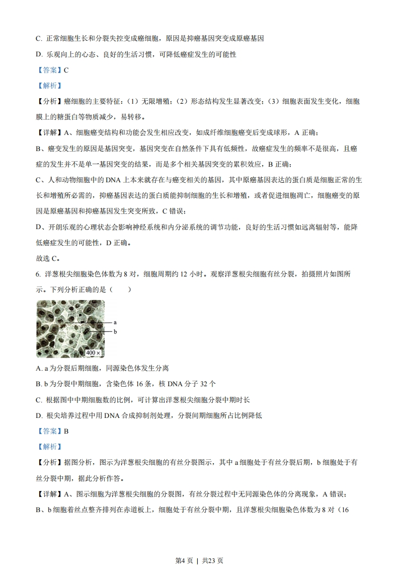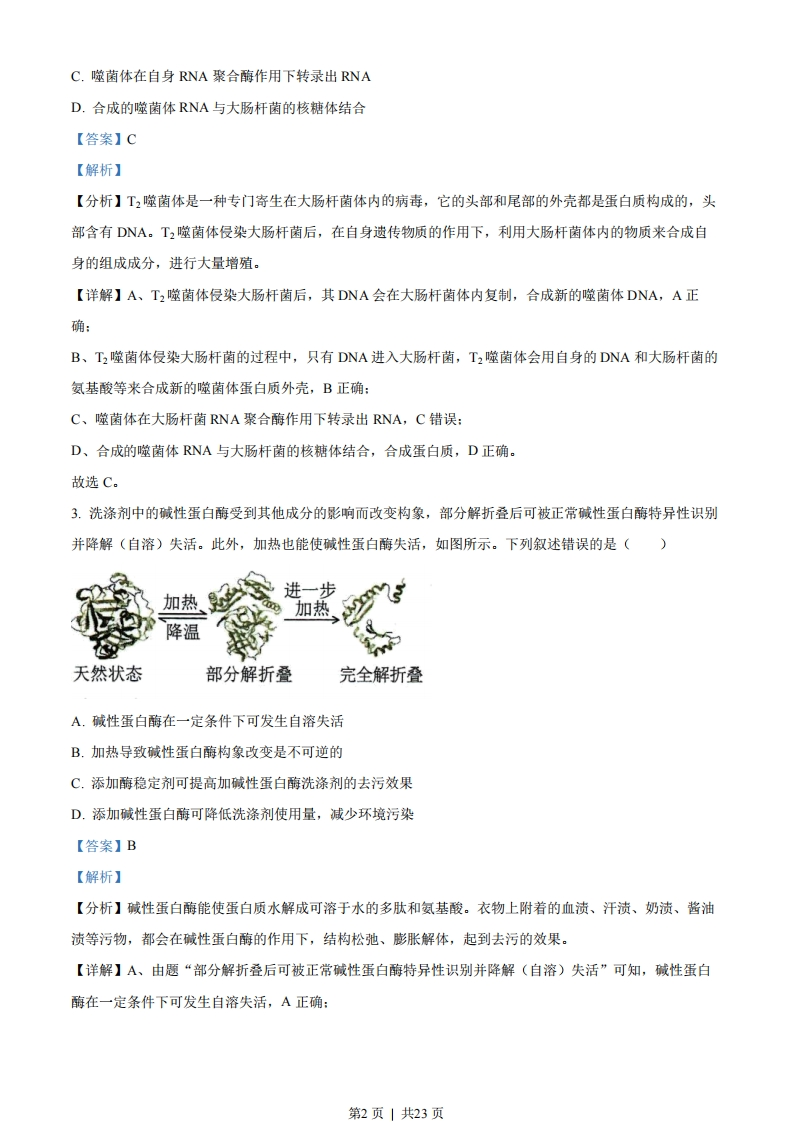 湖南省2022年普通高中学业水平选择性考试生物注意事项:1答卷前,考生务必将自己的姓名、准考证号填写在本试卷和答题卡上。2.回答选择题时,选出每小题答案后,用铅笔把答题卡上对应题目的答案标号涂黑。如需改动,用橡皮擦干净后,再选涂其他答案标号。回答非选择题时,将答案写在答题卡上。写在本试卷上无效。3.考试结束后,将本试卷和答题卡一并交回。一、选择题:本题共12小题,在每小题给出的四个选项中,只有一项是符合题目要求的。1.胶原蛋白是细胞外基质的主要成分之一,其非必需氨基酸含量比蛋清蛋白高。下列叙述正确的是()A.胶原蛋白的氮元素主要存在于氨基中B.皮肤表面涂抹的胶原蛋白可被直接吸收C.胶原蛋白的形成与内质网和高尔基体有关D.胶原蛋白比蛋清蛋白的营养价值高【答案】C【解析】【分析】蛋白质是以氨基酸为基本单位构成的生物大分子,氨基酸结构特点是至少含有一个氨基和一个羧基,并且都有一个氨基和羧基连接在同一个碳原子上。氨基酸通过脱水缩合反应形成蛋白质,氨基酸脱水缩合反应时,一个氨基酸的氨基与另一个氨基酸的羧基反应脱去一分子水。【详解】A、蛋白质的氮元素主要存在于肽键中,A错误:B、胶原蛋白为生物大分子物质,涂抹于皮肤表面不能被直接吸收,B错误:C、内质网是蛋白质的合成、加工场所和运输通道,高尔基体主要是对来自内质网的蛋白质进行加工、分类和包装,胶原蛋白的形成与核糖体、内质网、高尔基体有关,C正确:D、由题胶原蛋白非必需氨基酸含量比蛋清蛋白高,而人体需要从食物中获取必需氨基酸,非必需氨基酸自身可以合成,因此并不能说明胶原蛋白比蛋清蛋白的营养价值高,D错误。故选C。2.T2噬菌体侵染大肠杆菌的过程中,下列哪一项不会发生()A.新的噬菌体DNA合成B.新的噬菌体蛋白质外壳合成第1页」共23页C.噬菌体在自身RNA聚合酶作用下转录出RNAD.合成的噬菌体RNA与大肠杆菌的核糖体结合【答案】C【解析】【分析】T2噬菌体是一种专门寄生在大肠杆菌体内的病毒,它的头部和尾部的外壳都是蛋白质构成的,头部含有DNA。T2噬菌体侵染大肠杆菌后,在自身遗传物质的作用下,利用大肠杆菌体内的物质来合成自身的组成成分,进行大量增殖。【详解】A、T2噬菌体侵染大肠杆菌后,其DNA会在大肠杆菌体内复制,合成新的噬菌体DNA,A正确:B、T2噬菌体侵染大肠杆菌的过程中,只有DNA进入大肠杆菌,T2噬菌体会用自身的DNA和大肠杆菌的氨基酸等来合成新的噬菌体蛋白质外壳,B正确:C、噬菌体在大肠杆菌RNA聚合酶作用下转录出RNA,C错误:D、合成的噬菌体RNA与大肠杆菌的核糖体结合,合成蛋白质,D正确。故选C。3.洗涤剂中的碱性蛋白酶受到其他成分的影响而改变构象,部分解折叠后可被正常碱性蛋白酶特异性识别并降解(自溶)失活。此外,加热也能使碱性蛋白酶失活,如图所示。下列叙述错误的是()一步加热加热降温天然状态部分解折叠完全解折叠A.碱性蛋白酶在一定条件下可发生自溶失活B.加热导致碱性蛋白酶构象改变是不可逆的C.添加酶稳定剂可提高加碱性蛋白酶洗涤剂的去污效果D.添加碱性蛋白酶可降低洗涤剂使用量,减少环境污染【答案】B【解析】【分析】碱性蛋白酶能使蛋白质水解成可溶于水的多肽和氨基酸。衣物上附着的血渍、汗渍、奶渍、酱油渍等污物,都会在碱性蛋白酶的作用下,结构松弛、膨胀解体,起到去污的效果。【详解】A、由题“部分解折叠后可被正常碱性蛋白酶特异性识别并降解(自溶)失活”可知,碱性蛋白酶在一定条件下可发生自溶失活,A正确:第2页」共23页B、由图可知,加热导致碱性蛋白酶由天然状态变为部分解折叠,部分解折叠的碱性蛋白降温后可恢复到天然状态,因此加热导致碱性蛋白酶构象改变是可逆的,B错误:C、碱性蛋白酶受到其他成分的影响而改变构象,而且加热也能使碱性蛋白酶失活,会降低碱性蛋白酶的洗涤剂去污效果,添加酶稳定剂可提高加碱性蛋白酶洗涤剂的去污效果,C正确:D、加酶洗衣粉可以降低表面活性剂的数量,减少洗涤剂使用量,使洗涤剂朝低磷、无磷的方向发展,减少对环境的污染,D正确。故选B。4.情绪活动受中枢神经系统释放神经递质调控,常伴随内分泌活动的变化。此外,学习和记忆也与某些神经递质的释放有关。下列叙述错误的是()A.剧痛、恐惧时,人表现为警觉性下降,反应迟钝B.边听课边做笔记依赖神经元的活动及神经元之间的联系C.突触后膜上受体数量的减少常影响神经递质发挥作用D.情绪激动、焦虑时,肾上腺素水平升高,心率加速【答案】A【解析】【分析】在神经调节过程中,人在恐惧、严重焦虑、剧痛、失血等紧急情况下,下丘脑兴奋,通过交感神经,其神经末梢会释放神经递质,作用于肾上腺髓质,促使肾上腺髓质细胞分泌肾上腺素。神经递质存在于突触前膜的突触小泡中,由突触前膜释放,进入突触间隙,作用于突触后膜上的特异性受体,引起下一个神经元兴奋或抑制。【详解】A、人在剧痛、恐惧等紧急情况下,肾上腺素分泌增多,人表现为警觉性提高、反应灵敏、呼吸频率加快、心跳加速等特征,A错误:B、边听课边做笔记是一系列的反射活动,需要神经元的活动以及神经元之间通过突触传递信息,B正确:C、突触前膜释放的神经递质与突触后膜上特异性受体结合,引起突触后膜产生兴奋或抑制,突触后膜上受体数量的减少常影