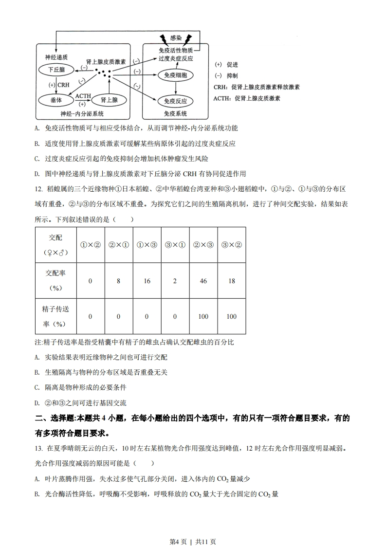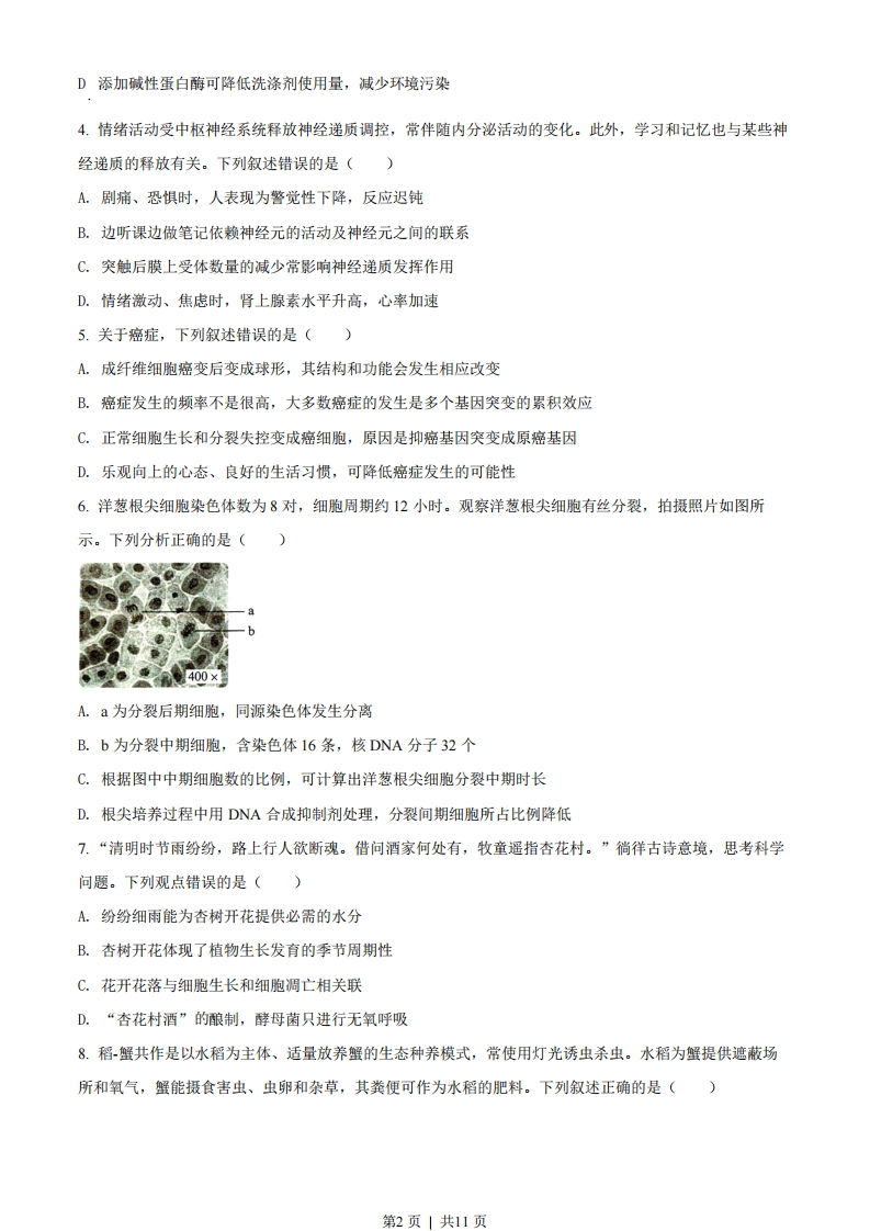 湖南省2022年普通高中学业水平选择性考试生物注意事项:1答卷前,考生务必将自己的姓名、准考证号填写在本试卷和答题卡上。2.回答选择题时,选出每小题答案后,用铅笔把答题卡上对应题目的答案标号涂黑。如需改动,用橡皮擦干净后,再选涂其他答案标号。回答非选择题时,将答案写在答题卡上。写在本试卷上无效。3.考试结束后,将本试卷和答题卡一并交回。一、选择题:本题共12小题,在每小题给出的四个选项中,只有一项是符合题目要求的。1.胶原蛋白是细胞外基质的主要成分之一,其非必需氨基酸含量比蛋清蛋白高。下列叙述正确的是()A.胶原蛋白的氮元素主要存在于氨基中B.皮肤表面涂抹的胶原蛋白可被直接吸收C.胶原蛋白的形成与内质网和高尔基体有关D.胶原蛋白比蛋清蛋白的营养价值高2.T2噬菌体侵染大肠杆菌的过程中,下列哪一项不会发生()A.新的噬菌体DNA合成B.新的噬菌体蛋白质外壳合成C.噬菌体在自身RNA聚合酶作用下转录出RNAD.合成的噬菌体RNA与大肠杆菌的核糖体结合3.洗涤剂中的碱性蛋白酶受到其他成分的影响而改变构象,部分解折叠后可被正常碱性蛋白酶特异性识别并降解(自溶)失活。此外,加热也能使碱性蛋白酶失活,如图所示。下列叙述错误的是()进一步加热加热降温天然状态部分解折叠完全解折叠A.碱性蛋白酶在一定条件下可发生自溶失活B.加热导致碱性蛋白酶构象改变是不可逆的C.添加酶稳定剂可提高加碱性蛋白酶洗涤剂的去污效果第1页」共11页D添加碱性蛋白酶可降低洗涤剂使用量,减少环境污染4.情绪活动受中枢神经系统释放神经递质调控,常伴随内分泌活动的变化。此外,学习和记忆也与某些神经递质的释放有关。下列叙述错误的是()A.剧痛、恐惧时,人表现为警觉性下降,反应迟钝B.边听课边做笔记依赖神经元的活动及神经元之间的联系C.突触后膜上受体数量的减少常影响神经递质发挥作用D.情绪激动、焦虑时,肾上腺素水平升高,心率加速5.关于癌症,下列叙述错误的是()A.成纤维细胞癌变后变成球形,其结构和功能会发生相应改变B.癌症发生的频率不是很高,大多数癌症的发生是多个基因突变的累积效应C.正常细胞生长和分裂失控变成癌细胞,原因是抑癌基因突变成原癌基因D.乐观向上的心态、良好的生活习惯,可降低癌症发生的可能性6.洋葱根尖细胞染色体数为8对,细胞周期约12小时。观察洋葱根尖细胞有丝分裂,拍摄照片如图所示。下列分析正确的是()400×A.a为分裂后期细胞,同源染色体发生分离B.b为分裂中期细胞,含染色体16条,核DNA分子32个C.根据图中中期细胞数的比例,可计算出洋葱根尖细跑分裂中期时长D.根尖培养过程中用DNA合成抑制剂处理,分裂间期细胞所占比例降低7.“清明时节雨纷纷,路上行人欲断魂。借问酒家何处有,牧童遥指杏花村。”徜徉古诗意境,思考科学问题。下列观点错误的是()A.纷纷细雨能为杏树开花提供必需的水分B.杏树开花体现了植物生长发育的季节周期性C.花开花落与细胞生长和细胞调亡相关联D.“杏花村酒”的酿制,酵母菌只进行无氧呼吸8.稻-蟹共作是以水稻为主体、适量放养蟹的生态种养模式,常使用灯光诱虫杀虫。水稻为蟹提供遮蔽场所和氧气,蟹能摄食害虫、虫卵和杂草,其粪便可作为水稻的肥料。下列叙述正确的是()第2页共11页A.该种养模式提高了营养级间的能量传递效率B.采用灯光诱虫杀虫利用了物理信息的传递C.硬壳蟹(非蜕壳)摄食软壳蟹(蜕壳)为捕食关系D.该种养模式可实现物质和能量的循环利用9.大鼠控制黑眼/红眼的基因和控制黑毛伯化的基因位于同一条染色体上。某个体测交后代表现型及比例为黑眼黑毛:黑眼白化:红眼黑毛:红眼白化=1:1:1:1。该个体最可能发生了下列哪种染色体结构变异()abaxd efa bod en&aedefa bb c d e■Dhii kDa b ed e fbodeDD.b©①Dghi d edacbdef10.原生质体(细胞除细胞壁以外的部分)表面积大小的变化可作为质壁分离实验的检测指标。用葡萄糖基本培养基和NaC溶液交替处理某假单孢菌,其原生质体表面积的测定结果如图所示。下列叙述错误的是(葡萄糖6.751.751.250.750.750.750o8恶0.25蓝0.2蓝0.25045040培养时间(h)培养时间(h)培养时间(h)甲组:0.3mol/L NaCl乙组:1.0mol/LNaC丙组:1.5mol/L NaClA.甲组NaC处理不能引起细胞发生质壁分离,表明细胞中NaCl浓度≥0.3moLB.乙、丙组NCI处理皆使细胞质壁分离,处理解除后细胞即可发生质壁分离复原C.该菌的正常生长和吸水都可导致原生质体表面积增加D.若将该菌先65℃水浴灭活后,再用NaC溶液处理,原生质体表面积无变化11.病原体入侵引起机体免疫应答,释放免疫活性物质。过度免疫应答造成机体炎症损伤,机体可通过一系列反应来降低损伤,如图所示。下列叙述错误的是()第3页」共11页