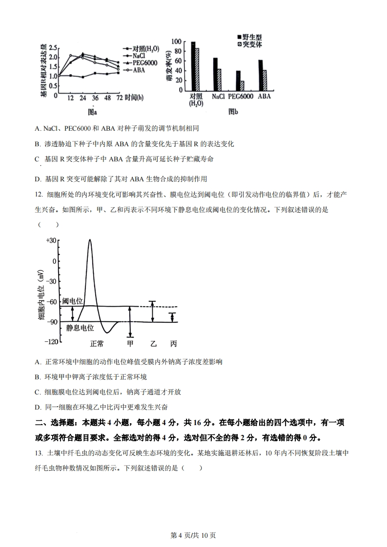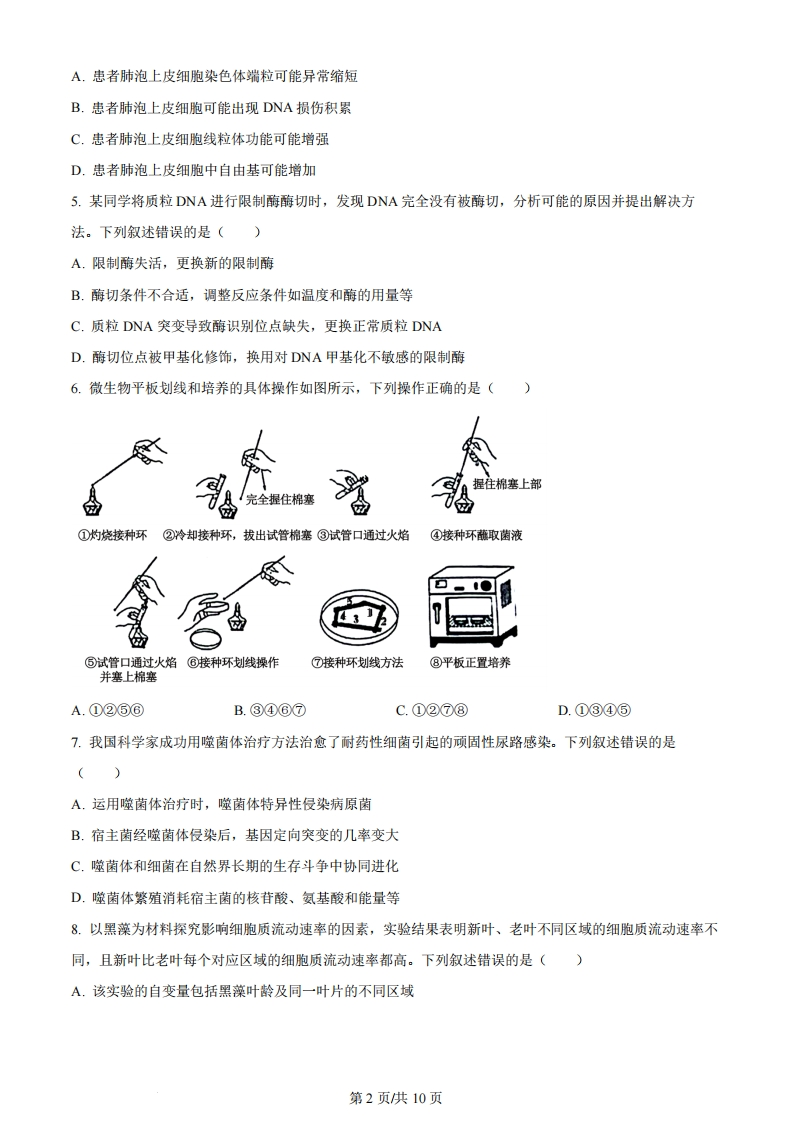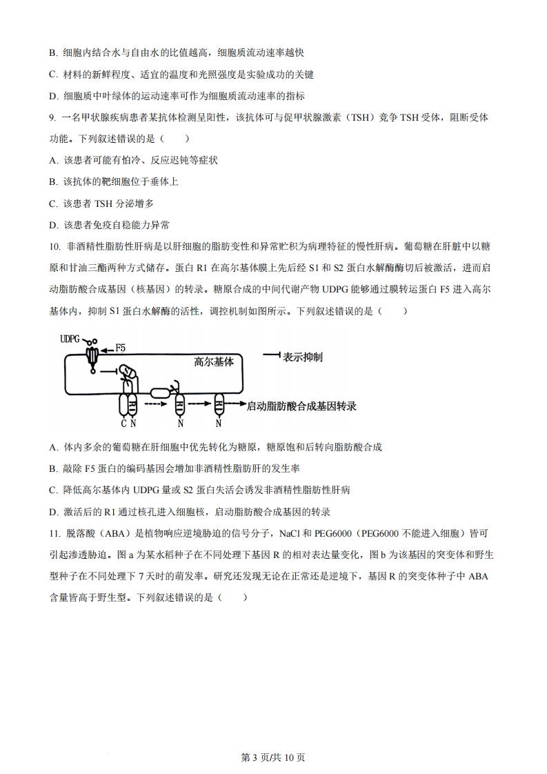 机密★启用前2024年湖南省普通高中学业水平选择性考试生物学本试卷共8页,22题。全卷满分100分。考试用时75分钟。注意事项:1答题前,先将自己的姓名、准考证号、考场号、座位号填写在试卷和答题卡上,并认真核准准考证号条形码上的以上信息,将条形码粘贴在答题卡上的指定位置。2.请按题号顺序在答题卡上各题目的答题区域内作答,写在试卷、草稿纸和答题卡上的非答题区域均无效。3.选择题用2B铅笔在答题卡上把所选答案的标号涂黑;非选择题用黑色签字笔在答题卡上作答:字体工整,笔迹清楚。4.考试结束后,请将试卷和答题卡一并上交。一、选择题:本题共12小题,每小题2分,共24分。在每小题组出的四个选项中只有一项是符合题目要求的。1.细胞膜上的脂类具有重要的生物学功能。下列叙述错误的是()A.耐极端低温细菌的膜脂富含饱和脂肪酸B.胆固醇可以影响动物细胞膜的流动性C.糖脂可以参与细胞表面识别D.磷脂是构成细胞膜的重要成分2.抗原呈递细胞(APC)可以通过某类受体识别入侵病原体的独特结构而诱发炎症和免疫反应。下列叙述错误的是()A.APC的细胞膜上存在该类受体B.该类受体也可以在溶酶体膜上C.诱发炎症和免疫反应过强可能会引起组织损伤D.APC包括巨噬细胞、树突状细胞和浆细胞等3.湿地是一种独特的生态系统,是绿水青山的重要组成部分。下列叙述错误的是()A.在城市地区建设人工湿地可改善生态环境B.移除湖泊中富营养化沉积物有利于生态系统的恢复C.移栽适应当地环境的植物遵循了生态工程的协调原理D.气温和害虫对湿地某植物种群的作用强度与该种群的密度有关4.部分肺纤维化患者的肺泡上皮细胞容易受损衰老。下列叙述错误的是()第1页供10页A.患者肺泡上皮细胞染色体端粒可能异常缩短B.患者肺泡上皮细胞可能出现DNA损伤积累C.患者肺泡上皮细胞线粒体功能可能增强D.患者肺泡上皮细胞中自由基可能增加5.某同学将质粒DNA进行限制酶酶切时,发现DNA完全没有被酶切,分析可能的原因并提出解决方法。下列叙述错误的是()A.限制酶失活,更换新的限制酶B.酶切条件不合适,调整反应条件如温度和酶的用量等C.质粒DNA突变导致酶识别位点缺失,更换正常质粒DNAD.酶切位点被甲基化修饰,换用对DNA甲基化不敏感的限制酶6.微生物平板划线和培养的具体操作如图所示,下列操作正确的是()握往棉塞上部完全握住棉塞①灼烧接种环②冷却接种环,拔出试管棉塞③试管口通过火焰④接种环蘸取菌液43⑤试管口通过火焰⑥接种环划线操作⑦接种环划线方法⑧平板正置培养并塞上棉塞A.①②⑤⑥B.③④⑥⑦C.①②⑦⑧D.①③④⑤7.我国科学家成功用噬菌体治疗方法治愈了耐药性细菌引起的顽固性尿路感染。下列叙述错误的是()A.运用噬菌体治疗时,噬菌体特异性侵染病原菌B.宿主菌经噬菌体侵染后,基因定向突变的几率变大C.噬菌体和细菌在自然界长期的生存斗争中协同进化D.噬菌体繁殖消耗宿主菌的核苷酸、氨基酸和能量等8.以黑藻为材料探究影响细胞质流动速率的因素,实验结果表明新叶、老叶不同区域的细胞质流动速率不同,且新叶比老叶每个对应区域的细胞质流动速率都高。下列叙述错误的是()A.该实验的自变量包括黑藻叶龄及同一叶片的不同区域第2页供10页B.细胞内结合水与自由水的比值越高,细胞质流动速率越快C.材料的新鲜程度、适宜的温度和光照强度是实验成功的关键D.细胞质中叶绿体的运动速率可作为细胞质流动速率的指标9.一名甲状腺疾病患者某抗体检测呈阳性,该抗体可与促甲状腺激素(TSH)竞争T$H受体,阻断受体功能。下列叙述错误的是(A.该患者可能有怕冷、反应迟钝等症状B.该抗体的靶细胞位于垂体上C.该患者TSH分泌增多D.该患者免疫自稳能力异常10.非酒精性脂肪性肝病是以肝细胞的脂肪变性和异常贮积为病理特征的慢性肝病。葡萄糖在肝脏中以糖原和甘油三酯两种方式储存。蛋白R1在高尔基体膜上先后经S1和S2蛋白水解酶酶切后被激活,进而启动脂肪酸合成基因(核基因)的转录。糖原合成的中间代谢产物UDPG能够通过膜转运蛋白F5进入高尔基体内,抑制S1蛋白水解酶的活性,调控机制如图所示。下列叙述错误的是()UDPGLF5高尔基体一表示抑制◆启动脂肪酸合成基因转录A.体内多余的葡萄糖在肝细胞中优先转化为糖原,糖原饱和后转向脂肪酸合成B.敲除F5蛋白的编码基因会增加非酒精性脂肪肝的发生率C.降低高尔基体内UDPG量或S2蛋白失活会诱发非酒精性脂肪性肝病D.激活后的R1通过核孔进入细胞核,启动脂肪酸合成基因的转录11.脱落酸(ABA)是植物响应逆境胁迫的信号分子,NaCI和PEG6000(PEG6000不能进入细胞)皆可引起渗透胁迫。图为某水稻种子在不同处理下基因R的相对表达量变化,图b为该基因的突变体和野生型种子在不同处理下7天时的萌发率。研究还发现无论在正常还是逆境下,基因R的突变体种子中ABA含量皆高于野生型。下列叙述错误的是()第3页供10页