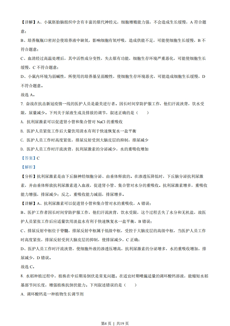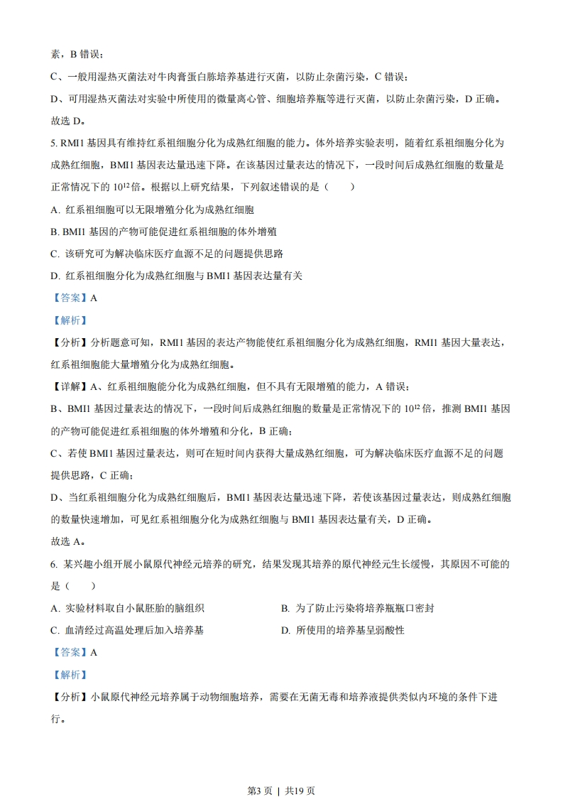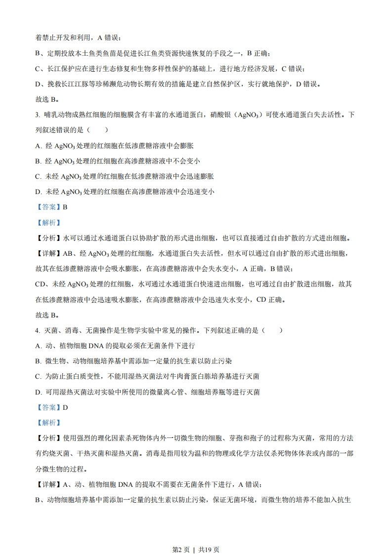 2022年湖北省普通高中学业水平选择性考试生物学一、选释题:本题共20小题。每小题给出的四个进项中,只有一个选项符合题目要求。1.水是生命的源泉,节约用水是每个人应尽的责任,下列有关水在生命活动中作用的叙述,错误的是()A.水是酶促反应的环境B.参与血液中缓冲体系的形成C.可作为维生素D等物质的溶剂D.可作为反应物参与生物氧化过程【答案】C【解析】【分析】细胞内的水的存在形式是自由水和结合水,结合水是细胞结构的重要组成成分:自由水是良好的溶剂,是许多化学反应的介质,自由水还参与许多化学反应,自由水对于营养物质和代谢废物的运输具有重要作用:自由水与结合水不是一成不变的,可以相互转化,自由水与结合水的比值越高,细胞代谢越旺盛,抗逆性越低,反之亦然。【详解】A、自由水是化学反应的介质,故水是酶促反应的环境,A正确:B、血液中的缓冲对是由离子组成的,离子溶解在水中才能形成缓冲体系,B正确:C、维生素D属于脂质,脂质通常都不溶于水,C错误:D、自由水能参与化学反应,故水可作为反应物参与生物氧化过程,D正确。故选C。2.生态环境破坏、过度捕捞等导致长江中下游生态退化,渔业资源锐减,长江江豚、中华鲟等长江特有珍稀动物濒临灭绝。为了挽救长江生态环境,国家制定了“长江10年禁渔”等保护政策,对长江生态环境及生物多样性进行保护和修复。下列有关叙述正确的是()A.长江鱼类资源稳定恢复的关键在于长期禁渔B.定期投放本土鱼类鱼苗是促进长江鱼类资源快速恢复的手段之一C.长江保护应在优先保护地方经济发展的基础上,进行生态修复和生物多样性保护D.挽救长江江豚等珍稀濒危动物长期有效的措施是建立人工养殖场,进行易地保护和保种【答案】B【解析】【分析】就地保护是最有效的措施,比如建立自然保护区:易地保护有建立植物园、动物园等:利用生物技术保护:建立精子库、种子库等。【详解】A、长江鱼类资源稳定恢复的关键在于对长江生态环境及生物多样性进行保护和修复,并不意味第1页1共19页着禁止开发和利用,A错误:B、定期投放本土鱼类鱼苗是促进长江鱼类资源快速恢复的手段之一,B正确:C、长江保护应在进行生态修复和生物多样性保护的基础上,进行地方经济发展,C错误:D、挽救长江江豚等珍稀濒危动物长期有效的措施是建立自然保护区,实行就地保护,D错误。故选B。3.哺乳动物成熟红细胞的细胞膜含有丰富的水通道蛋白,硝酸银(AgNO3)可使水通道蛋白失去活性。下列叙述错误的是()A.经AgNO3处理的红细胞在低渗蔗糖溶液中会膨张B.经AgNO3处理的红细胞在高渗蔗糖溶液中不会变小C.未经AgNO3处理的红细胞在低渗蔗糖溶液中会迅速膨胀D.未经AgNO3处理的红细胞在高渗蔗糖溶液中会迅速变小【答案】B【解析】【分析】水可以通过水通道蛋白以协助扩散的形式进出细胞,也可以直接通过自由扩散的方式进出细胞。【详解】AB、经AgNO3处理的红细胞,水通道蛋白失去活性,但水可以通过自由扩散的形式进出细胞,故其在低渗蔗糖溶液中会吸水膨胀,在高渗蔗糖溶液中会失水变小,A正确,B错误:CD、未经AgNO3处理的红细胞,水可通过水通道蛋白快速进出细胞,也可通过自由扩散进出细胞,故其在低渗蔗糖溶液中会迅速吸水膨胀,在高渗蔗糖溶液中会迅速失水变小,CD正确。故选B。4.灭菌、消毒、无菌操作是生物学实验中常见的操作。下列叙述正确的是()A.动、植物细胞DNA的提取必须在无菌条件下进行B.微生物、动物细胞培养基中需添加一定量的抗生素以防止污染C.为防止蛋白质变性,不能用湿热灭菌法对牛肉膏蛋白胨培养基进行灭菌D.可用湿热灭菌法对实验中所使用的微量离心管、细胞培养瓶等进行灭菌【答案】D【解析】【分析】使用强烈的理化因素杀死物体内外一切微生物的细胞、芽孢和孢子的过程称为灭菌,常用的方法有灼烧灭菌、干热灭菌和湿热灭菌。消毒是指用较为温和的物理或化学方法仅杀死物体体表或内部的一部分微生物的过程。【详解】A、动、植物细胞DNA的提取不需要在无菌条件下进行,A错误:B、动物细胞培养基中需添加一定量的抗生素以防止污染,保证无菌环境,而微生物的培养不能加入抗生第2页1共19页素,B错误:C、一般用湿热灭菌法对牛肉膏蛋白胨培养基进行灭菌,以防止杂菌污染,C错误:D、可用湿热灭菌法对实验中所使用的微量离心管、细胞培养瓶等进行灭菌,以防止杂菌污染,D正确。故选D。5.RM1基因具有维持红系祖细胞分化为成熟红细胞的能力。体外培养实验表明,随着红系祖细胞分化为成熟红细胞,BM1基因表达量迅速下降。在该基因过量表达的情况下,一段时间后成熟红细胞的数量是正常情况下的1012倍。根据以上研究结果,下列叙述错误的是()A.红系祖细跑可以无限增殖分化为成熟红细胞B.BMI1基因的产物可能促进红系祖细胞的体外增殖C.该研究可为解决临床医疗血源不足的问题提供思路D.红系祖细胞分化为成熟红细胞与BM1基因表达量有关【答案】A【解析】【分析】分析题意可知,RM1基因的表达产物能使红系祖细胞分化为成熟红细胞,RMI1基因大量表达,红系祖细胞能大量增殖分化为成熟红细胞。【详解】A、红系祖细胞能分化为成熟红细胞,但不具有无限增殖的能力,A错误:B、BMI1基因过量表达的情况下,一段时间后成熟红细胞的数量是正常情况下的102倍,推测BM1基因的产物可