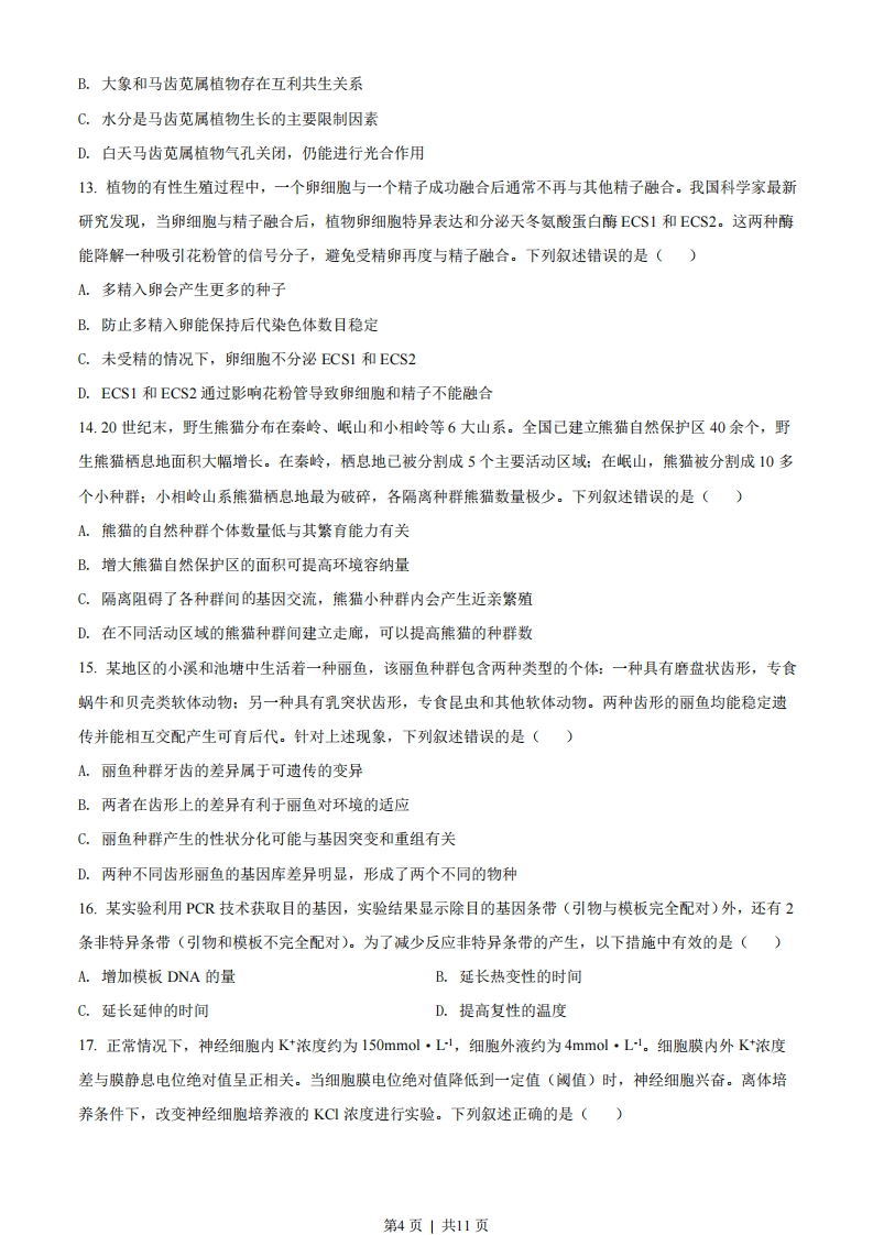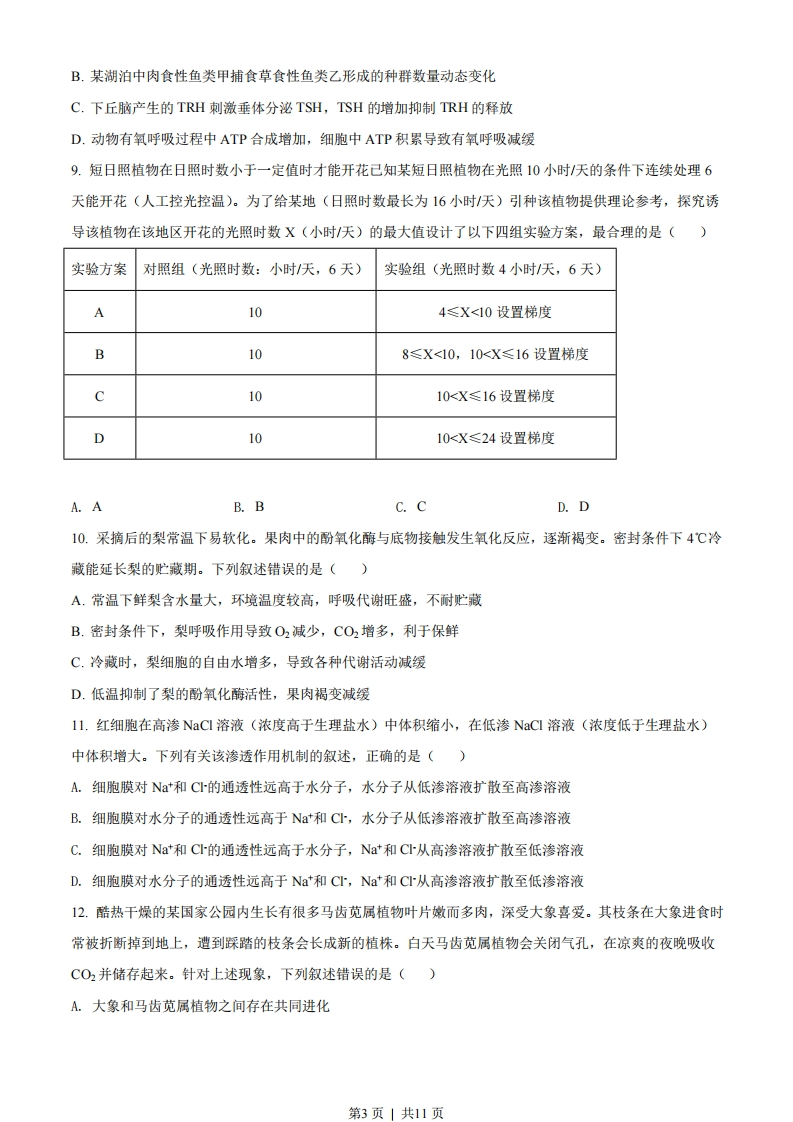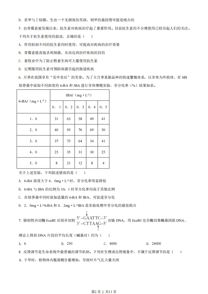 2021年湖北省普通高中学业水平选择性考试生物一、选择题1.在真核细胞中,由细胞膜、核膜以及各种细胞器膜等共同构成生物膜系统。下列叙述错误的是()A.葡萄糖的有氧呼吸过程中,水的生成发生在线粒体外膜B.细胞膜上参与主动运输的ATP酶是一种跨膜蛋白C.溶酶体膜蛋白高度糖基化可保护自身不被酶水解D.叶绿体的类囊体膜上分布着光合色素和蛋白质2.很久以前,勤劳的中国人就发明了制饴(麦芽糖技术,这种技术在民间沿用至今。麦芽糖制作的大致过程如图所示。小麦浸泡,麦芽长至打碎糯米浸泡、蒸熟发芽一定长度备用冷却至60℃左右麦芽糖大火熬55-60℃保温搅拌至粘稠6小时左右均匀下列叙述正确的是()A麦芽含有淀粉酶,不含麦芽糖B.麦芽糖由葡萄糖和果糖结合而成C.55~60℃保温可抑制该过程中细菌的生长D.麦芽中的淀粉酶比人的唾液淀粉酶的最适温度低3.中国的许多传统美食制作过程蕴含了生物发酵技术。下列叙述正确的是()A.泡菜制作过程中,酵母菌将葡萄糖分解成乳酸B.馒头制作过程中,酵母菌进行呼吸作用产生CO2C.米酒制作过程中,将容器密封可以促进酵母菌生长D.酸奶制作过程中,后期低温处理可产生大量乳酸杆菌4.浅浅的小酒窝,笑起来像花儿一样美。酒窝是由人类常染色体的单基因所决定,属于显性遗传。甲、乙分别代表有、无酒窝的男性,丙、丁分别代表有、无酒窝的女性。下列叙述正确的是()A.若甲与丙结婚,生出的孩子一定都有酒窝B.若乙与丁结婚,生出的所有孩子都无酒窝C.若乙与丙结婚,生出的孩子有酒窝的概率为50%第1页」共11页D.若甲与丁结婚,生出一个无酒窝的男孩,则甲的基因型可能是纯合的5.自青霉素被发现以来,抗生素对疾病治疗起了重要作用。目前抗生素的不合理使用己经引起人们的关注。下列关于抗生素使用的叙述,正确的是()A.作用机制不同的抗生素同时使用,可提高对疾病的治疗效果B.青霉素能直接杀死细菌,从而达到治疗疾病的目的C.畜牧业中为了防止牲畜生病可大量使用抗生素D.定期服用抗生素可预防病菌引起的肠道疾病6.月季在我国享有“花中皇后”的美誉。为了立月季某新品种的快速繁殖体系,以芽体为外植体,在MS培养基中添加不同浓度的6-BA和IBA进行芽体增殖实验,芽分化率(%)结果如表。IBAW(mg·Ll)6-BA/(mg·L1)0.10.20.30.40.51.031635849412.040957669503.037756454414.025353130255.021124关于上述实验,下列叙述错误的是()A.6-BA浓度大于4.0mg·L1时,芽分化率明显降低B.6-BA与IBA的比例为10:1时芽分化率均高于其他比例C.在培养基中同时添加适量的6-BA和BA,可促进芽分化D.2.0mg·L16-BA和0.2mg·L1BA是实验处理中芽分化的最佳组合7.限制性内切酶EcoRI识别并切制S'-GAATTC-3双链DNA,用EcoRI完全酶切果蝇基因组DNA,3'-CTTAAG-5'理论上得到DNA片段的平均长度(碱基对)约为()A.6B.250C.4000D.240008.反馈调节是生命系统中最普遍的调节机制。下列在生理或自然现象中,不属于反馈调节的是()A.干旱时,植物体内脱落酸含量增加,导致叶片气孔大量关闭第2页」共11页B.某湖泊中肉食性鱼类甲捕食草食性鱼类乙形成的种群数量动态变化C.下丘脑产生的TRH刺激垂体分泌TSH,TSH的增加抑制TRH的释放D.动物有氧呼吸过程中ATP合成增加,细胞中ATP积累导致有氧呼吸减缓9.短日照植物在日照时数小于一定值时才能开花己知某短日照植物在光照10小时/天的条件下连续处理6天能开花(人工控光控温)。为了给某地(日照时数最长为16小时/天)引种该植物提供理论参考,探究诱导该植物在该地区开花的光照时数X(小时/天)的最大值设计了以下四组实验方案,最合理的是()实验方案对照组(光照时数:小时/天,6天)实验组(光照时数4小时/天,6天)104≤X<10设置梯度B108≤X<10,10