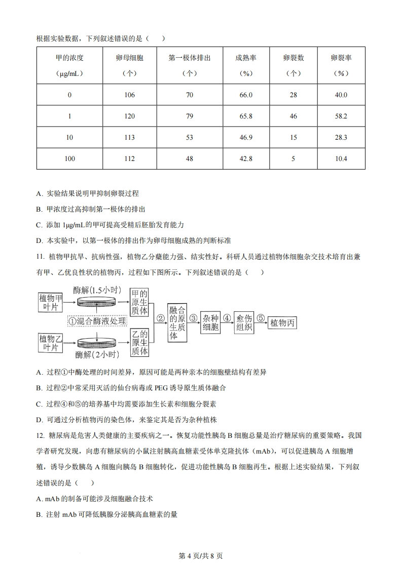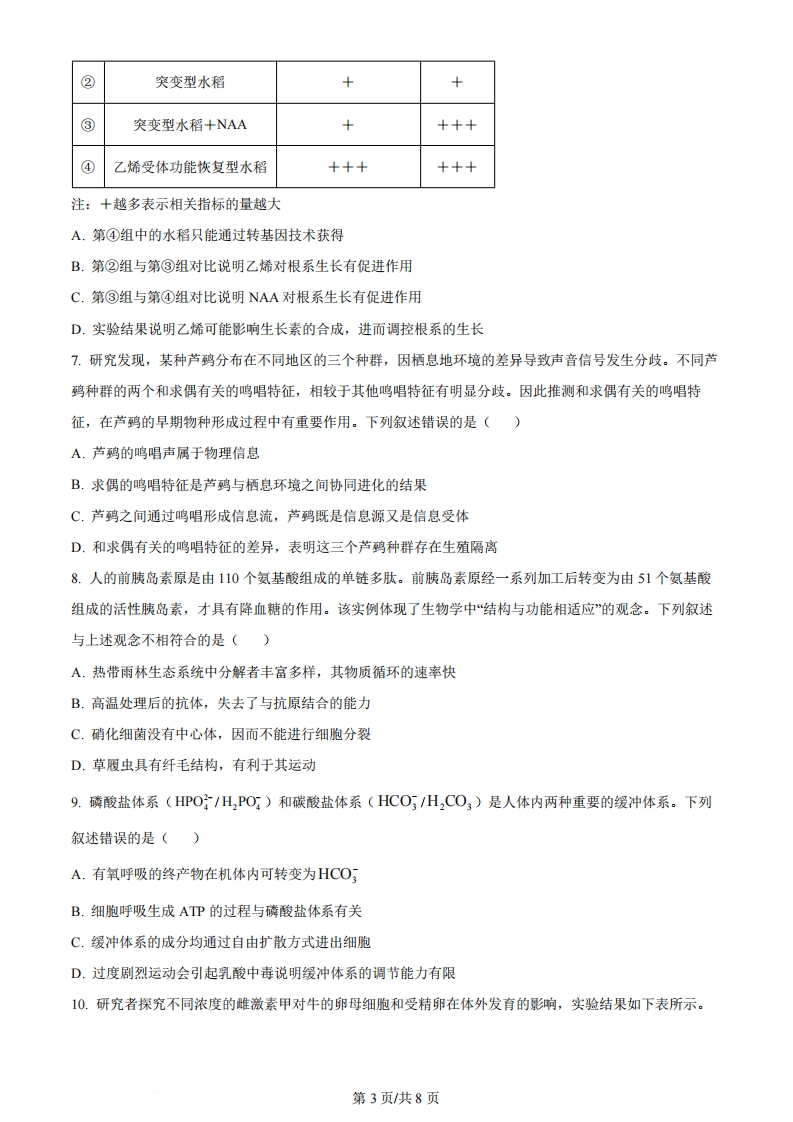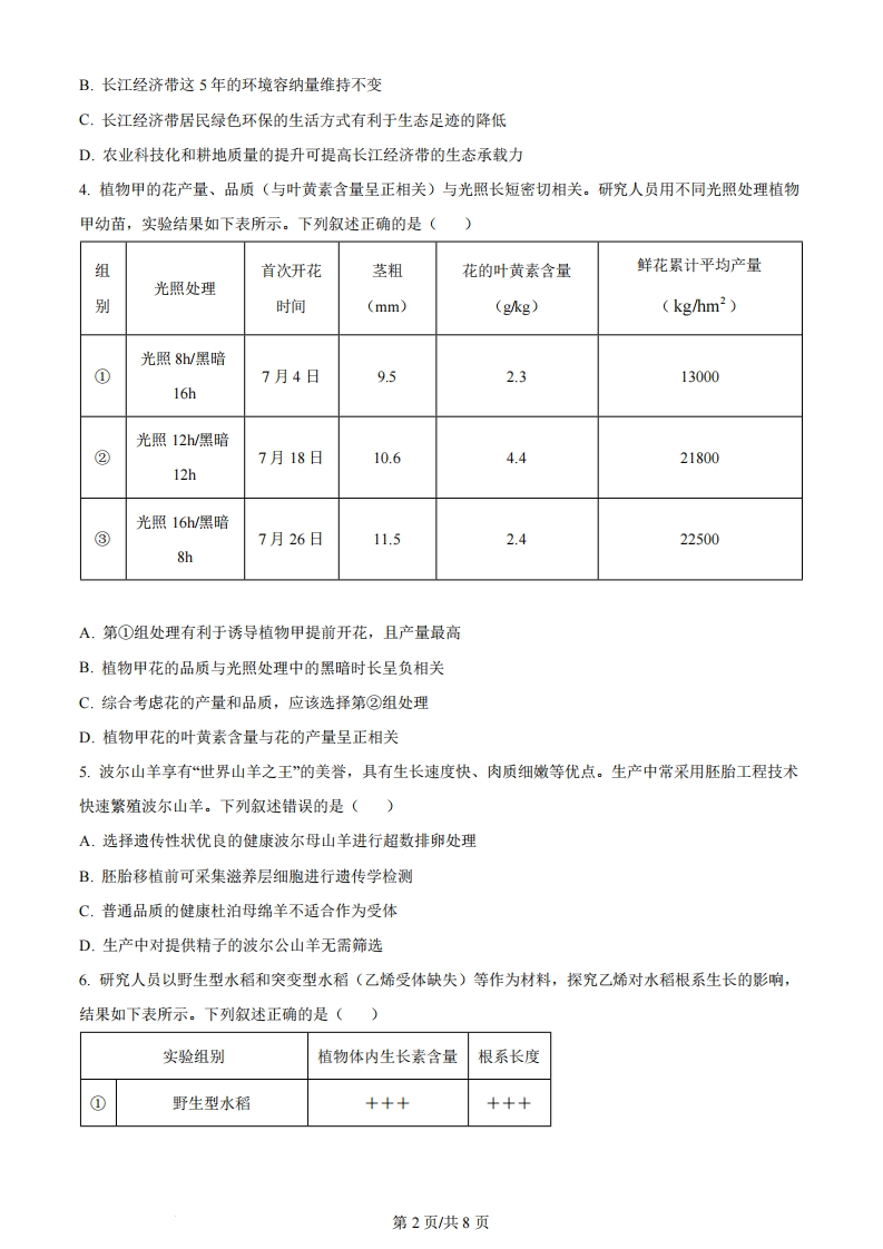 机密★启用前2024年湖北省普通高中学业水平选择性考试生物学本试卷共8页,22题。全卷满分100分。考试用时75分钟。★祝考试顺利★注意事项:1.答题前,先将自己的姓名、准考证号、考场号、座位号填写在试卷和答题卡上,并认真核准准考证号条形码上的以上信息,将条形码粘贴在答题卡上的指定位置。2,请按题号顺序在答题卡上各题目的答题区域内作答,写在试卷、草稿纸和答题卡上的非答题区域均无效。3.选择题用2B铅笔在答题卡上把所选答案的标号涂黑;非选择题用黑色签字笔在答题卡上作答:字体工整,笔迹清楚。4.考试结束后,请将试卷和答题卡一并上交。一、选择题:本题共18小题,每小题2分,共36分。在每小题给出的四个选项中,只有一项是符合题目要求的。1.制醋、制饴、制酒是我国传统发酵技术。醋酸菌属于好氧型原核生物,常用于食用醋的发酵。下列叙述错误的是()A.食用醋的酸味主要来源于乙酸B.醋酸菌不适宜在无氧条件下生存C.醋酸菌含有催化乙醇氧化成乙酸的酶D.葡萄糖在醋酸菌中的氧化分解发生在线粒体内2.2021年3月,习近平总书记在考察武夷山国家公园时指出,建立以国家公园为主体的自然保护地体系,目的就是按照山水林田湖草是一个生命共同体的理念,保持自然生态系统的原真性和完整性,保护生物多样性。根据以上精神,结合生物学知识,下列叙述错误的是()A.在国家公园中引入外来物种,有可能导致生物多样性下降B.建立动物园和植物园,能够更好地对濒危动植物进行就地保护C.规范人类活动、修复受损生境,有利于自然生态系统的发育和稳定D.在破碎化生境之间建立生态廊道,是恢复自然生态系统完整性的重要措施3.据报道,2015年到2019年长江经济带人均生态足迹由0.3212hm2下降至0.2958hm2,5年的下降率为7.91%。人均生态承载力从0.4607hm2下降到0.4498hm2,5年的下降率为2.37%。结合上述数据,下列叙述错误的是()A.长江经济带这5年处于生态盈余的状态第1页共8页B.长江经济带这5年的环境容纳量维持不变C.长江经济带居民绿色环保的生活方式有利于生态足迹的降低D.农业科技化和耕地质量的提升可提高长江经济带的生态承载力4.植物甲的花产量、品质(与叶黄素含量呈正相关)与光照长短密切相关。研究人员用不同光照处理植物甲幼苗,实验结果如下表所示。下列叙述正确的是(组首次开花茎粗花的叶黄素含量鲜花累计平均产量光照处理别时间(mm)(g/kg)(kg/hm2)光照8h/黑暗①7月4日9.52.31300016h光照12h/黑暗②7月18日10.64.42180012h光照16h/黑暗③7月26日11.52.4225008hA.第①组处理有利于诱导植物甲提前开花,且产量最高B.植物甲花的品质与光照处理中的黑暗时长呈负相关C.综合考虑花的产量和品质,应该选择第②组处理D.植物甲花的叶黄素含量与花的产量呈正相关5.波尔山羊享有“世界山羊之王”的美誉,具有生长速度快、肉质细嫩等优点。生产中常采用胚胎工程技术快速繁殖波尔山羊。下列叙述错误的是()A.选择遗传性状优良的健康波尔母山羊进行超数排卵处理B.胚胎移植前可采集滋养层细胞进行遗传学检测C.普通品质的健康杜泊母绵羊不适合作为受体D.生产中对提供精子的波尔公山羊无需筛选6.研究人员以野生型水稻和突变型水稻(乙烯受体缺失)等作为材料,探究乙烯对水稻根系生长的影响,结果如下表所示。下列叙述正确的是()实验组别植物体内生长素含量根系长度⊙野生型水稻++++++第2页共8页②突变型水稻+③突变型水稻+NAA+十+十④乙烯受体功能恢复型水稻++++++注:十越多表示相关指标的量越大A.第④组中的水稻只能通过转基因技术获得B.第②组与第③组对比说明乙烯对根系生长有促进作用C.第③组与第④组对比说明NAA对根系生长有促进作用D.实验结果说明乙烯可能影响生长素的合成,进而调控根系的生长7.研究发现,某种芦鸥分布在不同地区的三个种群,因栖息地环境的差异导致声音信号发生分歧。不同芦鸥种群的两个和求偶有关的鸣唱特征,相较于其他鸣唱特征有明显分歧。因此推测和求偶有关的鸣唱特征,在芦鸥的早期物种形成过程中有重要作用。下列叙述错误的是()A.芦鸥的鸣唱声属于物理信息B.求偶的鸣唱特征是芦鸥与栖息环境之间协同进化的结果C.芦鸥之间通过鸣唱形成信息流,芦鸥既是信息源又是信息受体D.和求偶有关的鸣唱特征的差异,表明这三个芦鸥种群存在生殖隔离8.人的前胰岛素原是由110个氨基酸组成的单链多肽。前胰岛素原经一系列加工后转变为由51个氨基酸组成的活性胰岛素,才具有降血糖的作用。该实例体现了生物学中“结构与功能相适应”的观念。下列叙述与上述观念不相符合的是()A.热带雨林生态系统中分解者丰富多样,其物质循环的速率快B.高温处理后的抗体,失去了与抗原结合的能力C.硝化细菌没有中心体,因而不能进行细胞分裂D.草履虫具有纤毛结构,有利于其运动9.磷酸盐体系(HPO?/H,PO)和碳酸盐体系(HCOH,CO3)是人体内两种重要的缓冲体系。下列叙述错误的是()A.有氧呼吸的终产物在机体内可转变为HCOB.细胞呼吸生成ATP的过程与磷酸盐体系有关C.缓冲体系的成分均通过自由扩散方式进出细胞D.过度剧烈运动会引起乳酸中毒说明缓冲体系的调节能力有限10.研究者探究不同浓度的雌激素甲对牛的卵母细胞和受精卵在体外发育的影响,实验结果如下表所示。第3页/共8页