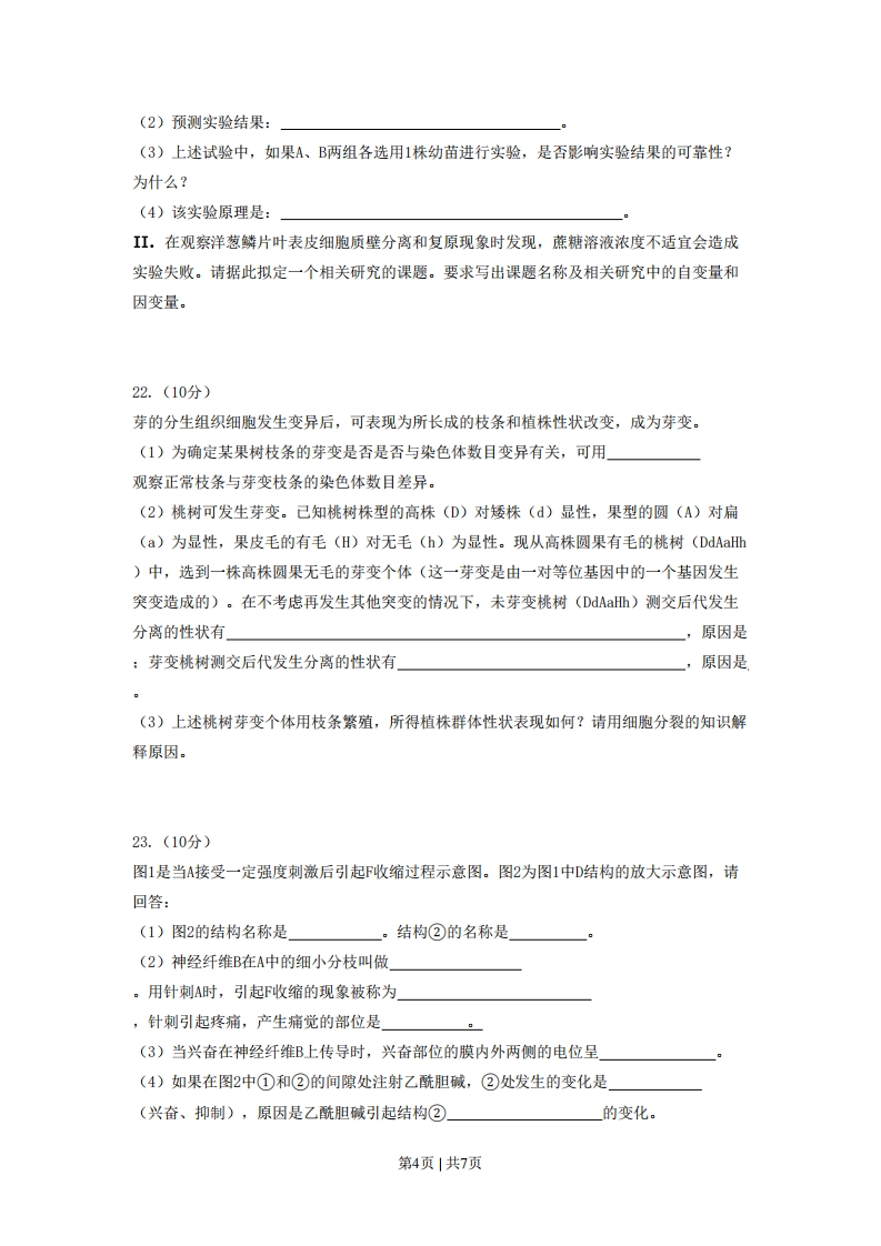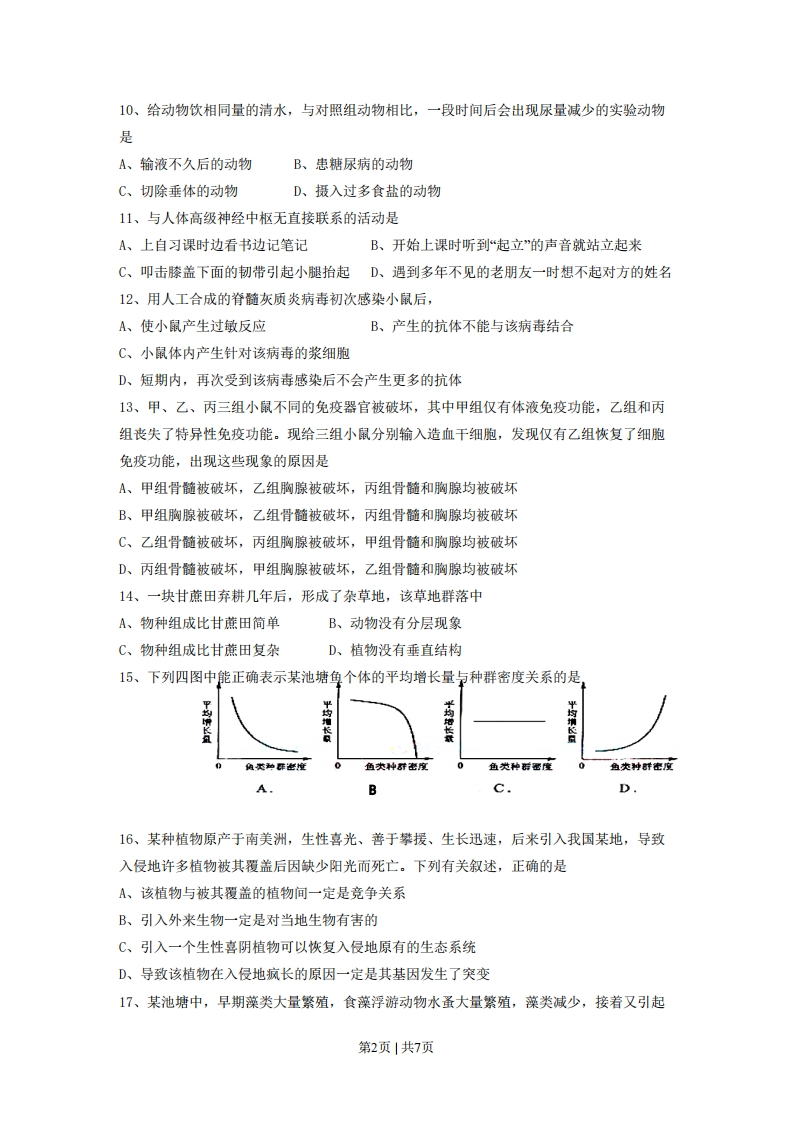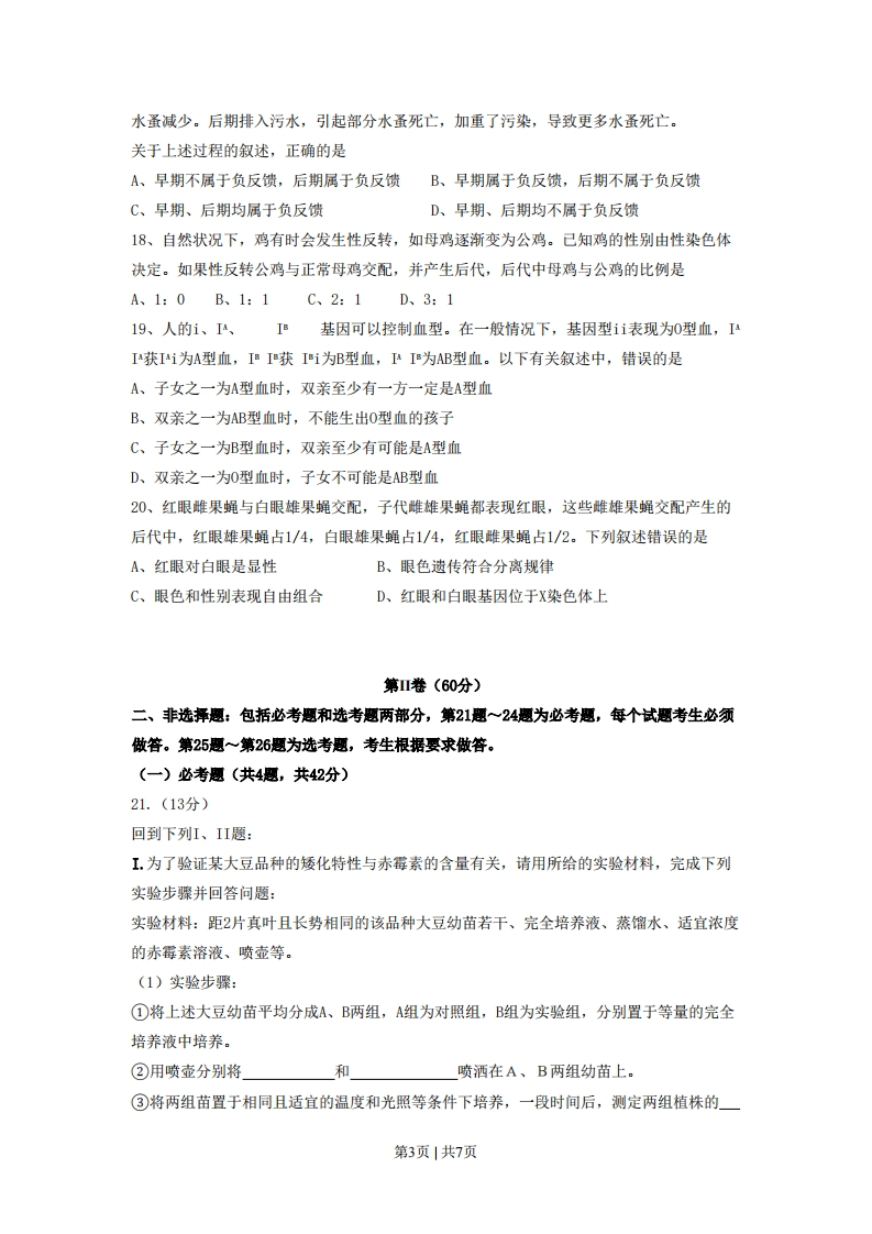 2008年普通高等学校招生全国统一考试(海南)理科综合能力测试试题—一生物部分第1卷(40分)一、选择题:本题共20小题,每小题2分,在每小题给出的四个选项中,只有一项是符合题目要求的。1、下列与生物体内核酸分子功能多样性无关的是:A.核苷酸的组成种类B、核苷酸的连接方式C.核苷酸的排列顺序D、核苷酸的数量多少2、关于叶绿体色素在光合作用过程作用的描述,错误的是A、叶绿体色素与ATP的合成有关B、叶绿体色素参与ATP的分解C、叶绿体色素与02和[H)的形成有关D、叶绿体色素能吸收和传递光能3、在日光下,植物叶片中的叶绿素A、大量吸收绿光B、等量吸收不同波长的光C、主要吸收蓝紫光和绿光D、主要吸收蓝紫光和红光4、某人不小心从高处摔下,到医院检查,下列与确定此人神经中枢受损无关的检查是A、针刺双脚观察是否有反应B、检查血细胞的数量是否有变化C、检查膝跳反射是否正常D、要求此人复述医生的一段话5、青蛙垂体提取液中有促进雌蛙排卵的激素,该激素作用的器官是A、甲状腺B、胰腺C、卵巢D、肾上腺6、下列有关细胞癌变的叙述,错误的是A、细胞癌变后细胞膜表面糖蛋白减少B、癌症病人染色体上无抑癌基因C、经常食用烟熏制品易导致细胞的癌变D、癌症的发生与个人的身心状况有关7、下列关于蛋白质代谢的叙述,错误的是A、噬菌体利用细菌的酶合成自身的蛋白质B、绿色植物可以合成自身所需的蛋白质C、tRNA、mRNA、rRNA都参与蛋白质的合成D、肺炎双球菌利用人体细胞的核糖体合成自身的蛋白质8、关于动物内蛋白质合成与去向的叙述,正确的是A、所有蛋白质的合成都需要能量B、合成的蛋白质都运到细胞外C、合成的蛋白质都不能进入细胞核内D、合成的蛋白质都用于细胞膜蛋白的更新9、人突然受到寒冷刺激时,引起骨骼肌收缩而打寒颤。下列关于该反射的叙述,错误的是A、该反射的效应器是骨骼肌B、该反射弧的感受器主要分布在身体的皮肤中C、该反射弧的反射中枢应包括大脑皮层、下丘脑和垂体D、寒冷刺激以电和化学信号的形式在反射弧中进行传导和传递第1页|共7页10、给动物饮相同量的清水,与对照组动物相比,一段时间后会出现尿量减少的实验动物是A、输液不久后的动物B、患糖尿病的动物C、切除垂体的动物D、摄入过多食盐的动物11、与人体高级神经中枢无直接联系的活动是A、上自习课时边看书边记笔记B、开始上课时听到“起立”的声音就站立起来C、叩击膝盖下面的韧带引起小腿抬起D、遇到多年不见的老朋友一时想不起对方的姓名12、用人工合成的脊髓灰质炎病毒初次感染小鼠后,A、使小鼠产生过敏反应B、产生的抗体不能与该病毒结合C、小鼠体内产生针对该病毒的浆细胞D、短期内,再次受到该病毒感染后不会产生更多的抗体13、甲、乙、丙三组小鼠不同的免疫器官被破坏,其中甲组仅有体液免疫功能,乙组和丙组丧失了特异性免疫功能。现给三组小鼠分别输入造血干细胞,发现仅有乙组恢复了细胞免疫功能,出现这些现象的原因是A、甲组骨髓被破坏,乙组胸腺被破坏,丙组骨髓和胸腺均被破坏B、甲组胸腺被破坏,乙组骨髓被破坏,丙组骨髓和胸腺均被破坏C、乙组骨髓被破坏,丙组胸腺被破坏,甲组骨髓和胸腺均被破坏D、丙组骨髓被破坏,甲组胸腺被破坏,乙组骨髓和胸腺均被破坏14、一块甘蔗田弃耕几年后,形成了杂草地,该草地群落中A、物种组成比甘蔗田简单B、动物没有分层现象C、物种组成比甘蔗田复杂D、植物没有垂直结构15、下列四图中能正确表示某池塘鱼个体的平均增长量与种群密度关系的是平均增长平均增长载平均增长量角类种年些度鱼类种行密度鱼类种群密度鱼类种时密应A.BC.D16、某种植物原产于南美洲,生性喜光、善于攀援、生长迅速,后来引入我国某地,导致入侵地许多植物被其覆盖后因缺少阳光而死亡。下列有关叙述,正确的是A、该植物与被其覆盖的植物间一定是竞争关系B、引入外来生物一定是对当地生物有害的C、引入一个生性喜阴植物可以恢复入侵地原有的生态系统D、导致该植物在入侵地疯长的原因一定是其基因发生了突变17、某池塘中,早期藻类大量繁殖,食藻浮游动物水蚤大量繁殖,藻类减少,接着又引起第2页|共7页水蚤减少。后期排入污水,引起部分水蚤死亡,加重了污染,导致更多水蚤死亡。关于上述过程的叙述,正确的是A、早期不属于负反馈,后期属于负反馈B、早期属于负反馈,后期不属于负反馈C、早期、后期均属于负反馈D、早期、后期均不属于负反馈18、自然状况下,鸡有时会发生性反转,如母鸡逐渐变为公鸡。己知鸡的性别由性染色体决定。如果性反转公鸡与正常母鸡交配,并产生后代,后代中母鸡与公鸡的比例是A、1:0B、1:1C、2:1D、3:119、人的i、IA、I基因可以控制血型。在一般情况下,基因型ii表现为0型血,II获Ii为A型血,IBI获Ii为B型血,INIB为AB型血。以下有关叙述中,错误的是A、子女之一为A型血时,双亲至少有一方一定是A型血B、双亲之一为AB型血时,不能生出O型血的孩子C、子女之一为B型血时,双亲至少有可能是A型血D、双亲之一为O型血时,子女不可能是AB型血20、红眼雌果蝇与白眼雄果蝇交配,子代雌雄果蝇都表现红眼,这些雌雄果蝇交配产生的后代中,红眼雄果蝇占1/4,白眼雄果蝇占1/4,红眼雌果蝇占1/2。下列叙述错误的是A、红眼对白眼是显性B、眼色遗传符合分离
