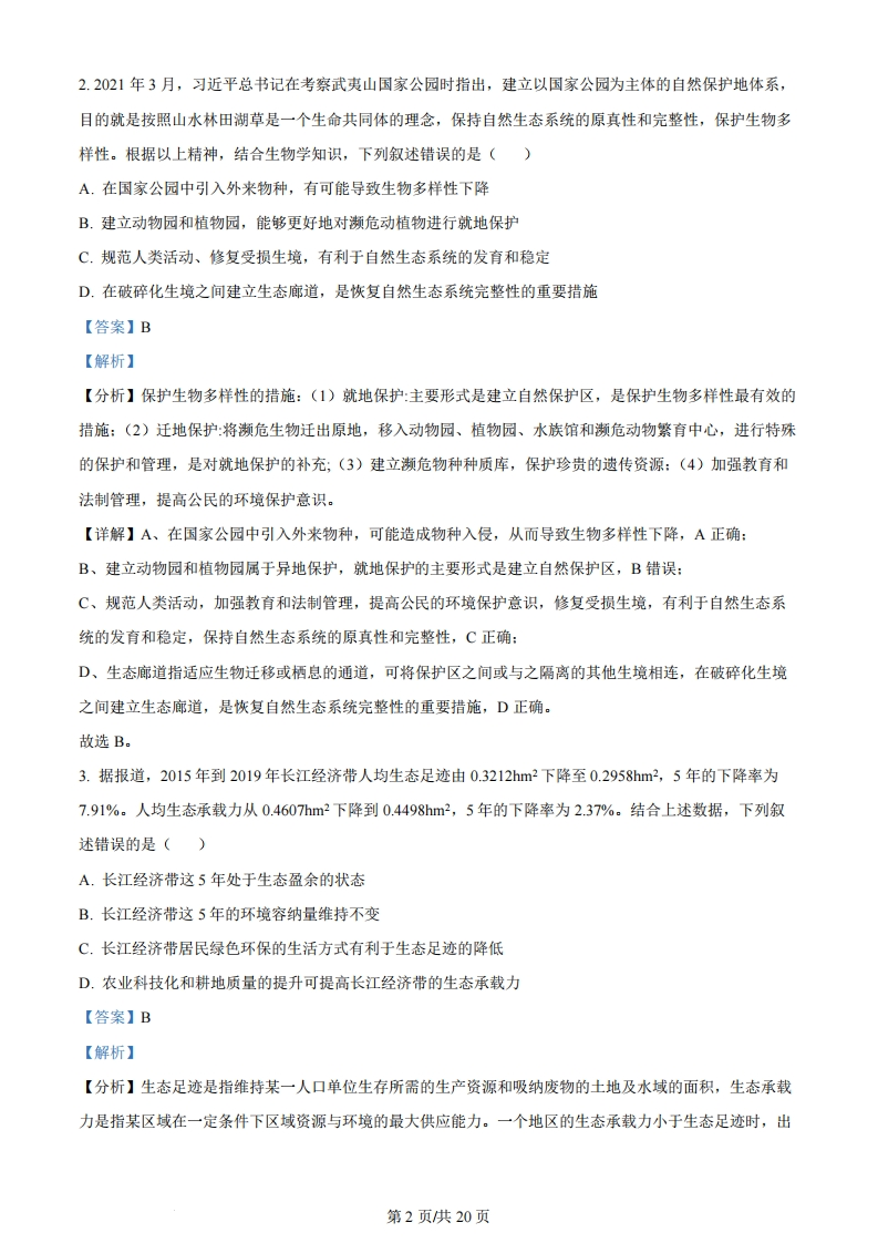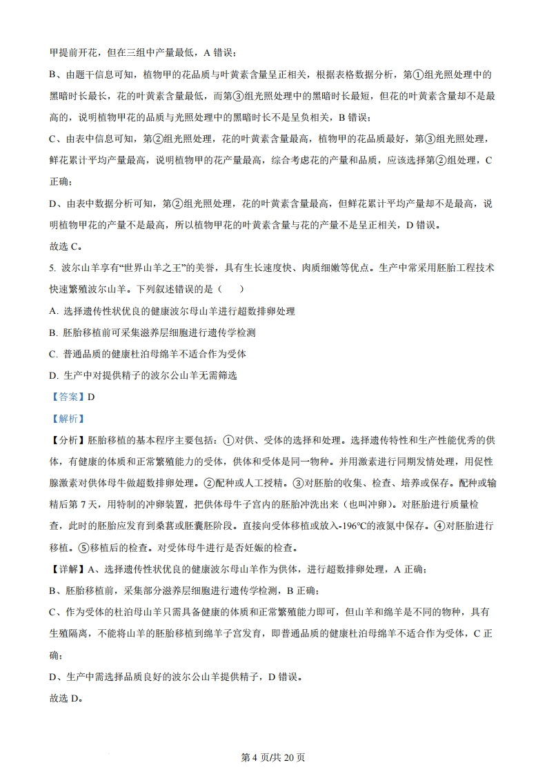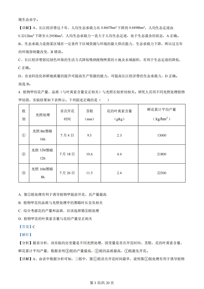 机密★启用前2024年湖北省普通高中学业水平选择性考试生物学本试卷共8页,22题。全卷满分100分。考试用时75分钟。★祝考试顺利★注意事项:1.答题前,先将自己的姓名、准考证号、考场号、座位号填写在试卷和答题卡上,并认真核准准考证号条形码上的以上信息,将条形码粘贴在答题卡上的指定位置。2,请按题号顺序在答题卡上各题目的答题区域内作答,写在试卷、草稿纸和答题卡上的非答题区域均无效。3.选择题用2B铅笔在答题卡上把所选答案的标号涂黑;非选择题用黑色签字笔在答题卡上作答:字体工整,笔迹清楚。4.考试结束后,请将试卷和答题卡一并上交。一、选择题:本题共18小题,每小题2分,共36分。在每小题给出的四个选项中,只有一项是符合题目要求的。1.制醋、制饴、制酒是我国传统发酵技术。醋酸菌属于好氧型原核生物,常用于食用醋的发酵。下列叙述错误的是()A.食用醋的酸味主要来源于乙酸B.醋酸菌不适宜在无氧条件下生存C.醋酸菌含有催化乙醇氧化成乙酸的酶D.葡萄糖在醋酸菌中的氧化分解发生在线粒体内【答案】D【解析】【分析】参与果醋制作的微生物是醋酸菌,其新陈代谢类型是异养需氧型。果醋制作的原理:当氧气、糖源都充足时,醋酸菌将葡萄汁中的果糖分解成醋酸。当缺少糖源时,醋酸菌将乙醇变为乙醛,再将乙醛变为醋酸。【详解】A、食用醋的酸味主要来自醋酸,醋酸学名乙酸,A正确:B、醋酸菌是好氧型细菌,不适宜在无氧的条件下生存,B正确:C、在制醋时,缺失原料的情况下,醋酸菌将乙醇变为乙醛,再将乙醛变为醋酸,因此醋酸菌体内含有催化乙醇氧化成乙酸的酶,C正确:D、醋酸菌属于细菌,没有核膜包被的细胞核和众多细胞器,因此没有线粒体,D错误。故选D。第1页供20页2.2021年3月,习近平总书记在考察武夷山国家公园时指出,建立以国家公园为主体的自然保护地体系,目的就是按照山水林田湖草是一个生命共同体的理念,保持自然生态系统的原真性和完整性,保护生物多样性。根据以上精神,结合生物学知识,下列叙述错误的是()A.在国家公园中引入外来物种,有可能导致生物多样性下降B.建立动物园和植物园,能够更好地对濒危动植物进行就地保护C.规范人类活动、修复受损生境,有利于自然生态系统的发育和稳定D.在破碎化生境之间建立生态廊道,是恢复自然生态系统完整性的重要措施【答案】B【解析】【分析】保护生物多样性的措施:(1)就地保护:主要形式是建立自然保护区,是保护生物多样性最有效的措施:(2)迁地保护:将濒危生物迁出原地,移入动物园、植物园、水族馆和濒危动物繁育中心,进行特殊的保护和管理,是对就地保护的补充,(3)建立濒危物种种质库,保护珍贵的遗传资源:(4)加强教育和法制管理,提高公民的环境保护意识。【详解】A、在国家公园中引入外来物种,可能造成物种入侵,从而导致生物多样性下降,A正确:B、建立动物园和植物园属于异地保护,就地保护的主要形式是建立自然保护区,B错误:C、规范人类活动,加强教育和法制管理,提高公民的环境保护意识,修复受损生境,有利于自然生态系统的发育和稳定,保持自然生态系统的原真性和完整性,C正确:D、生态廊道指适应生物迁移或栖息的通道,可将保护区之间或与之隔离的其他生境相连,在破碎化生境之间建立生态廊道,是恢复自然生态系统完整性的重要措施,D正确。故选B。3.据报道,2015年到2019年长江经济带人均生态足迹由0.3212hm2下降至0.2958hm2,5年的下降率为7.91%。人均生态承载力从0.4607hm2下降到0.4498hm2,5年的下降率为2.37%。结合上述数据,下列叙述错误的是()A.长江经济带这5年处于生态盈余的状态B.长江经济带这5年的环境容纳量维持不变C.长江经济带居民绿色环保的生活方式有利于生态足迹的降低D.农业科技化和耕地质量的提升可提高长江经济带的生态承载力【答案】B【解析】【分析】生态足迹是指维持某一人口单位生存所需的生产资源和吸纳废物的土地及水域的面积,生态承载力是指某区域在一定条件下区域资源与环境的最大供应能力。一个地区的生态承载力小于生态足迹时,出第2页供20页现生态赤字。【详解】A、长江经济带这5年,人均生态承载力从0.4607hm2下降到0.4498hm2,人均生态足迹由0.3212hm2下降至0.2958hm2,人均生态承载力一直大于人均生态足迹,处于生态盈余的状态,A正确.B、生态承载力是指某区域在一定条件下区域资源与环境的最大供应能力,生态承载力下降,所以这五年的环境容纳量改变,B错误。C、长江经济带居民绿色环保的生活方式降低吸纳废物所需的土地及水域面积,有利于生态足迹的降低,C正确。D、农业科技化和耕地质量的提升可提高生产资源的能力,可提高长江经济带的生态承载力,D正确。故选B。4.植物甲的花产量、品质(与叶黄素含量呈正相关)与光照长短密切相关。研究人员用不同光照处理植物甲幼苗,实验结果如下表所示。下列叙述正确的是(组首次开花茎粗花的叶黄素含量鲜花累计平均产量光照处理别时间(mm)(g/kg)(kg/hm2)光照8h/黑暗①7月4日9.52.31300016h光照12h/黑暗②7月18日10.64.42180012h光照16h/黑暗③7月26日11.52.4225008hA.第①组处理有利于诱导植物甲提前开花,且产量最高B.植物甲花的品质与光照处理中的黑暗时长呈负相关C.综合考虑花的产量和品质,应该选择第②组处理D.植物甲花的叶黄素含量与花的产量呈正相关【答案】C【