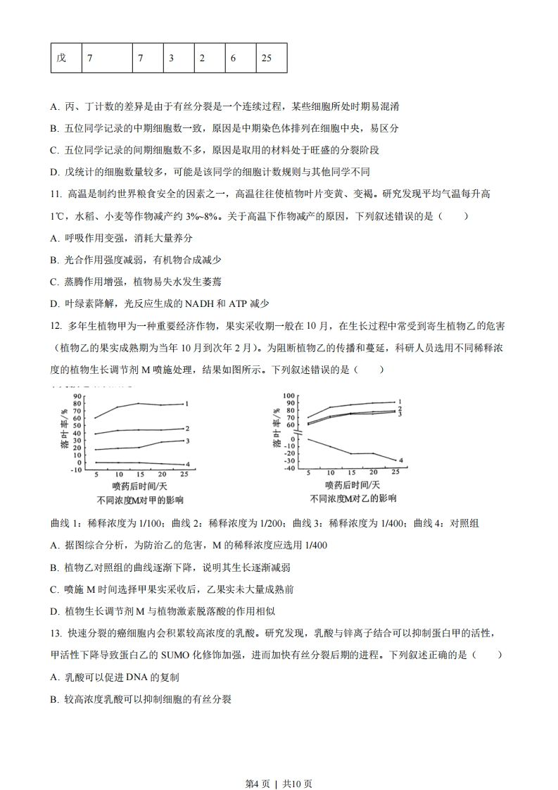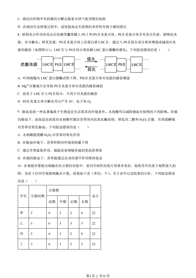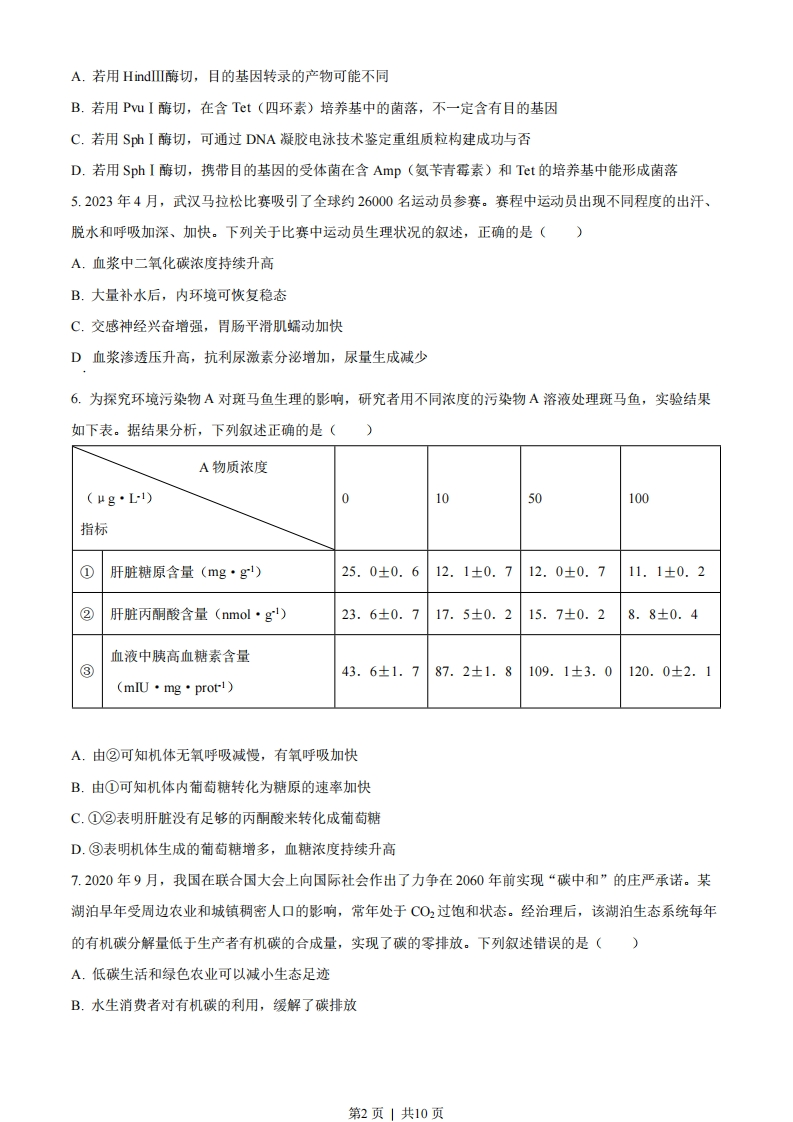 2023年湖北省普通高中学业水平选择性考试生物学一、选择题:本题共18小题,在每小题给出的四个选项中,只有一项是符合题目要求的。1.栽培稻甲产量高、品质好,但每年只能收获一次。野生稻乙种植一次可连续收获多年,但产量低。中国科学家利用栽培稻甲和野生稻乙杂交,培育出兼具两者优点的品系丙,为全球作物育种提供了中国智慧。下列叙述错误的是()A.该成果体现了生物多样性的间接价值B.利用体细胞杂交技术也可培育出品系丙C.该育种技术为全球农业发展提供了新思路D.品系丙的成功培育提示我们要注重野生种质资源的保护2.球状蛋白分子空间结构为外圆中空,氨基酸侧链极性基团分布在分子的外侧,而非极性基团分布在内侧。蛋白质变性后,会出现生物活性丧失及一系列理化性质的变化。下列叙述错误的是()A.蛋白质变性可导致部分肽键断裂B.球状蛋白多数可溶于水,不溶于乙醇C.加热变性的蛋白质不能恢复原有的结构和性质D.变性后生物活性丧失是因为原有空间结构破坏3.维生素D3可从牛奶、鱼肝油等食物中获取,也可在阳光下由皮肤中的7-脱氢胆固醇转化而来,活化维生素D3可促进小肠和肾小管等部位对钙的吸收。研究发现,肾脏合成和释放的羟化酶可以促进维生素D3的活化。下列叙述错误的是()A.肾功能下降可导致机体出现骨质疏松B.适度的户外活动,有利于少年儿童的骨骼发育C.小肠吸收钙减少可导致细胞外液渗透压明显下降D.肾功能障碍时,补充维生素D3不能有效缓解血钙浓度下降4.用氨苄青霉素抗性基因(AmpR)、四环素抗性基因(TetR)作为标记基因构建的质粒如图所示。用含有目的基因的DNA片段和用不同限制酶酶切后的质粒,构建基因表达载体(重组质粒),并转化到受体菌中。下列叙述错误的是()HndⅢPyuISph IScal-AmpRTetRSalI质粒第1页」共10页A.若用HidⅢ酶切,目的基因转录的产物可能不同B.若用PuI酶切,在含T©t(四环素)培养基中的菌落,不一定含有目的基因C.若用SphI酶切,可通过DNA凝胶电泳技术鉴定重组质粒构建成功与否D.若用SphI酶切,携带目的基因的受体菌在含Amp(氨苄青霉素)和Tet的培养基中能形成菌落5.2023年4月,武汉马拉松比赛吸引了全球约26000名运动员参赛。赛程中运动员出现不同程度的出汗、脱水和呼吸加深、加快。下列关于比赛中运动员生理状况的叙述,正确的是()A.血浆中二氧化碳浓度持续升高B.大量补水后,内环境可恢复稳态C.交感神经兴奋增强,胃肠平滑肌蠕动加快D血浆渗透压升高,抗利尿激素分泌增加,尿量生成减少6.为探究环境污染物A对斑马鱼生理的影响,研究者用不同浓度的污染物A溶液处理斑马鱼,实验结果如下表。据结果分析,下列叙述正确的是()A物质浓度(μg·L1)01050100指标⊙肝脏糖原含量(mg·g)25.0±0.612.1±0.712.0±0.711.1±0.2②肝脏丙酮酸含量(nmol·g)23.6±0.717.5±0.215.7±0.28.8±0.4血液中胰高血糖素含量③43.6±1.787.2±1.8109.1±3.0120.0±2.1(mlU·mg·prot1)A.由②可知机体无氧呼吸减慢,有氧呼吸加快B.由①可知机体内葡萄糖转化为糖原的速率加快C.①②表明肝脏没有足够的丙酮酸来转化成葡萄糖D.③表明机体生成的葡萄糖增多,血糖浓度持续升高7.2020年9月,我国在联合国大会上向国际社会作出了力争在2060年前实现“碳中和”的庄严承诺。某湖泊早年受周边农业和城镇稠密人口的影响,常年处于CO2过饱和状态。经治理后,该湖泊生态系统每年的有机碳分解量低于生产者有机碳的合成量,实现了碳的零排放。下列叙述错误的是()A.低碳生活和绿色农业可以减小生态足迹B.水生消费者对有机碳的利用,缓解了碳排放第2页」共10页C.湖泊沉积物中有机碳的分解会随着全球气候变暖而加剧D.在湖泊生态修复过程中,适度提高水生植物的多样性有助于碳的固定8.植物光合作用的光反应依赖类囊体膜上PSI和PSⅡ光复合体,PSⅡ光复合体含有光合色素,能吸收光能,并分解水。研究发现,PSⅡ光复合体上的蛋白质LHCⅡ,通过与PSⅡ结合或分离来增强或减弱对光能的捕获(如图所示)。LHCⅡ与PSⅡ的分离依赖LHC蛋白激酶的催化。下列叙述错误的是()强光类囊体膜LHCII PSII LHCⅡLHCII PSIILHC I弱光A.叶肉细胞内LHC蛋白激酶活性下降,PSIΠ光复合体对光能的捕获增强B.Mg+含量减少会导致PSⅡ光复合体对光能的捕获减弱C.弱光下LHCⅡ与PSⅡ结合,不利于对光能的捕获DPSⅡ光复合体分解水可以产生H、电子和O29.胁迫是指一种显著偏离于生物适宜生活需求的环境条件。水杨酸可以减轻胁迫对植物的不利影响。在镉的胁迫下,添加适宜浓度的水杨酸可激活苦草体内抗氧化酶系统,降低丙二醛和HO2含量,有效缓解镉对苦草的氧化胁迫。下列叙述错误的是()A.水杨酸能缓解HO2对苦草的氧化作用B.在胁迫环境下,苦草种群的环境容纳量下降C.通过生物富集作用,镉能沿食物链传递到更高营养级D.在镉的胁迫下,苦草能通过自身的调节作用维持稳态10.在观察洋葱根尖细胞有丝分裂的实验中,某同学制作的装片效果非常好,他将其中的某个视野放大拍照,发给5位同学观察细胞并计数,结果如下表(单位:个)。关于表中记录结果的分析,下列叙述错误的是()分裂期学生分裂间期总计前期中期后期末期甲5632622乙563522丙562622丁763223第3页」共10页