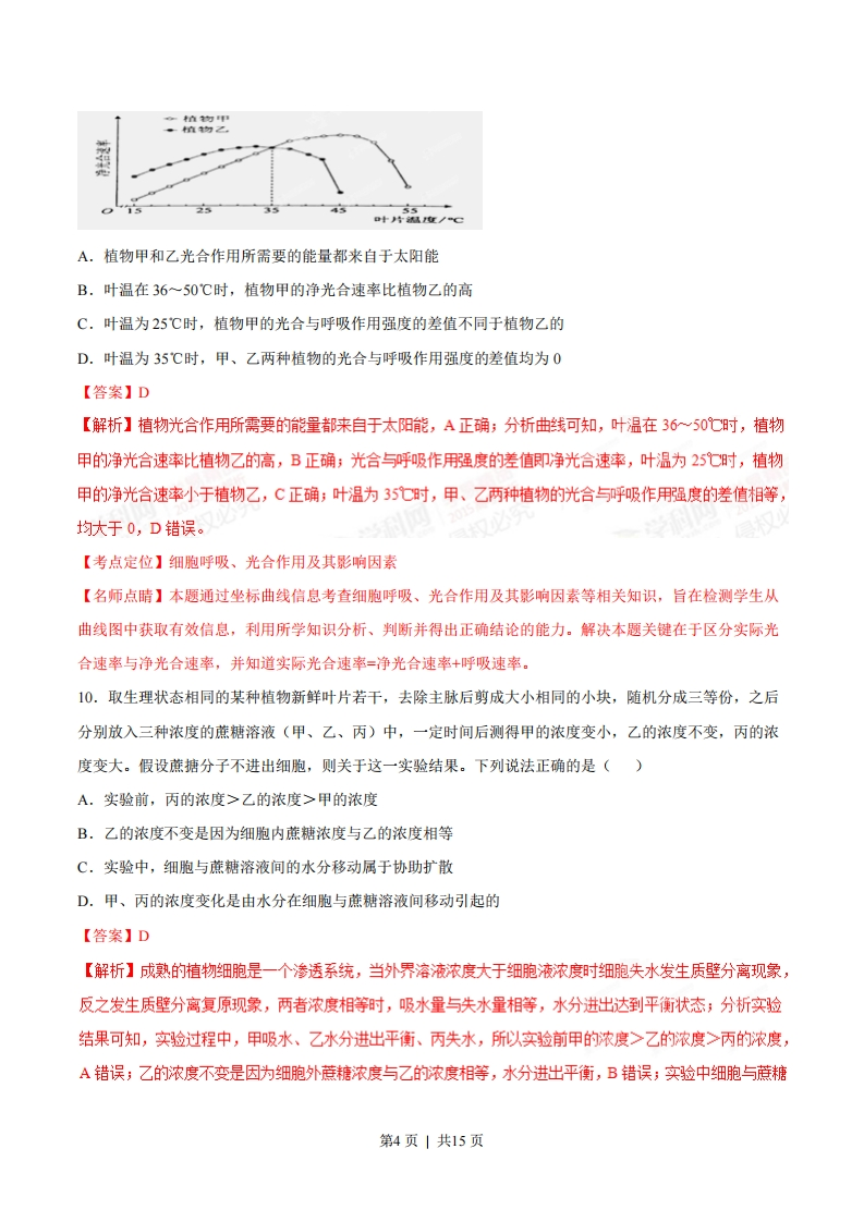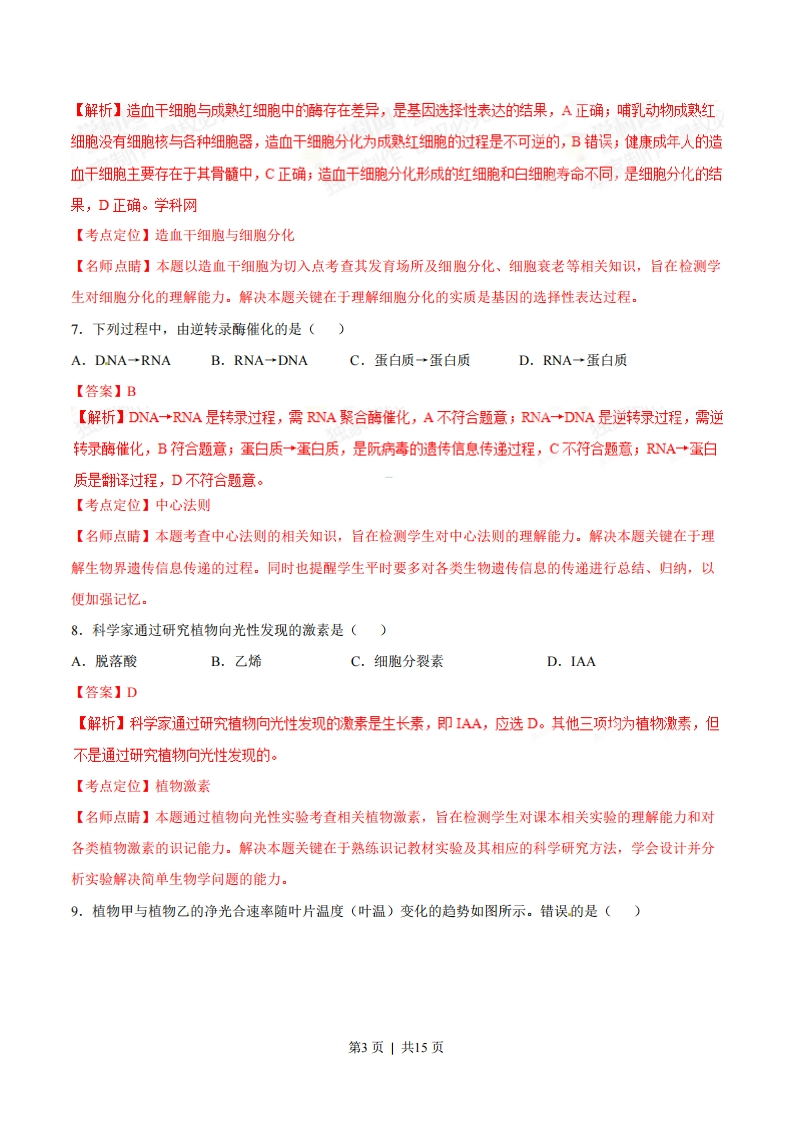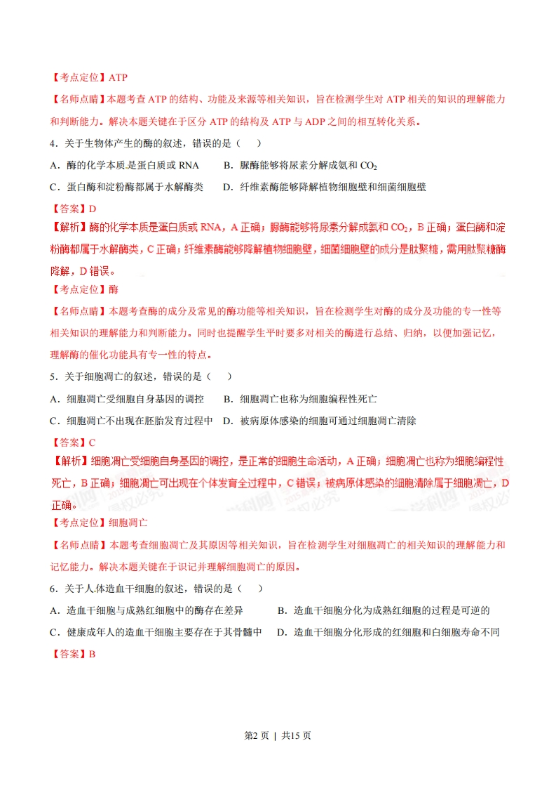 2015年普通高等学校招生全国统一考试理综生物部分(海南卷)1.细胞膜是细胞的重要结构。关于细胞膜的叙述,错误的是()A.细胞膜是一种选择透过性膜B.乙醇通过细胞膜需要消耗ATPC.氨基酸借助膜蛋白可通过细胞膜D.蛋白质分子可以嵌入磷脂双分子层中【答案】B【解析】细胞莫是一种选择透过性膜,其功能特点是具有一定的选择性,A正确;乙醇通过细胞膜的方式为自由扩散,不需要消耗AP,B错误;氯基酸跨膜运输方式为主动运输,需借助膜蛋白通过细胞膜,C正确;蛋白质分子以不同程度地嵌入磷脂双分子层中,D正确。【考点定位】细胞膜的结构与功能【名师点睛】本题考查细胞膜的结构及物质跨膜运输等相关知识,旨在检测学生对细胞膜的流动镶嵌模型的理解能力和判断能力。解决本题关键在于理解细胞膜结构特点与功能特点及其关系。2.细胞是生命活动的基本单位。关于细胞结构的叙述,错误的是()A.细菌有核塘体,无叶绿体B.蓝藻无细胞核,也无核糖体C.水绵有细胞核,也有叶绿体D.酵母菌有细胞核,无叶绿体【答案】B【解析】细菌属于原核生物,细胞内有核塘体,无叶绿体,A正确;蓝藻属于原核生物,细胞内无细胞核,但有核糖体,B错误;水绵是真核藻类,细胞内有细胞核,也有叶绿体,℃正确:酵母菌属于真菌,细胞内有细胞核,无叶绿体,是异养兼性厌氧型生物,D正确。【考点定位】原核细胞结构与真核细胞结构【名师点睛】本题综合考查了原核细胞结构与真核细胞结构等相关知识,旨在检测学生对相关基础知识的掌握情况,同时也提醒学生平时要多对相关知识点进行总结、归纳,以便加强记忆,如细胞结构与功能的统一性等。3.ATP是直接为细胞生命活动提供能量的有机物。关于ATP的叙述,错误的是()A.酒精发酵过程中有ATP生成B.ATP可为物质跨膜运输提供能量C.ATP中高能磷酸键水解可释放能量D.ATP由腺嘌呤、脱氧核糖和磷酸组成【答案】D【解析】酵母菌进行酒精发酵过程中有AP生成,A正确;AP可为主动运输提供能量,B正确;AP中远离腺苷的高能磷酸键水解可释放能量,为生命活动供能,C正确;AP由腺嘌岭、核糖和磷酸组成,D错误。第1页|共15页【考点定位】ATP【名师点睛】本题考查ATP的结构、功能及来源等相关知识,旨在检测学生对ATP相关的知识的理解能力和判断能力。解决本题关键在于区分ATP的结构及ATP与ADP之间的相互转化关系。4.关于生物体产生的酶的叙述,错误的是()A.酶的化学本质是蛋白质或RNAB.脲酶能够将尿素分解成氨和CO2C.蛋白酶和淀粉酶都属于水解酶类D.纤维素酶能够降解植物细胞壁和细菌细胞壁【答案】D【解析】酶的化学本质是蛋白质或RNA,A正确;脲酶能够将尿素分解成氨和C02,B正确;蛋白酶和淀粉酶都属于水解酶类,C正确;纤维素酶能够降解植物细胞壁,细菌细胞壁的成分是肽聚糖,需用肽聚糖酶降解,D错误。【考点定位】酶【名师点睛】本题考查酶的成分及常见的酶功能等相关知识,旨在检测学生对酶的成分及功能的专一性等相关知识的理解能力和判断能力。同时也提醒学生平时要多对相关的酶进行总结、归纳,以使加强记忆,理解酶的催化功能具有专一性的特点。5.关于细胞调亡的叙述,错误的是()A.细胞调亡受细胞自身基因的调控B.细胞调亡也称为细胞编程性死亡C.细胞调亡不出现在胚胎发育过程中D.被病原体感染的细胞可通过细胞调亡清除【答案】C【解析】细胞凋亡受细胞自身基因的调控,是正常的细胞生命活动,A正确;细胞凋亡也称为细胞编程性死亡,B正确;细胞凋亡可出现在个体发育全过程中,C错误;被病原体感染的细胞清除属于细胞凋亡,D正确。【考点定位】细胞调亡【名师点睛】本题考查细胞调亡及其原因等相关知识,旨在检测学生对细胞调亡的相关知识的理解能力和记忆能力。解决本题关键在于识记并理解细胞调亡的原因。6.关于人体造血干细胞的叙述,错误的是()A.造血干细胞与成熟红细胞中的酶存在差异B.造血干细跑分化为成熟红细胞的过程是可逆的C.健康成年人的造血干细胞主要存在于其骨髓中D.造血干细胞分化形成的红细胞和白细胞寿命不同【答案】B第2页|共15页【解析】造血干细胞与成熟红细胞中的酶存在差异,是基因选择性表达的结果,A正确;哺乳动物成熟红细胞没有细胞核与各种细胞器,造血干细胞分化为成熟红细胞的过程是不可逆的,B错误,健康成年人的造血干细胞主要存在于其骨髓中,C正确:造血干细胞分化形成的红细胞和白细胞寿命不同,是细胞分化的结果,D正确。学科网【考点定位】造血干细胞与细胞分化【名师点睛】本题以造血干细胞为切入点考查其发育场所及细胞分化、细胞衰老等相关知识,旨在检测学生对细胞分化的理解能力。解决本题关键在于理解细胞分化的实质是基因的选择性表达过程。7.下列过程中,由逆转录酶催化的是()A.DNA→RNAB.RNA→DNAC.蛋白质→蛋白质D.RNA→蛋白质【答案】B【解析】DNA+RNA是转录过程,需RNA聚合酶催化,A不符合题意;RNA+DNA是逆转录过程,需逆转录酶催化,B符合题意,蛋白质+蛋白质,是阮病毒的遗传信息传递过程,C不符合题意,RNA+蛋白质是翻译过程,D不符合题意。【考点定位】中心法则【名师点睛】本题考查中心法则的相关知识,旨在检测学生对中心法则的理解能力。解决本题关键在于理解生物界遗传信息传递的过程。同时也提醒学生平时要多对各类生物遗传信息的传递进行总结、归纳,以