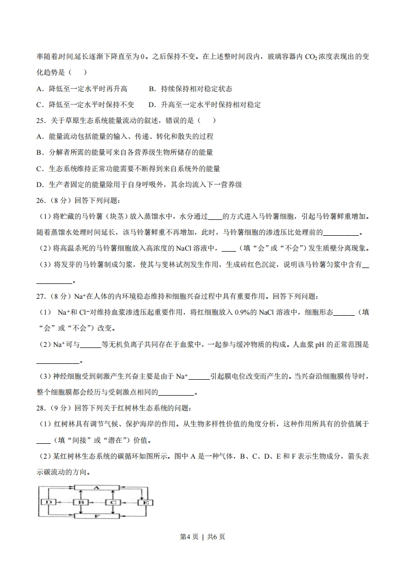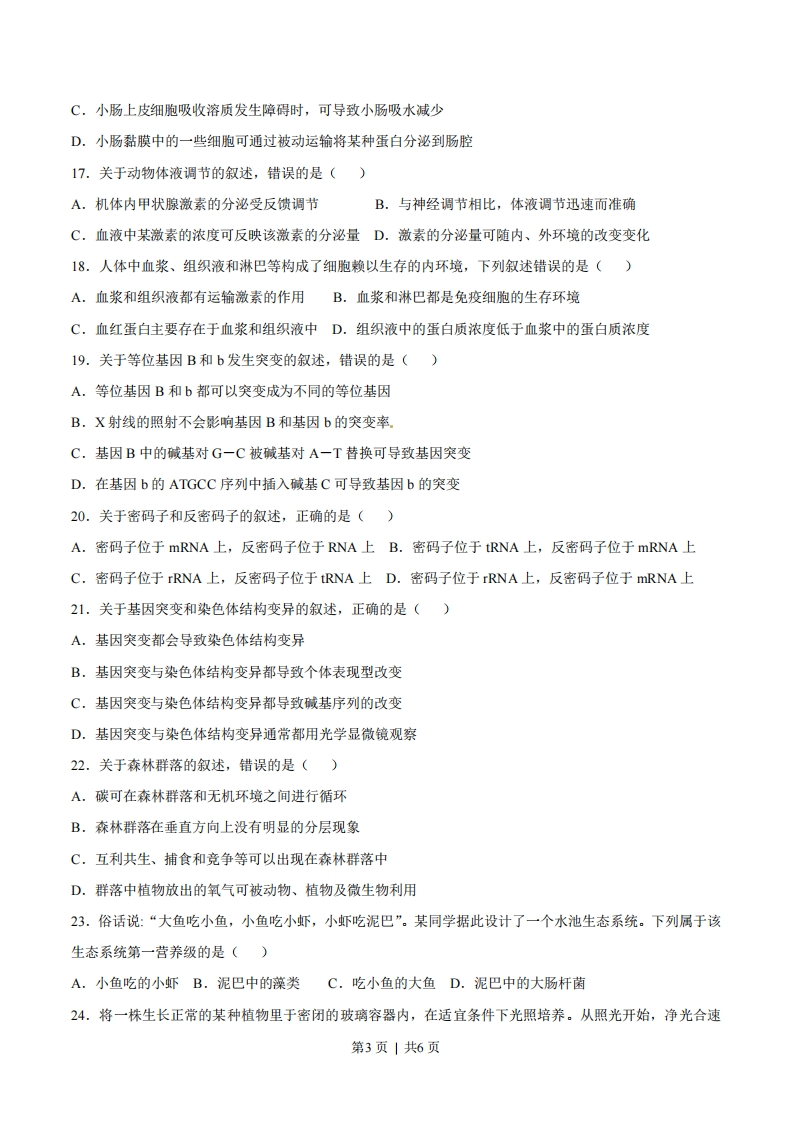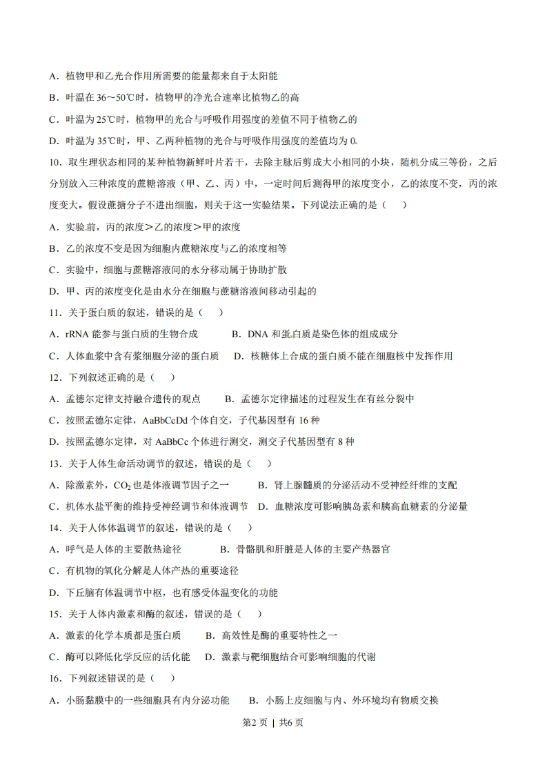 2015年普通高等学校招生全国统一考试生物试题(海南卷)1,细胞膜是细胞的重要结构。关于细胞膜的叙述,错误的是()A.细胞膜是一种选择透过性膜B.乙醇通过细胞膜需要消耗ATPC.氨基酸借助膜蛋白可通过细胞膜D.蛋白质分子可以嵌入磷脂双分子层中2.细胞是生命活动的基本单位。关于细胞结构的叙述,错误的是()A.细菌有核塘体,无叶绿体B.蓝藻无细胞核,也无核糖体C.水绵有细胞核,也有叶绿体D.酵母菌有细胞核,无叶绿体3.ATP是直接为细胞生命活动提供能量的有机物。关于ATP的叙述,错误的是()A.酒精发酵过程中有ATP生成B.ATP可为物质跨膜运输提供能量C.ATP中高能磷酸键水解可释放能量D.ATP由腺嘌呤、脱氧核糖和磷酸组成4.关于生物体产生的酶的叙述,错误的是()A.酶的化学本质是蛋白质或RNAB.脲酶能够将尿素分解成氨和CO2C.蛋白酶和淀粉酶都属于水解酶类D.纤维素酶能够降解植物细胞壁和细菌细胞壁5.关于细胞调亡的叙述,错误的是()A.细胞调亡受细胞自身基因的调控B.细胞调亡也称为细胞编程性死亡C.细胞调亡不出现在胚胎发育过程中D.被病原体感染的细胞可通过细胞调亡清除6.关于人体造血干细胞的叙述,错误的是()A.造血干细胞与成熟红细胞中的酶存在差异B.造血干细胞分化为成熟红细胞的过程是可逆的C.健康成年人的造血干细胞主要存在于其骨髓中D.造血干细胞分化形成的红细胞和白细胞寿命不同7.下列过程中,由逆转录酶催化的是()A.DNA→RNAB.RNA→DNAC.蛋白质→蛋白质D.RNA→蛋白质8.科学家通过研究植物向光性发现的激素是()A.脱落酸B.乙烯C.细胞分裂素D.IAA9.植物甲与植物乙的净光合速率随叶片温度(叶温)变化的趋势如图所示。错误的是()。值物和。直李灯”2545叶片温度/G第1页|共6页A.植物甲和乙光合作用所需要的能量都来自于太阳能B.叶温在36~50℃时,植物甲的净光合速率比植物乙的高C.叶温为25℃时,植物甲的光合与呼吸作用强度的差值不同于植物乙的D.叶温为35℃时,甲、乙两种植物的光合与呼吸作用强度的差值均为010.取生理状态相同的某种植物新鲜叶片若干,去除主脉后剪成大小相同的小块,随机分成三等份,之后分别放入三种浓度的蔗糖溶液(甲、乙、丙)中,一定时间后测得甲的浓度变小,乙的浓度不变,丙的浓度变大。假设蔗搪分子不进出细胞,则关于这一实验结果。下列说法正确的是()A.实验前,丙的浓度>乙的浓度>甲的浓度B.乙的浓度不变是因为细胞内蔗糖浓度与乙的浓度相等C.实验中,细胞与蔗糖溶液间的水分移动属于协助扩散D.甲、丙的浓度变化是由水分在细胞与蔗糖溶液间移动引起的11.关于蛋白质的叙述,错误的是()A.rRNA能参与蛋白质的生物合成B.DNA和蛋白质是染色体的组成成分C.人体血浆中含有浆细胞分泌的蛋白质D.核糖体上合成的蛋白质不能在细胞核中发挥作用12.下列叙述正确的是()A.孟德尔定律支持融合遗传的观点B.孟德尔定律描述的过程发生在有丝分裂中C.按照孟德尔定律,AaBbCcDd个体自交,子代基因型有16种D.按照孟德尔定律,对AaBbCc个体进行测交,测交子代基因型有8种13.关于人体生命活动调节的叙述,错误的是()A.除激素外,CO2也是体液调节因子之一B.肾上腺髓质的分泌活动不受神经纤维的支配C.机体水盐平衡的维持受神经调节和体液调节D.血糖浓度可影响胰岛素和胰高血糖素的分泌量14.关于人体体温调节的叙述,错误的是()A.呼气是人体的主要散热途径B.骨骼肌和肝脏是人体的主要产热器官C.有机物的氧化分解是人体产热的重要途径D.下丘脑有体温调节中枢,也有感受体温变化的功能15.关于人体内激素和酶的叙述,错误的是()A.激素的化学本质都是蛋白质B.高效性是酶的重要特性之一C.酶可以降低化学反应的活化能D.激素与靶细胞结合可影响细胞的代谢16.下列叙述错误的是()A,小肠黏膜中的一些细胞具有内分泌功能B.小肠上皮细胞与内、外环境均有物质交换第2页1共6页C.小肠上皮细胞吸收溶质发生障碍时,可导致小肠吸水减少D.小肠黏膜中的一些细胞可通过被动运输将某种蛋白分泌到肠腔17.关于动物体液调节的叙述,错误的是()A.机体内甲状腺激素的分泌受反馈调节B.与神经调节相比,体液调节迅速而准确C.血液中某激素的浓度可反映该激素的分泌量D.激素的分泌量可随内、外环境的改变变化18.人体中血浆、组织液和淋巴等构成了细胞赖以生存的内环境,下列叙述错误的是()A.血浆和组织液都有运输激素的作用B.血浆和淋巴都是免疫细胞的生存环境C.血红蛋白主要存在于血浆和组织液中D.组织液中的蛋白质浓度低于血浆中的蛋白质浓度19.关于等位基因B和b发生突变的叙述,错误的是()A.等位基因B和b都可以突变成为不同的等位基因B.X射线的照射不会影响基因B和基因b的突变率.C.基因B中的碱基对G一C被碱基对A一T替换可导致基因突变D.在基因b的ATGCC序列中插入碱基C可导致基因b的突变20.关于密码子和反密码子的叙述,正确的是()A.密码子位于mRNA上,反密码子位于RNA上B.密码子位于tRNA上,反密码子位于mRNA上C.密码子位于rRNA上,反密码子位于tRNA上D.密码子位于rRNA上,反密码子位于mRNA上21.关于基因突变和染色体结构变异的叙述,正确的是()A.基因突变都会导致染色体结构变异B.,基因突变与染色体结构变异都导致个体表现型改变C.基因突变与染色体结构变异都导致碱基序列的改变D.基因突变与染色体结构变异通常都用光学显微镜观察22.关于森林群落的