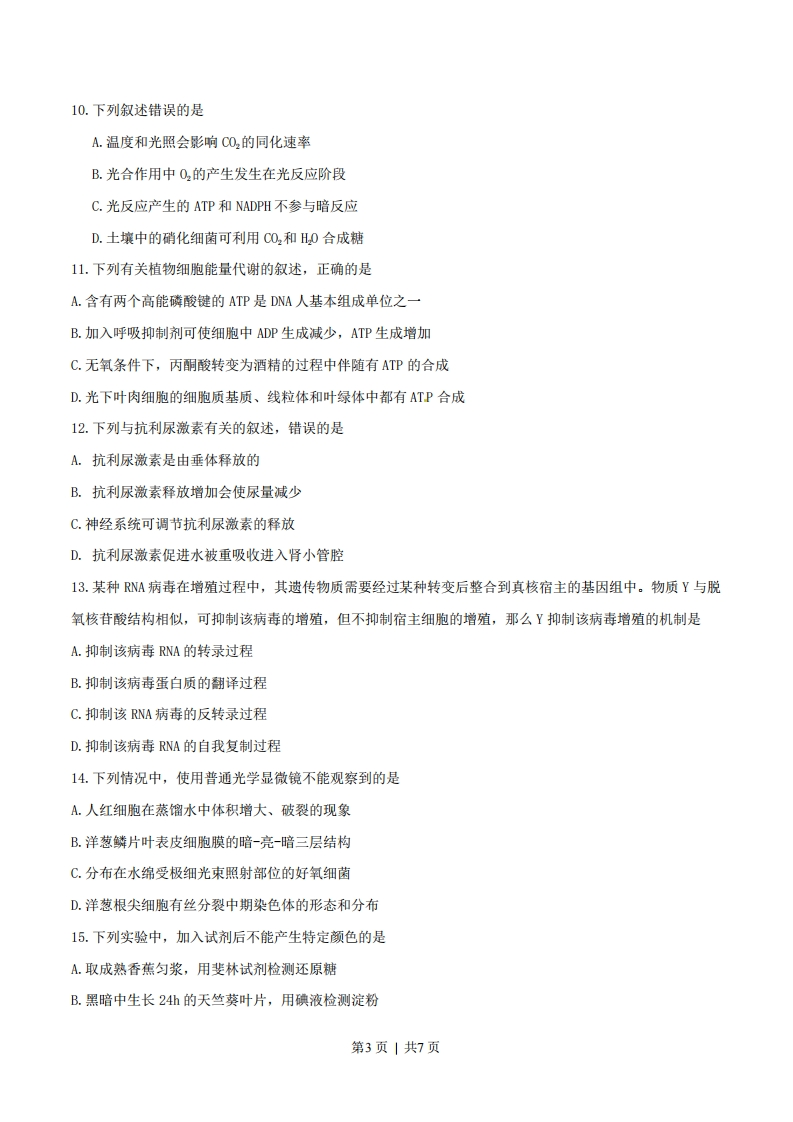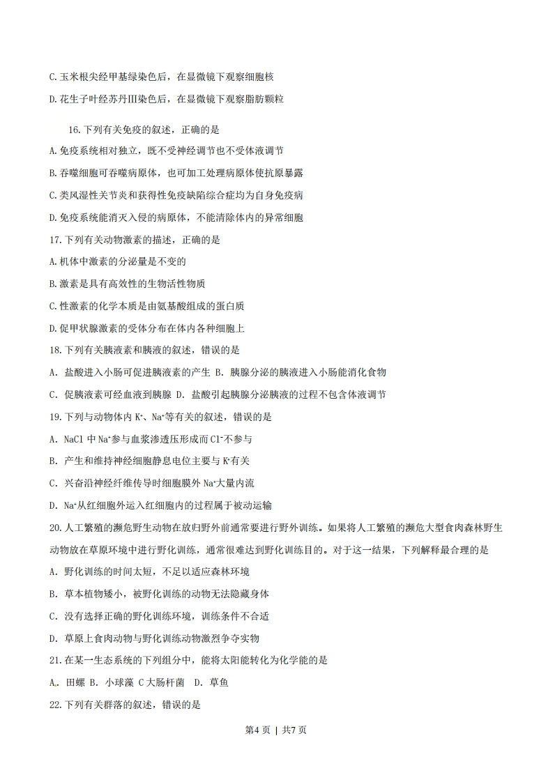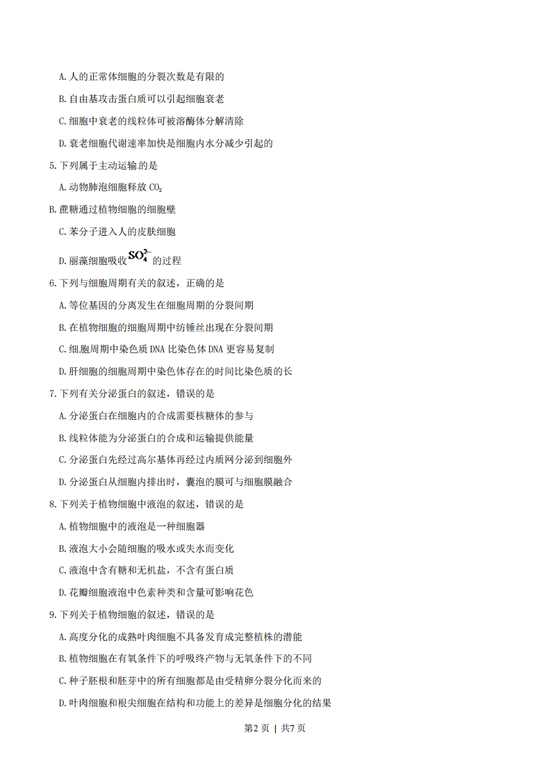 2016年普通高等学校招生全国统一考试生物注意事项:1.本试卷分第I卷(选择题)和第II卷(非选择题)两部分。答卷前,考生务必将自己的姓名、准考证号填写在答题卡上。2.回答第I卷时,选出每小题答案后,用铅笔把答题卡上对应题目的答案标号涂黑。如需改动,用橡皮擦干净后,再涂选其他答案标号。写在本试卷上无效。3.回答第II卷时,将答案写在答题卡上,写在本试卷上无效。4.考试结束后,将本试卷和答题卡一并交回。第I卷一、选择题:本题共25小题,每小题2分。在每小题给出的四个选项中,只有一项是符合题目要求的。1.下列关于膜蛋白和物质跨膜运输的叙述,错误的是A.膜蛋白在细胞膜上的分布是不对称的B.膜蛋白不参与物质跨膜运输的被动运输过程C.主动运输可以使被运输离子在细胞内外浓度不同D.物质通过脂质双分子层的扩散速率与脂溶性有关2.科学家用两种荧光染料分别标记人和小鼠细胞表面的蛋白质分子,将这两种标记细胞进行融合。细胞刚发生融合时,两种荧光染料在融合细胞表面对等分布(即各占半边),最后在融合细胞表面均匀分布。这一实验现象支持的结论是A.膜蛋白能自主翻转B.细胞膜具有流动性C.细胞膜具有选择透过性D.膜蛋白可以作为载体蛋白3.下列有关生物膜上蛋白质或酶的叙述,错误的是A.植物根细胞膜上存在运输离子的蛋白质B.植物叶肉细胞中液泡膜与类囊体膜上的蛋白质不同C.光合作用中,催化ATP合成的酶分布在类囊体膜上D.呼吸作用中,催化ATP合成的酶分布在线粒体外膜上4.下列关于人体细胞的叙述,错误的是第1页|共7页A.人的正常体细胞的分裂次数是有限的B.自由基攻击蛋白质可以引起细胞衰老C.细胞中衰老的线粒体可被溶酶体分解清除D.衰老细胞代谢速率加快是细胞内水分减少引起的5.下列属于主动运输的是A.动物肺泡细胞释放C02B.蔗糖通过植物细胞的细胞壁C.苯分子进入人的皮肤细胞D,丽藻细胞吸收SO?的过程6.下列与细胞周期有关的叙述,正确的是A.等位基因的分离发生在细胞周期的分裂间期B.在植物细胞的细胞周期中纺锤丝出现在分裂间期C.细胞周期中染色质DNA比染色体DNA更容易复制D.肝细胞的细胞周期中染色体存在的时间比染色质的长7.下列有关分泌蛋白的叙述,错误的是A.分泌蛋白在细胞内的合成需要核糖体的参与B.线粒体能为分泌蛋白的合成和运输提供能量C.分泌蛋白先经过高尔基体再经过内质网分泌到细胞外D.分泌蛋白从细胞内排出时,囊泡的膜可与细胞膜融合8.下列关于植物细胞中液泡的叙述,错误的是A.植物细胞中的液泡是一种细胞器B.液泡大小会随细胞的吸水或失水而变化C.液泡中含有糖和无机盐,不含有蛋白质D.花瓣细胞液泡中色素种类和含量可影响花色9.下列关于植物细胞的叙述,错误的是A.高度分化的成熟叶肉细胞不具备发育成完整植株的潜能B.植物细胞在有氧条件下的呼吸终产物与无氧条件下的不同C.种子胚根和胚芽中的所有细胞都是由受精卵分裂分化而来的D.叶肉细胞和根尖细胞在结构和功能上的差异是细胞分化的结果第2页|共7页10.下列叙述错误的是A.温度和光照会影响C0,的同化速率B.光合作用中O的产生发生在光反应阶段C.光反应产生的ATP和NADPH不参与暗反应D.土壤中的硝化细菌可利用C0,和H0合成糖11.下列有关植物细胞能量代谢的叙述,正确的是A.含有两个高能磷酸键的ATP是DNA人基本组成单位之一B.加入呼吸抑制剂可使细胞中ADP生成减少,ATP生成增加C.无氧条件下,丙酮酸转变为酒精的过程中伴随有ATP的合成D.光下叶肉细胞的细胞质基质、线粒体和叶绿体中都有ATP合成12.下列与抗利尿激素有关的叙述,错误的是A.抗利尿激素是由垂体释放的B.抗利尿激素释放增加会使尿量减少C.神经系统可调节抗利尿激素的释放D.抗利尿激素促进水被重吸收进入肾小管腔13.某种RNA病毒在增殖过程中,其遗传物质需要经过某种转变后整合到真核宿主的基因组中。物质Y与脱氧核苷酸结构相以,可抑制该病毒的增殖,但不抑制宿主细胞的增殖,那么Y抑制该病毒增殖的机制是A.抑制该病毒RNA的转录过程B.抑制该病毒蛋白质的翻译过程C.抑制该RNA病毒的反转录过程D.抑制该病毒RNA的自我复制过程14.下列情况中,使用普通光学显微镜不能观察到的是A.人红细胞在蒸馏水中体积增大、破裂的现象B.洋葱鳞片叶表皮细胞膜的暗-亮-暗三层结构C.分布在水绵受极细光束照射部位的好氧细菌D.洋葱根尖细跑有丝分裂中期染色体的形态和分布15.下列实验中,加入试剂后不能产生特定颜色的是A.取成熟香蕉匀浆,用斐林试剂检测还原糖B.黑暗中生长24h的天竺葵叶片,用碘液检测淀粉第3页|共7页
